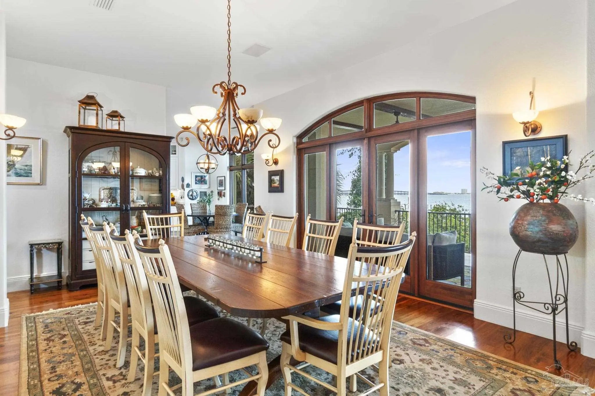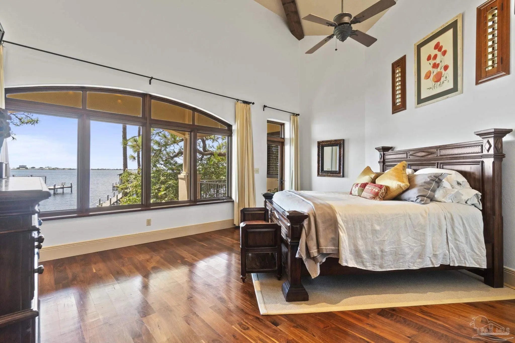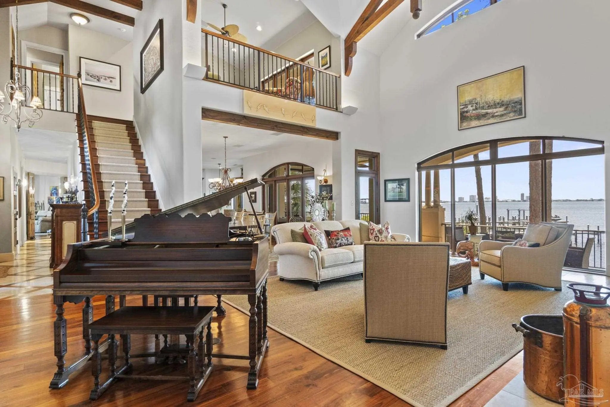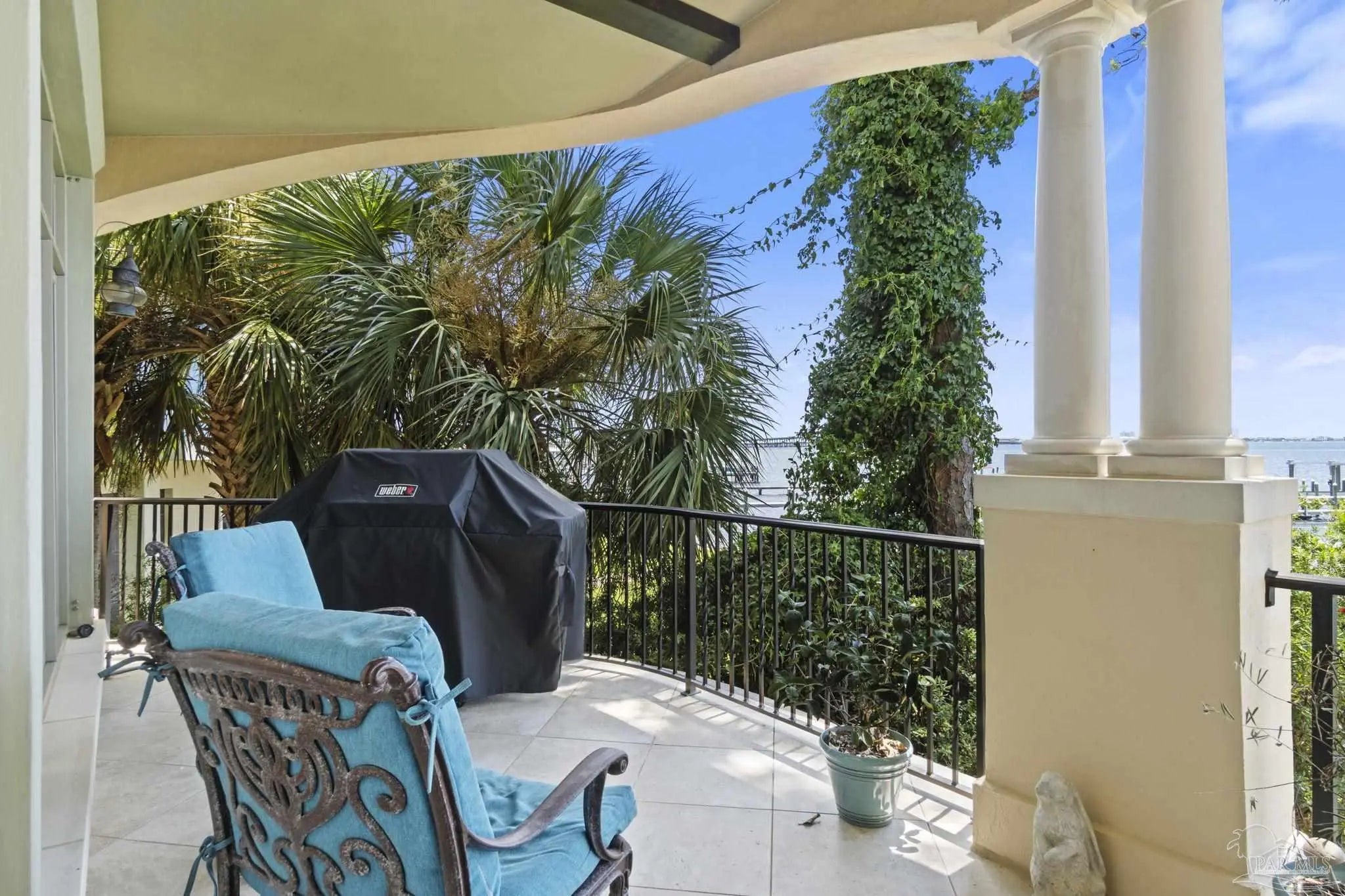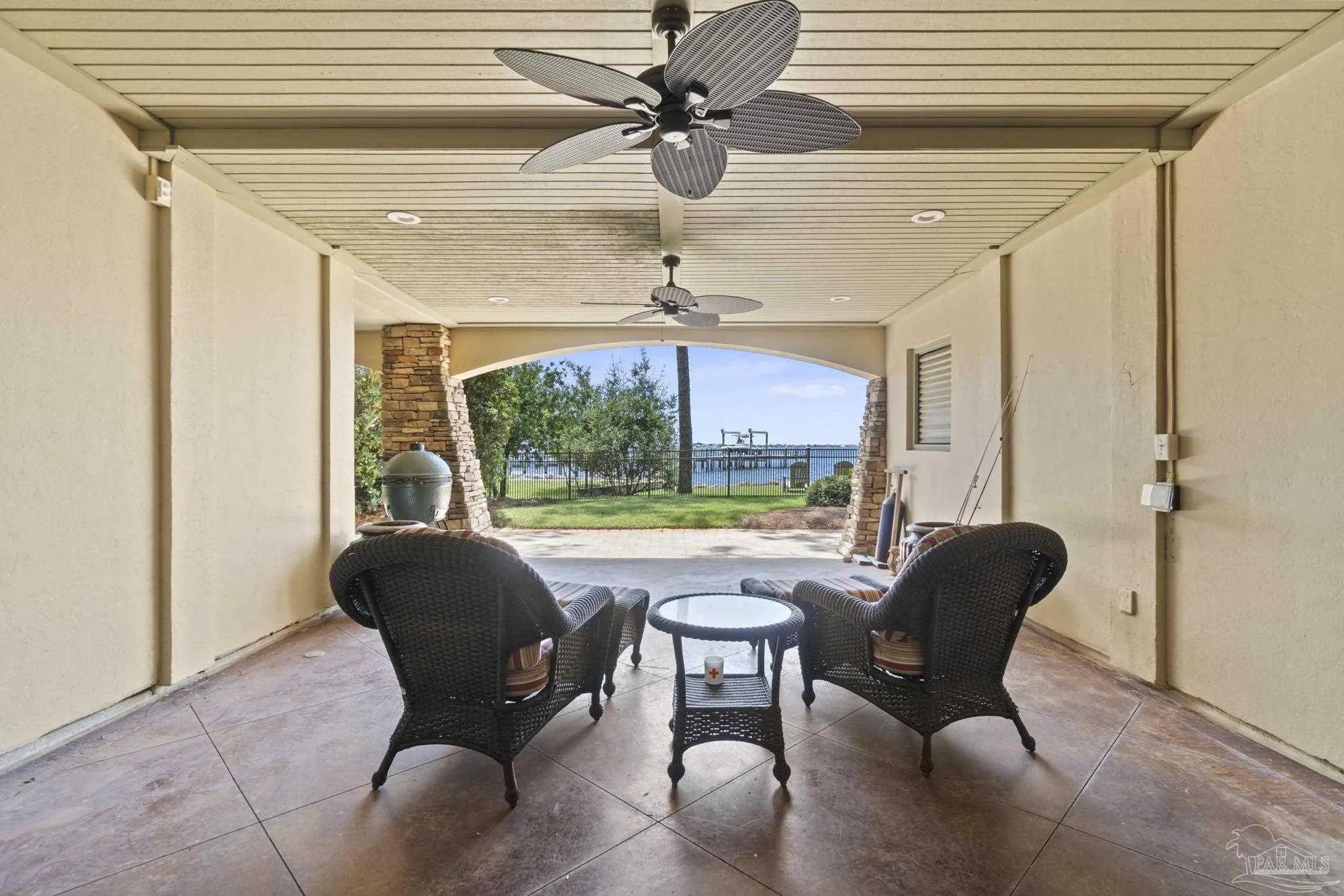 This elegant waterfront French Country home provides a panoramic view of Pensacola Sound and breathtaking sunrises and sunsets. From the courtyard and stacked stone/stucco facade to the end of the boat house and dock with boatlift, you will appreciate the construction and attention to detail. Dramatic travertine floors inlaid with a walnut accent extend into the hallway and kitchen. The 2 story vaulted living room ceiling and beams provide visual interest and large natural wood beams accent the ceilings in the entry, living room, dining area and master suite. The view of the Sound is enhanced by the windows, French doors and balconies facing south. Both the living and dining rooms enjoy the fireplace with custom stone surround, wall sconces, and custom cabinetry. The master bedroom with a 20' ceiling overlooks the water. The spacious master bath features a double vanity area, designer fixtures, built-in cabinetry, a spacious shower and a freestanding tub. The separate "his and her" closets are walk-in, one has a cedar closet and attic access for additional storage. The kitchen shows chef’s level high end appliances and a large kitchen island provides abundant work space and bar style seating. The wet bar and ice maker add to easy entertaining. A small office space is perfect for a computer work station. Note the dramatic beauty of the library/office with 8' double entry doors from New Orleans and a dramatic coffered ceiling. The large laundry houses a second refrigerator. The elevator or the stairway lead upstairs to the bedrooms have walk-in closets and full baths. A private sitting area overlooks the living room, and could be converted into a 4th bedroom. The Geothermal A/C units, ICF construction and Icynene insulation keep this space (and the entire house) cool and quiet. Enjoy the huge 4 car garage! Fifty-four concrete pilings add stability and safety to the home.