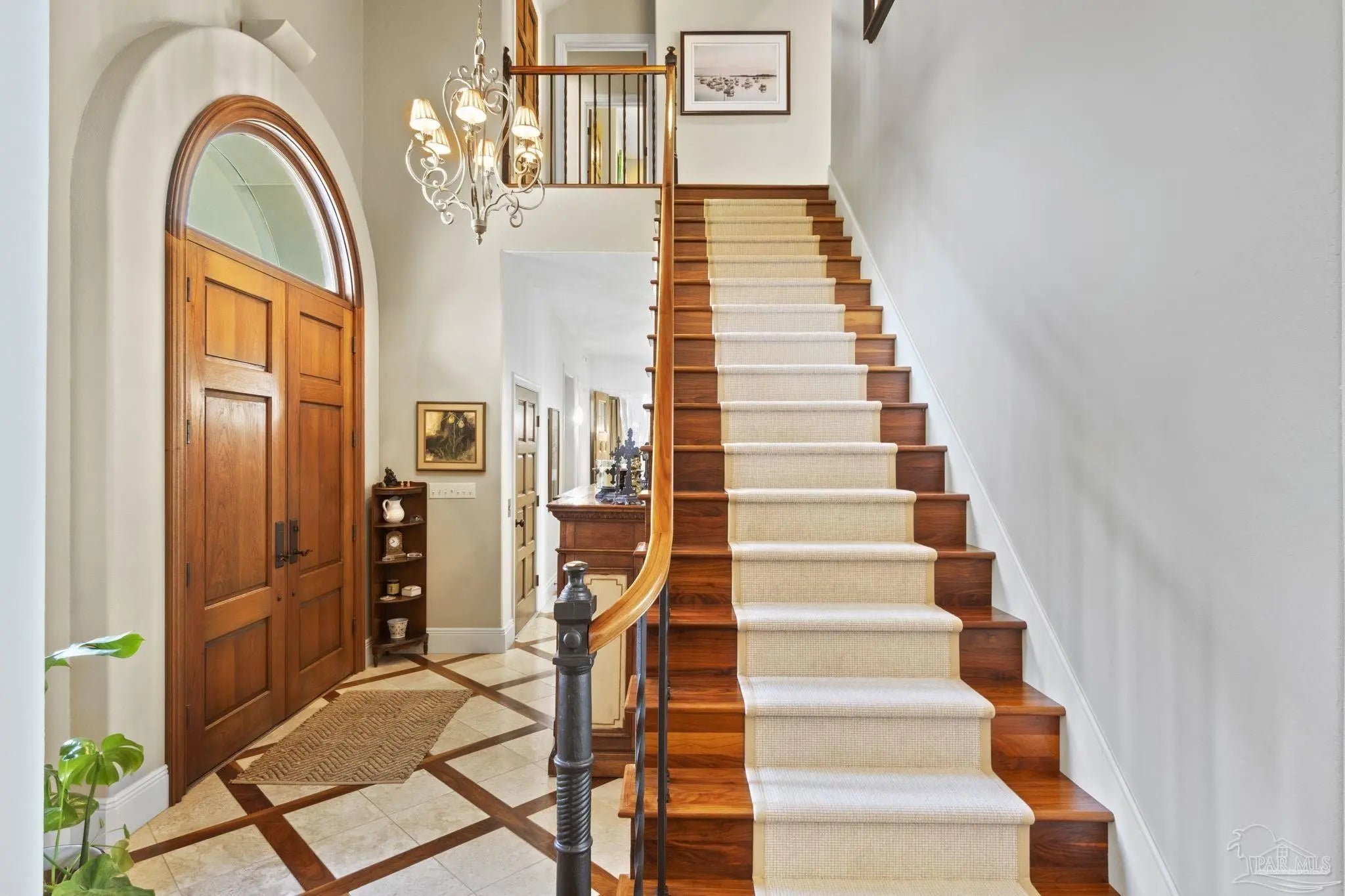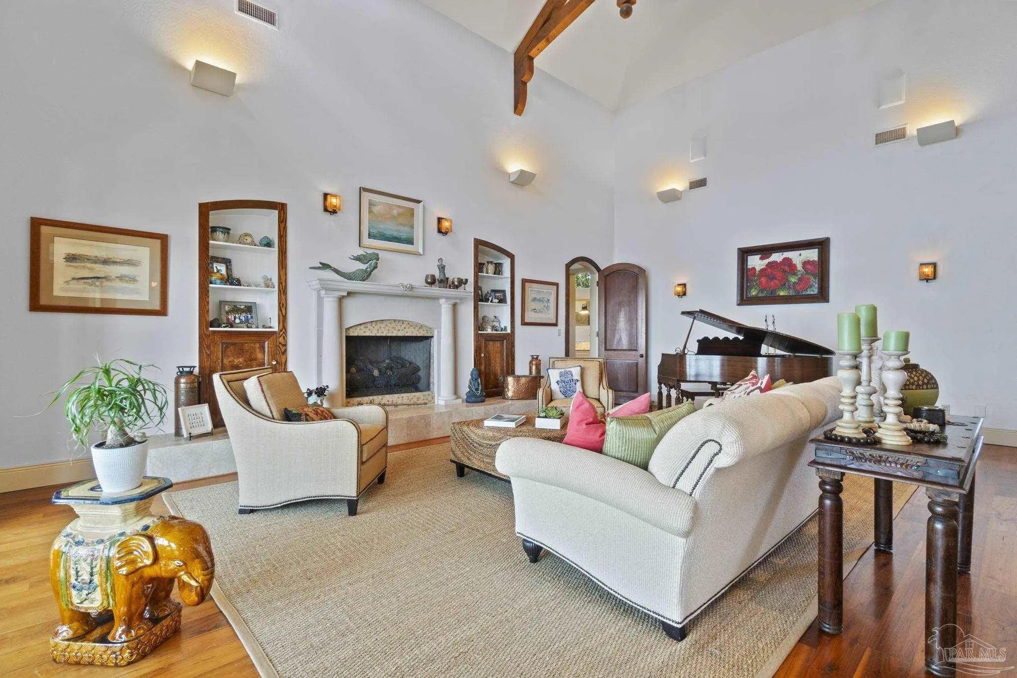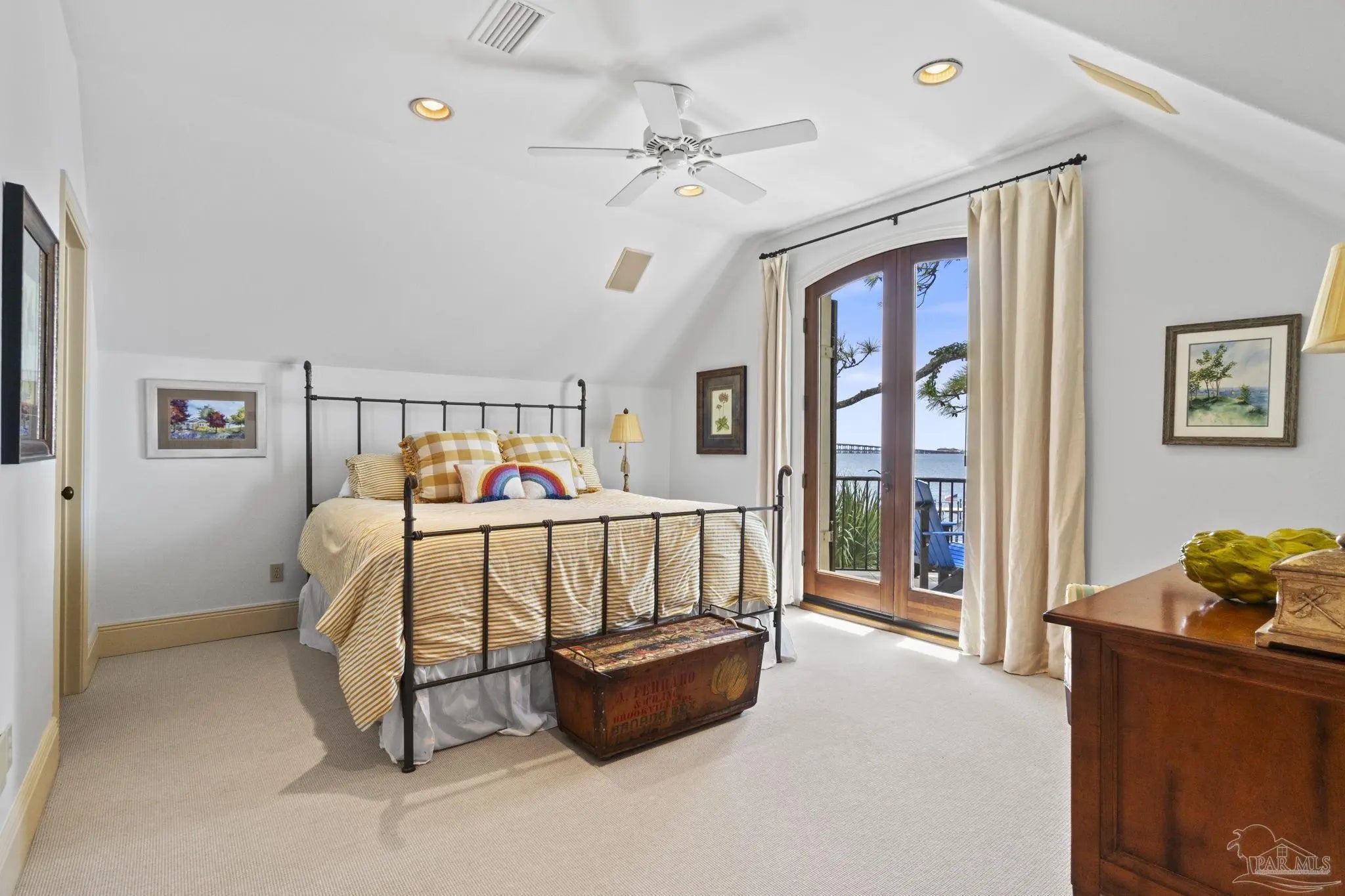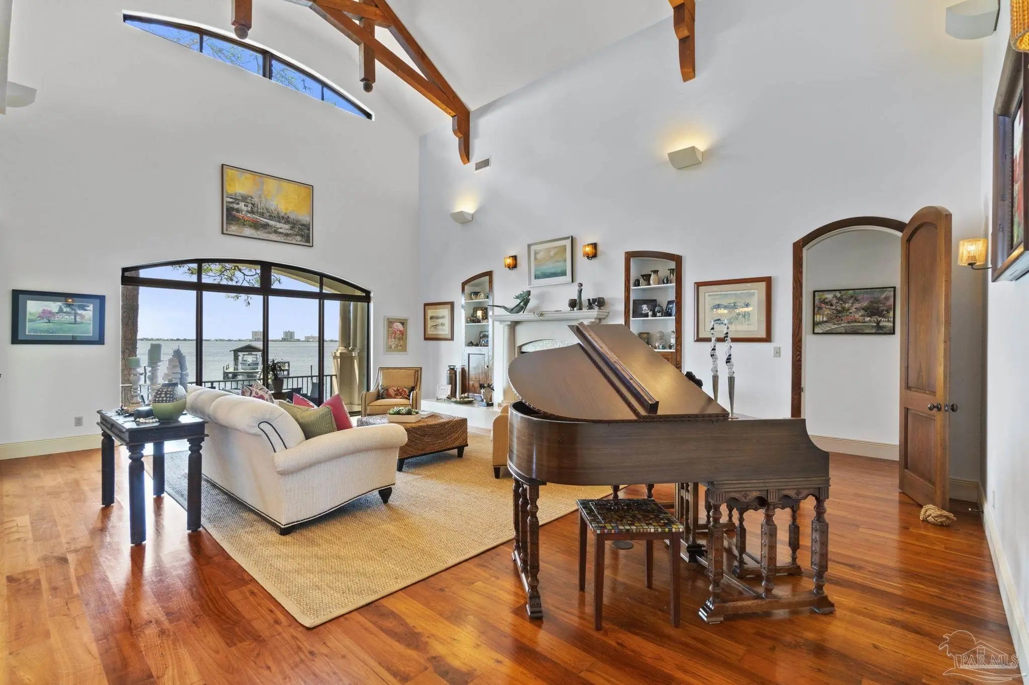 This elegant waterfront French Country home provides a panoramic view of Pensacola Sound and breathtaking sunrises and sunsets. From the courtyard and stacked stone/stucco facade to the end of the boat house and dock with boatlift, you will appreciate the construction and attention to detail. Dramatic travertine floors inlaid with a walnut accent extend into the hallway and kitchen. The 2 story vaulted living room ceiling and beams provide visual interest and large natural wood beams accent the ceilings in the entry, living room, dining area and master suite. The view of the Sound is enhanced by the windows, French doors and balconies facing south. Both the living and dining rooms enjoy the fireplace with custom stone surround, wall sconces, and custom cabinetry. The master bedroom with a 20' ceiling overlooks the water. The spacious master bath features a double vanity area, designer fixtures, built-in cabinetry, a spacious shower and a freestanding tub. The separate "his and her" closets are walk-in, one has a cedar closet and attic access for additional storage. The kitchen shows chef’s level high end appliances and a large kitchen island provides abundant work space and bar style seating. The wet bar and ice maker add to easy entertaining. A small office space is perfect for a computer work station. Note the dramatic beauty of the library/office with 8' double entry doors from New Orleans and a dramatic coffered ceiling. The large laundry houses a second refrigerator. The elevator or the stairway lead upstairs to the bedrooms have walk-in closets and full baths. A private sitting area overlooks the living room, and could be converted into a 4th bedroom. The Geothermal A/C units, ICF construction and Icynene insulation keep this space (and the entire house) cool and quiet. Enjoy the huge 4 car garage! Fifty-four concrete pilings add stability and safety to the home.