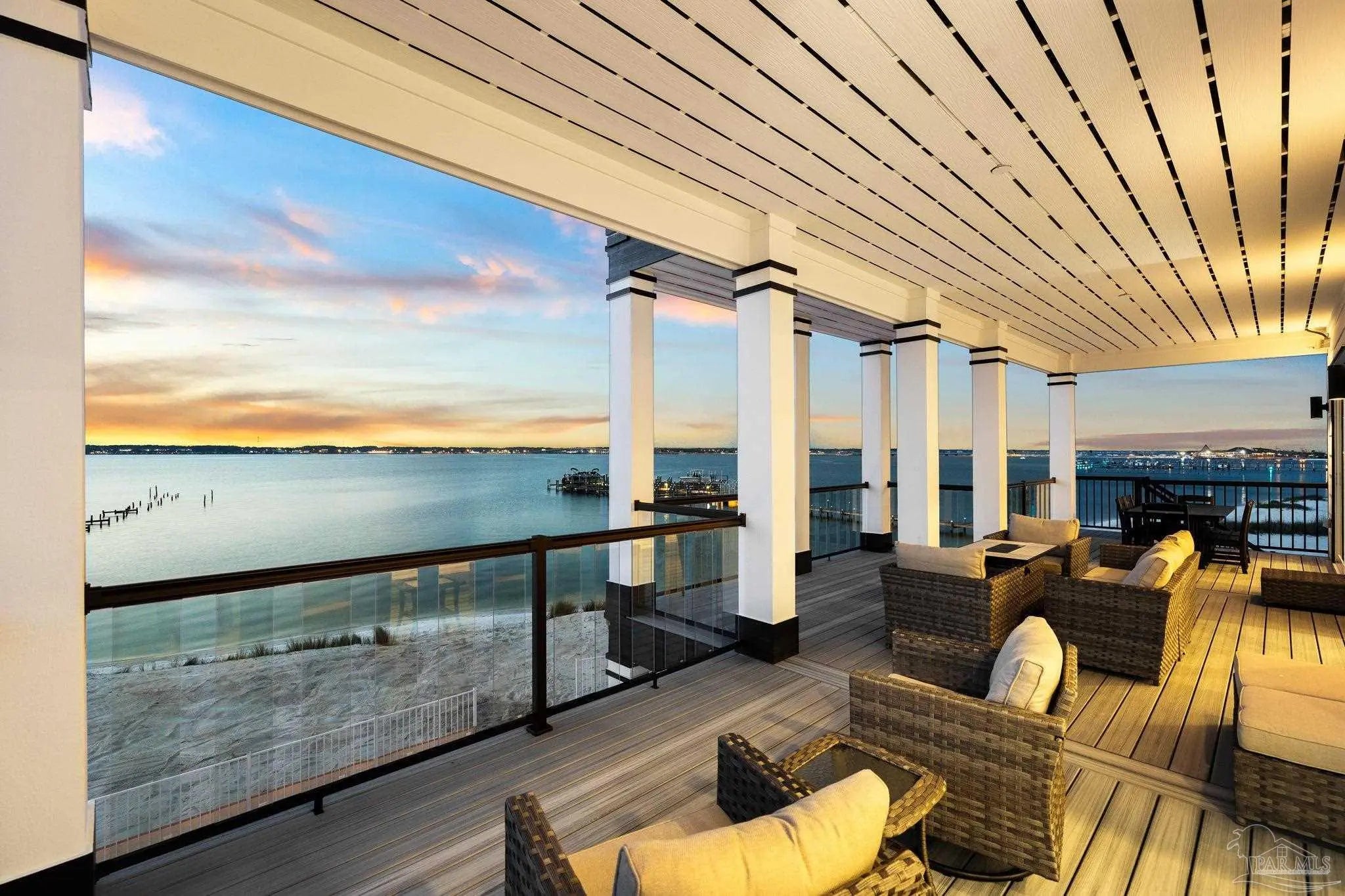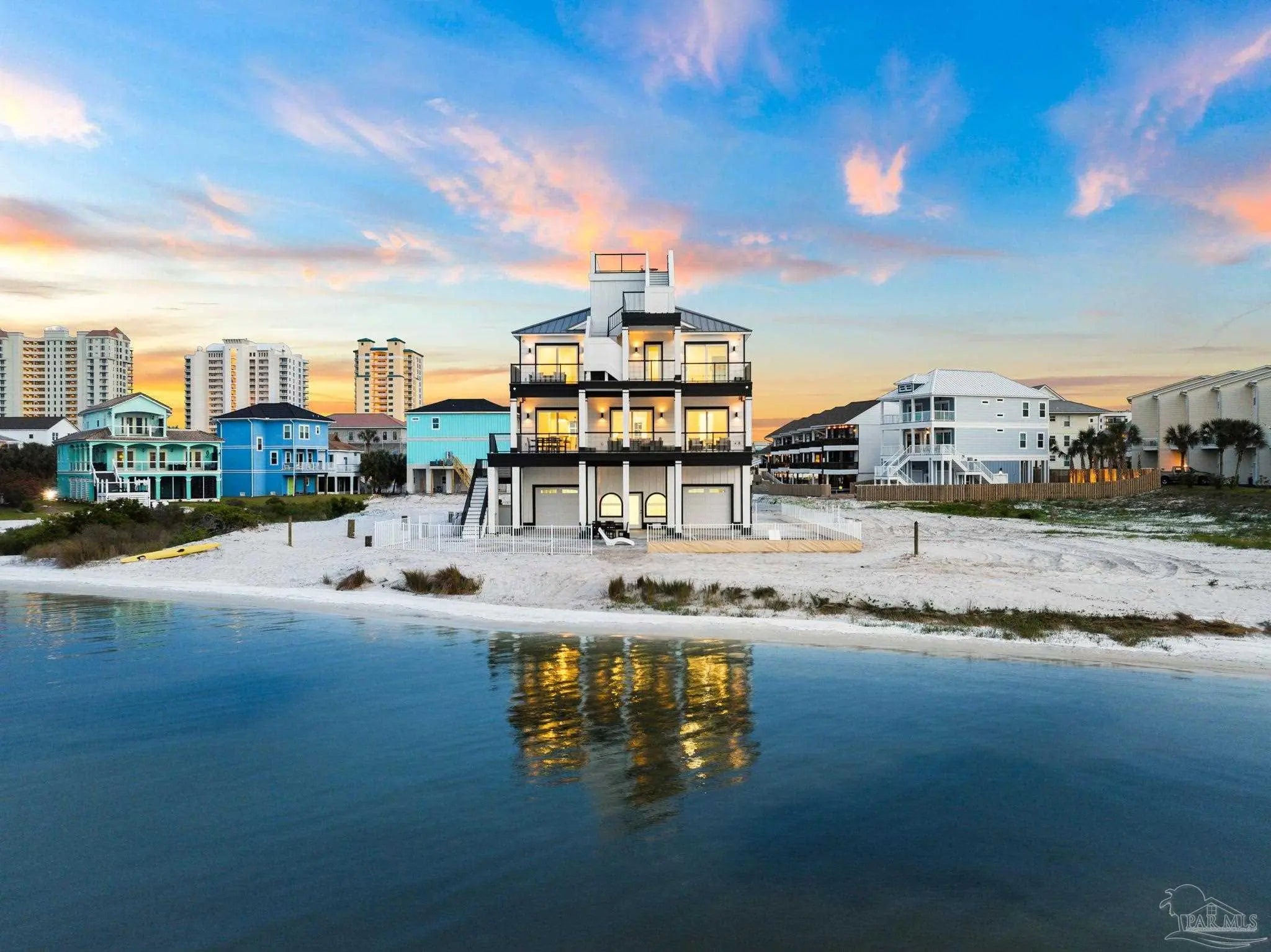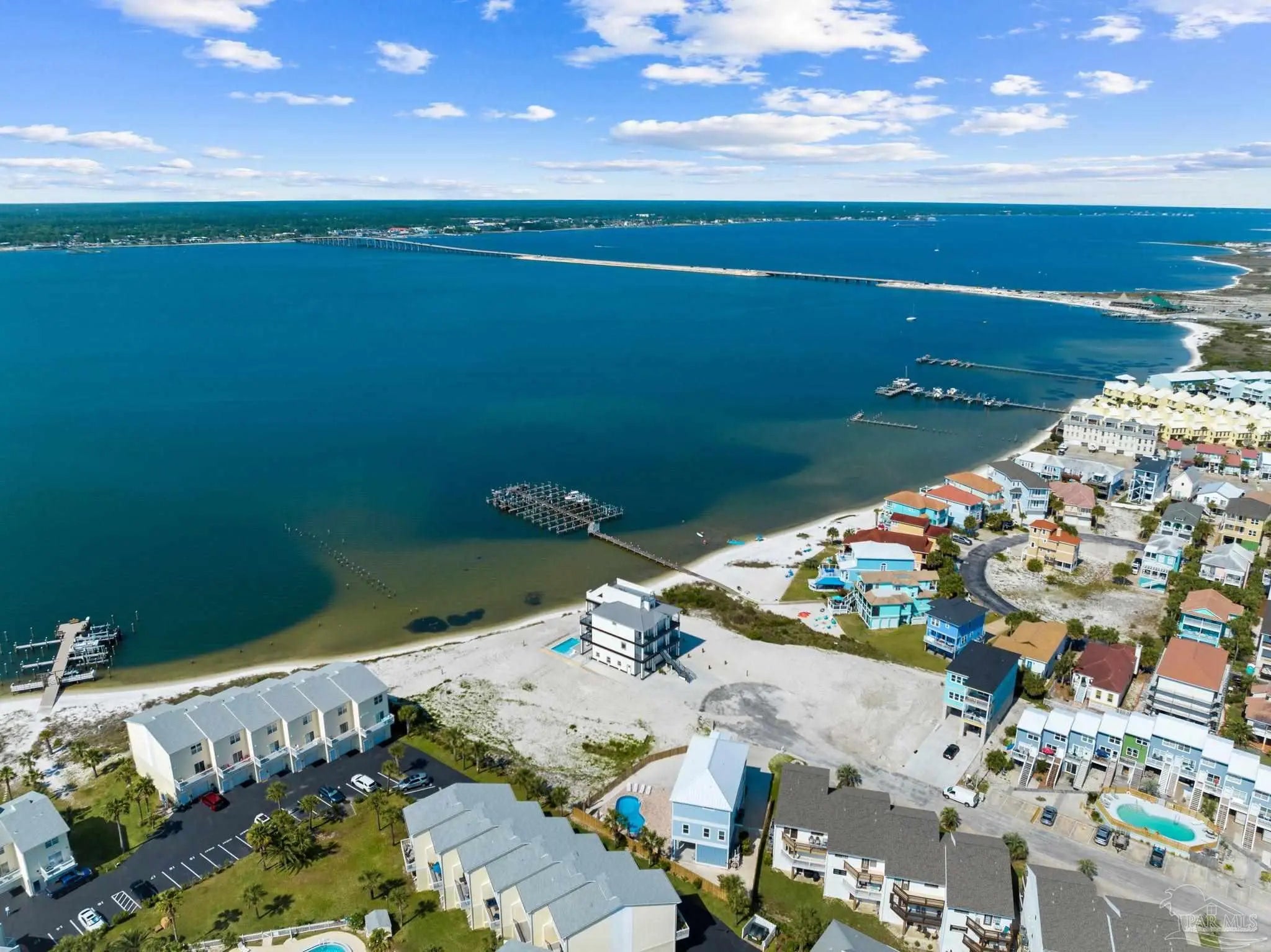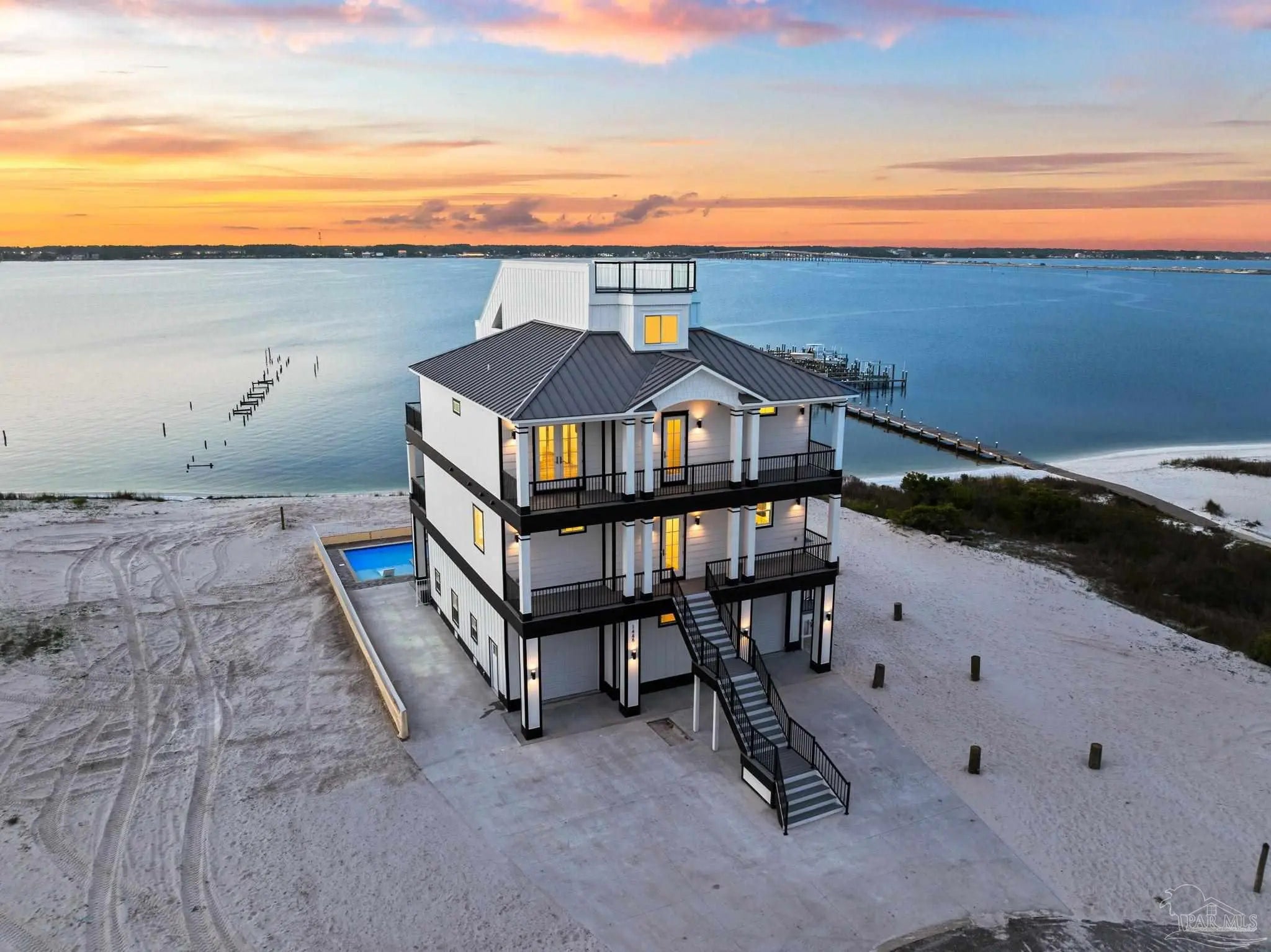 “White Pearl” – Luxury Waterfront Retreat with Private Beach, Pool, Elevator & RV Parking area. The Ultimate Vacation Home, or Vacation Rental Investment Property with potential for Wedding Venue or Special Event Venues. Welcome to the “White Pearl” – a stunning 5-star 4 bedroom 4.5 bath furnished luxury home on Navarre Beach that comfortably sleeps 14 guests. This custom-designed three-story waterfront property offers the perfect blend of elegance, comfort, and convenience. Whether you're looking for an unforgettable family getaway, an income-producing vacation rental, or a one-of-a-kind event venue, this home has it all. The 16’ x 43’ Sky-deck offers some of the best views on Navarre Beach, the sunsets and sunrises are breathtaking! Two Spacious King Suites, one on the main living level on the second floor and another on the third level each with amazing water view, ensuite spa-like baths, walk-in-showers, walk in closets and full-size washer and dryers. The third level Master suite has a Bonus area with Murphy bed. Two Bunk Rooms on the third level each with private balcony share a hallway bath. Open concept kitchen, living and dining area with floor to ceiling windows bring the beauty of Navarre beach inside. Sink into plush furniture and take in the breathtaking views or enjoy your favorite shows on the large Smart TV. Chef’s kitchen has high end appliances, 10’ island with prep sink and ice maker and seating for 8 at the bar adding to the seating for 10 at the Dining table making entertaining a breeze. Game/Media room is a spacious family retreat on the third level with oversized Smart TV, reclining sofas and access to waterfront balcony, ideal for movie nights or relaxing after a day at the beach. Outdoors is your own private beach, outdoor shower, and private pool with tanning deck. Guest will appreciate ample parking for up to 6 vehicles and room 40’ RV. Built with 180 mph construction and many custom details, this is for those who seek the very best!