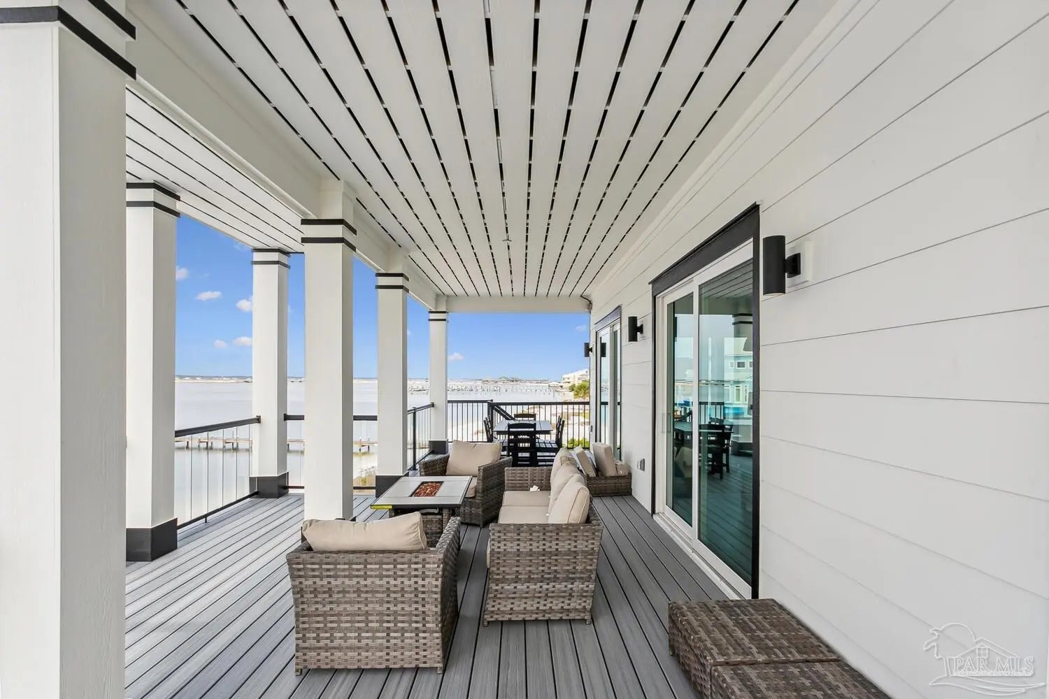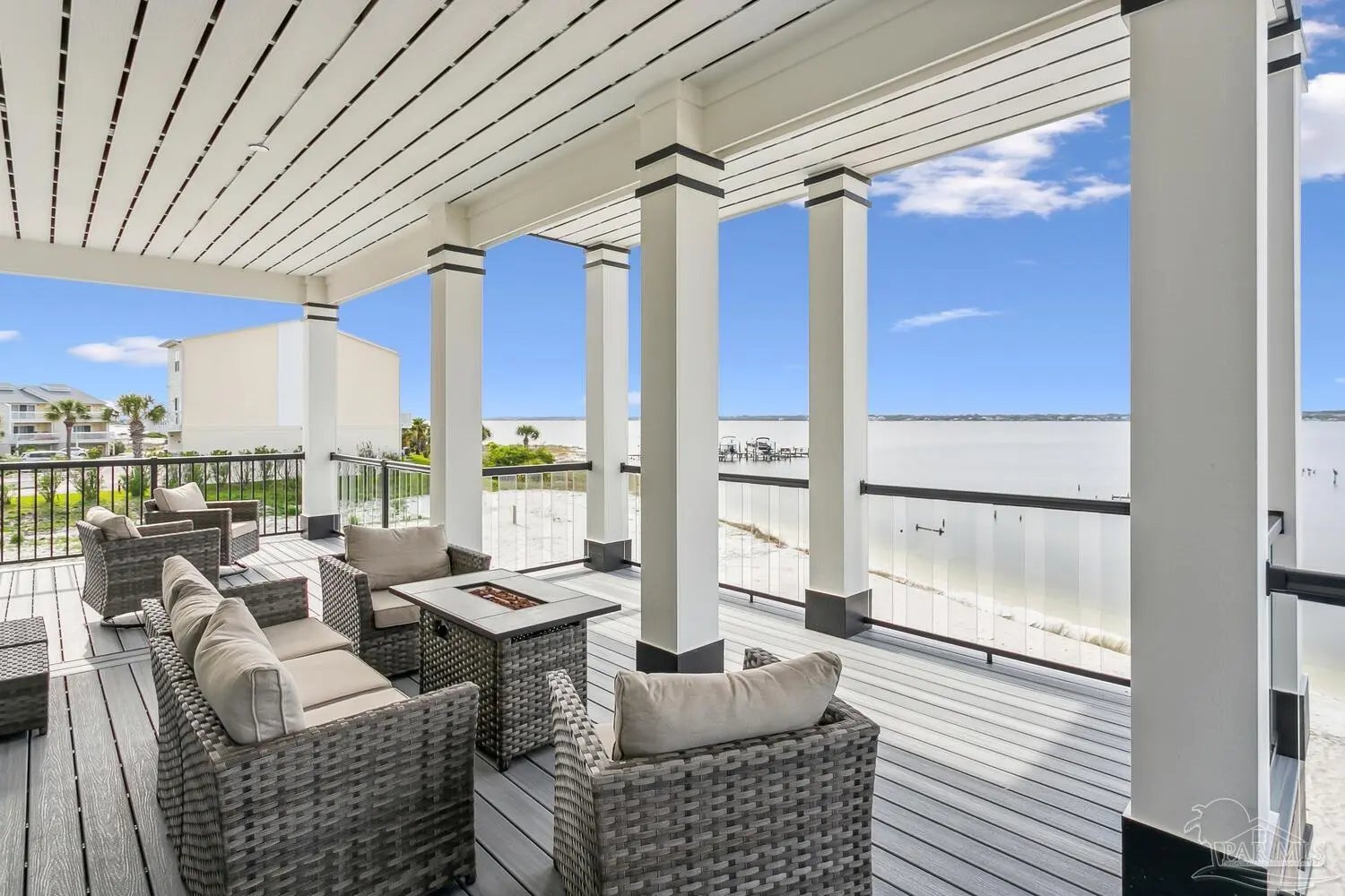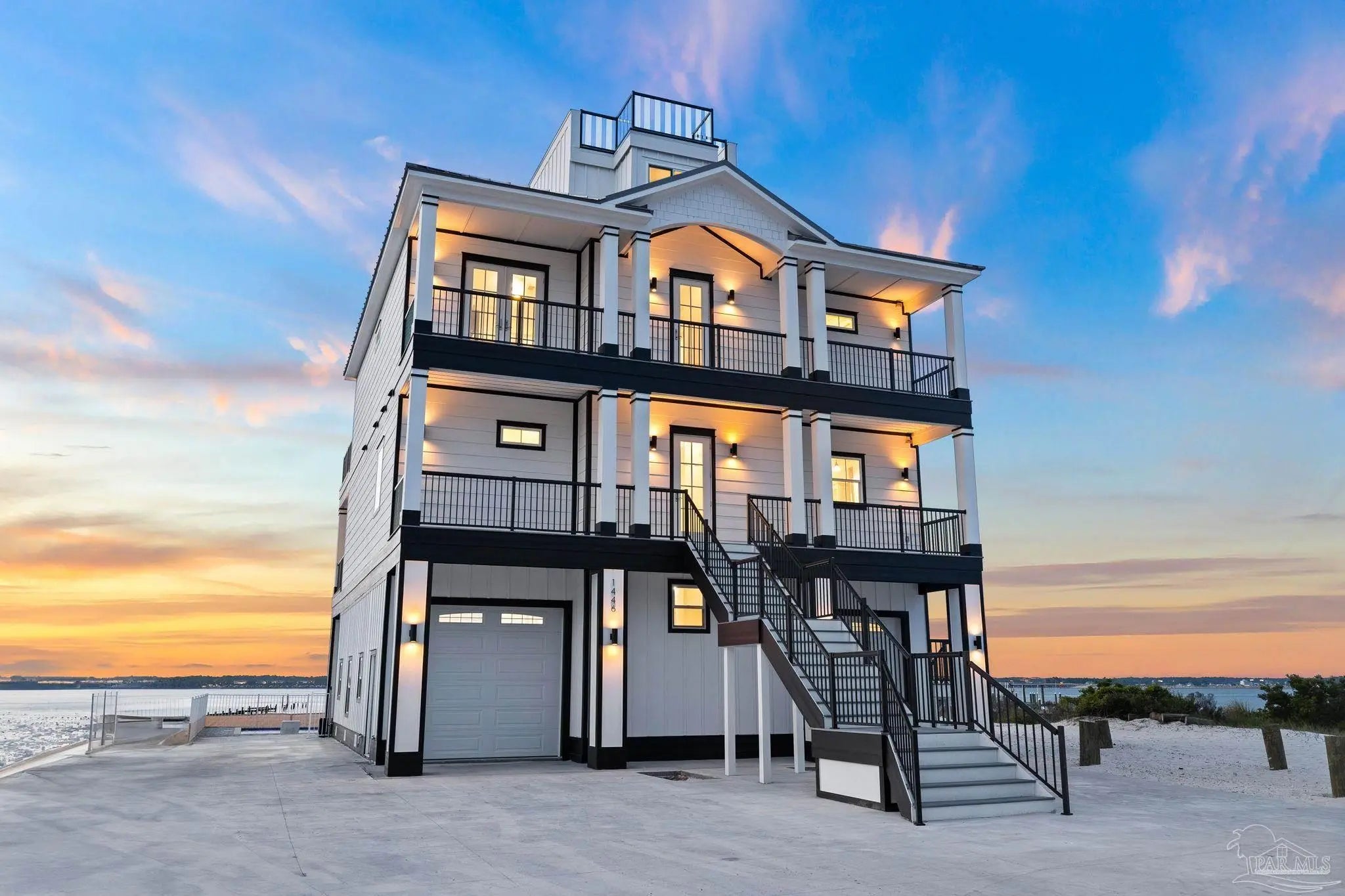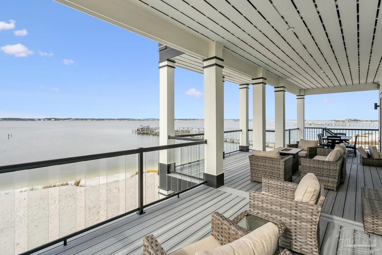 “White Pearl” – Luxury Waterfront Retreat with Private Beach, Pool, Elevator & RV Parking area. The Ultimate Vacation Home, or Vacation Rental Investment Property with potential for Wedding Venue or Special Event Venues. Welcome to the “White Pearl” – a stunning 5-star 4 bedroom 4.5 bath furnished luxury home on Navarre Beach that comfortably sleeps 14 guests. This custom-designed three-story waterfront property offers the perfect blend of elegance, comfort, and convenience. Whether you're looking for an unforgettable family getaway, an income-producing vacation rental, or a one-of-a-kind event venue, this home has it all. The 16’ x 43’ Sky-deck offers some of the best views on Navarre Beach, the sunsets and sunrises are breathtaking! Two Spacious King Suites, one on the main living level on the second floor and another on the third level each with amazing water view, ensuite spa-like baths, walk-in-showers, walk in closets and full-size washer and dryers. The third level Master suite has a Bonus area with Murphy bed. Two Bunk Rooms on the third level each with private balcony share a hallway bath. Open concept kitchen, living and dining area with floor to ceiling windows bring the beauty of Navarre beach inside. Sink into plush furniture and take in the breathtaking views or enjoy your favorite shows on the large Smart TV. Chef’s kitchen has high end appliances, 10’ island with prep sink and ice maker and seating for 8 at the bar adding to the seating for 10 at the Dining table making entertaining a breeze. Game/Media room is a spacious family retreat on the third level with oversized Smart TV, reclining sofas and access to waterfront balcony, ideal for movie nights or relaxing after a day at the beach. Outdoors is your own private beach, outdoor shower, and private pool with tanning deck. Guest will appreciate ample parking for up to 6 vehicles and room 40’ RV. Built with 180 mph construction and many custom details, this is for those who seek the very best!