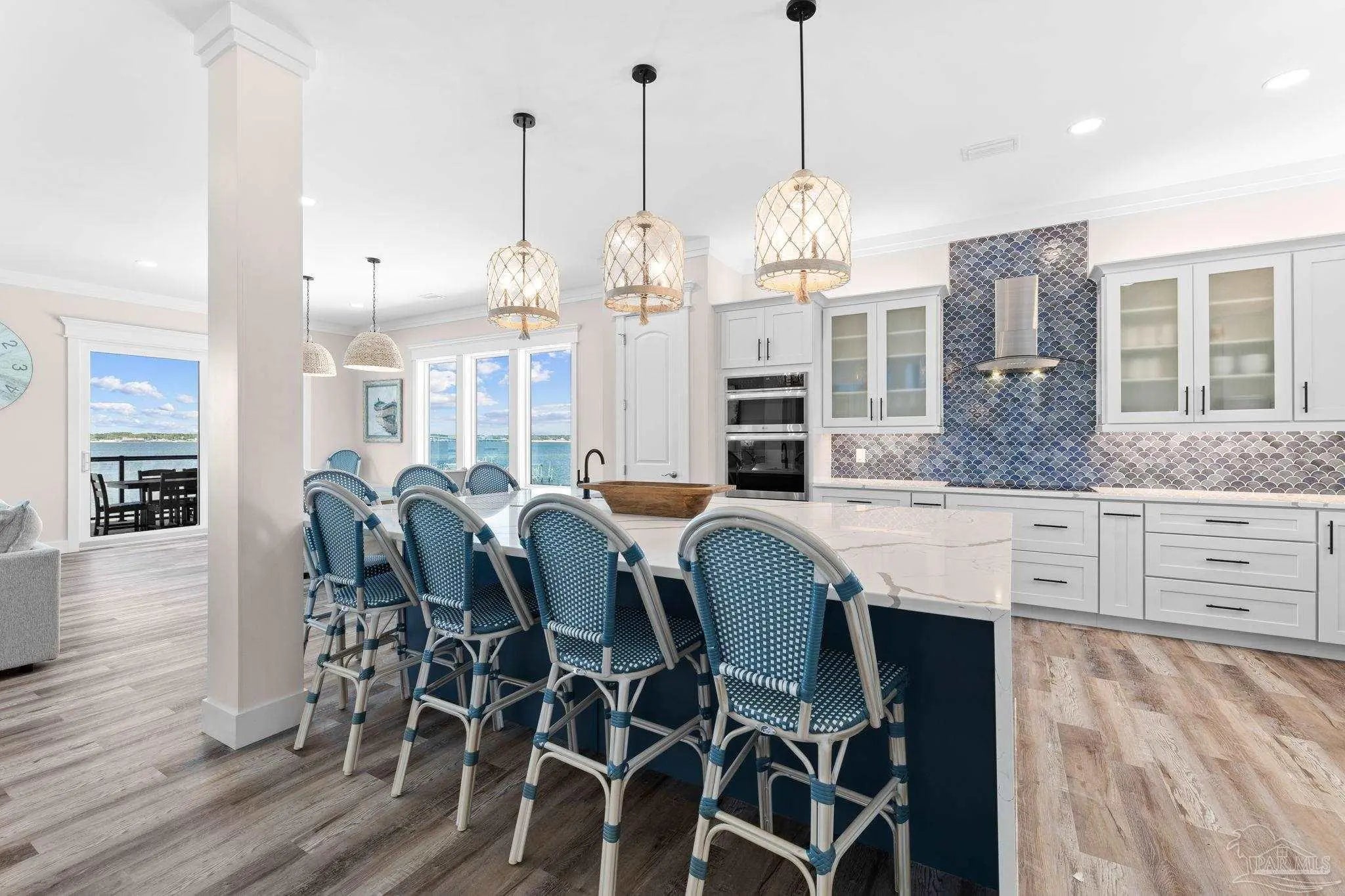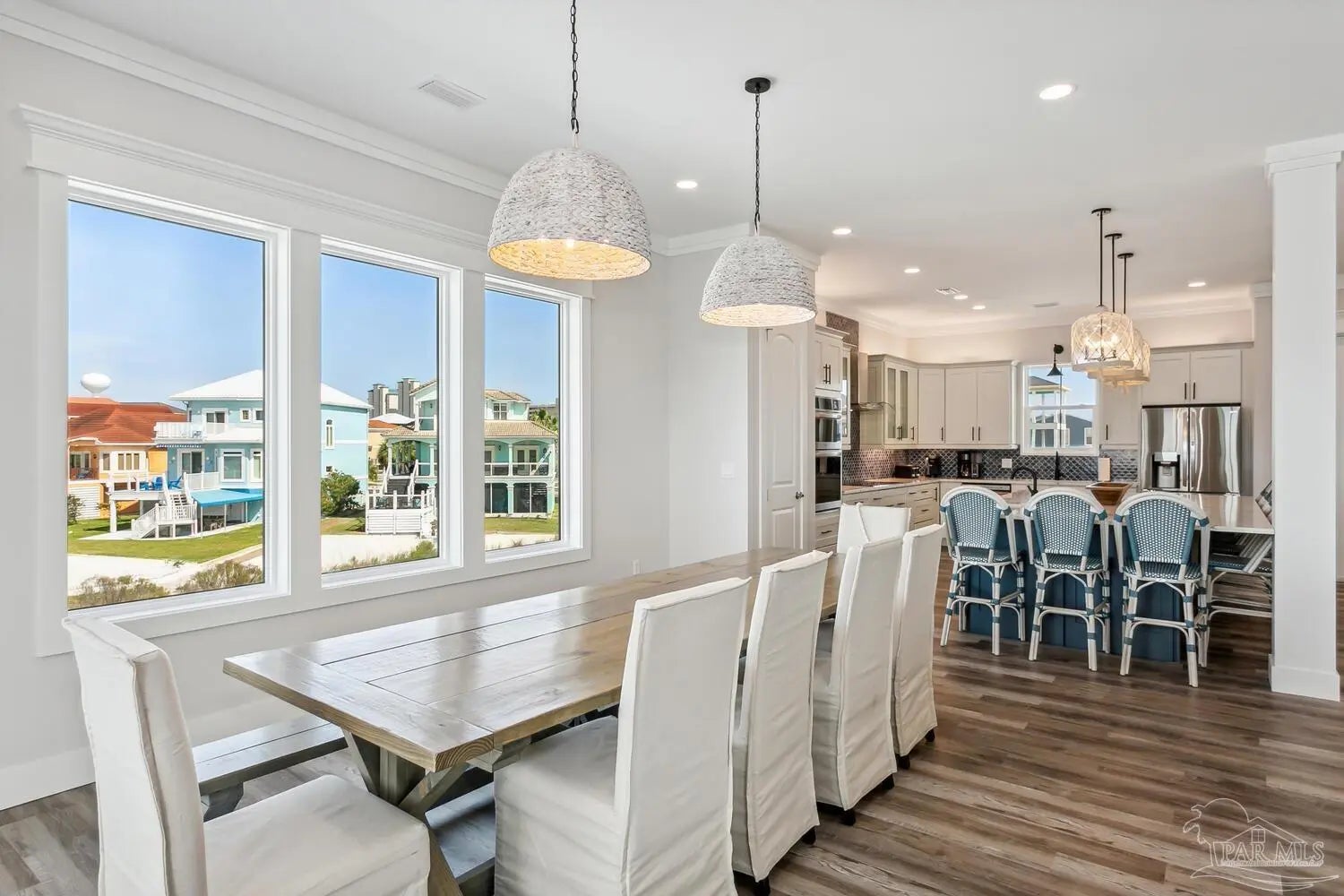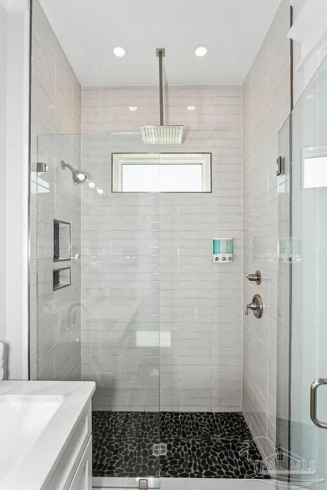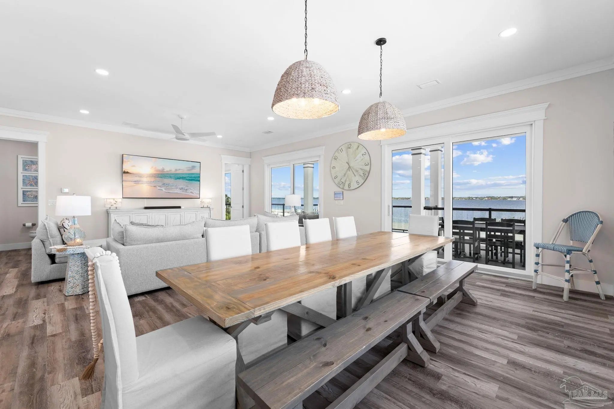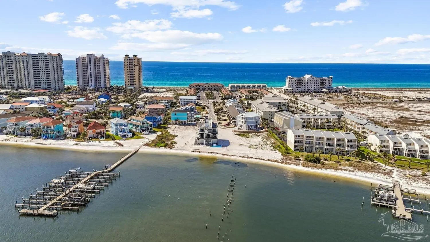 “White Pearl” – Luxury Waterfront Retreat with Private Beach, Pool, Elevator & RV Parking area. The Ultimate Vacation Home, or Vacation Rental Investment Property with potential for Wedding Venue or Special Event Venues. Welcome to the “White Pearl” – a stunning 5-star 4 bedroom 4.5 bath furnished luxury home on Navarre Beach that comfortably sleeps 14 guests. This custom-designed three-story waterfront property offers the perfect blend of elegance, comfort, and convenience. Whether you're looking for an unforgettable family getaway, an income-producing vacation rental, or a one-of-a-kind event venue, this home has it all. The 16’ x 43’ Sky-deck offers some of the best views on Navarre Beach, the sunsets and sunrises are breathtaking! Two Spacious King Suites, one on the main living level on the second floor and another on the third level each with amazing water view, ensuite spa-like baths, walk-in-showers, walk in closets and full-size washer and dryers. The third level Master suite has a Bonus area with Murphy bed. Two Bunk Rooms on the third level each with private balcony share a hallway bath. Open concept kitchen, living and dining area with floor to ceiling windows bring the beauty of Navarre beach inside. Sink into plush furniture and take in the breathtaking views or enjoy your favorite shows on the large Smart TV. Chef’s kitchen has high end appliances, 10’ island with prep sink and ice maker and seating for 8 at the bar adding to the seating for 10 at the Dining table making entertaining a breeze. Game/Media room is a spacious family retreat on the third level with oversized Smart TV, reclining sofas and access to waterfront balcony, ideal for movie nights or relaxing after a day at the beach. Outdoors is your own private beach, outdoor shower, and private pool with tanning deck. Guest will appreciate ample parking for up to 6 vehicles and room 40’ RV. Built with 180 mph construction and many custom details, this is for those who seek the very best!