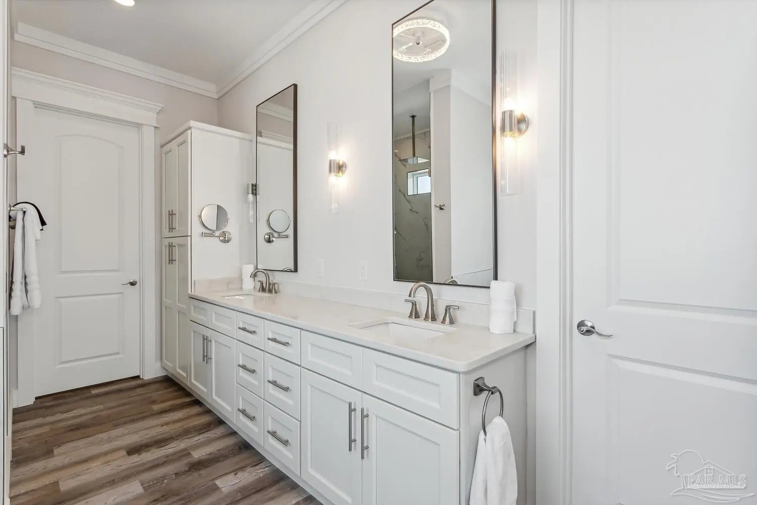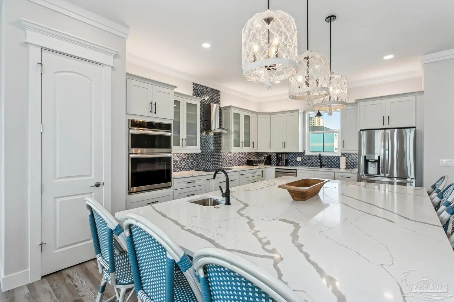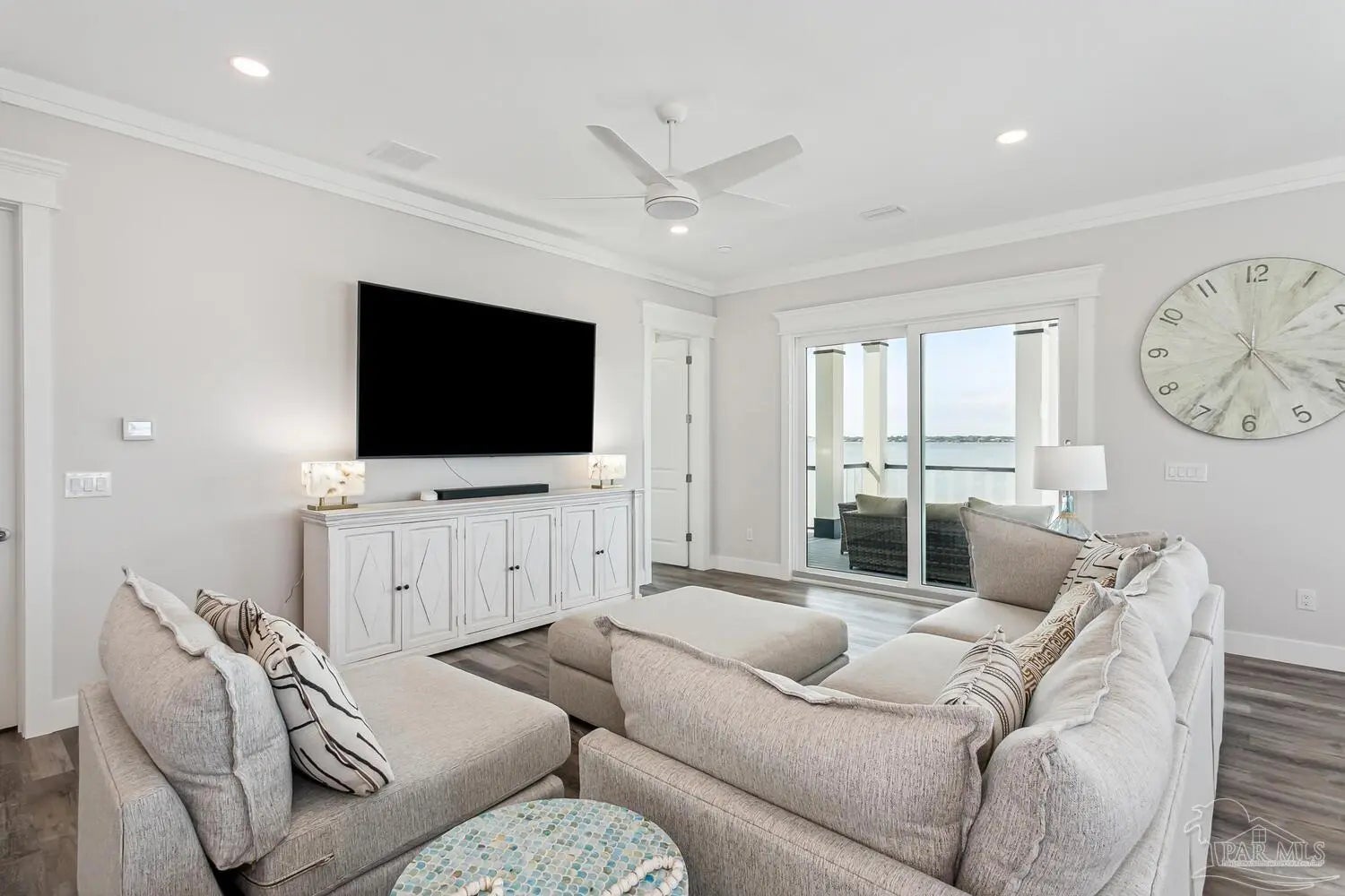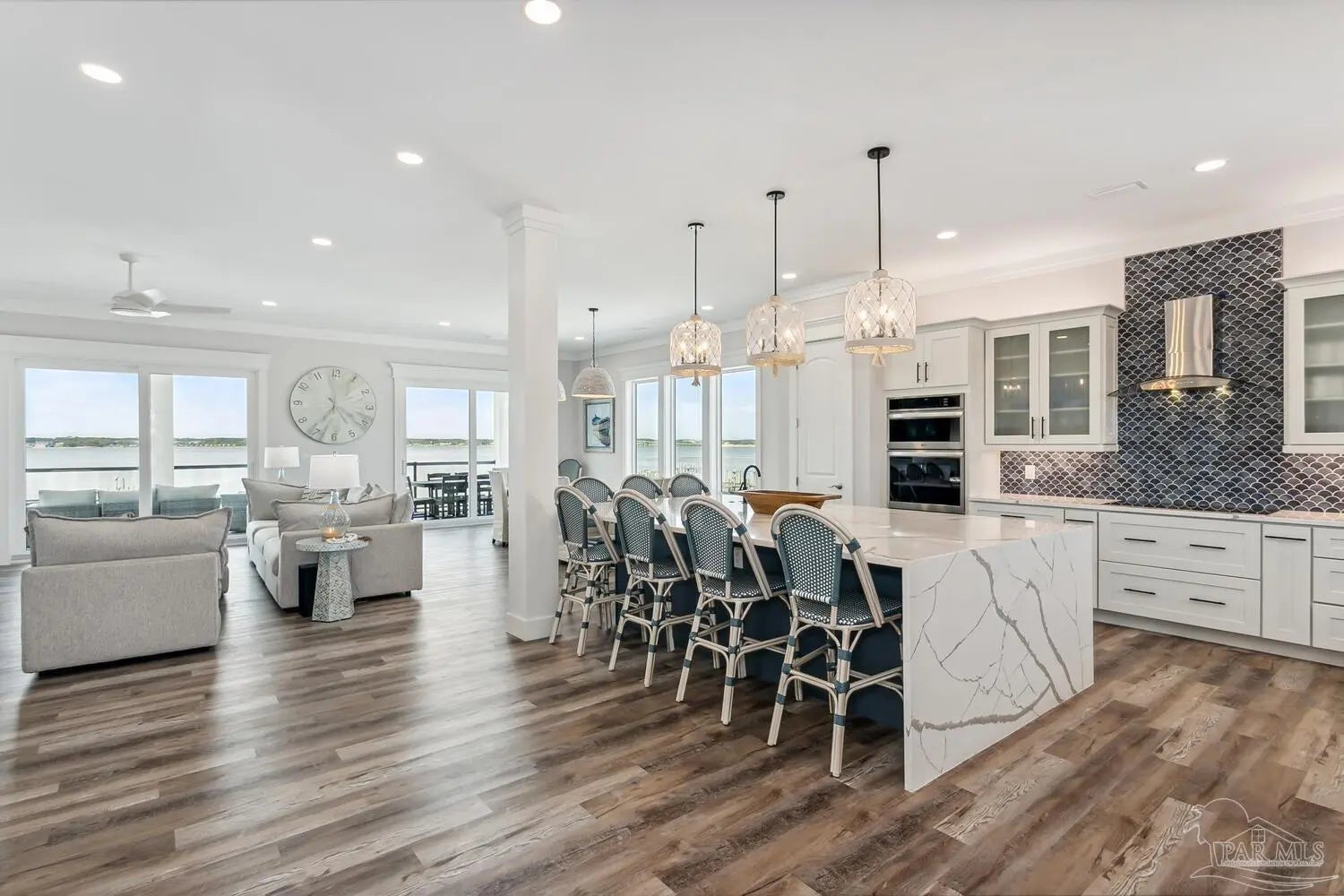 “White Pearl” – Luxury Waterfront Retreat with Private Beach, Pool, Elevator & RV Parking area. The Ultimate Vacation Home, or Vacation Rental Investment Property with potential for Wedding Venue or Special Event Venues. Welcome to the “White Pearl” – a stunning 5-star 4 bedroom 4.5 bath furnished luxury home on Navarre Beach that comfortably sleeps 14 guests. This custom-designed three-story waterfront property offers the perfect blend of elegance, comfort, and convenience. Whether you're looking for an unforgettable family getaway, an income-producing vacation rental, or a one-of-a-kind event venue, this home has it all. The 16’ x 43’ Sky-deck offers some of the best views on Navarre Beach, the sunsets and sunrises are breathtaking! Two Spacious King Suites, one on the main living level on the second floor and another on the third level each with amazing water view, ensuite spa-like baths, walk-in-showers, walk in closets and full-size washer and dryers. The third level Master suite has a Bonus area with Murphy bed. Two Bunk Rooms on the third level each with private balcony share a hallway bath. Open concept kitchen, living and dining area with floor to ceiling windows bring the beauty of Navarre beach inside. Sink into plush furniture and take in the breathtaking views or enjoy your favorite shows on the large Smart TV. Chef’s kitchen has high end appliances, 10’ island with prep sink and ice maker and seating for 8 at the bar adding to the seating for 10 at the Dining table making entertaining a breeze. Game/Media room is a spacious family retreat on the third level with oversized Smart TV, reclining sofas and access to waterfront balcony, ideal for movie nights or relaxing after a day at the beach. Outdoors is your own private beach, outdoor shower, and private pool with tanning deck. Guest will appreciate ample parking for up to 6 vehicles and room 40’ RV. Built with 180 mph construction and many custom details, this is for those who seek the very best!