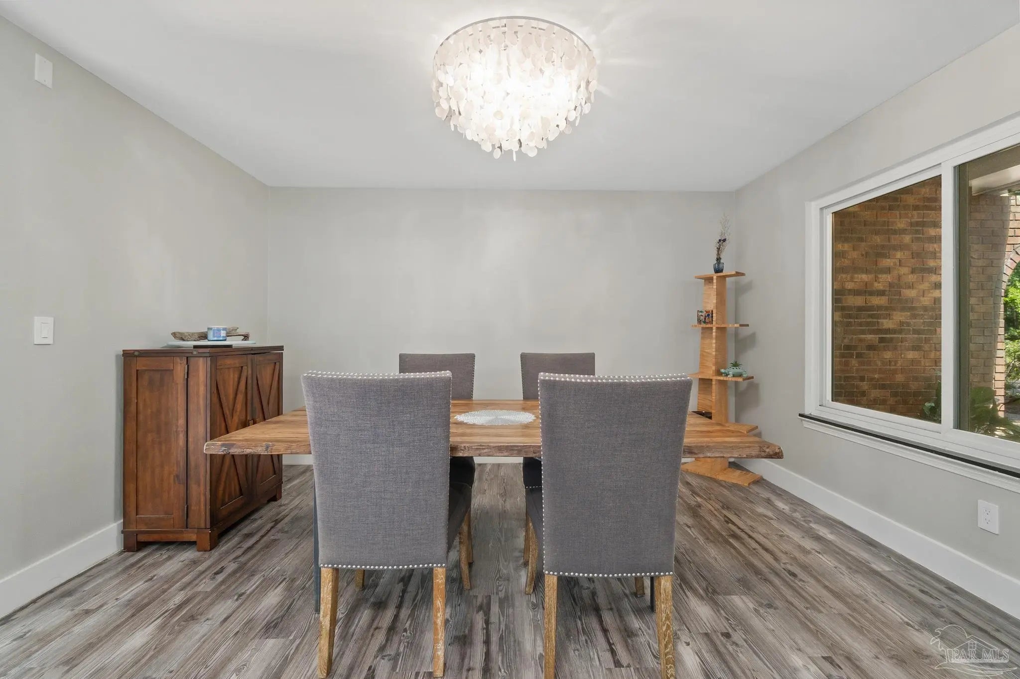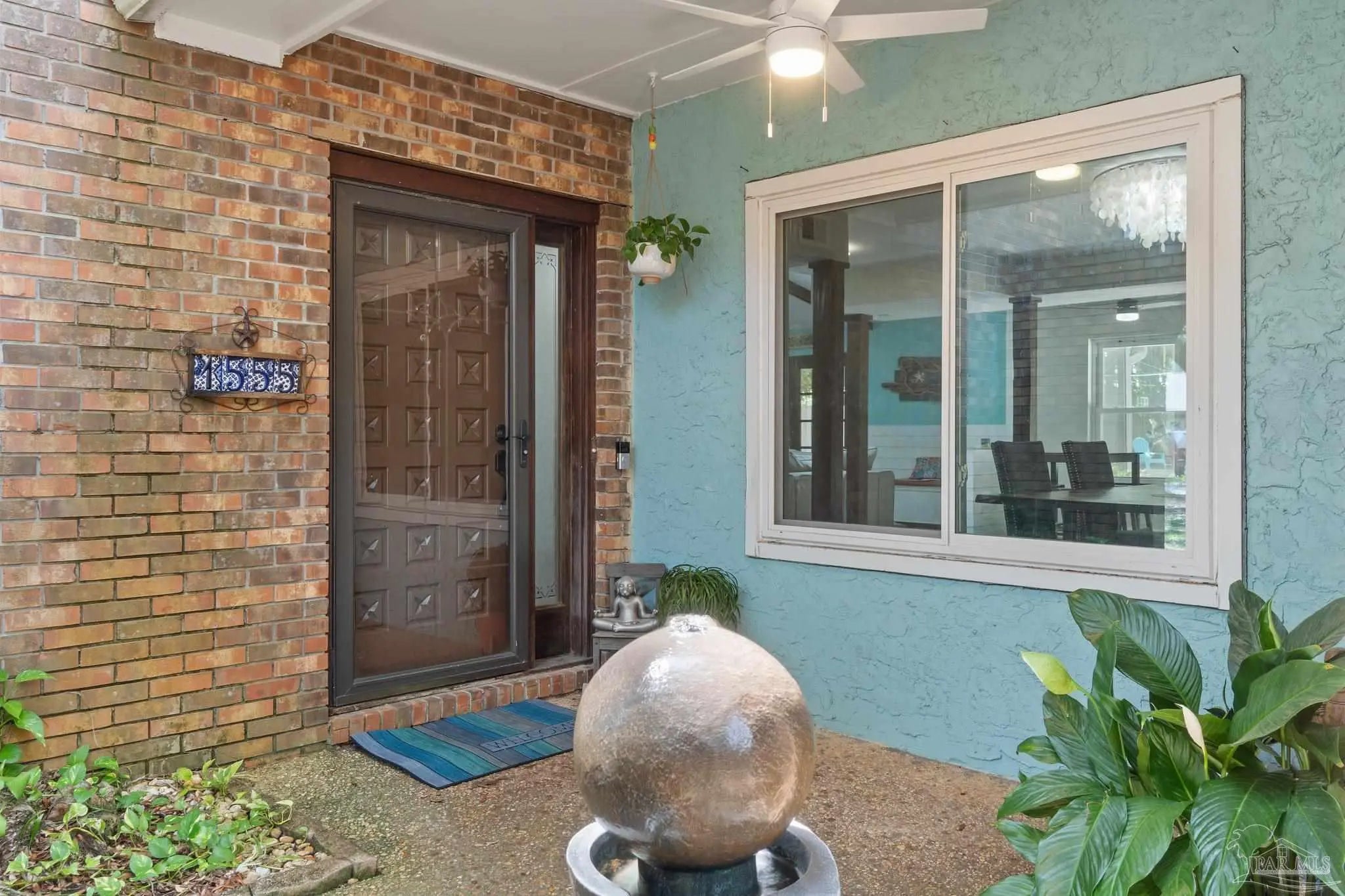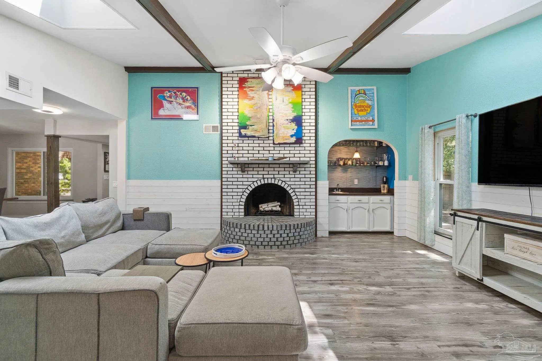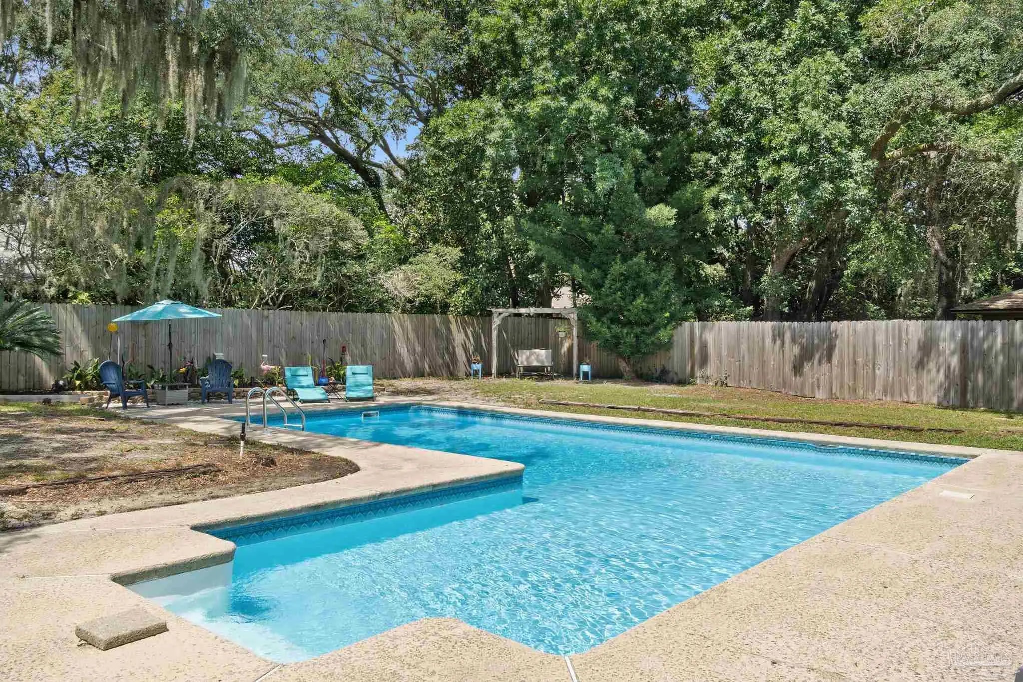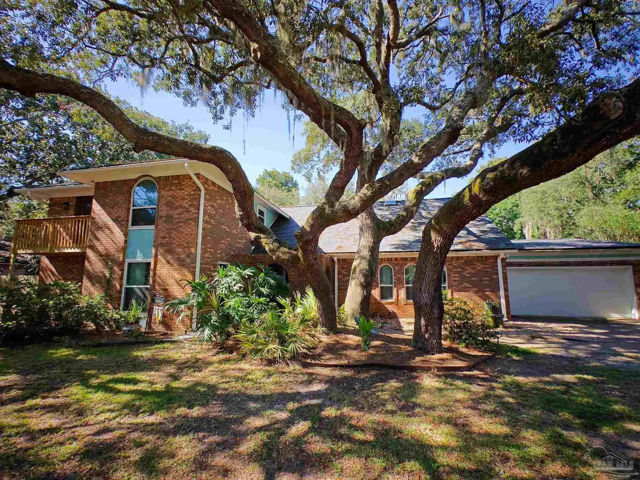 Discover charm and elegance in this 4-bedroom, 3-bathroom Gulf Breeze salt water pool home, designed for unforgettable gatherings. Situated among majestic mature Live Oak trees, this home boasts a large L-shaped pool, a spacious outdoor patio, and a 20x10 screened porch for year-round enjoyment. Step inside to the light and bright living space with vaulted ceilings, skylights, a cozy fireplace, ship lap accents, and a stylish wet bar, which opens seamlessly into the eat-in kitchen featuring granite countertops, and ample cabinetry with pantry. The first floor also offers a formal dining area with a view of the courtyard entry, an additional cozy family room, a bedroom next to a full bathroom, and a private office space with exterior entry. Ascend the curved staircase to find two inviting guest bedrooms, each with access to a relaxing front balcony. The expansive primary suite, also on the second level, features a private balcony with serene views of the fenced backyard and sparkling pool, plus a luxurious newly renovated en-suite bathroom. You’ll also find an additional bonus space, suitable for more storage or game room. With a new roof, impact windows, generous room sizes, abundant closet space, additional storage, and a two-car garage, this home combines practicality with sophistication. Don’t miss your chance to own this entertainer’s paradise in Gulf Breeze!