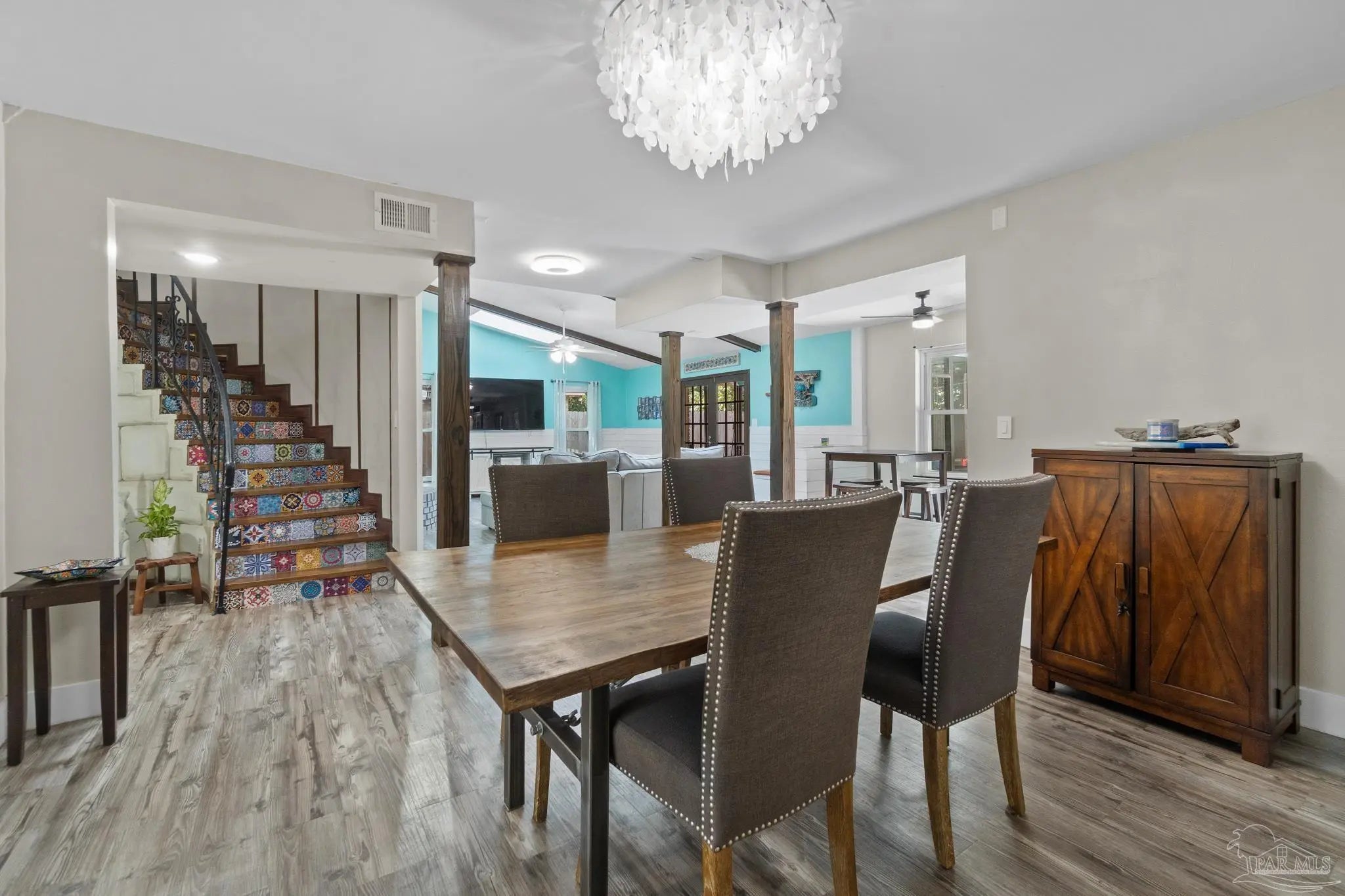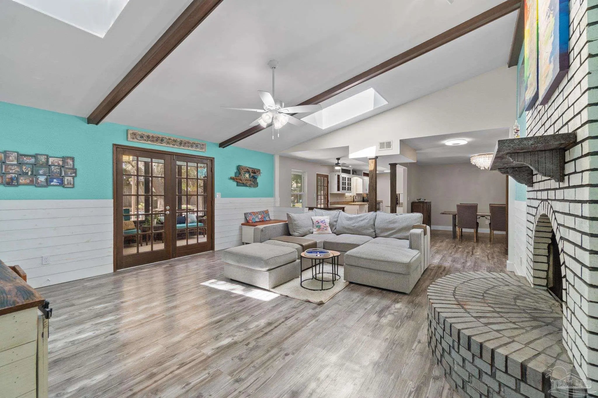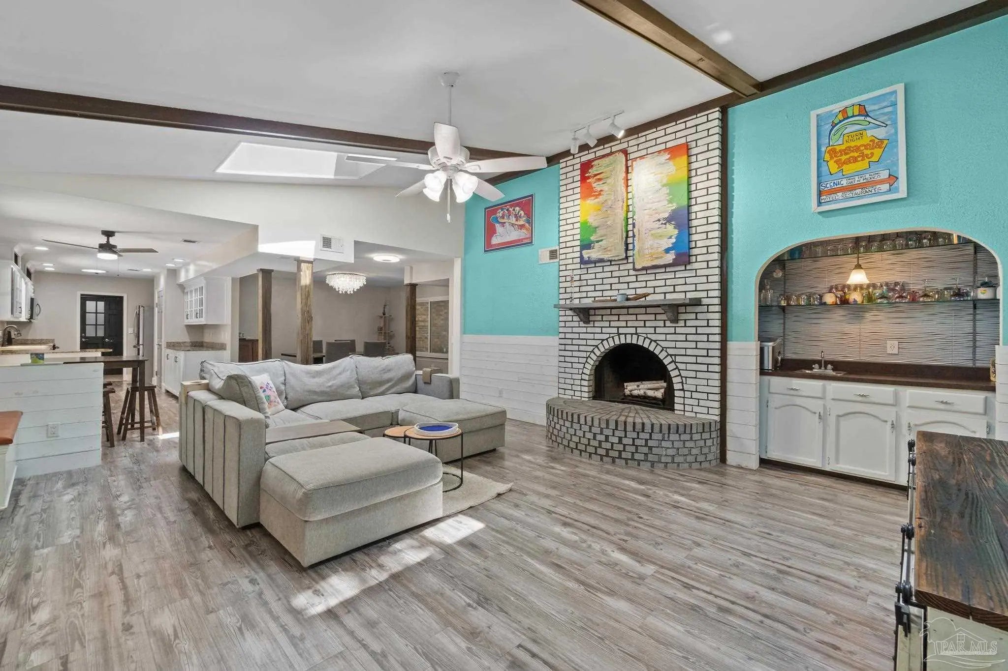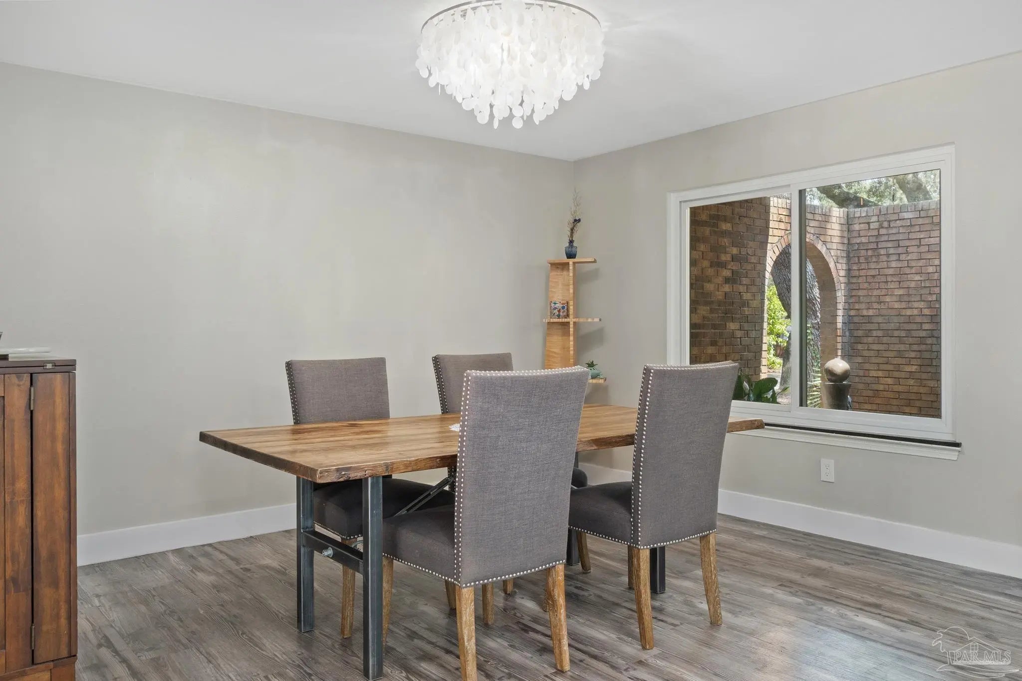 Discover charm and elegance in this 4-bedroom, 3-bathroom Gulf Breeze salt water pool home, designed for unforgettable gatherings. Situated among majestic mature Live Oak trees, this home boasts a large L-shaped pool, a spacious outdoor patio, and a 20x10 screened porch for year-round enjoyment. Step inside to the light and bright living space with vaulted ceilings, skylights, a cozy fireplace, ship lap accents, and a stylish wet bar, which opens seamlessly into the eat-in kitchen featuring granite countertops, and ample cabinetry with pantry. The first floor also offers a formal dining area with a view of the courtyard entry, an additional cozy family room, a bedroom next to a full bathroom, and a private office space with exterior entry. Ascend the curved staircase to find two inviting guest bedrooms, each with access to a relaxing front balcony. The expansive primary suite, also on the second level, features a private balcony with serene views of the fenced backyard and sparkling pool, plus a luxurious newly renovated en-suite bathroom. You’ll also find an additional bonus space, suitable for more storage or game room. With a new roof, impact windows, generous room sizes, abundant closet space, additional storage, and a two-car garage, this home combines practicality with sophistication. Don’t miss your chance to own this entertainer’s paradise in Gulf Breeze!