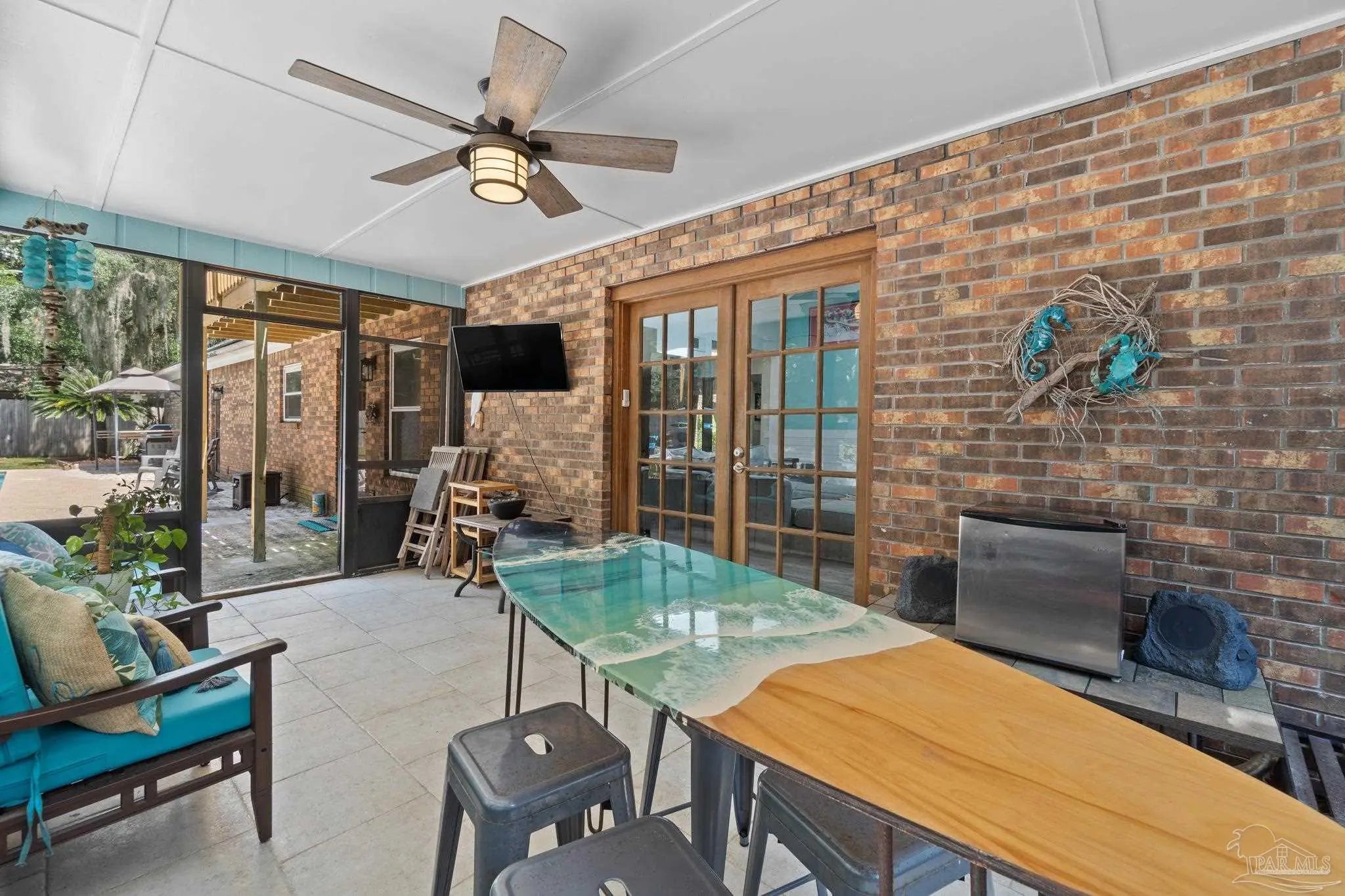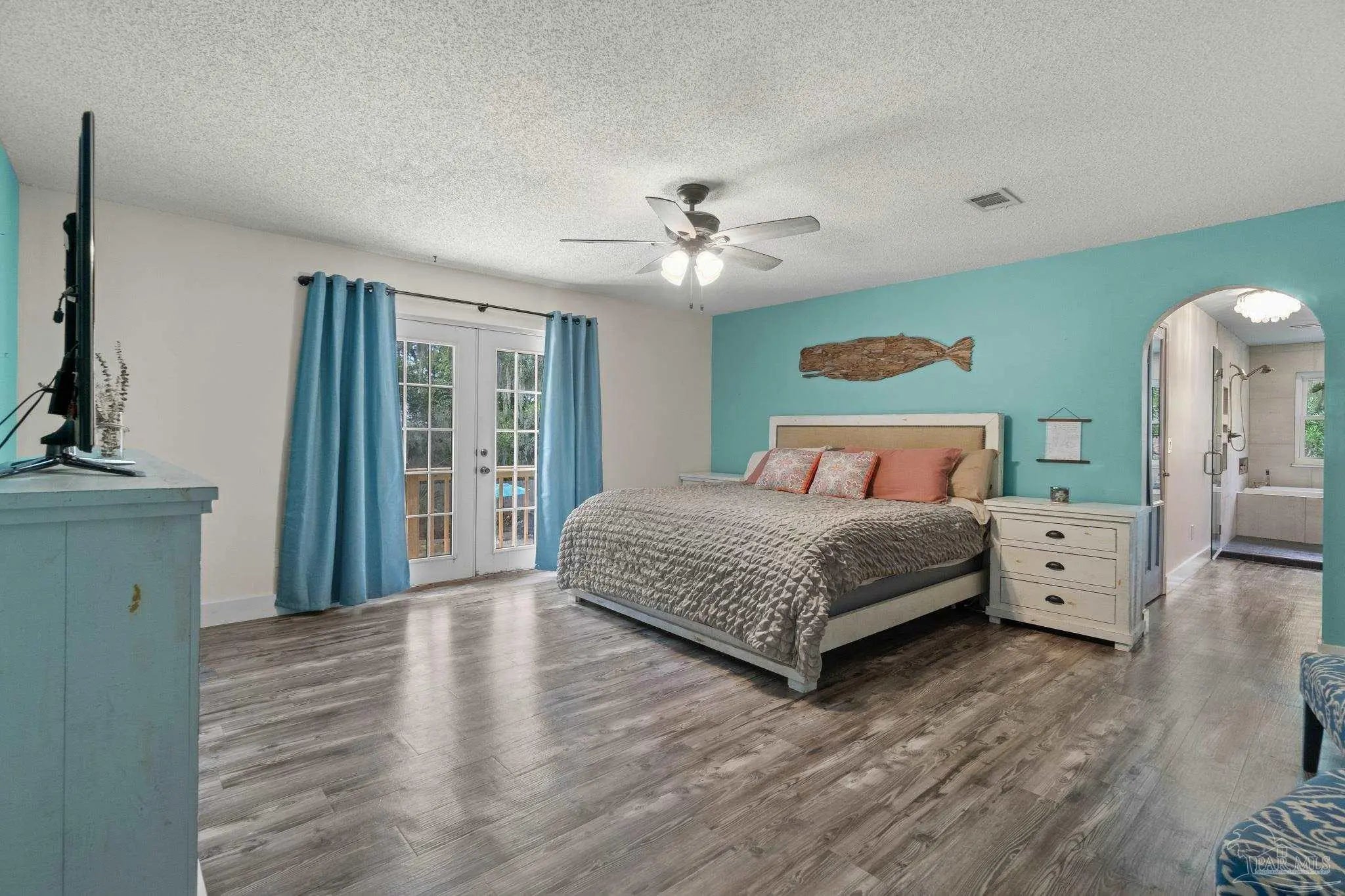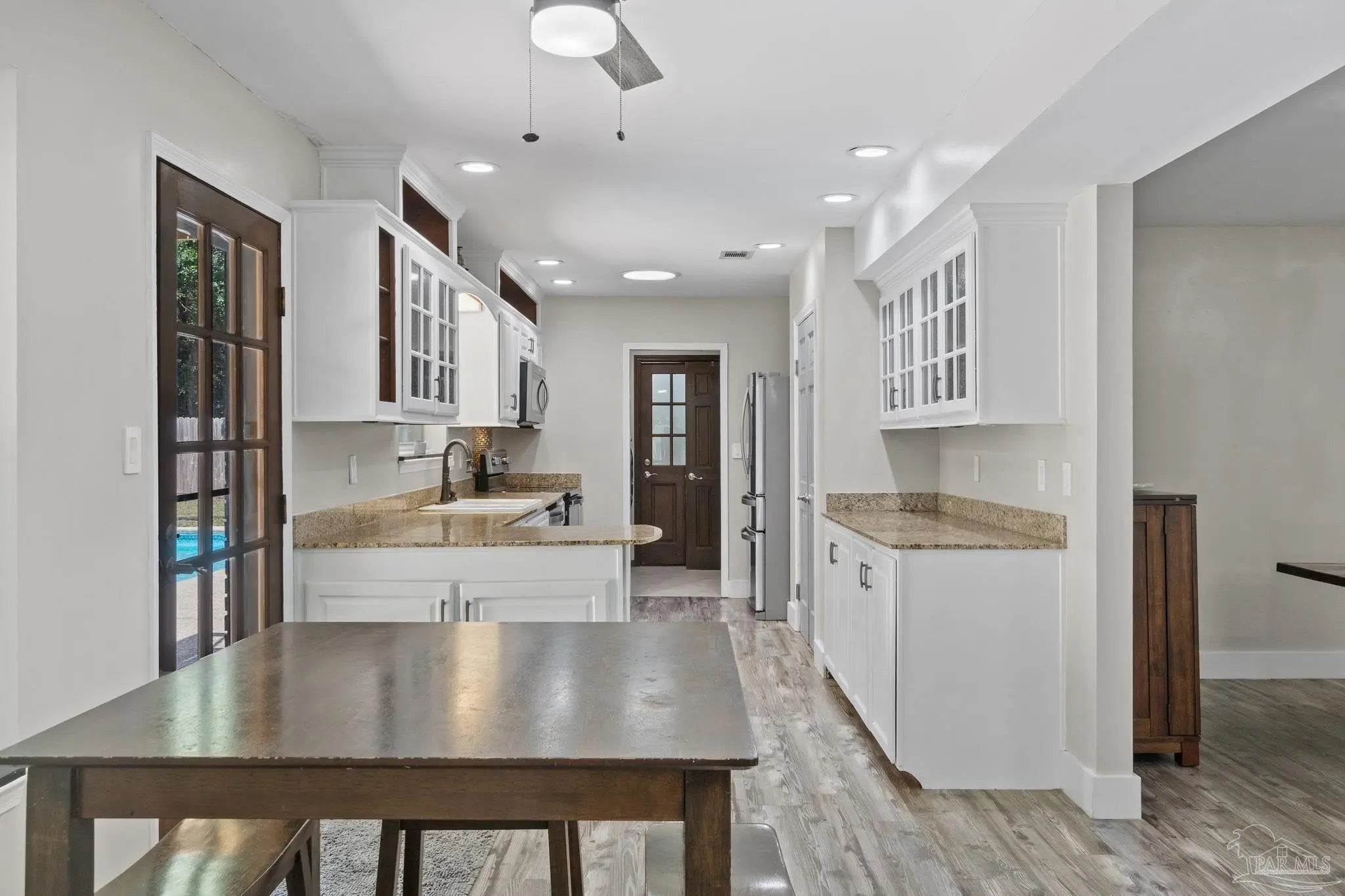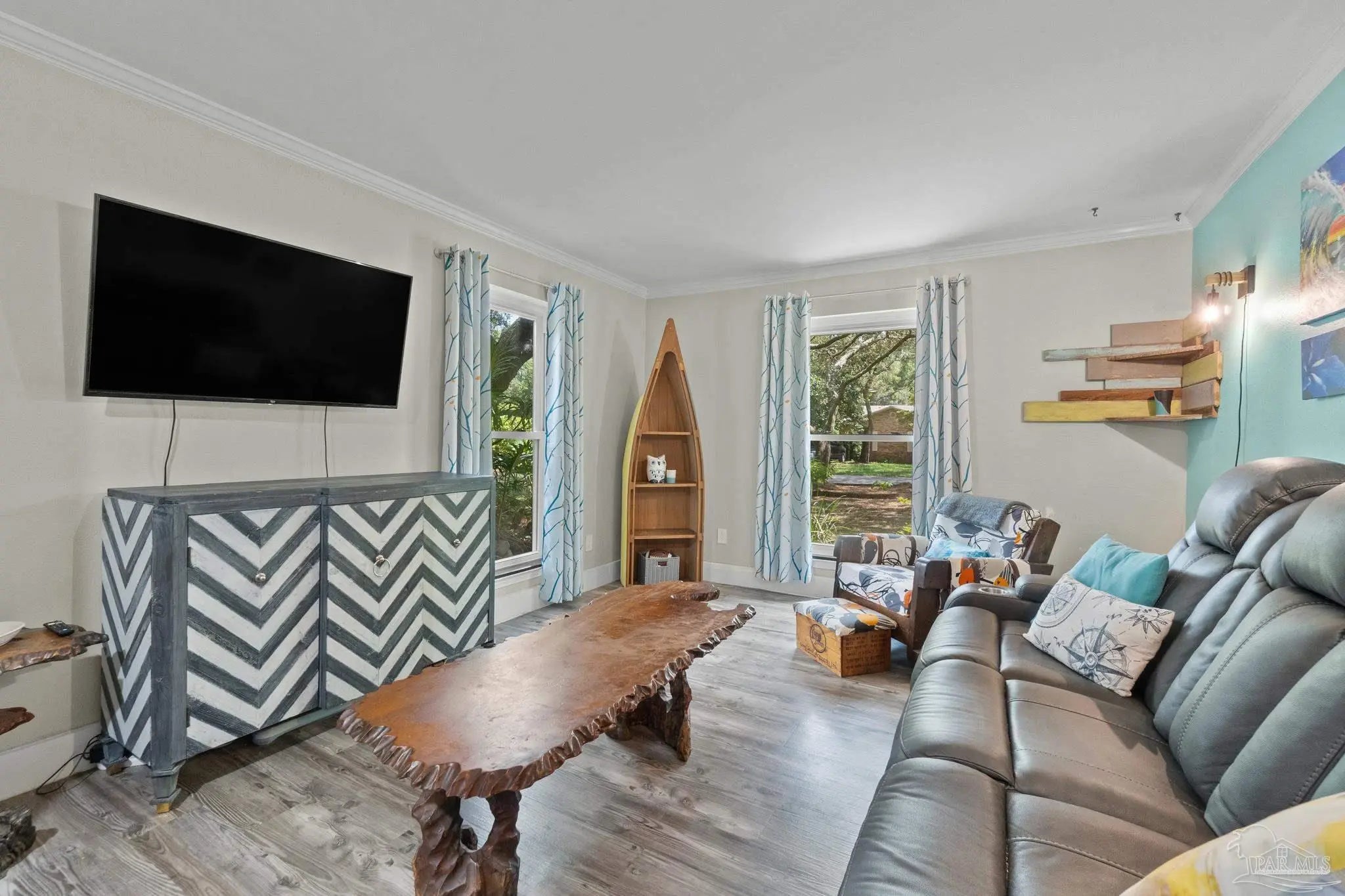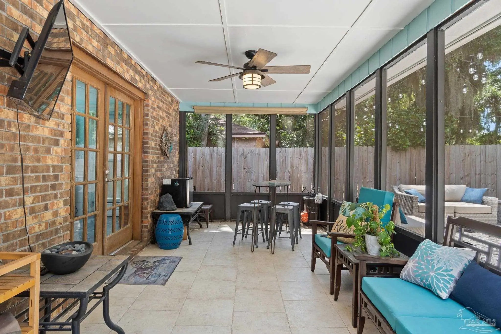 Discover charm and elegance in this 4-bedroom, 3-bathroom Gulf Breeze salt water pool home, designed for unforgettable gatherings. Situated among majestic mature Live Oak trees, this home boasts a large L-shaped pool, a spacious outdoor patio, and a 20x10 screened porch for year-round enjoyment. Step inside to the light and bright living space with vaulted ceilings, skylights, a cozy fireplace, ship lap accents, and a stylish wet bar, which opens seamlessly into the eat-in kitchen featuring granite countertops, and ample cabinetry with pantry. The first floor also offers a formal dining area with a view of the courtyard entry, an additional cozy family room, a bedroom next to a full bathroom, and a private office space with exterior entry. Ascend the curved staircase to find two inviting guest bedrooms, each with access to a relaxing front balcony. The expansive primary suite, also on the second level, features a private balcony with serene views of the fenced backyard and sparkling pool, plus a luxurious newly renovated en-suite bathroom. You’ll also find an additional bonus space, suitable for more storage or game room. With a new roof, impact windows, generous room sizes, abundant closet space, additional storage, and a two-car garage, this home combines practicality with sophistication. Don’t miss your chance to own this entertainer’s paradise in Gulf Breeze!