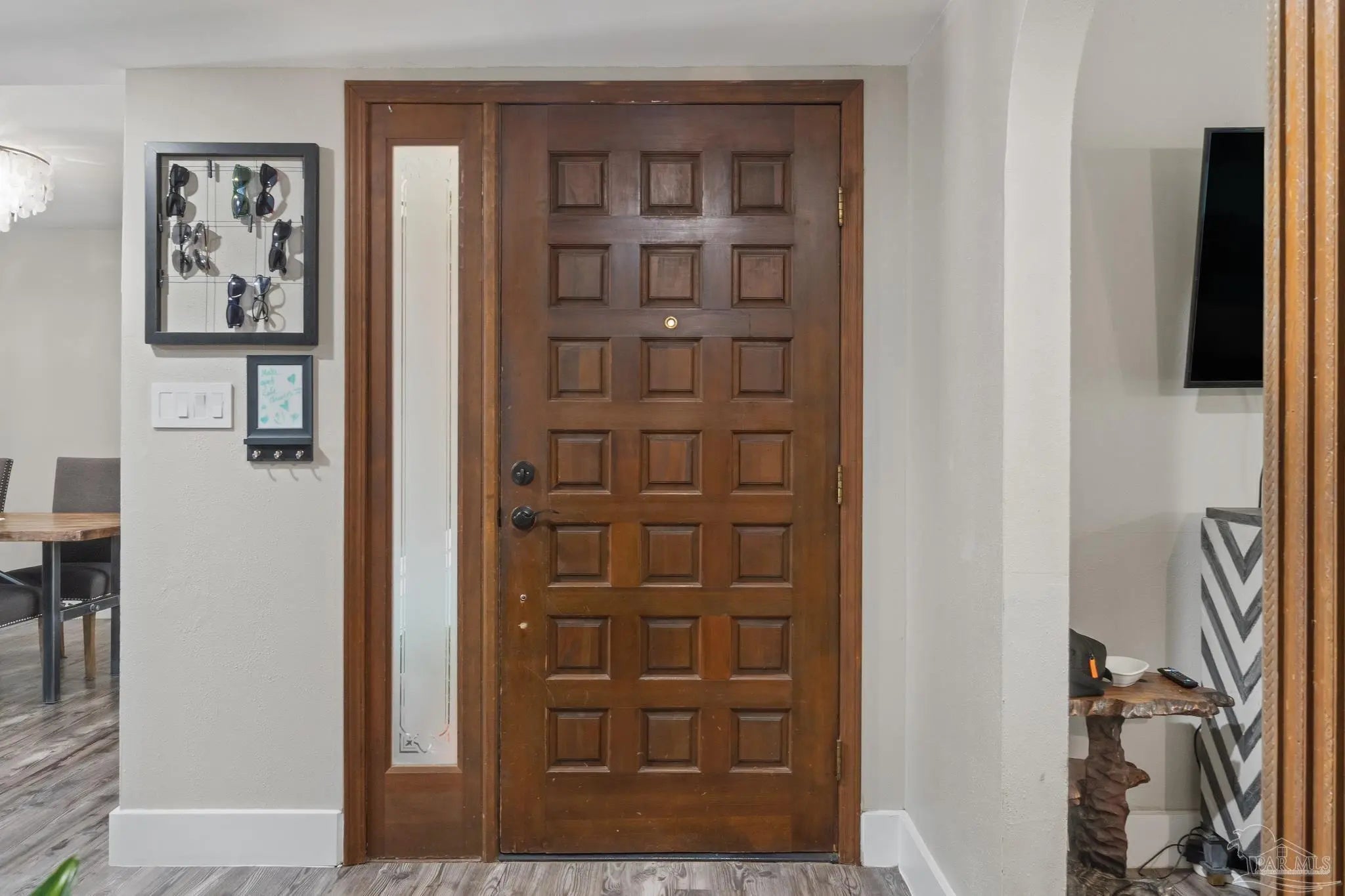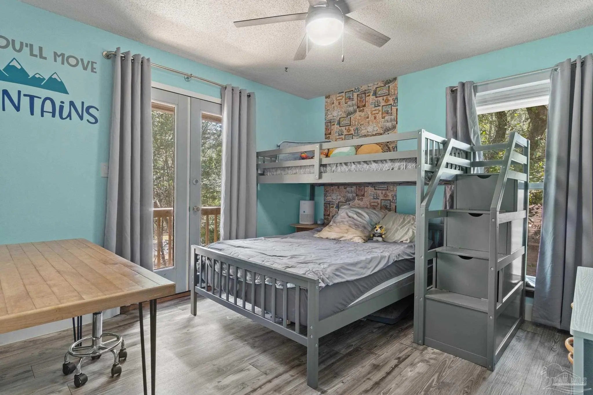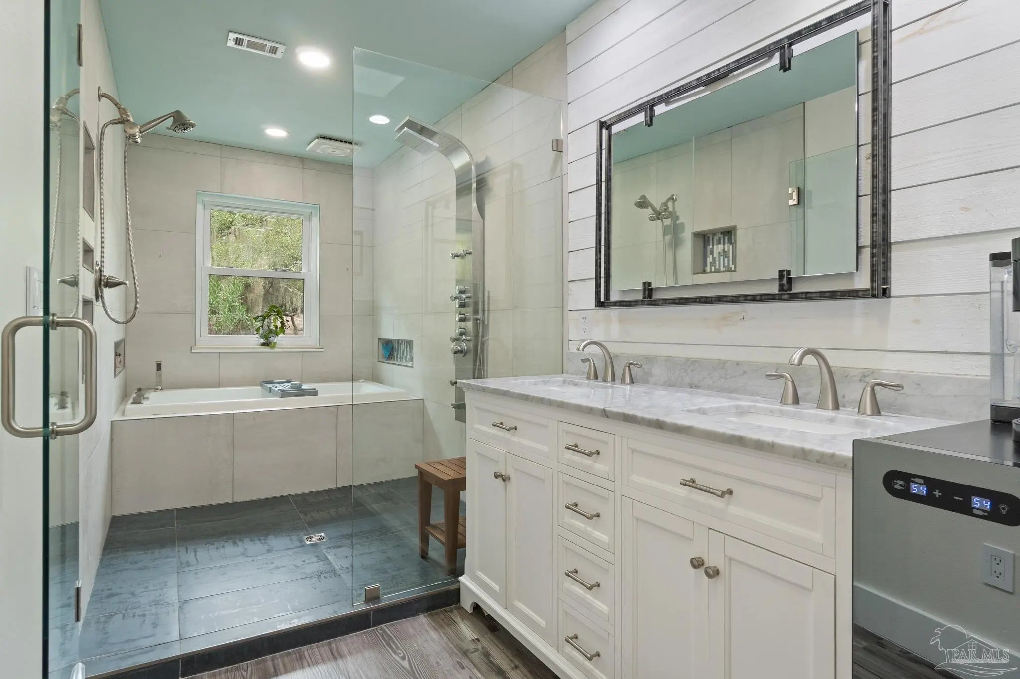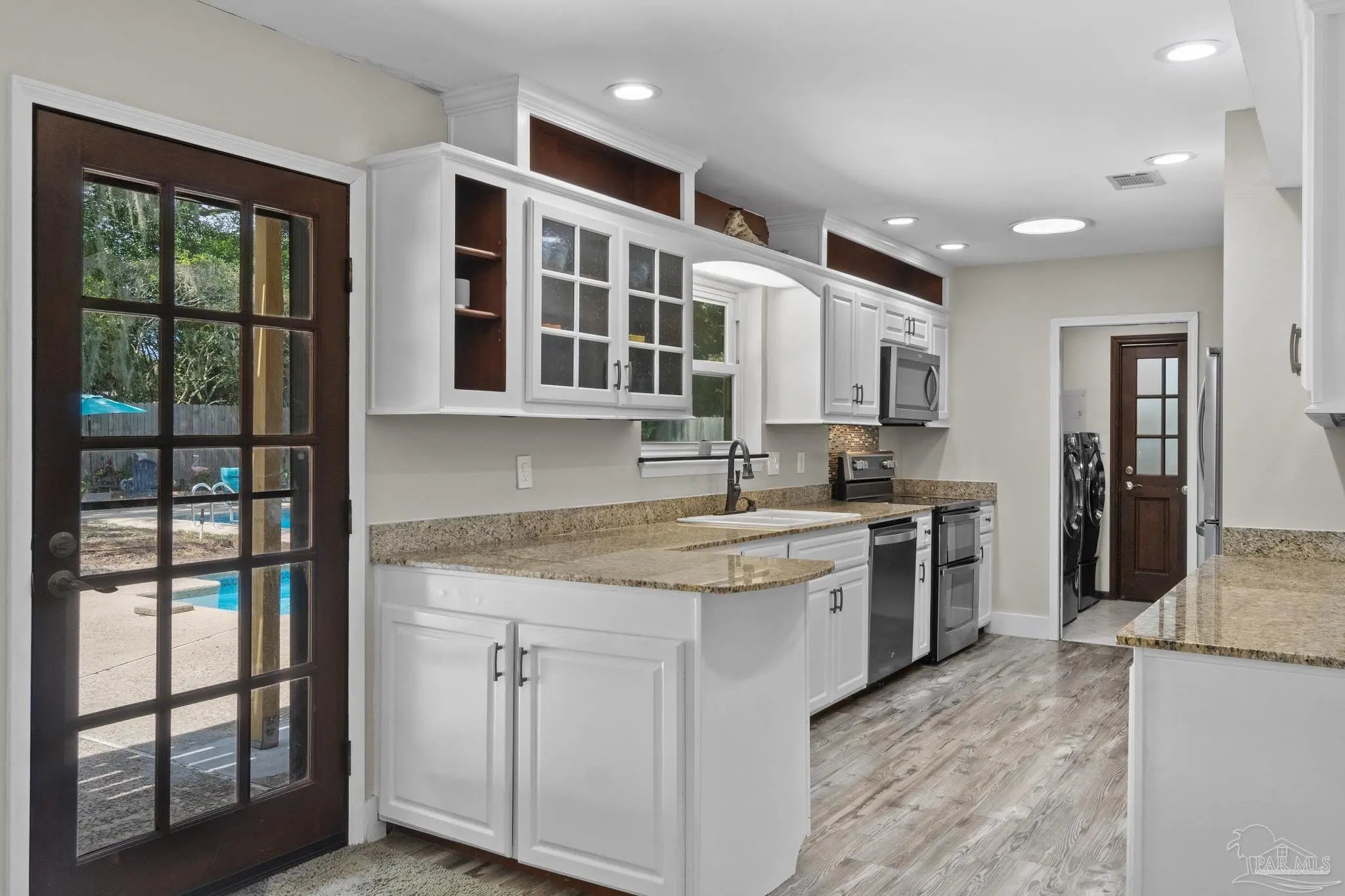 Discover charm and elegance in this 4-bedroom, 3-bathroom Gulf Breeze salt water pool home, designed for unforgettable gatherings. Situated among majestic mature Live Oak trees, this home boasts a large L-shaped pool, a spacious outdoor patio, and a 20x10 screened porch for year-round enjoyment. Step inside to the light and bright living space with vaulted ceilings, skylights, a cozy fireplace, ship lap accents, and a stylish wet bar, which opens seamlessly into the eat-in kitchen featuring granite countertops, and ample cabinetry with pantry. The first floor also offers a formal dining area with a view of the courtyard entry, an additional cozy family room, a bedroom next to a full bathroom, and a private office space with exterior entry. Ascend the curved staircase to find two inviting guest bedrooms, each with access to a relaxing front balcony. The expansive primary suite, also on the second level, features a private balcony with serene views of the fenced backyard and sparkling pool, plus a luxurious newly renovated en-suite bathroom. You’ll also find an additional bonus space, suitable for more storage or game room. With a new roof, impact windows, generous room sizes, abundant closet space, additional storage, and a two-car garage, this home combines practicality with sophistication. Don’t miss your chance to own this entertainer’s paradise in Gulf Breeze!