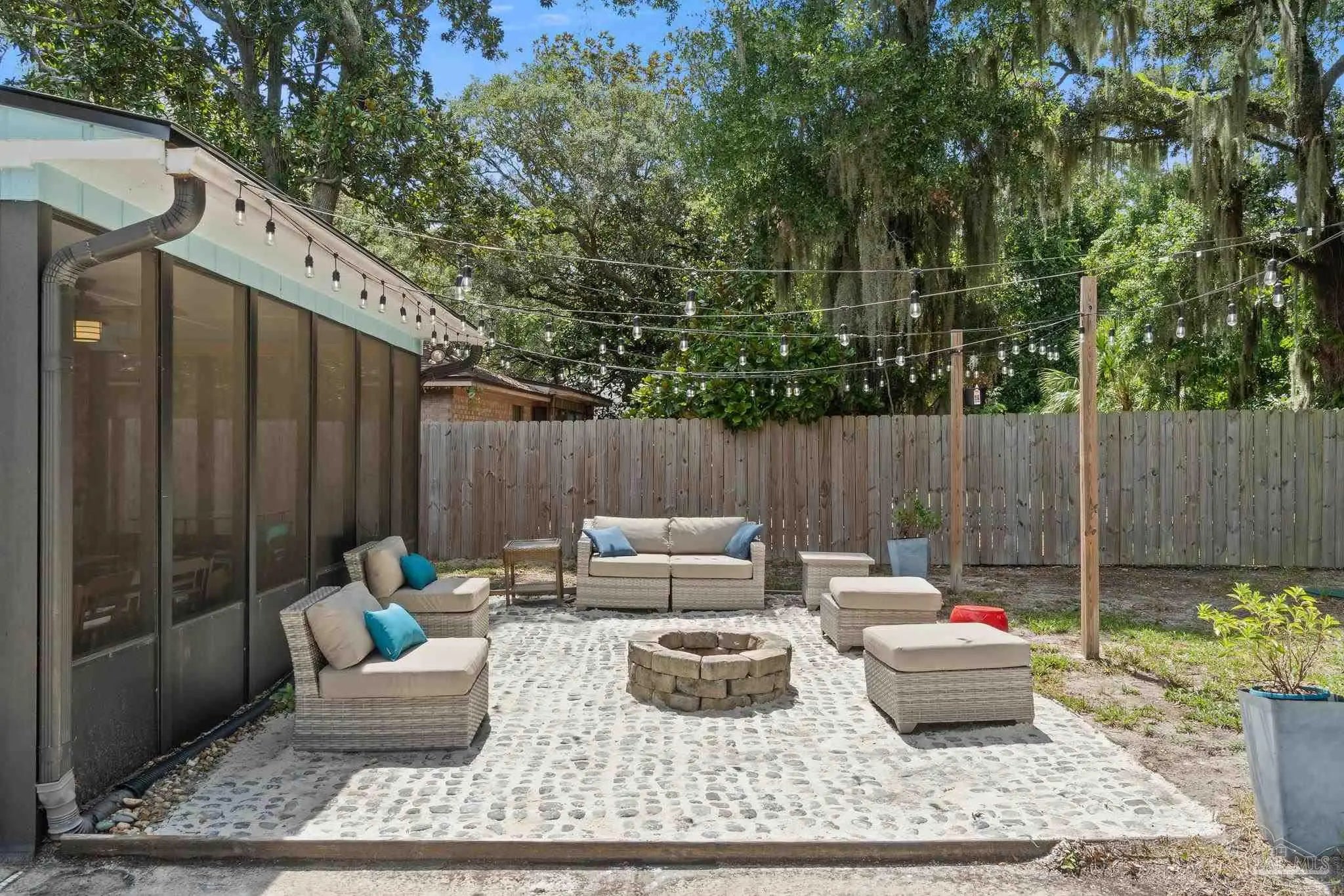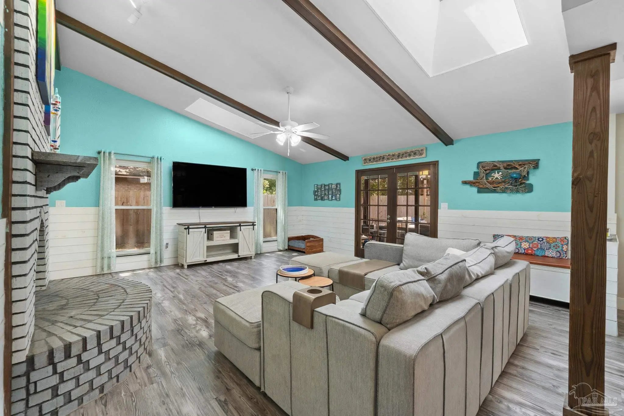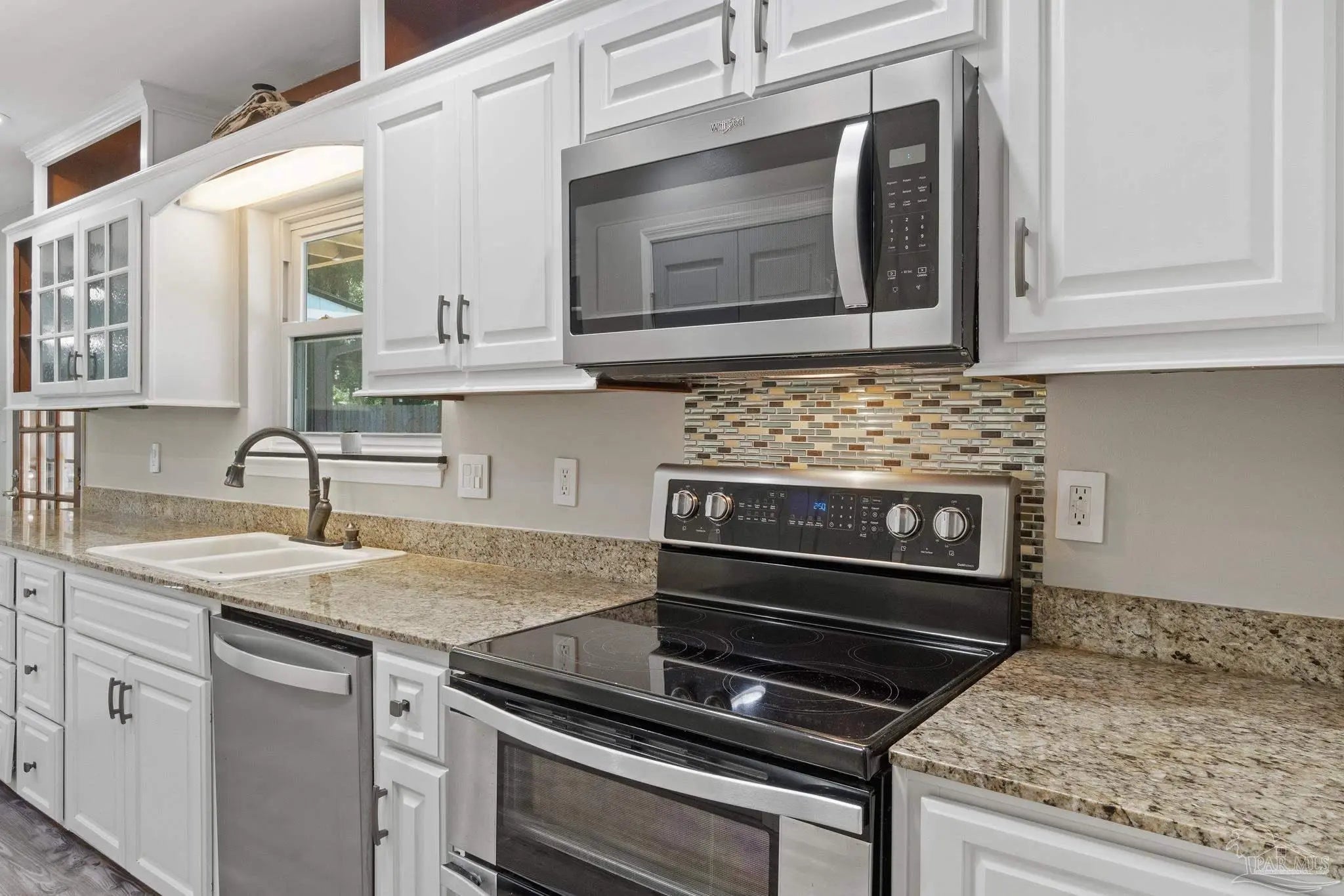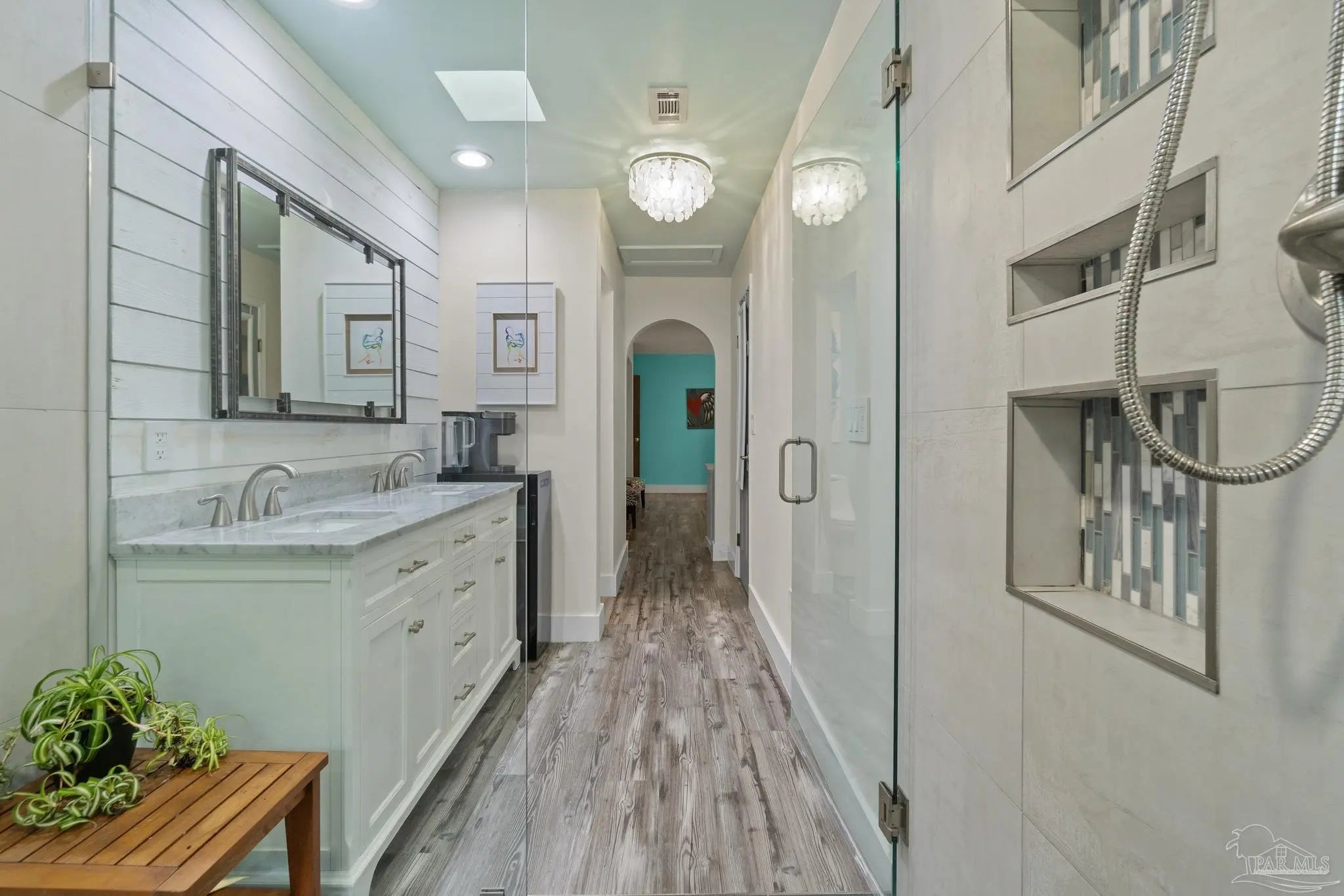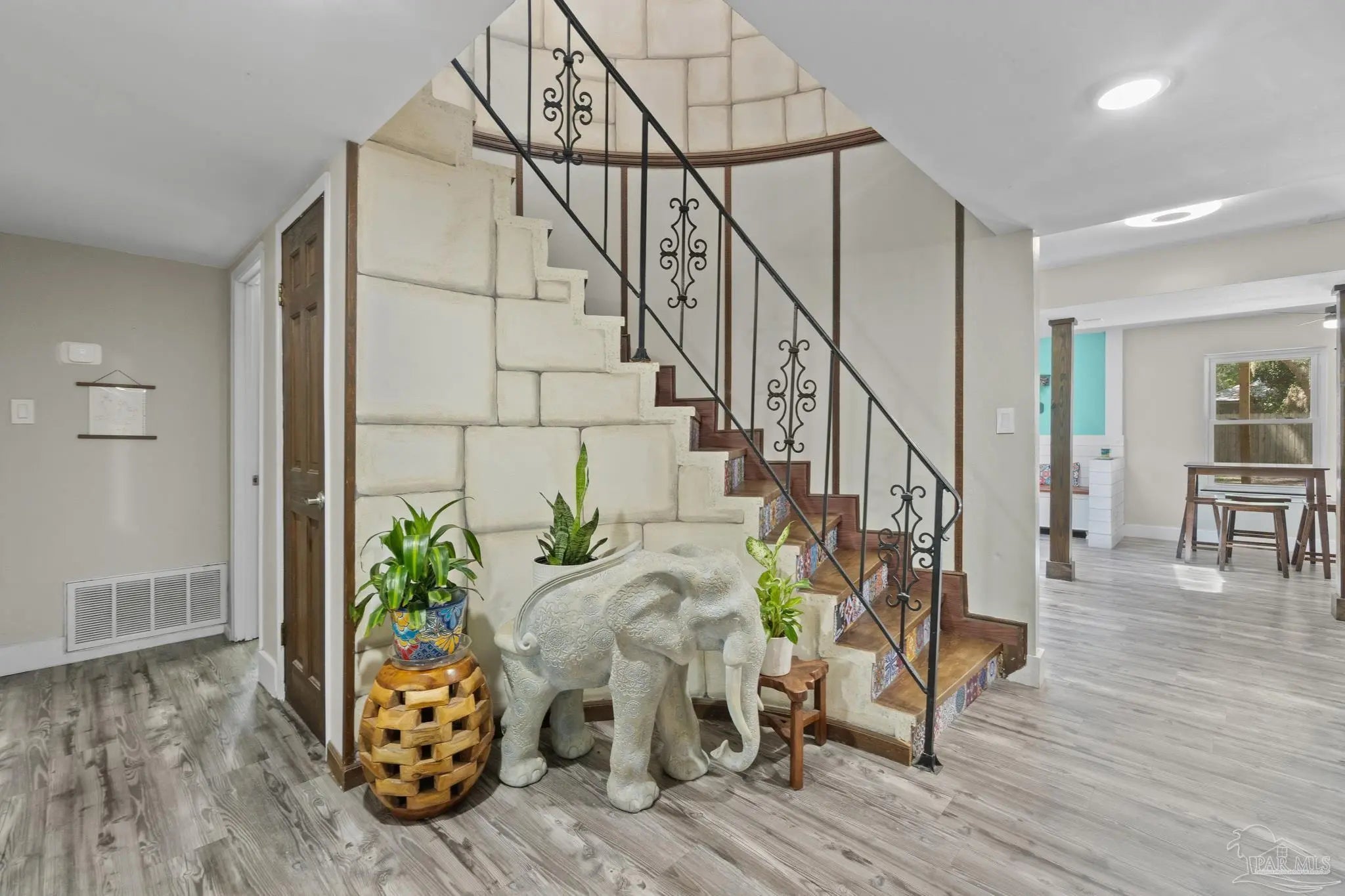 Discover charm and elegance in this 4-bedroom, 3-bathroom Gulf Breeze salt water pool home, designed for unforgettable gatherings. Situated among majestic mature Live Oak trees, this home boasts a large L-shaped pool, a spacious outdoor patio, and a 20x10 screened porch for year-round enjoyment. Step inside to the light and bright living space with vaulted ceilings, skylights, a cozy fireplace, ship lap accents, and a stylish wet bar, which opens seamlessly into the eat-in kitchen featuring granite countertops, and ample cabinetry with pantry. The first floor also offers a formal dining area with a view of the courtyard entry, an additional cozy family room, a bedroom next to a full bathroom, and a private office space with exterior entry. Ascend the curved staircase to find two inviting guest bedrooms, each with access to a relaxing front balcony. The expansive primary suite, also on the second level, features a private balcony with serene views of the fenced backyard and sparkling pool, plus a luxurious newly renovated en-suite bathroom. You’ll also find an additional bonus space, suitable for more storage or game room. With a new roof, impact windows, generous room sizes, abundant closet space, additional storage, and a two-car garage, this home combines practicality with sophistication. Don’t miss your chance to own this entertainer’s paradise in Gulf Breeze!
