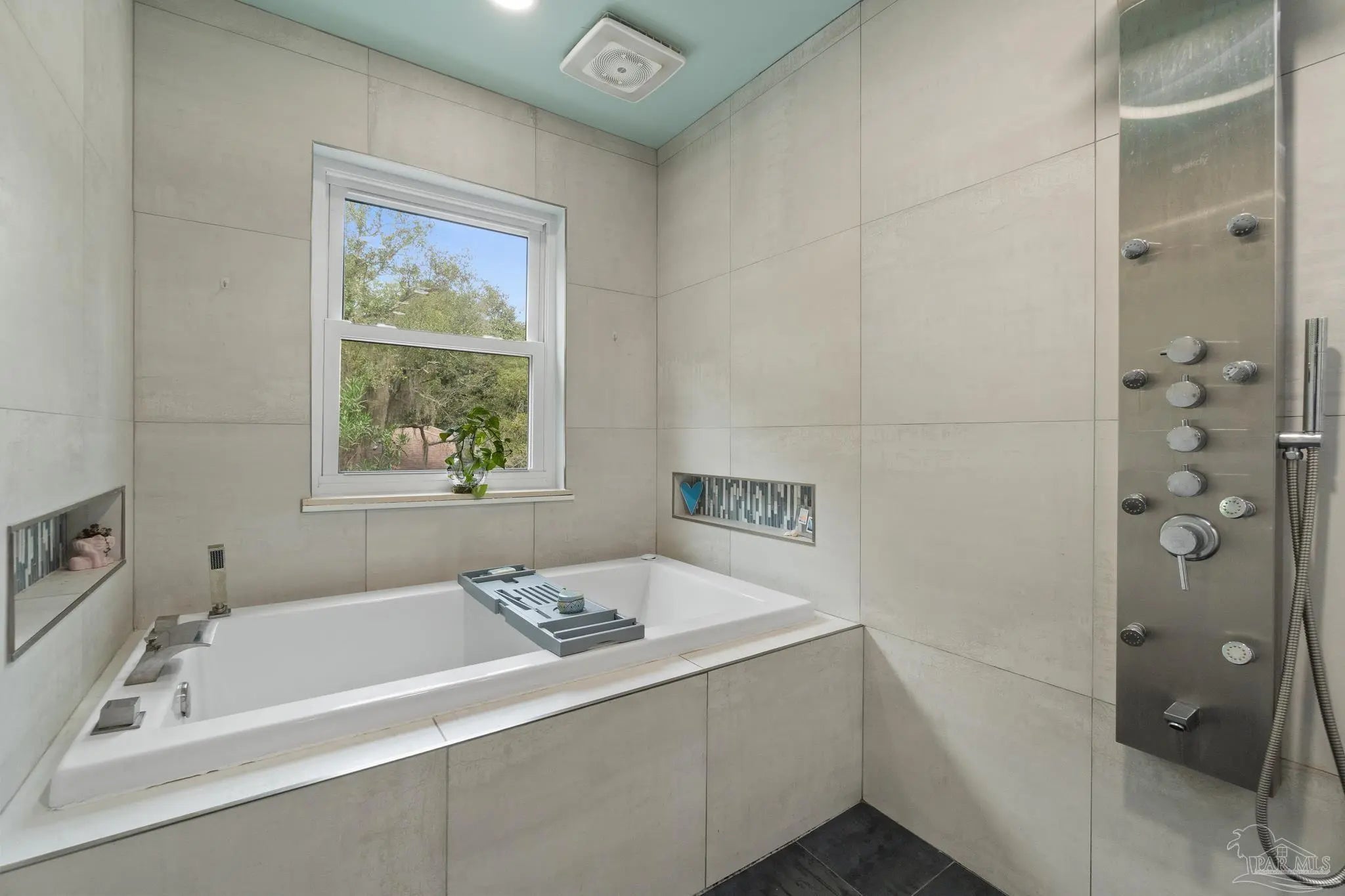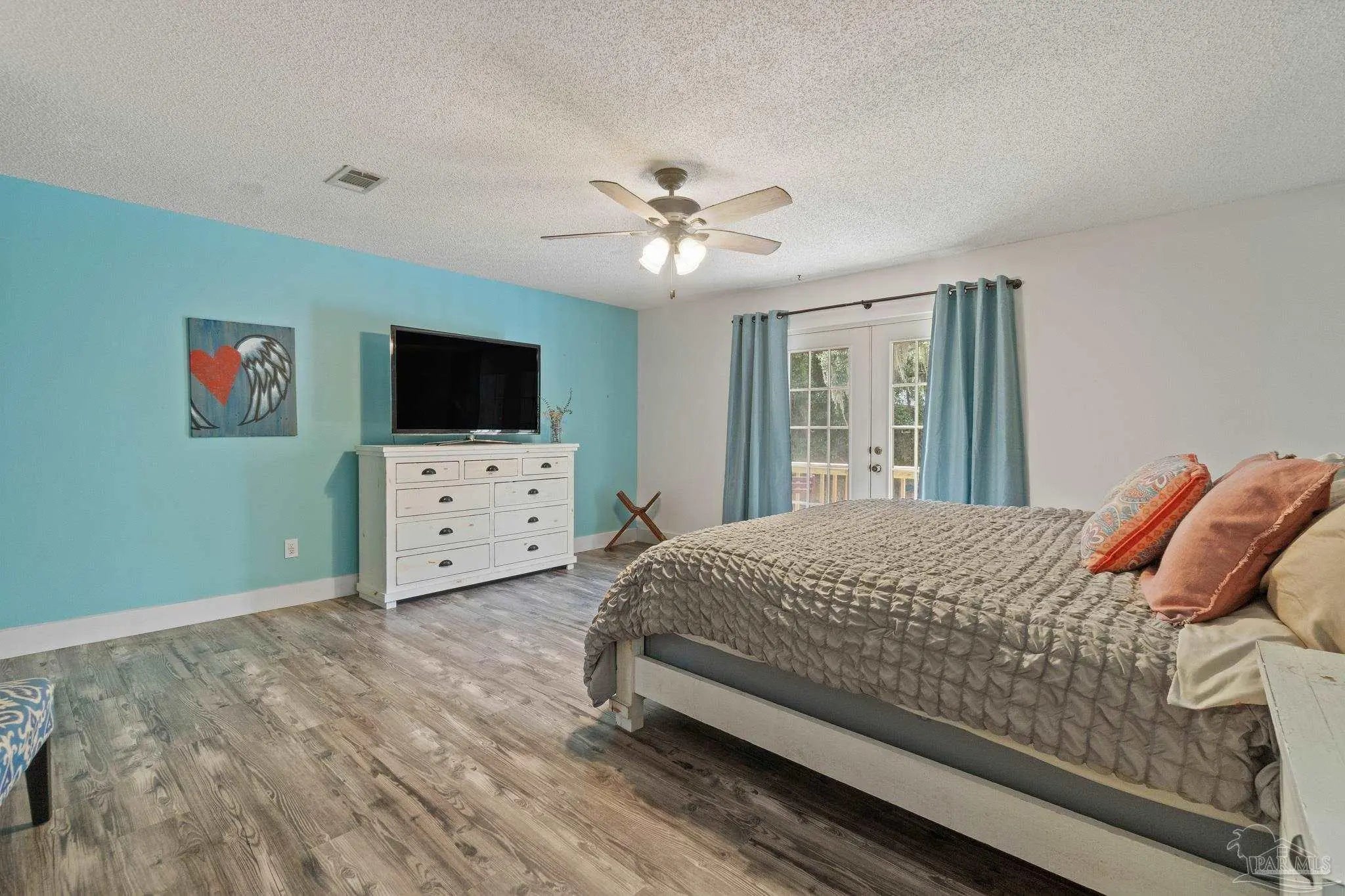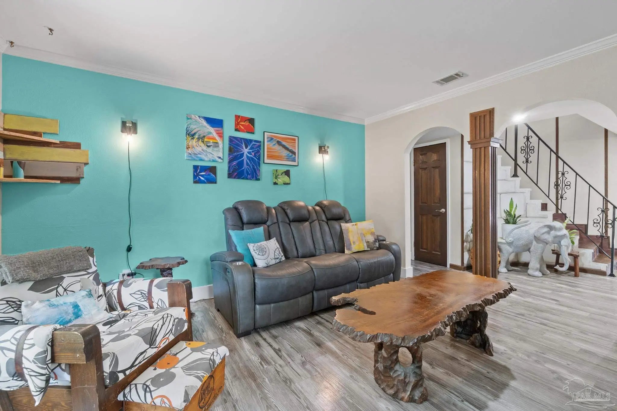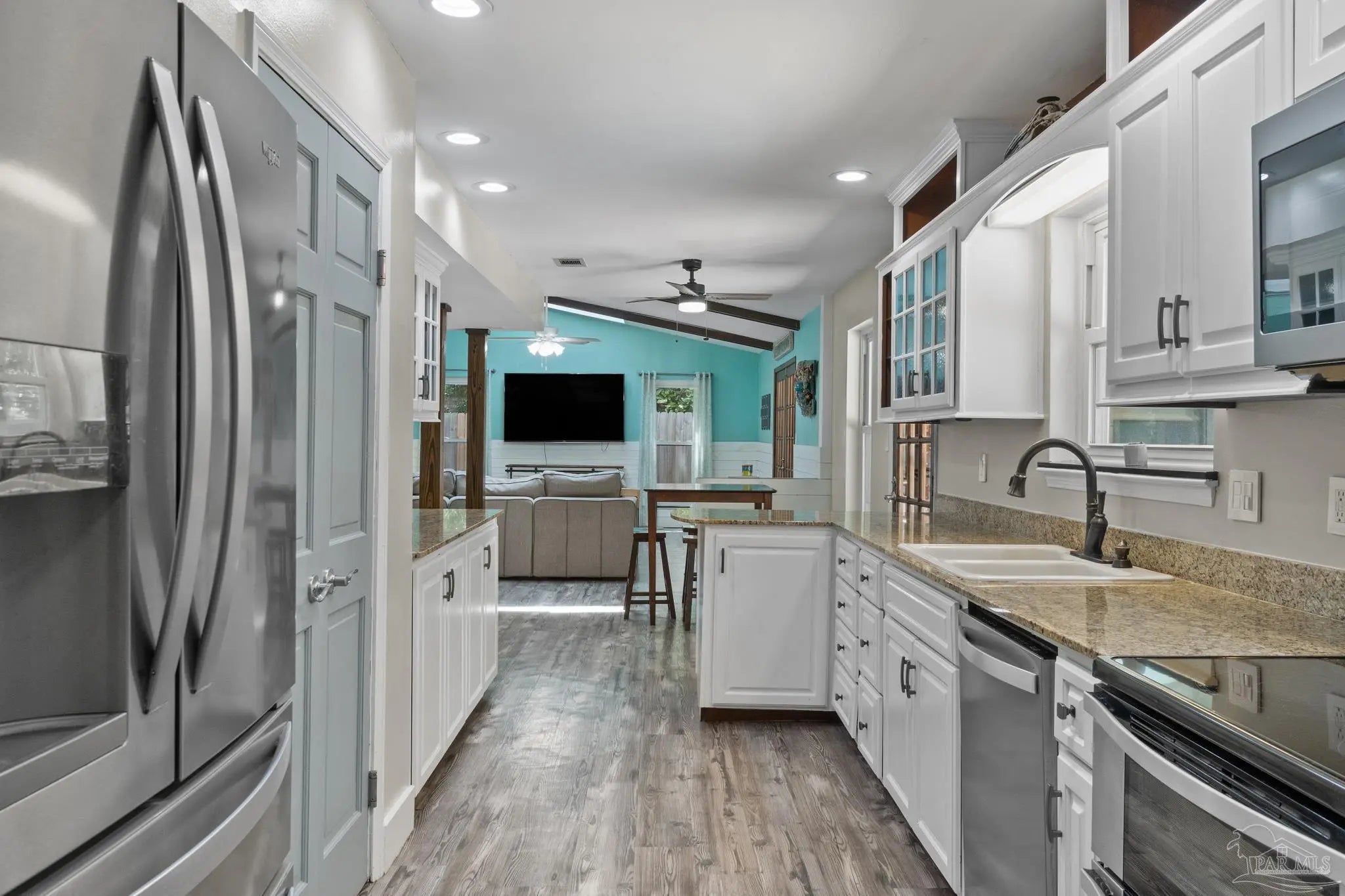 Discover charm and elegance in this 4-bedroom, 3-bathroom Gulf Breeze salt water pool home, designed for unforgettable gatherings. Situated among majestic mature Live Oak trees, this home boasts a large L-shaped pool, a spacious outdoor patio, and a 20x10 screened porch for year-round enjoyment. Step inside to the light and bright living space with vaulted ceilings, skylights, a cozy fireplace, ship lap accents, and a stylish wet bar, which opens seamlessly into the eat-in kitchen featuring granite countertops, and ample cabinetry with pantry. The first floor also offers a formal dining area with a view of the courtyard entry, an additional cozy family room, a bedroom next to a full bathroom, and a private office space with exterior entry. Ascend the curved staircase to find two inviting guest bedrooms, each with access to a relaxing front balcony. The expansive primary suite, also on the second level, features a private balcony with serene views of the fenced backyard and sparkling pool, plus a luxurious newly renovated en-suite bathroom. You’ll also find an additional bonus space, suitable for more storage or game room. With a new roof, impact windows, generous room sizes, abundant closet space, additional storage, and a two-car garage, this home combines practicality with sophistication. Don’t miss your chance to own this entertainer’s paradise in Gulf Breeze!