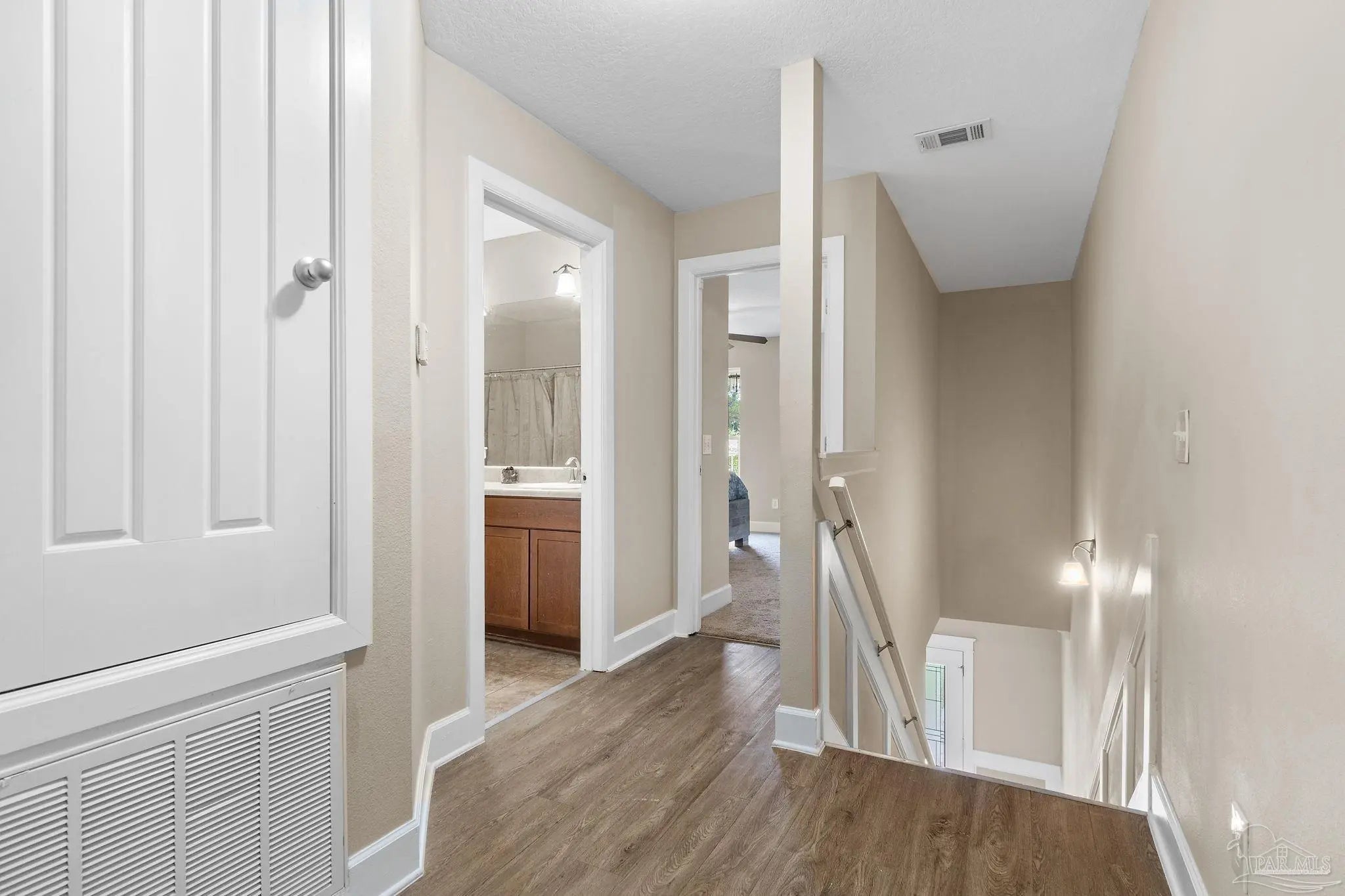 Welcome home to this exquisite Craftsman-style residence offering an abundance of Southern charm and thoughtful design. Step through the decorative full-view glass front door into a bright and airy open-concept living space, where 9-foot ceilings and large windows create an inviting atmosphere. The main floor common areas have been upgraded with neutral luxury vinyl plank flooring and detailed wainscoting, setting a tone of casual elegance. The spacious kitchen is undoubtedly the heart of the home, featuring handsome, wood-toned Shaker cabinetry, a full suite of stainless steel appliances, and a functional center island that is perfect for meal preparation and entertaining. For guests, a chic powder room is conveniently placed just off the central kitchen and dining area. A large, dedicated laundry room simplifies daily chores and offers extra utility space. The main level also hosts the serene primary suite. Expansive and light-filled, there's room to accommodate a king-sized bedroom suite. The walk-in closet is any fashion enthusiast's dream come true. The primary bath offers an equally impressive amount of space, sporting a double vanity, separate shower, soaking tub, water closets, and linen storage. Upstairs, you'll find two oversized guest bedrooms, each offering ample storage space and plenty of room for comfort. They share a large, well-appointed bathroom complete with a double vanity and a tub/shower combo. The front guest room has a unique bonus: private access to the second-floor balcony, an ideal spot for morning coffee. Outside, the large, fully fenced, irrigated backyard offers endless possibilities for recreation and relaxation. A two-car garage provides ample parking and storage. This home is a perfect blend of exceptional design and modern functionality. Contact your preferred real estate professional to schedule a private tour.