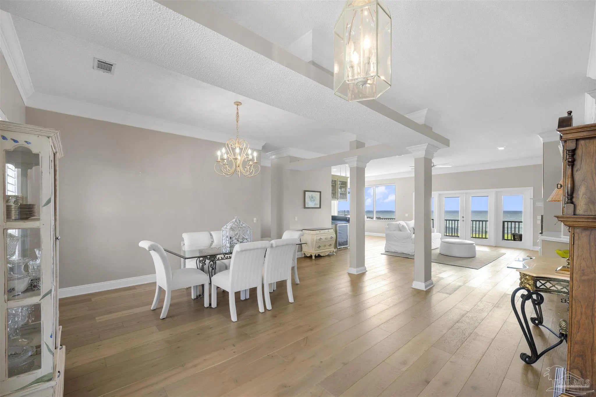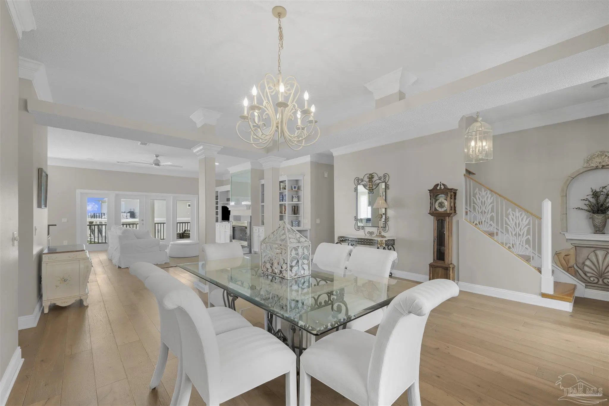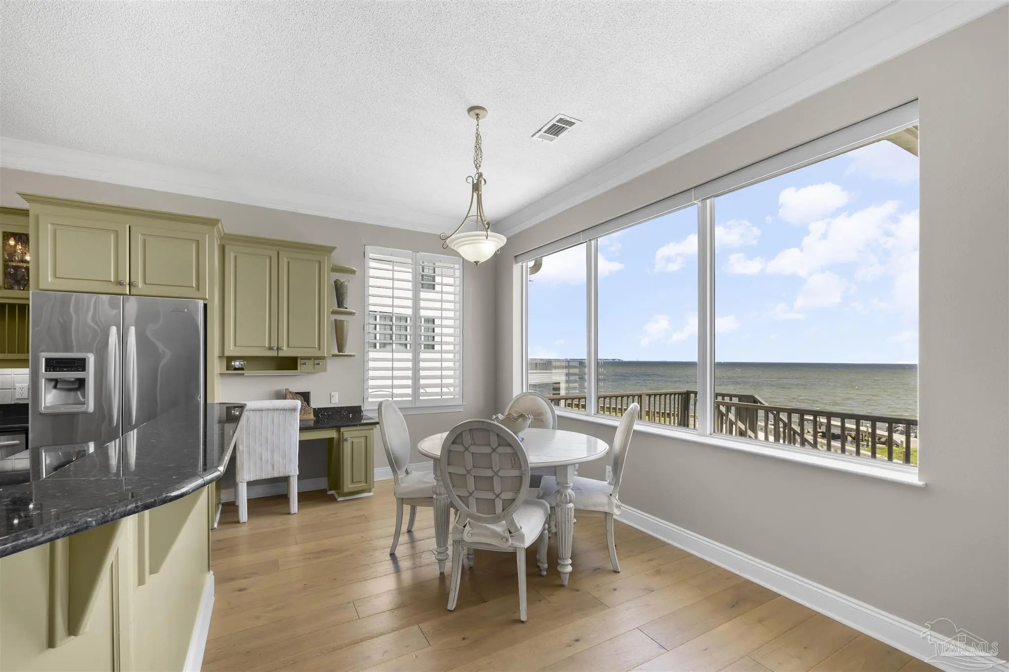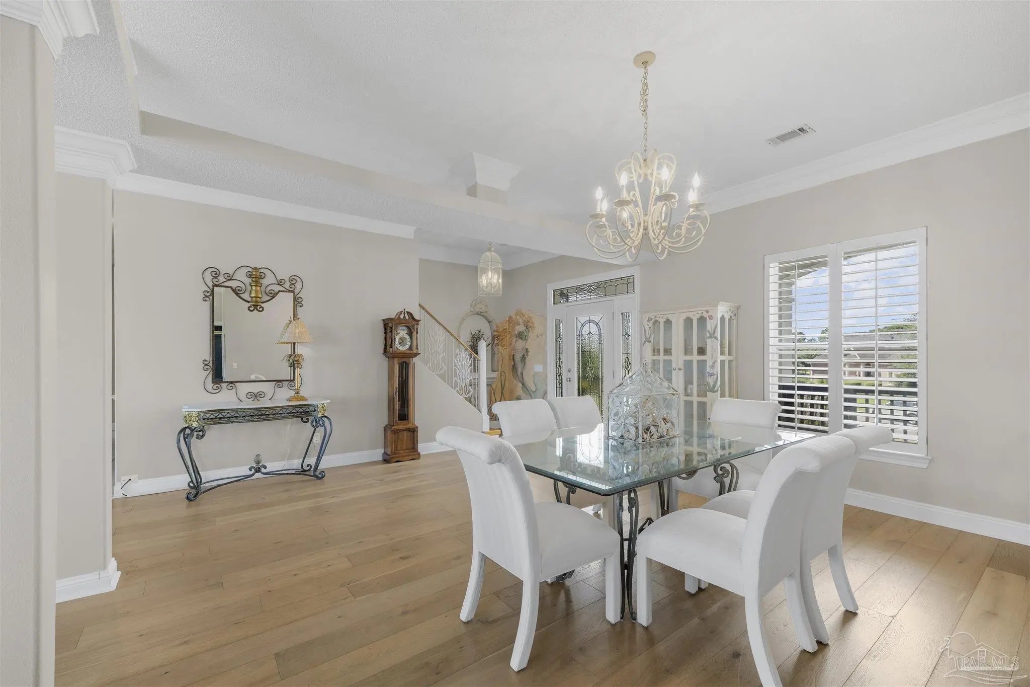 Welcome to your slice of Gulf Coast paradise—this spectacular 3-bedroom home offers graceful waterfront living with every upscale touch. Nestled in a sought-after gated neighborhood, the property boasts expansive porches with breathtaking water views, a walkway to a private beach, and your very own swimming dock, perfect for morning paddles or sunset serenity. Inside, rich oak wood floors add timeless warmth throughout. The master suite is a sanctuary of comfort with an attached sunroom or office, opening directly onto the porch overlooking the water. The spa-like bath features a double vanity, jetted tub, walk-in shower, and private water closet. The kitchen pairs form with function—granite countertops, stainless steel appliances, and a charming dumbwaiter add modern elegance. A spacious bonus room on the third floor wraps you in light with panoramic Pensacola Bay views, ideal as a media room, art studio, or peaceful hideaway. Outside, a circular drive leads to the oversized side-entry garage, offering ample space and convenience, while the durable metal roof completes the picture of longevity and coastal resilience. With its captivating views, thoughtful layout, and premium finishes, this home is your gateway to tranquil waterfront living. Schedule your private tour and experience Windrose Circle for yourself.