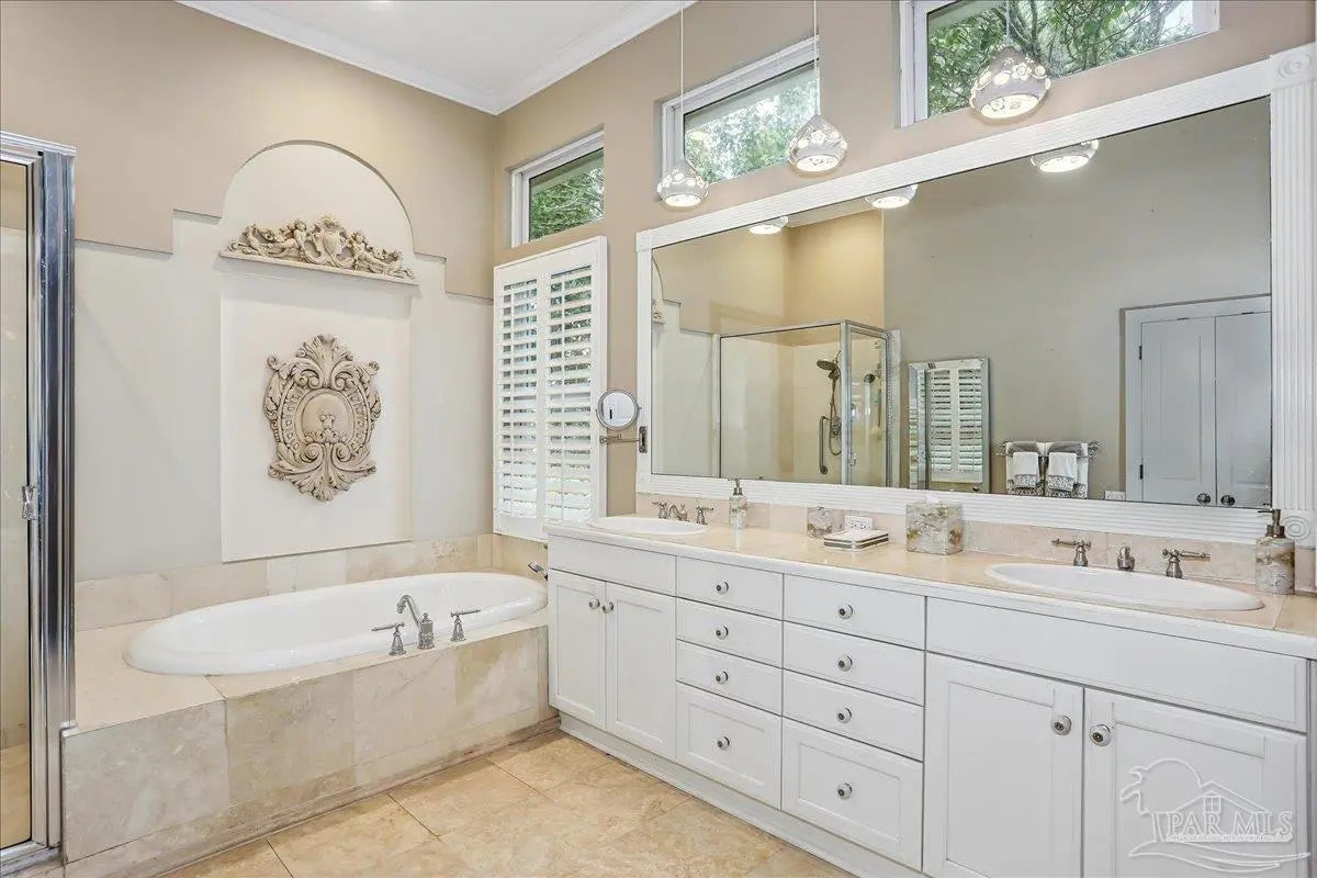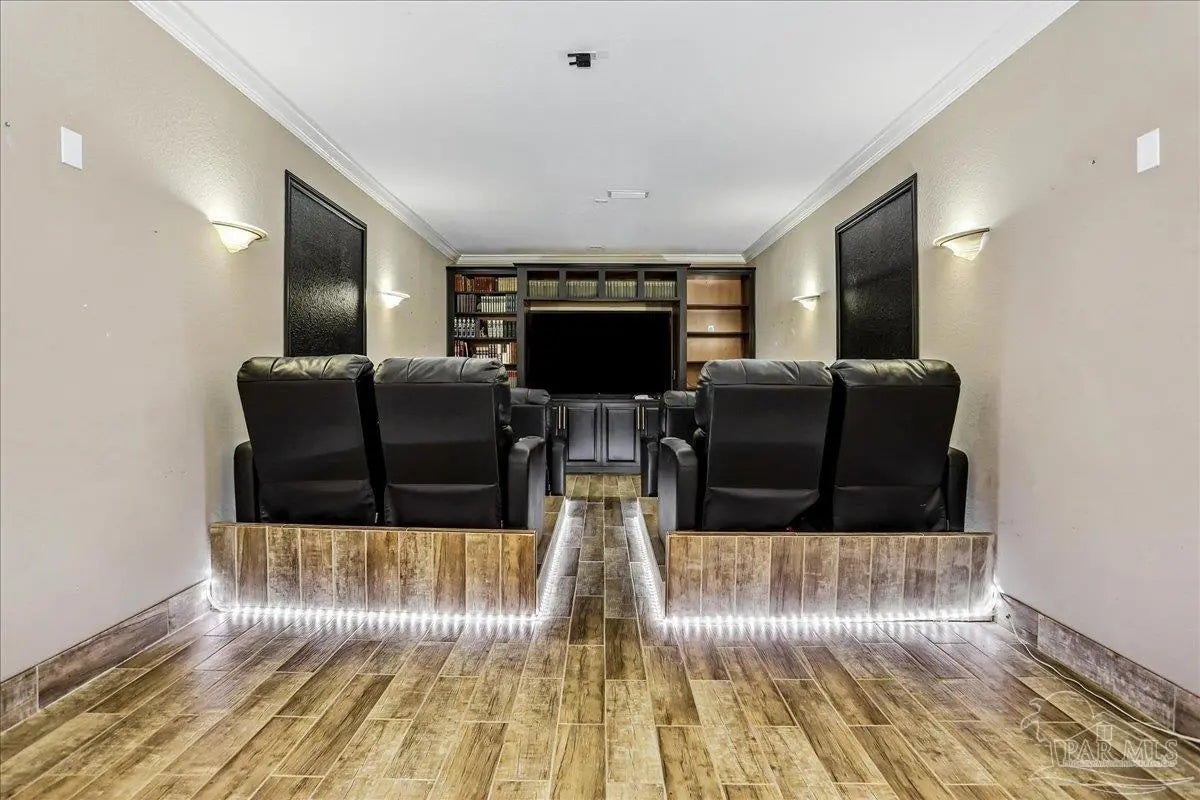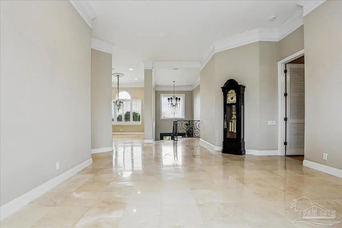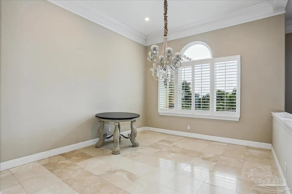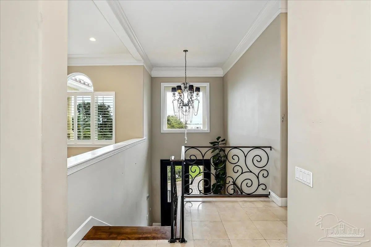 Gulf Breeze Proper! Back on the market at no fault of the seller or home!! Buyer was unable to sell their home! Escape to this peaceful serene atmosphere as you enter into this stunning home nestled along the 17 acres nature preserve of picturesque coastal forest and amazing views of Santa Rosa Sound and the Intercoastal Waterway. This property includes a piece of property across the street which makes for easy access down to the beach and waterfront. Many upgrades include water filtration system, a full-house generator, electric storm shutters, geo-thermal HVAC, surround sound speakers, security alarm, 2 dumb waiters, one located on the back of the home outside which serves as an elevator for people unable to use the stairs and one located inside off the garage that opens near the kitchen, great for transporting groceries! Luxurious and opulent with lavish features, such as travertine natural stone floors, decorative black iron railing encasing beautiful wood stairs, soaring ceilings, private screened balcony, gunite pool with spill-over hot tub, gourmet chef's dream kitchen featuring walk-in pantry, high-end stainless-steel appliances, gas-cooktop and top of the line refrigerator. Enjoy many rooms for entertaining and living including a large game room, office, theatre room, craft room, exercise/gym room, ensuite for guests and spacious owners ensuite with walk-in closets. The seamless transition from inside to outside makes perfect for entertaining guests off any of the well-appointed balconies or relaxing with friends and family around the sparkling pool w/ hot tub. This exceptional property located mere steps away from the Shoreline Park includes additional recreational opportunities such as paddle sports, trails for hiking, fishing, and a place to launch your own boat! Living here will not disappoint!