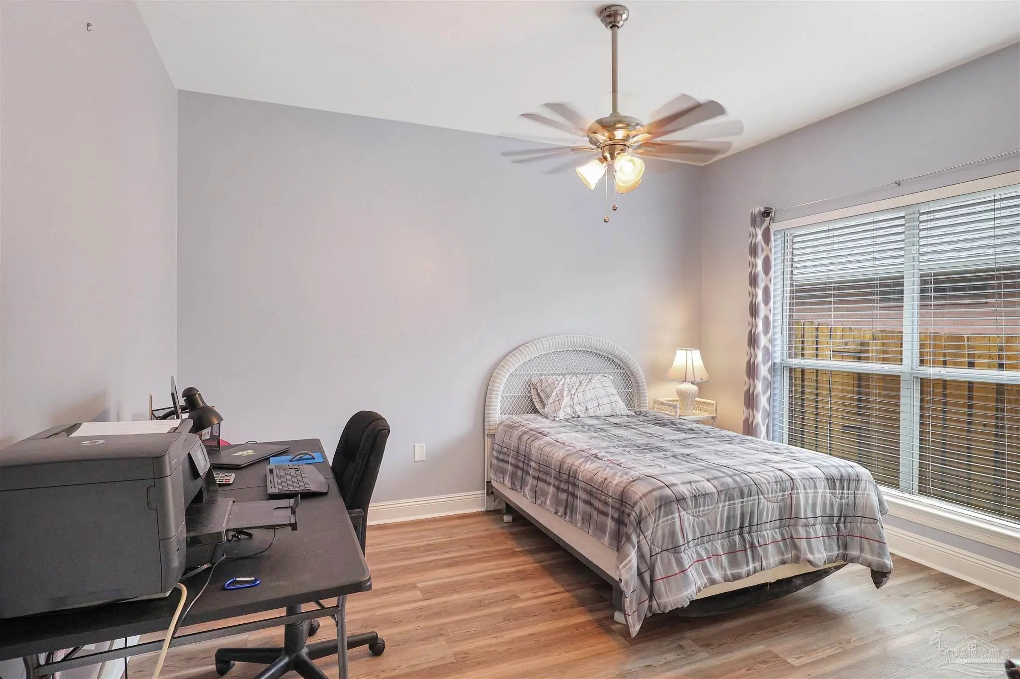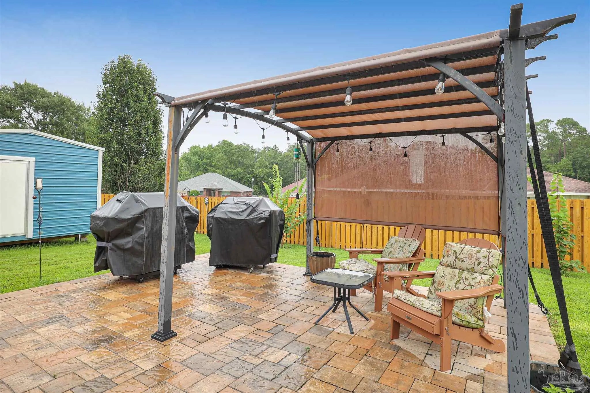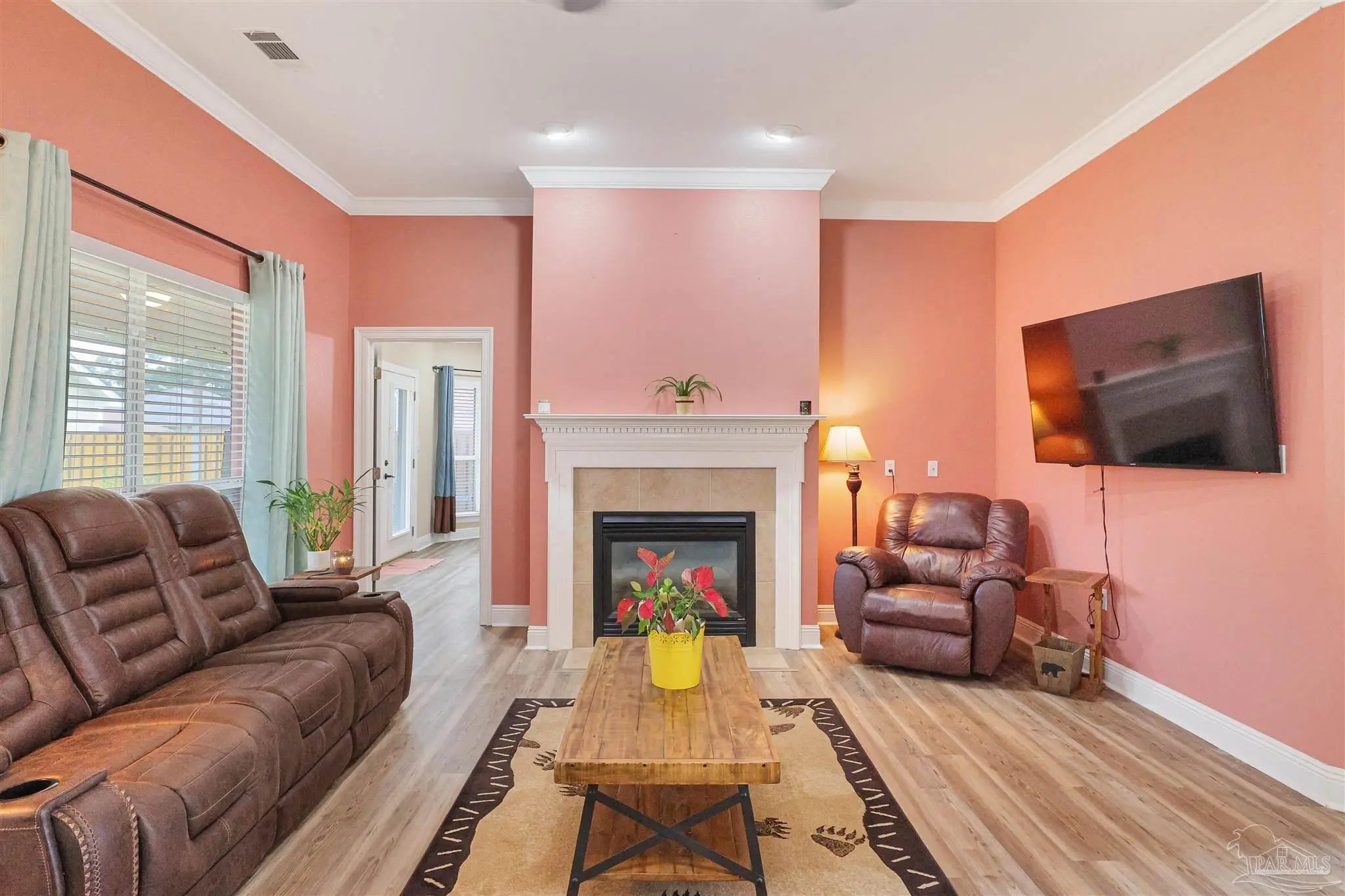 Step into timeless elegance with this beautifully maintained all-brick home that offers comfort, functionality, and outdoor appeal. Located in a quiet and established neighborhood, this home features impressive curb appeal with manicured landscaping, arched windows, and a stately front entrance. Inside, you're welcomed by an open living space with rich flooring, crown molding, and a cozy fireplace—perfect for relaxing or entertaining guests. The large living area flows seamlessly into the kitchen, which boasts granite countertops, custom cabinetry, and newer stainless steel appliances including a gas stove. A raised breakfast bar offers extra seating, and a bright dining nook is perfectly positioned with views of the backyard. The spacious primary suite is a true retreat, complete with his and hers large walk-in closet and a luxurious ensuite bath featuring dual vanities, a soaking tub, separate walk-in shower, and private water closet. Step outside to enjoy a beautifully designed paver patio with pergola—ideal for grilling, relaxing, or entertaining under the string lights. The fully fenced backyard offers privacy and plenty of green space for pets, kids, or gardening. Additional Highlights: Split bedroom floor plan, Updated fixtures and finishes throughout, Two-car garage, Indoor laundry room, Whole home Generator Don’t miss your opportunity to own this well-kept gem in one of Cantonment’s most desirable areas—just minutes from schools, shopping, and Navy Federal. Schedule your private showing today and make this gorgeous home yours!