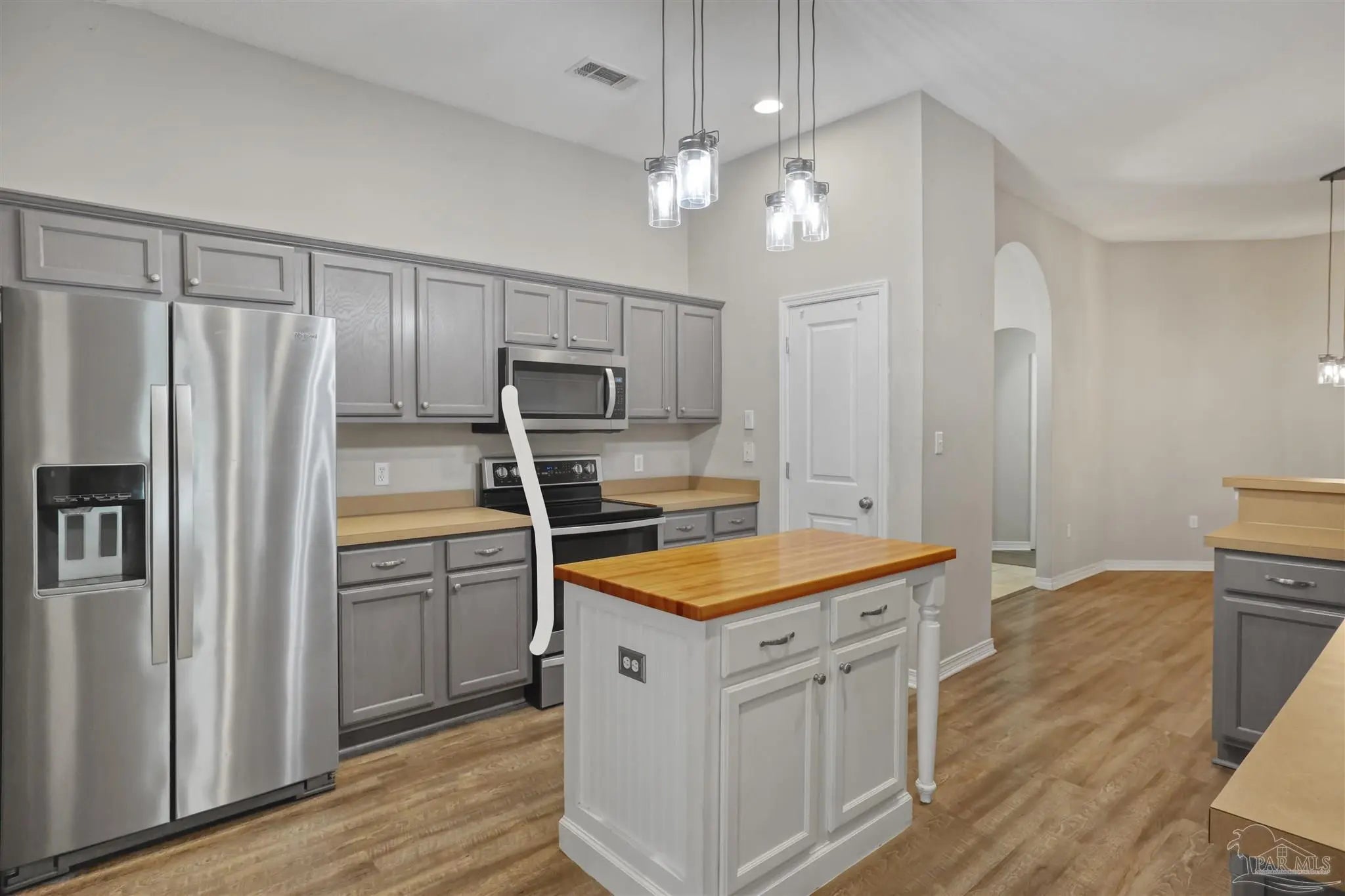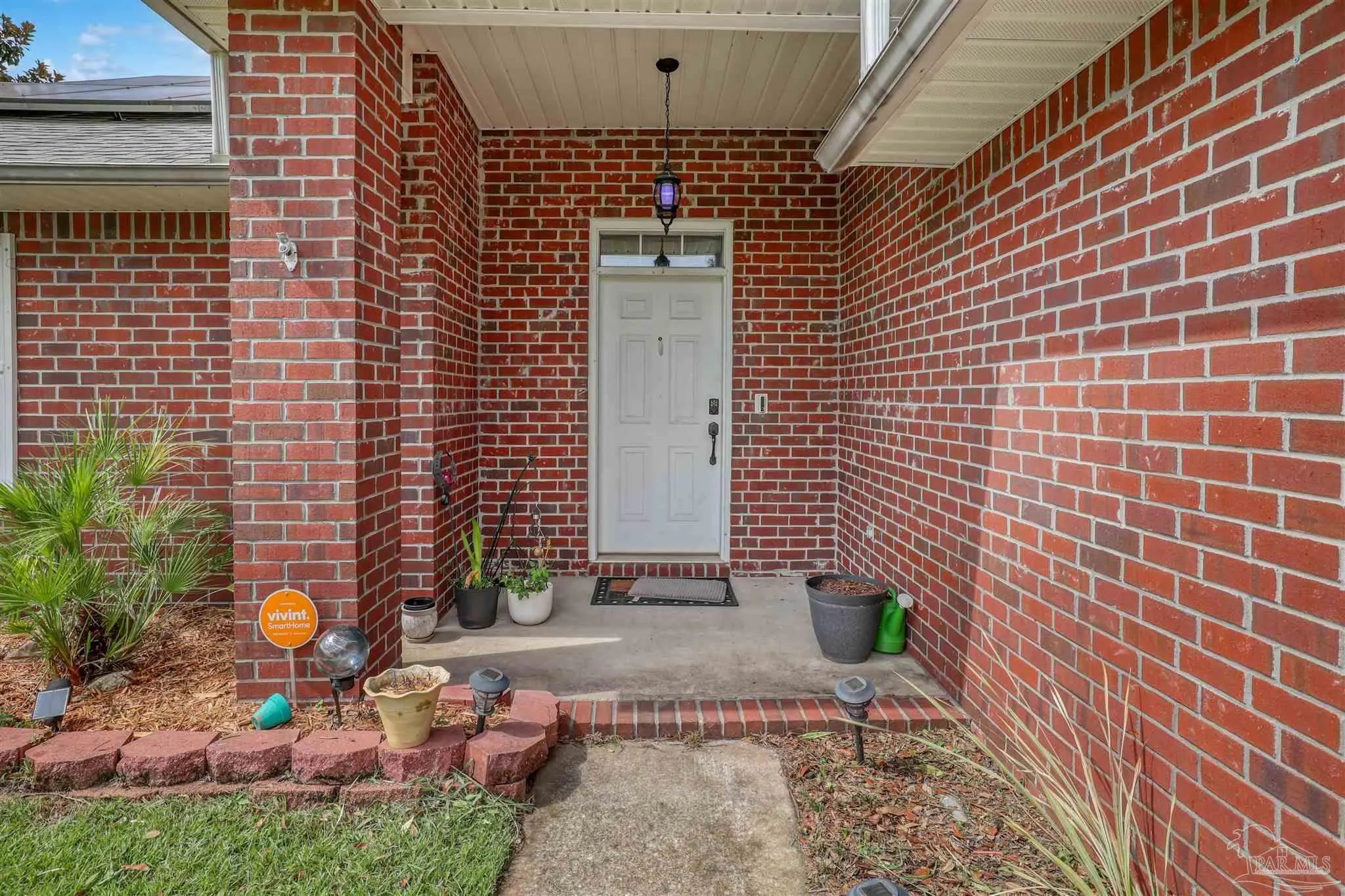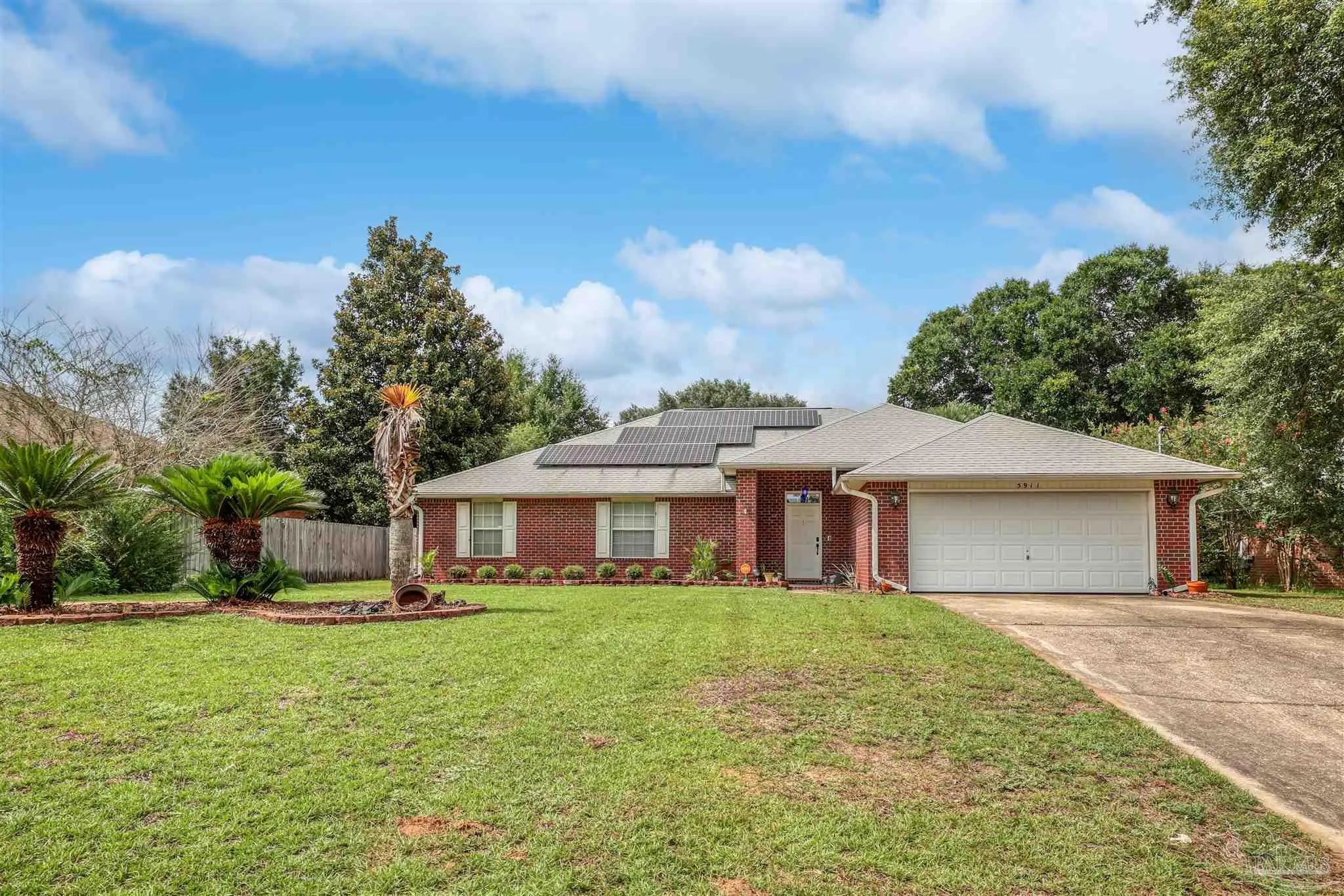 Welcome to your own private oasis in the heart of Milton! This all-brick, solar-equipped home offers the perfect blend of style, efficiency, and comfort — complete with a sparkling screened-in pool and a spacious covered patio ideal for year-round enjoyment. Step inside to find an open-concept layout with soaring ceilings and abundant natural light. The living room features a cozy corner fireplace and French doors that open directly to the pool area, seamlessly blending indoor and outdoor living. The kitchen has been updated with modern gray cabinetry, stainless steel appliances, a butcher block island, and updated light fixtures, offering both functionality and charm. A walk-in pantry and adjoining laundry room provide extra storage and convenience. The generously sized primary suite boasts serene views of the backyard, dual closets, and an ensuite bathroom with a garden tub, separate shower, and large vanity area. The additional bedrooms are equally spacious with great closet space and updated flooring throughout the home. Out back, relax under the extended covered lanai, complete with dual ceiling fans, while overlooking your screened-in pool — perfect for those warm Florida days. The fully fenced backyard offers privacy and space for gardening or entertaining. Additional features include a 2-car garage, energy-efficient solar panels, fresh neutral paint, and low-maintenance landscaping. Located in a quiet neighborhood with easy access to schools, NAS Whiting Field, shopping, and dining — this move-in-ready gem won’t last long. Schedule your tour today and discover all that 5911 Ashton Woods Cir has to offer!
