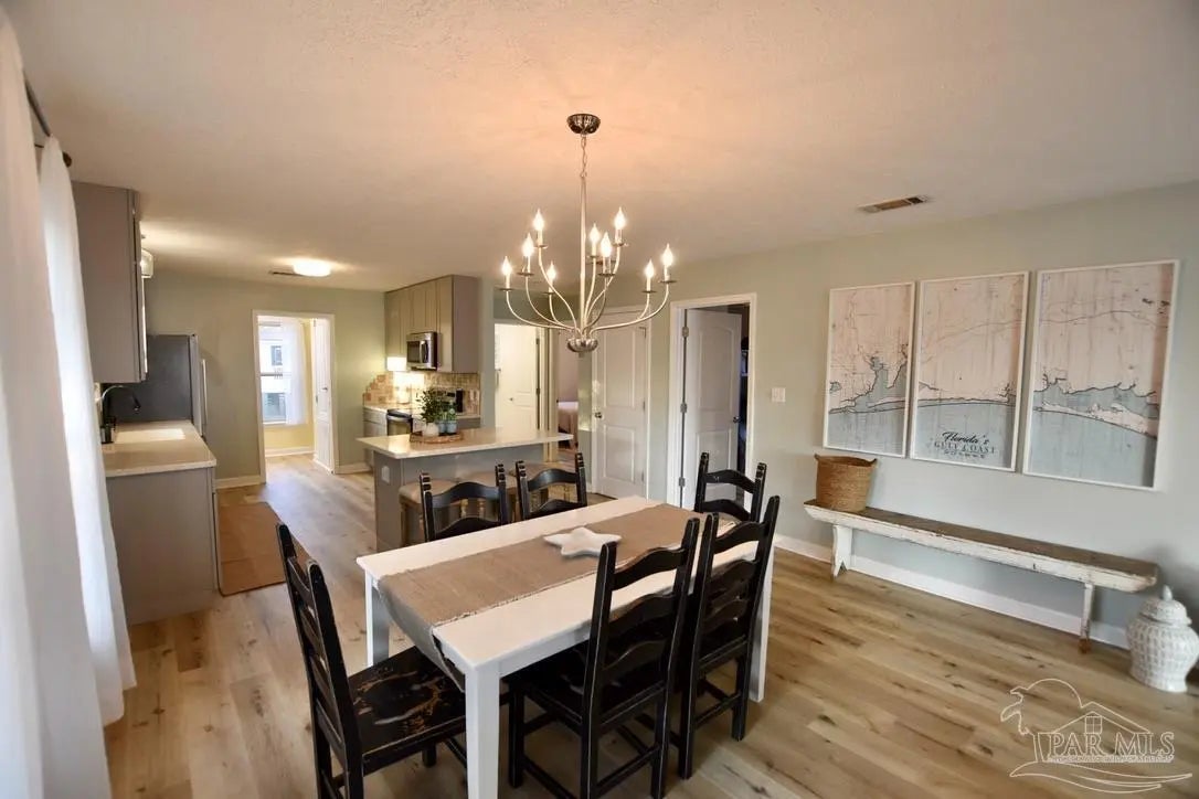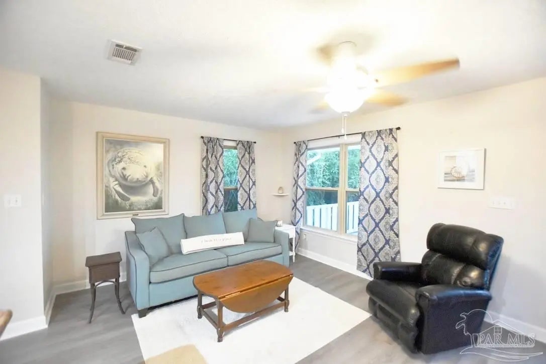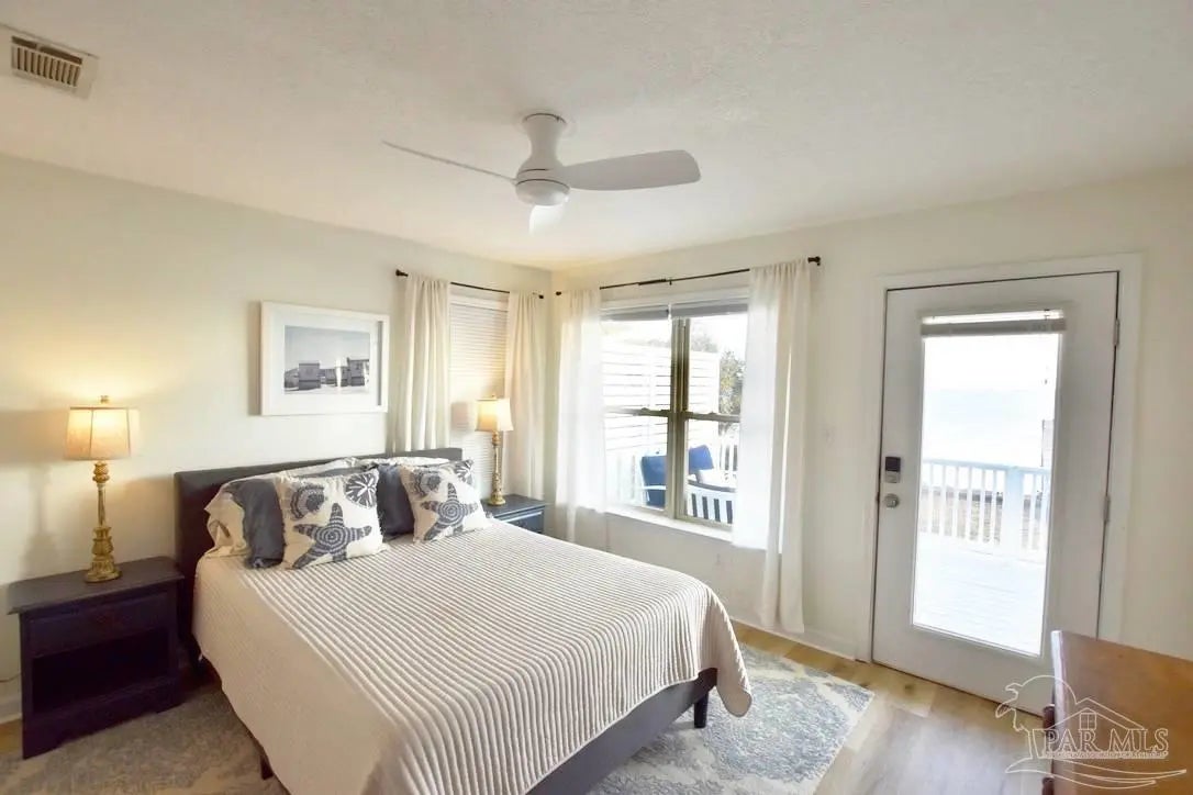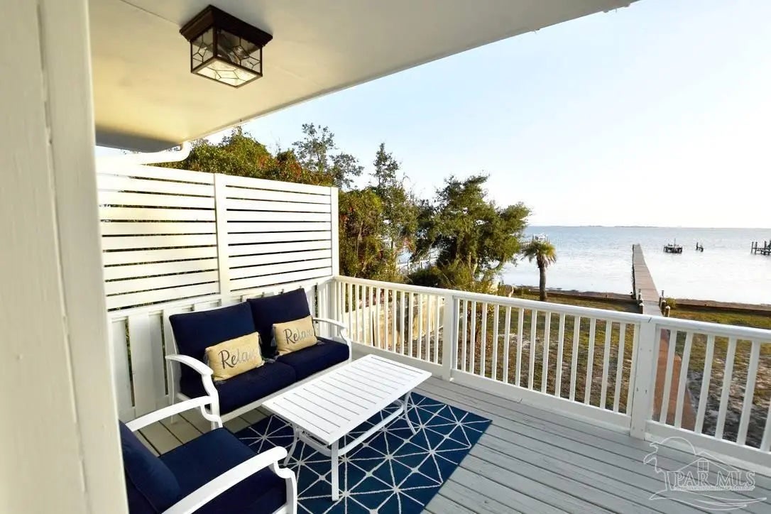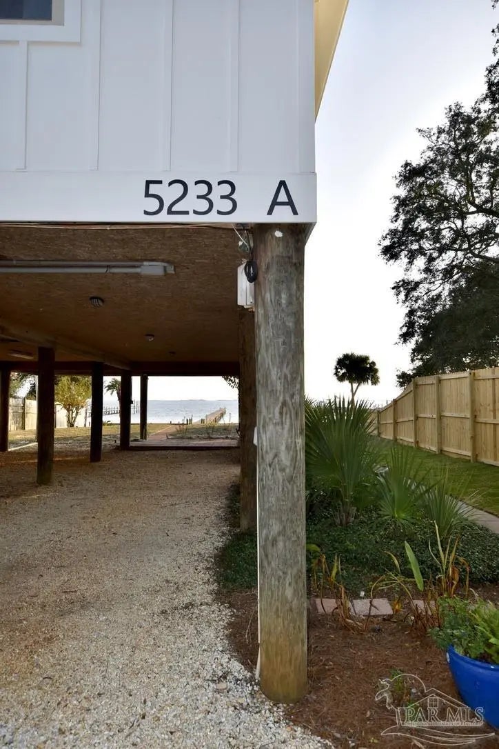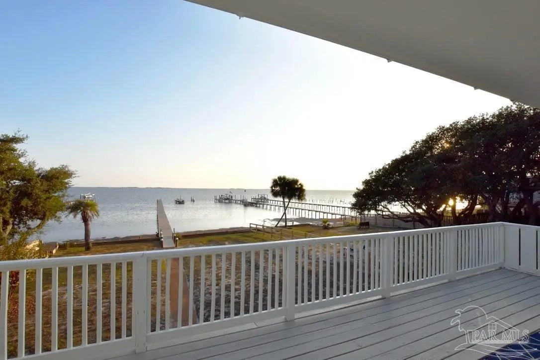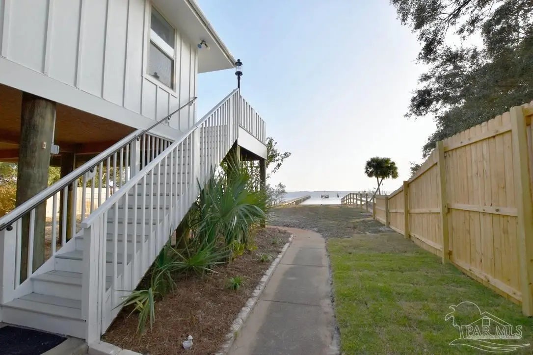 Owners have given this amazing property the attention its been waiting for. Price adjustment and major improvements! Fall in love with this turn-key coastal retreat, completely remodeled inside and out. New exterior paint, updated landscaping, fruit trees, a new fence and dock, and a whole new vibe. This property is made up of two completely independent houses on one lot. The 3 bedroom 2 bath main house is light and bright. It features an open concept kitchen/dining/living design, huge pantry, and a utility room off the kitchen. There are two guest bedrooms that share a second bath, and a primary suite with a dressing room, large bathroom, and big windows to soak up the water views. The 1 bed/1 bath secondary house is completely independent with its own utilities. It has an amazing, large, open concept kitchen/living room and a bedroom with attached bath and laundry. This house has it's own covered parking and a deck. This is the perfect situation for multi-generational living or rent out one unit and live in the other. Both homes built in 2008 have impact windows and doors, are high and dry on pilings, and have abundant space below for entertaining and covered parking, as well as a large workshop. Whether you’re an investor looking for an income producing short term rental opportunity, or you’re searching for your primary home, don't miss this fantastic property. Catch red fish, speckled trout, crabs and beautiful sunsets from the dock. Located just steps from the Woodlawn Beach Boat Ramp, and equally distant from Navarre Beach and Pensacola Beach. Zoned for top rated schools. Upgraded from septic to city sewer (2025).