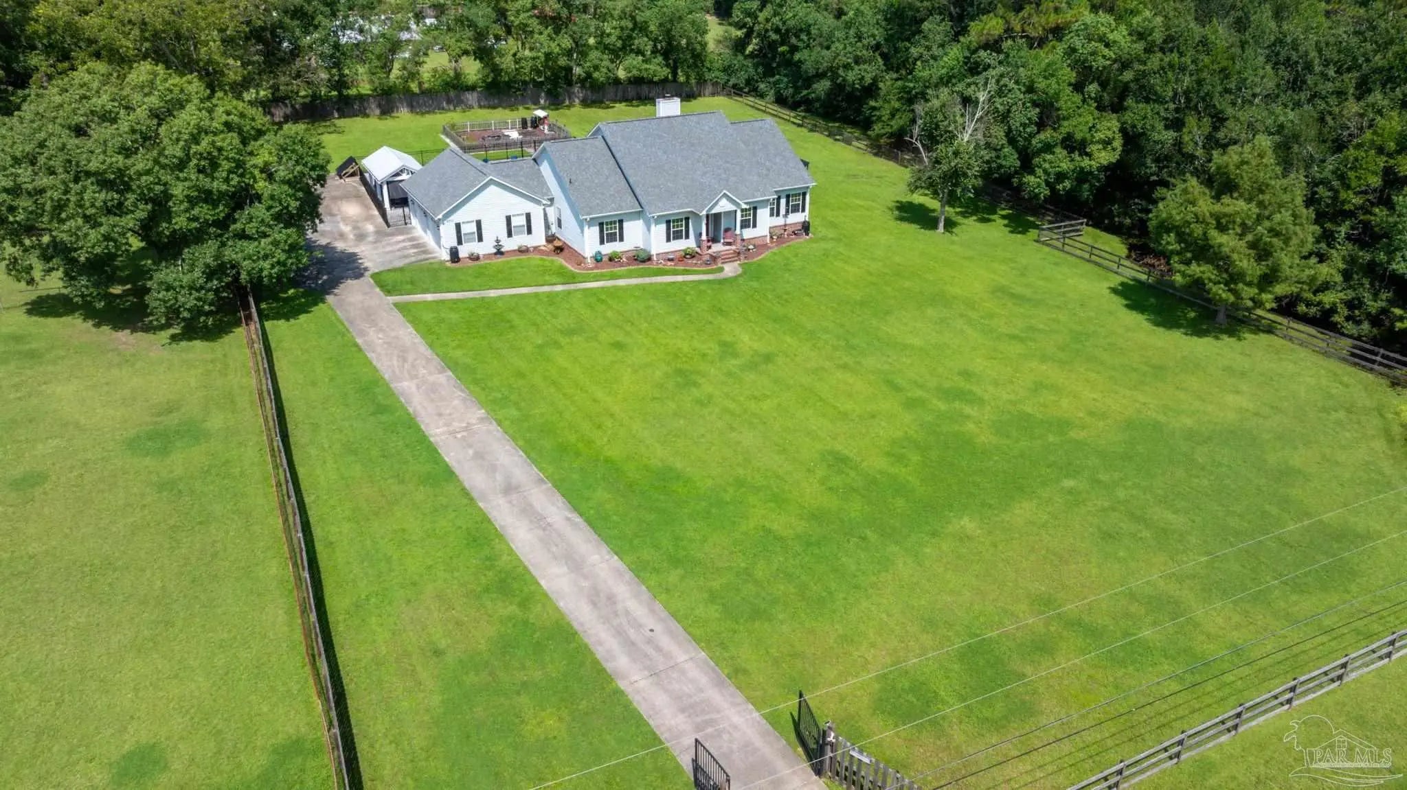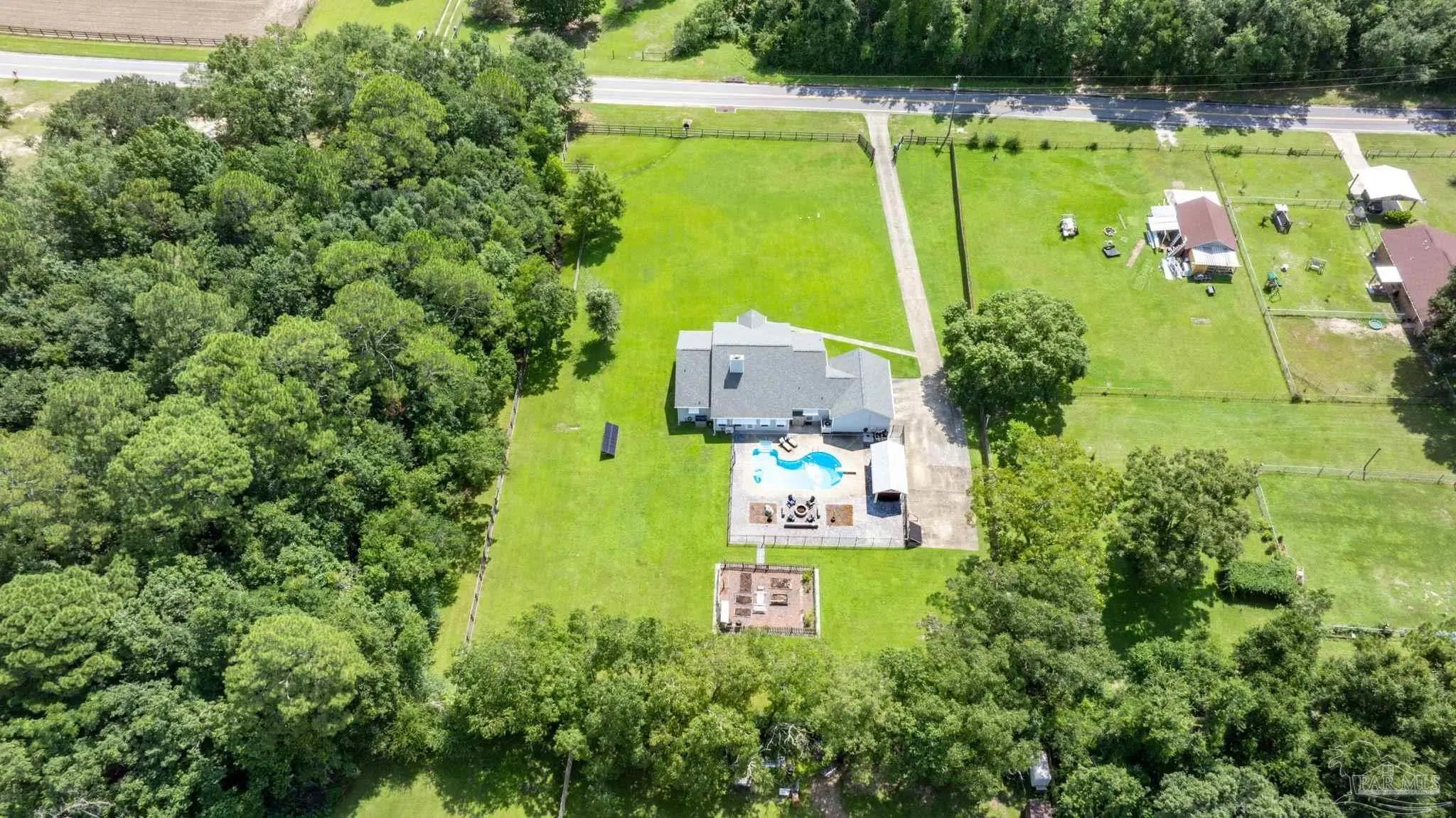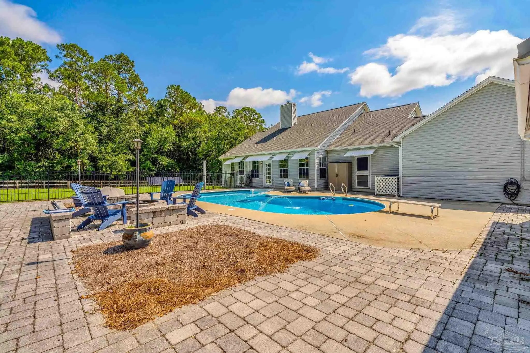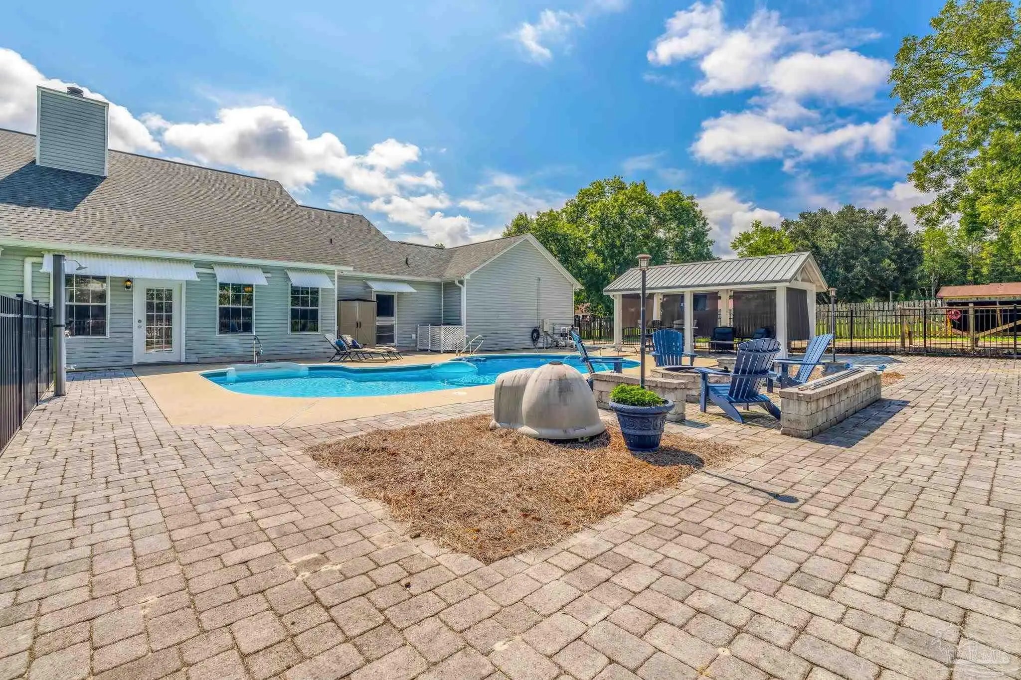 Gated entry • 1.49-acre estate lot • Resort-style backyard oasis Set back behind a gated entrance on a sprawling 1.49-acre lot, this 2,342-sq-ft residence features 4 bedrooms plus an office/den with closet that can serve as a 5th bedroom. The primary suite offers two large walk-in closets, separate soaking tub and shower, and dual vanities. Both full baths include double vanities; a convenient half bath completes the layout. The main living area opens with a wood-burning fireplace and flows into dining and kitchen zones, framed by solar-assisted mini-split HVAC units and a 4-year-old primary system for added efficiency. Roof was replaced in 2020; water heater original 2013. Step outdoors to discover a resort-style backyard designed for all-season enjoyment: a private pool with diving board and sand-filter system (new pump 2024), dual solar/electrical pool equipment, hot & cold outdoor shower, paver patio with built-in fire pit, covered pergola with full electrical and lighting, and a dedicated garden zone for hobby planting or raised-bed planting. Lush foliage and open acreage create a secluded setting ideal for entertaining, relaxing or recreation. The two-car attached garage, efficient systems, versatile floor plan and expansive grounds complete the offering. Includes 3D walkthrough and full video tour.