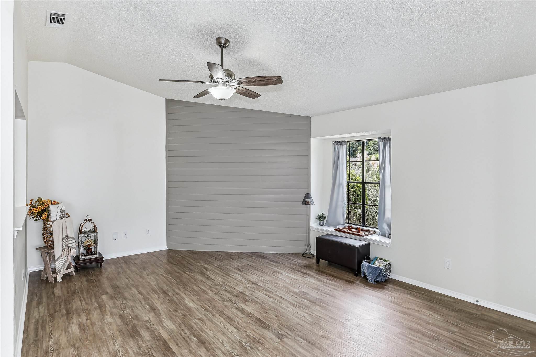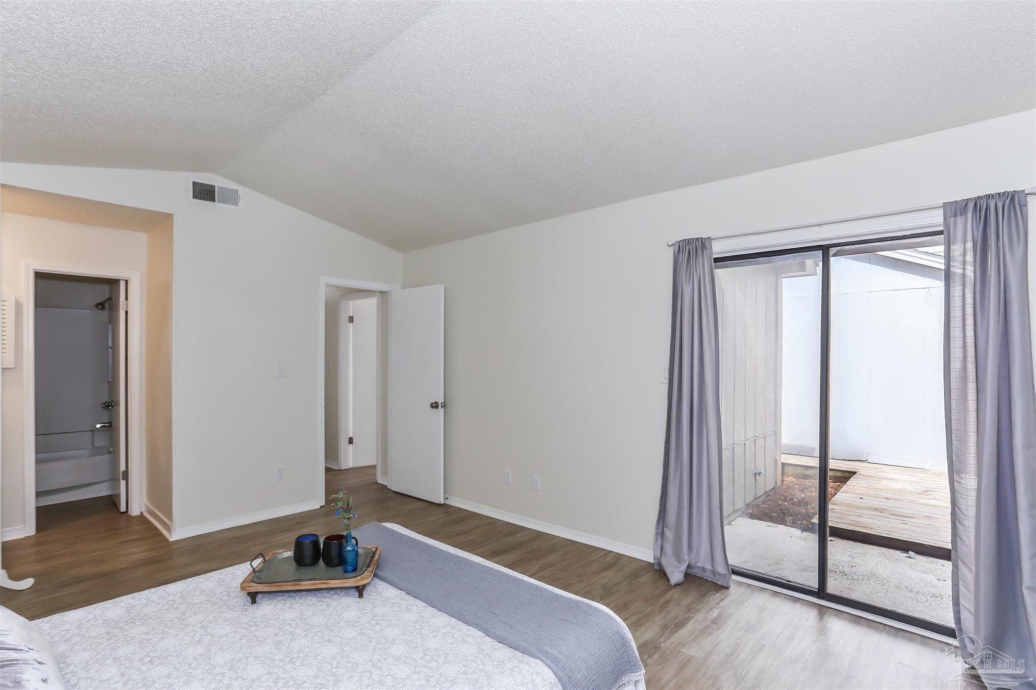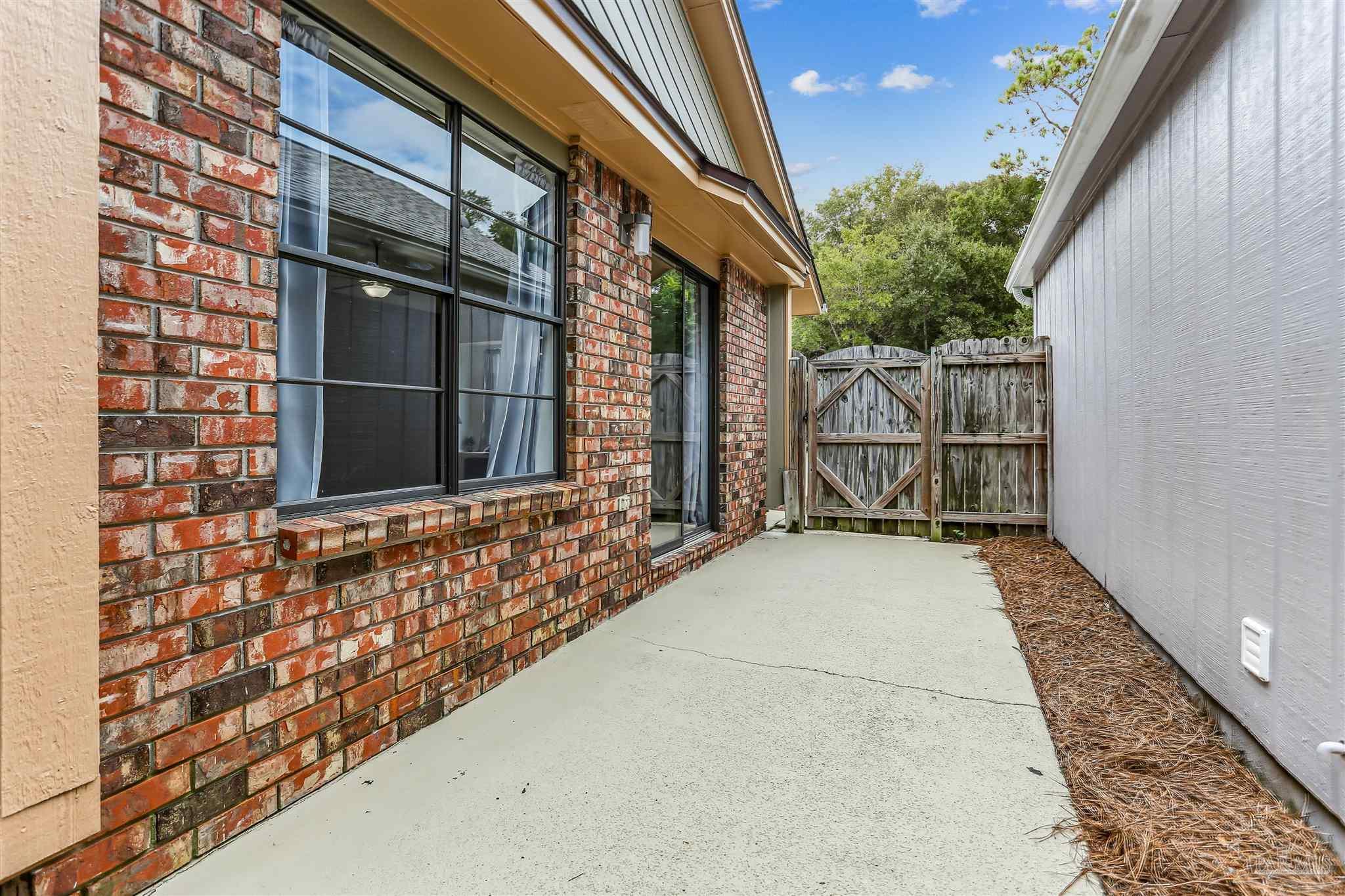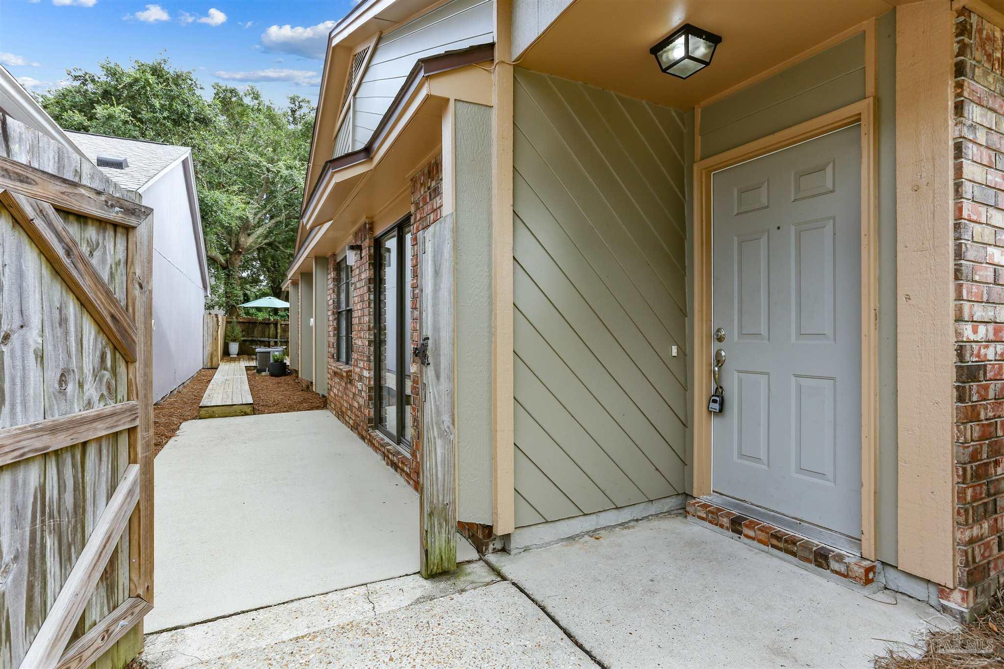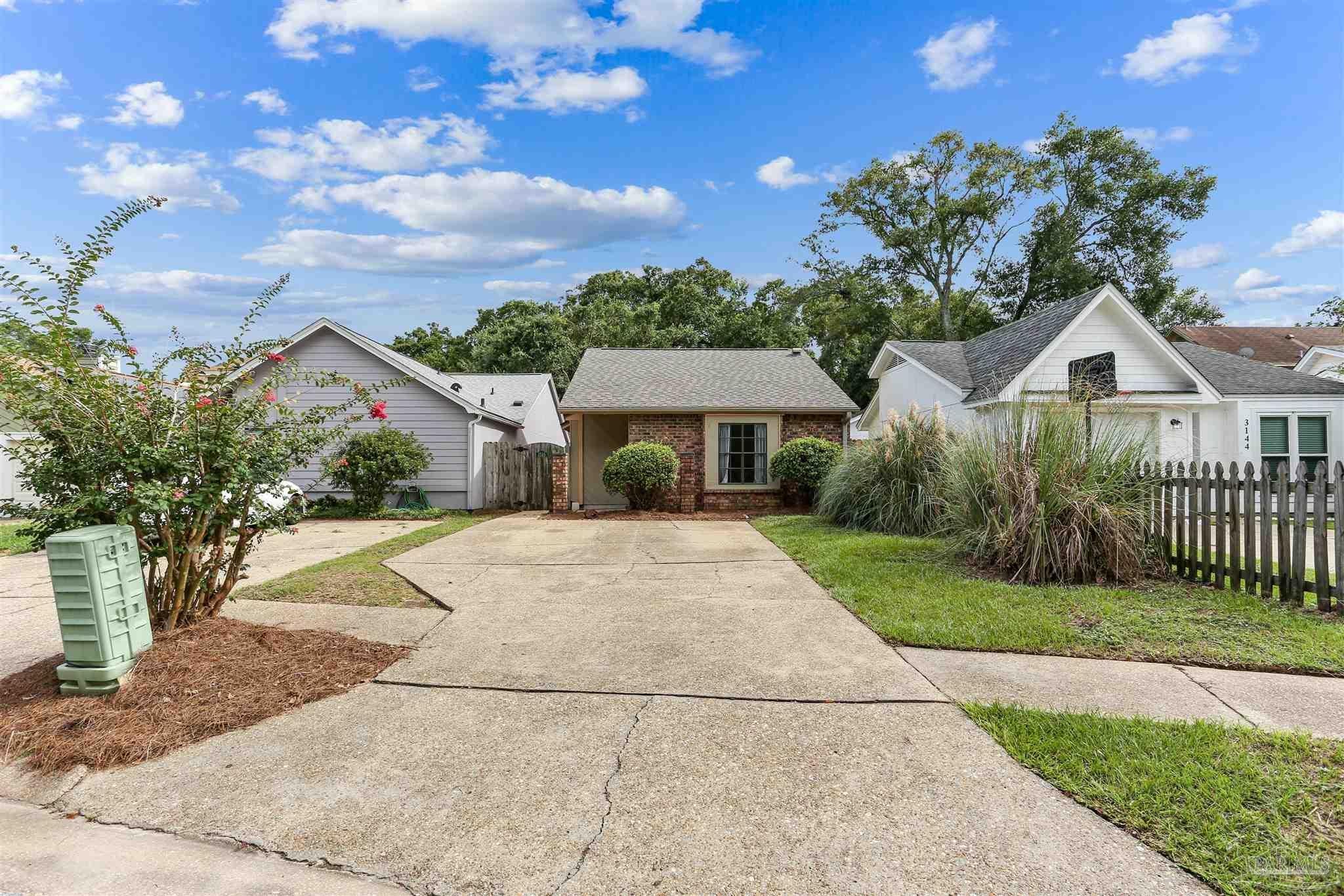 This cozy cottage, 3-bedroom, 2-bathroom single-family home offers 1,341 square feet of stylish living space. Built in 1981 and thoughtfully updated, this home features: a modern kitchen with beautiful stone countertops, elegant backsplash, and stainless steel appliances, including a brand-new stove and built-in microwave. The dishwasher and refrigerator were replaced a few months ago as well. The open-concept living and dining area features vaulted ceilings and luxury vinyl plank flooring throughout. The spacious master suite also with vaulted ceilings includes private patio access and a contemporary en-suite bathroom with a large vanity and sliding barn door. The private patio can also be accessed through a sliding glass door in the main living area, offering a seamless indoor-outdoor flow. Outdoor living includes a shaded, fenced deck area and additional storage under roof. Conveniently located just south of Olive Rd near 9th Avenue, with easy access to I-10, downtown Pensacola, and local beaches. This move-in-ready home is perfect for those seeking comfort, style, and convenience. (Roof 2021, HVAC 2022, Water Heater 2022)