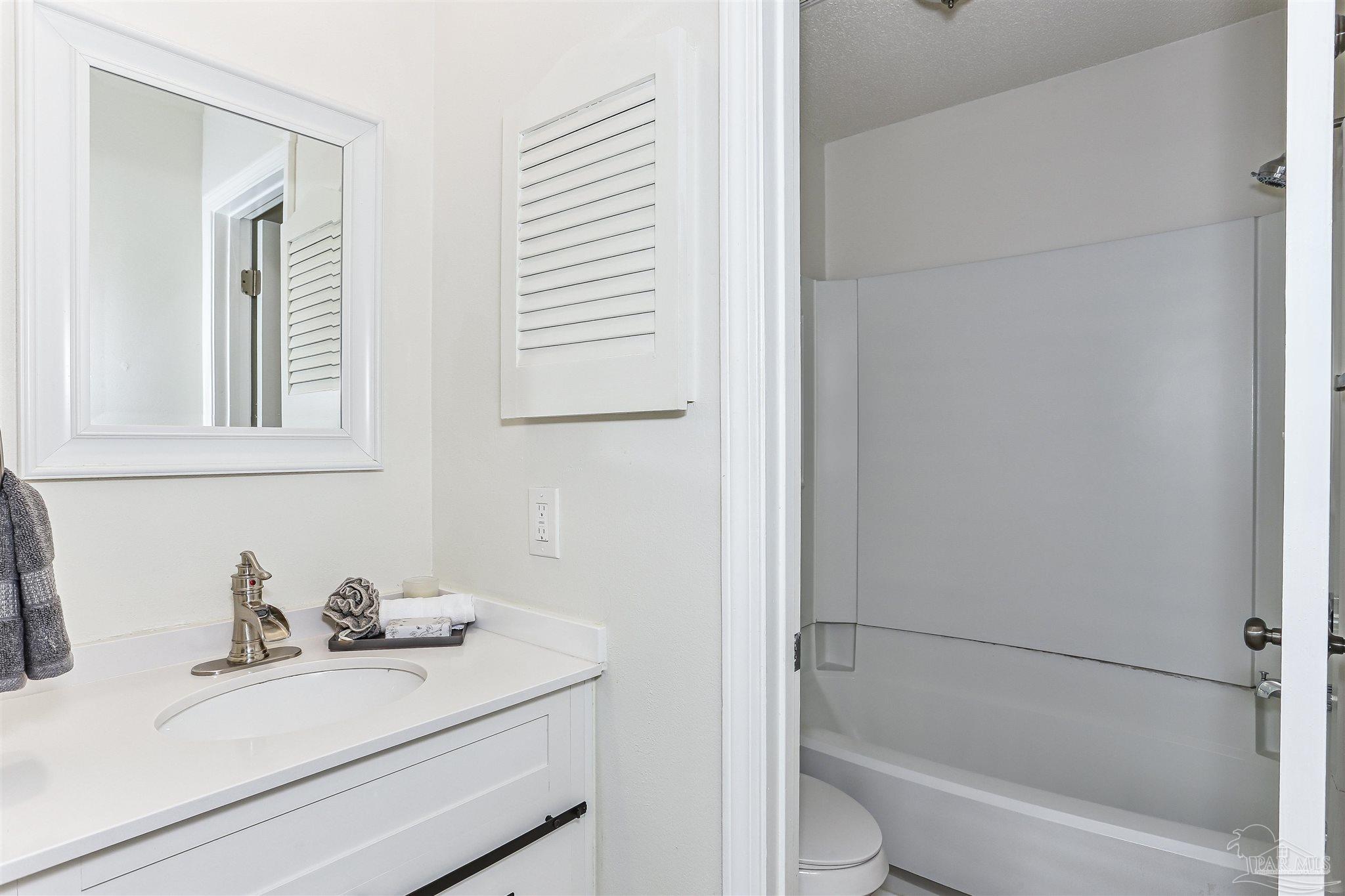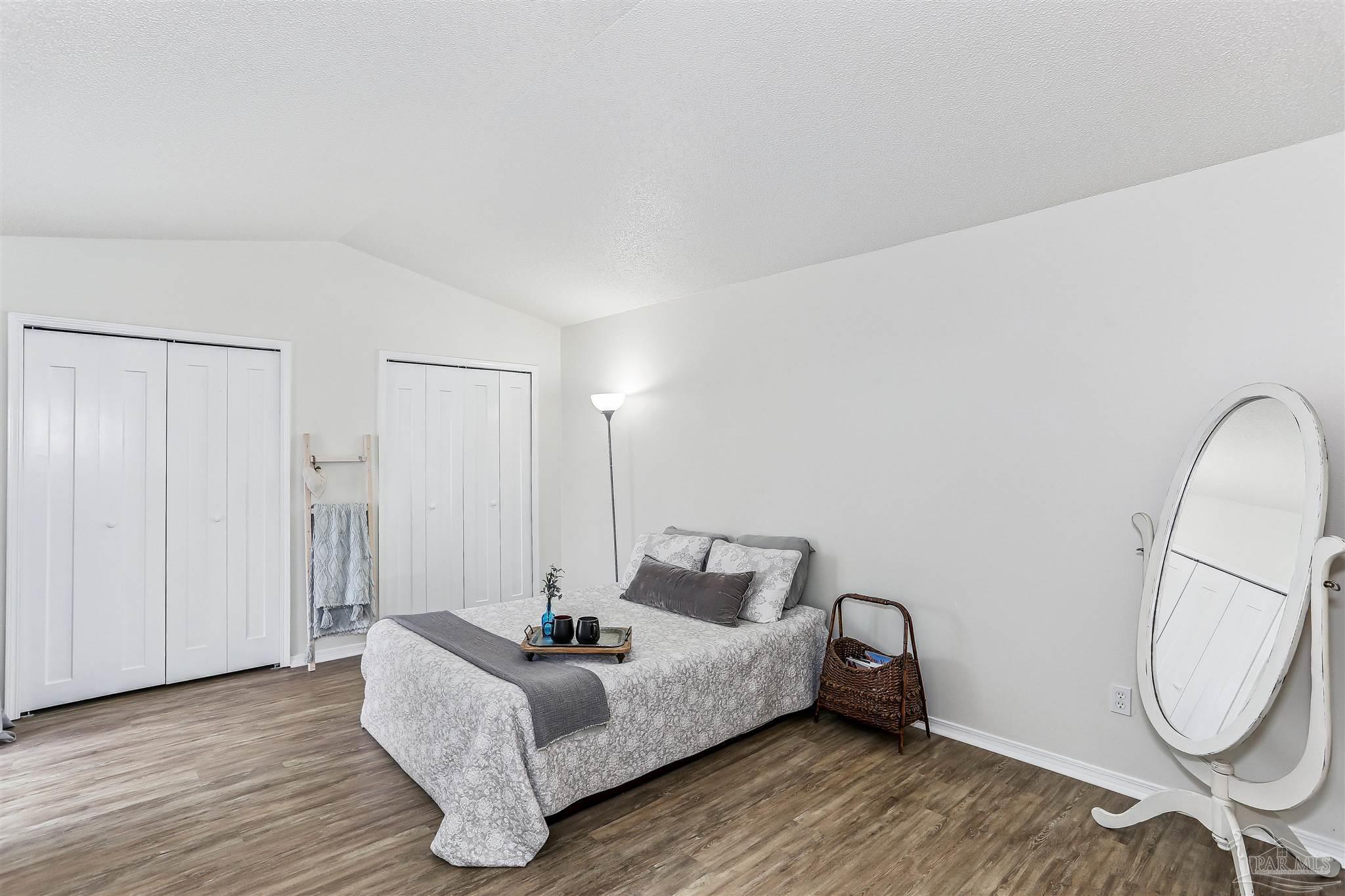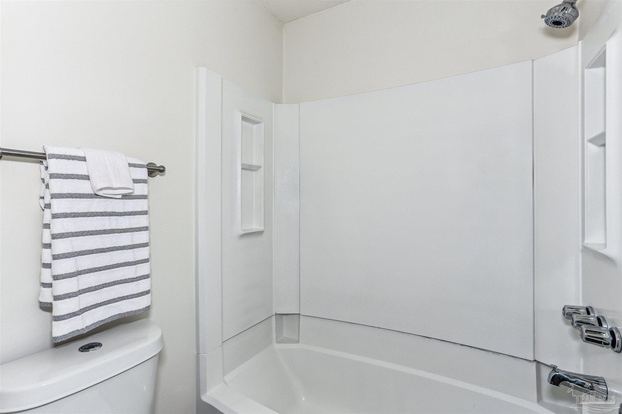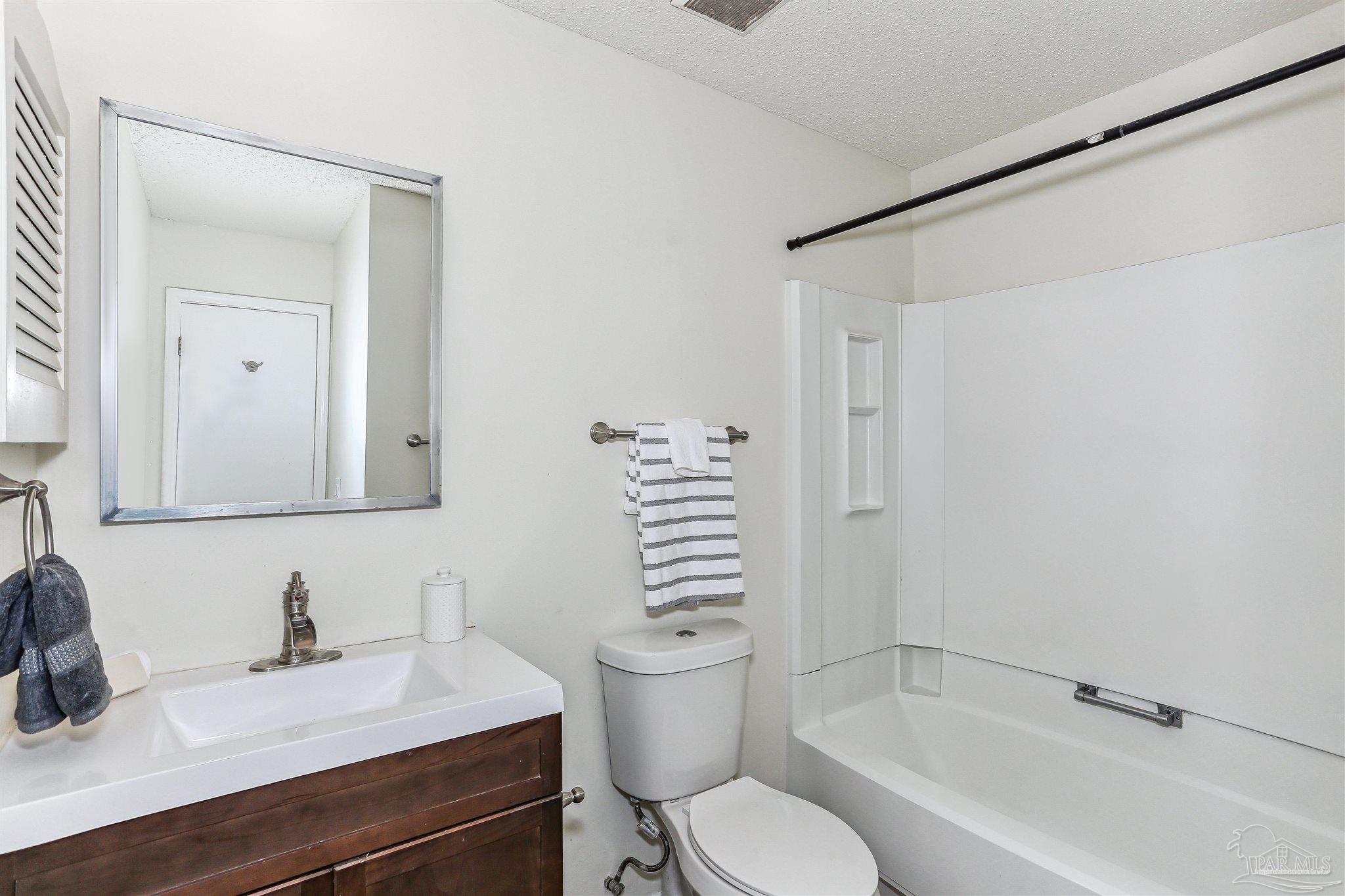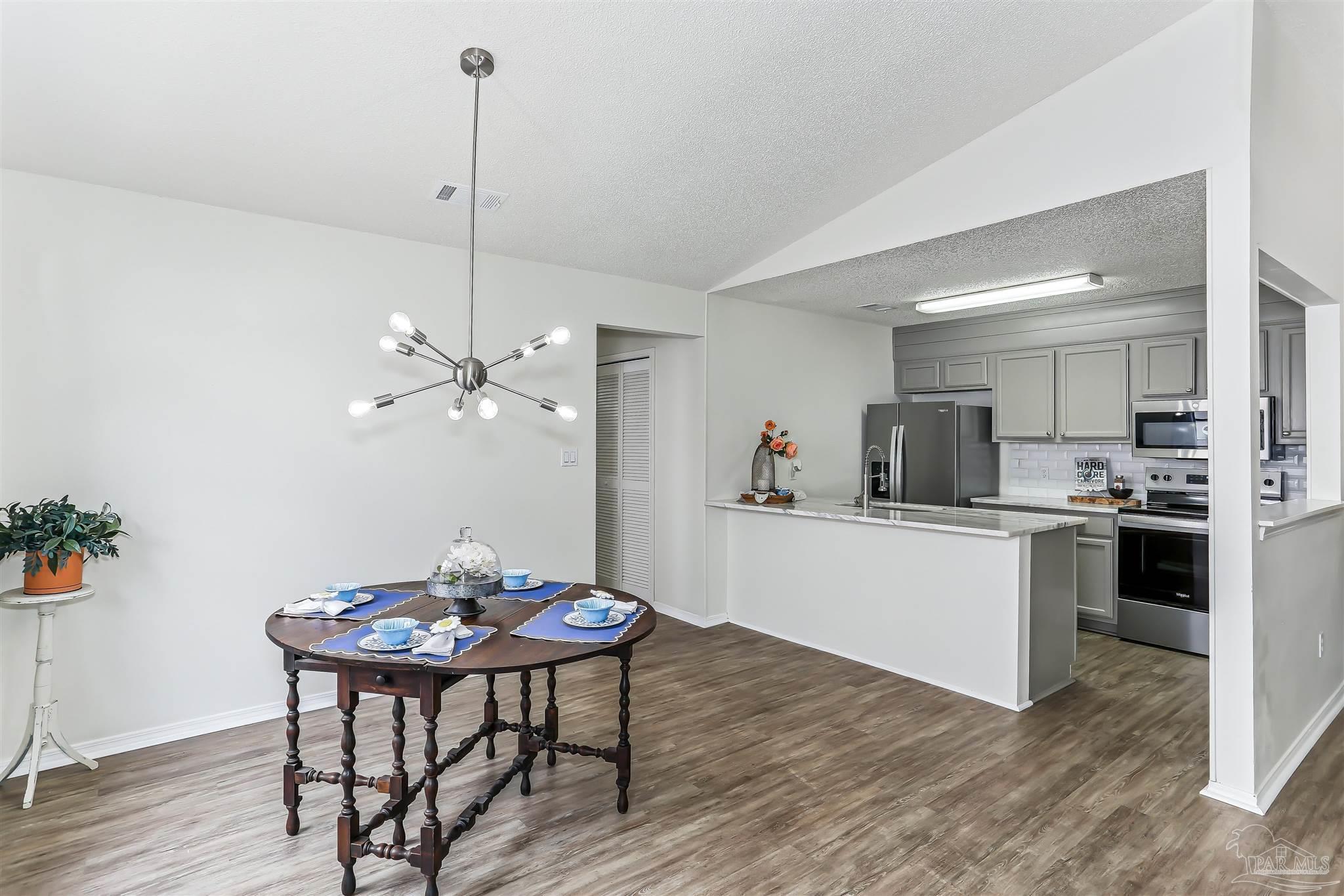 This cozy cottage, 3-bedroom, 2-bathroom single-family home offers 1,341 square feet of stylish living space. Built in 1981 and thoughtfully updated, this home features: a modern kitchen with beautiful stone countertops, elegant backsplash, and stainless steel appliances, including a brand-new stove and built-in microwave. The dishwasher and refrigerator were replaced a few months ago as well. The open-concept living and dining area features vaulted ceilings and luxury vinyl plank flooring throughout. The spacious master suite also with vaulted ceilings includes private patio access and a contemporary en-suite bathroom with a large vanity and sliding barn door. The private patio can also be accessed through a sliding glass door in the main living area, offering a seamless indoor-outdoor flow. Outdoor living includes a shaded, fenced deck area and additional storage under roof. Conveniently located just south of Olive Rd near 9th Avenue, with easy access to I-10, downtown Pensacola, and local beaches. This move-in-ready home is perfect for those seeking comfort, style, and convenience. (Roof 2021, HVAC 2022, Water Heater 2022)