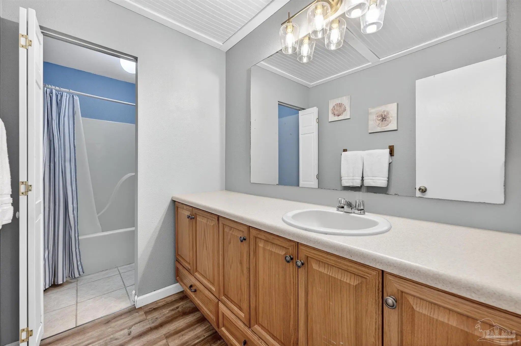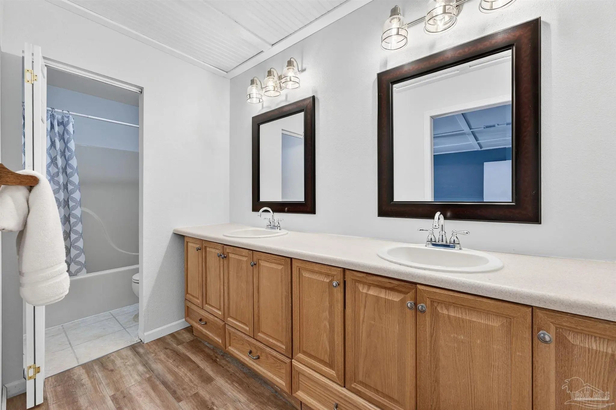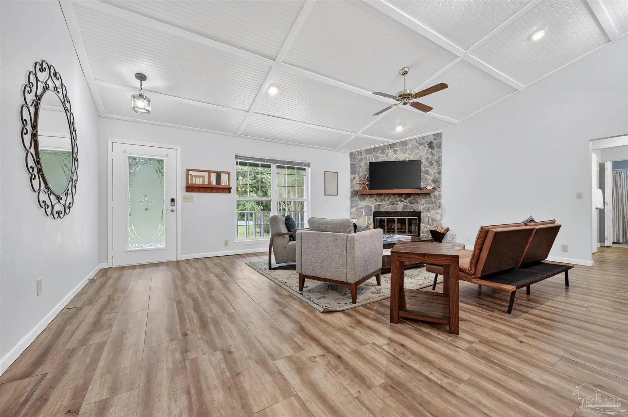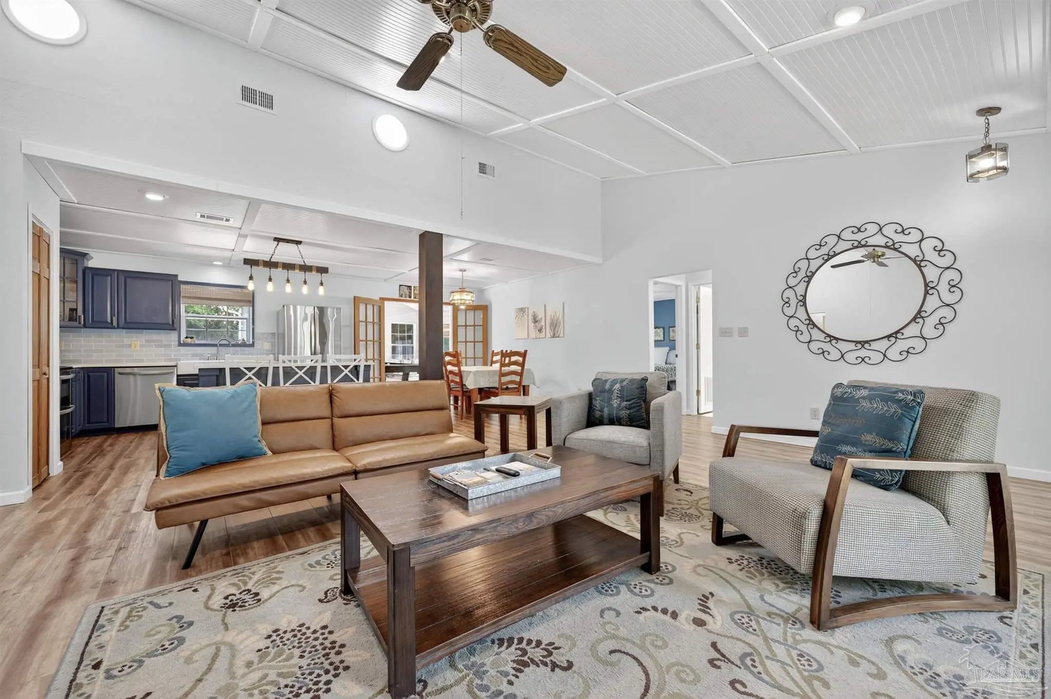 Offered FULLY FURNISHED, this property is move-in ready and an incredible opportunity as either a primary residence or an Airbnb investment! Rental projections are coming in at $39,000 annually.. Located in the sought-after neighborhood of Villa Venyce in the heart of Gulf Breeze, this charming home offers the perfect blend of comfort, style, and convenience. Enjoy access to the neighborhood park, complete with a playground, pavilion, tennis courts, and pickleball courts all while being just moments from top-rated schools. Situated on a shaded corner lot, the curb appeal shines with a paver driveway, mature trees and landscaping, new decking on one side of the home, and a welcoming covered front porch. Inside, the open floor plan is enhanced by new luxury vinyl plank flooring throughout and a freshly updated kitchen. The living room boasts vaulted ceilings, skylights, and a striking stone wood-burning fireplace. Updates in the kitchen include newly painted cabinets equipped with new hardware, new appliances, a coastal-inspired backsplash, quartz countertops, an added island, and a new sink! The dining area sits just off the kitchen, with French doors that open directly into the sunroom, creating an easy flow for entertaining. Just off the sunroom are multiple back decks and a hot tub! The split primary suite includes private deck and hot tub access through French doors, plus an en-suite bathroom with double vanities, a tub/shower combo, and a large walk-in closet. Two additional bedrooms are located on the opposite side of the home, with a full bathroom in between. One bedroom also opens directly to a 12x16 screened porch, ideal for relaxing in the shade. With its versatile layout, multiple outdoor living areas, and prime location on a quiet street, this home is ready for its next owner to enjoy the best of Gulf Breeze living!