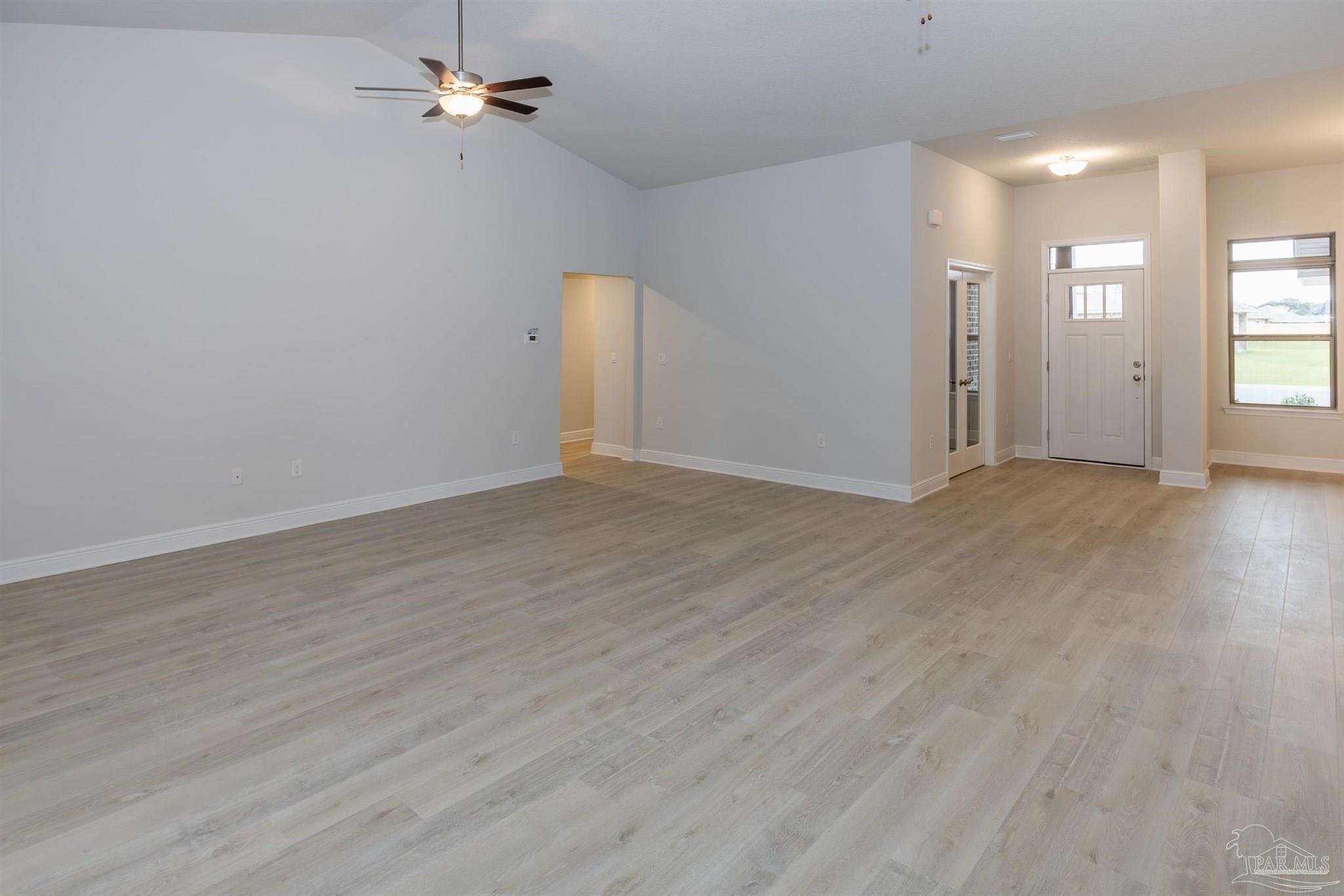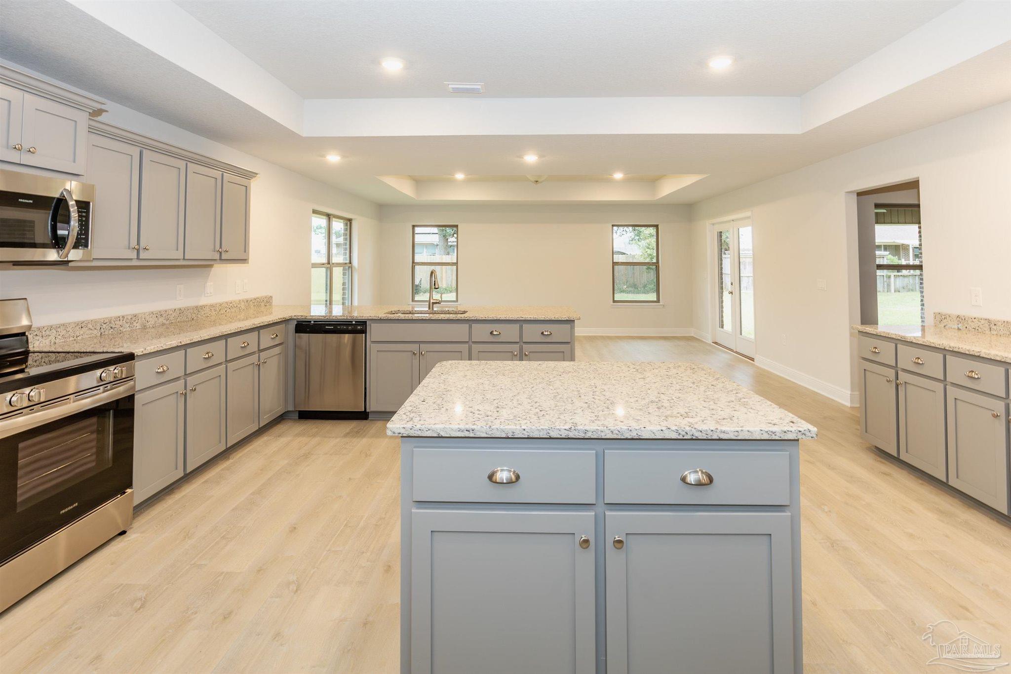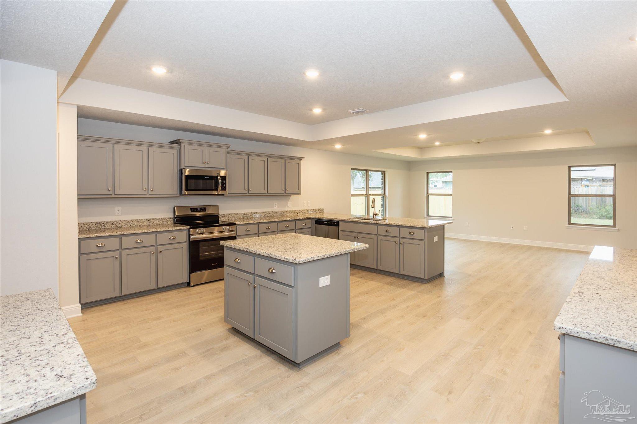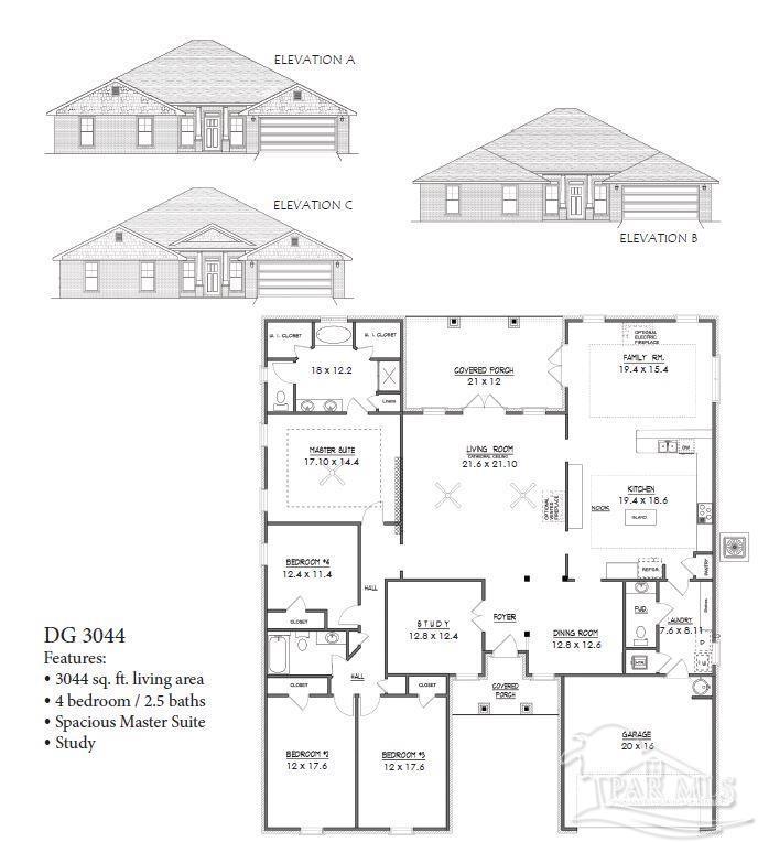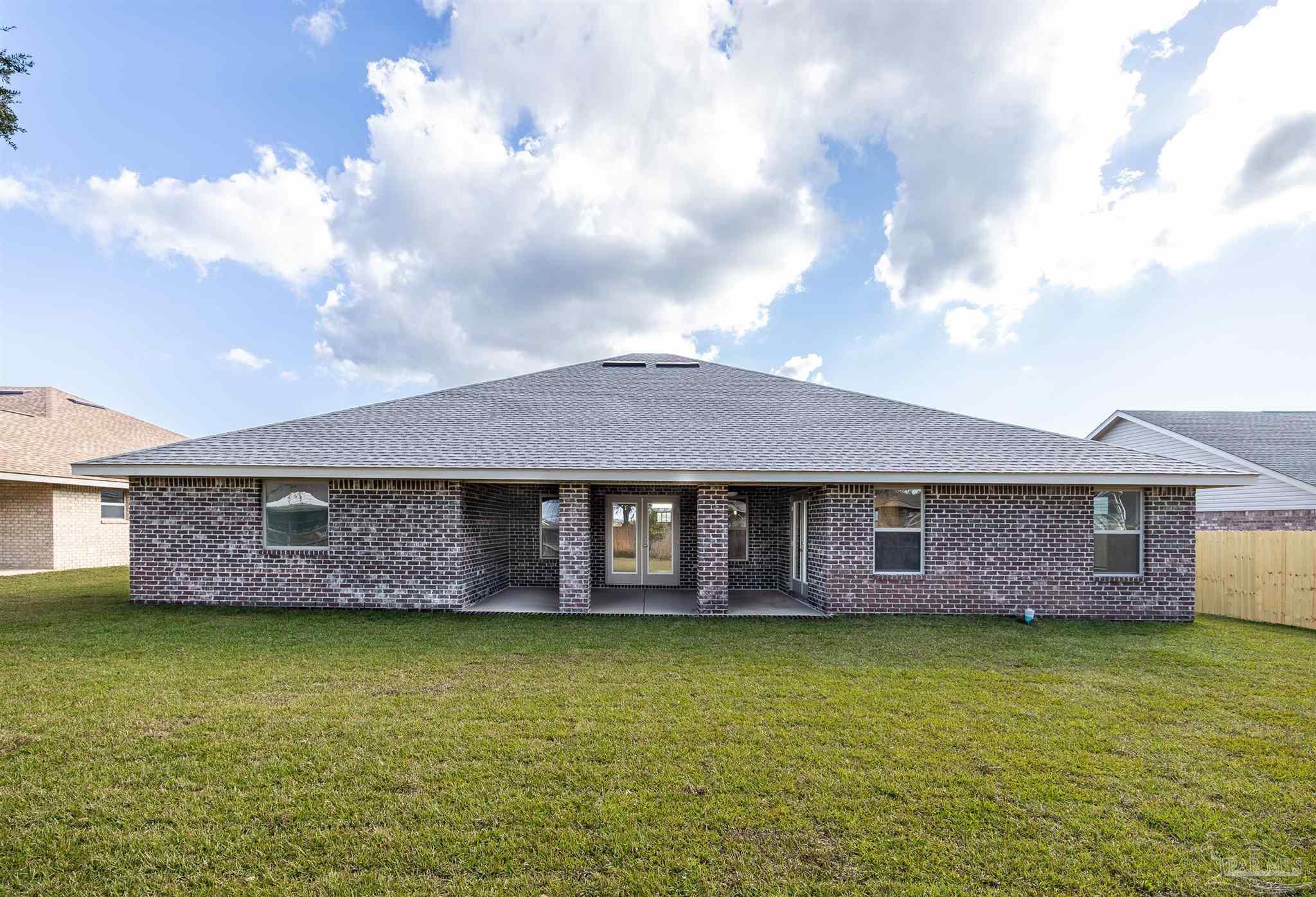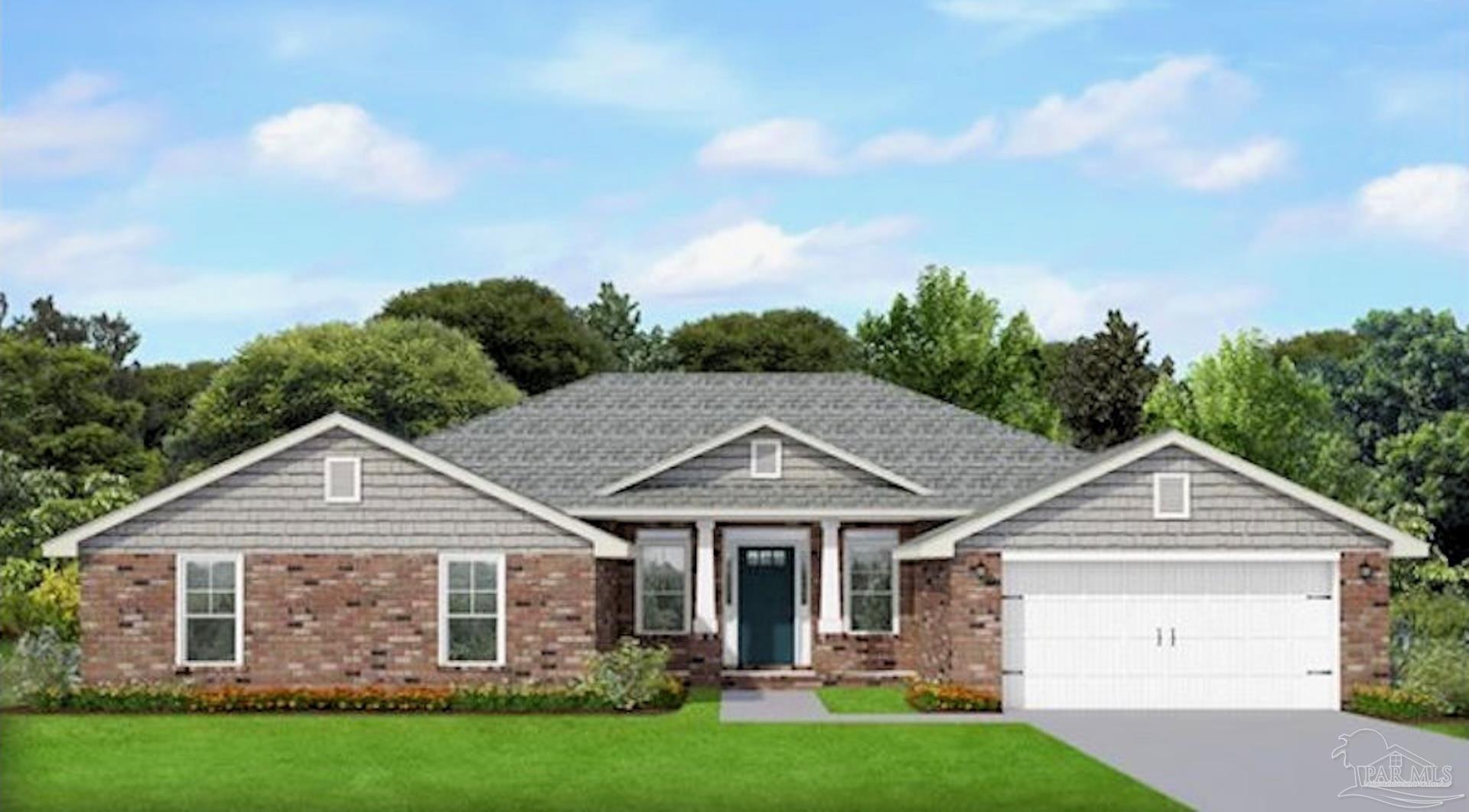 Ready Now! This breathtaking 3044 sq. ft. 'all brick' home features four spacious bedrooms and 2.5 bathrooms. The layout of this home is designed to provide ample space for comfortable living. Entering the home from a beautiful covered front porch, you are greeted with a welcoming foyer. A study with French doors and a formal dining room is off the foyer. The living room and family room have double doors that lead to a large, covered lanai for outdoor activities and gatherings. This dream kitchen features custom-made gray shaker cabinets, timeless quartz countertops, a central island, a breakfast bar peninsula, a stainless steel radiant top range, a mounted microwave, a dishwasher, and a pantry. The kitchen opens into a large family room, creating a perfect space for entertaining guests and spending quality time with family. The half bath is conveniently located off the laundry room with a beautiful quartz countertop. This home has gorgeous LVP flooring throughout the whole home! The spacious owner’s suite features a box ceiling with a ceiling fan, making it a true retreat. The owner’s bath has two large walk-in closets, a garden tub with a window, a separate shower, a double vanity with quartz countertops, and a linen closet. The additional bedrooms are generously sized and share a full bathroom with quartz countertops. This all-electric home comes with a fully sodded yard, professional landscaping package, spacious covered lanai with two exterior ceiling fans, a sprinkler system, a garage door opener, and many other features. Thank you!