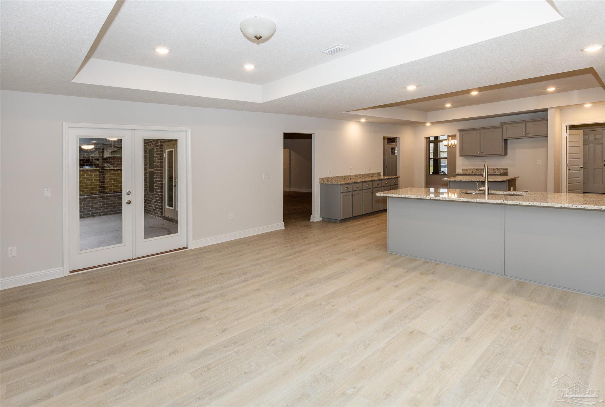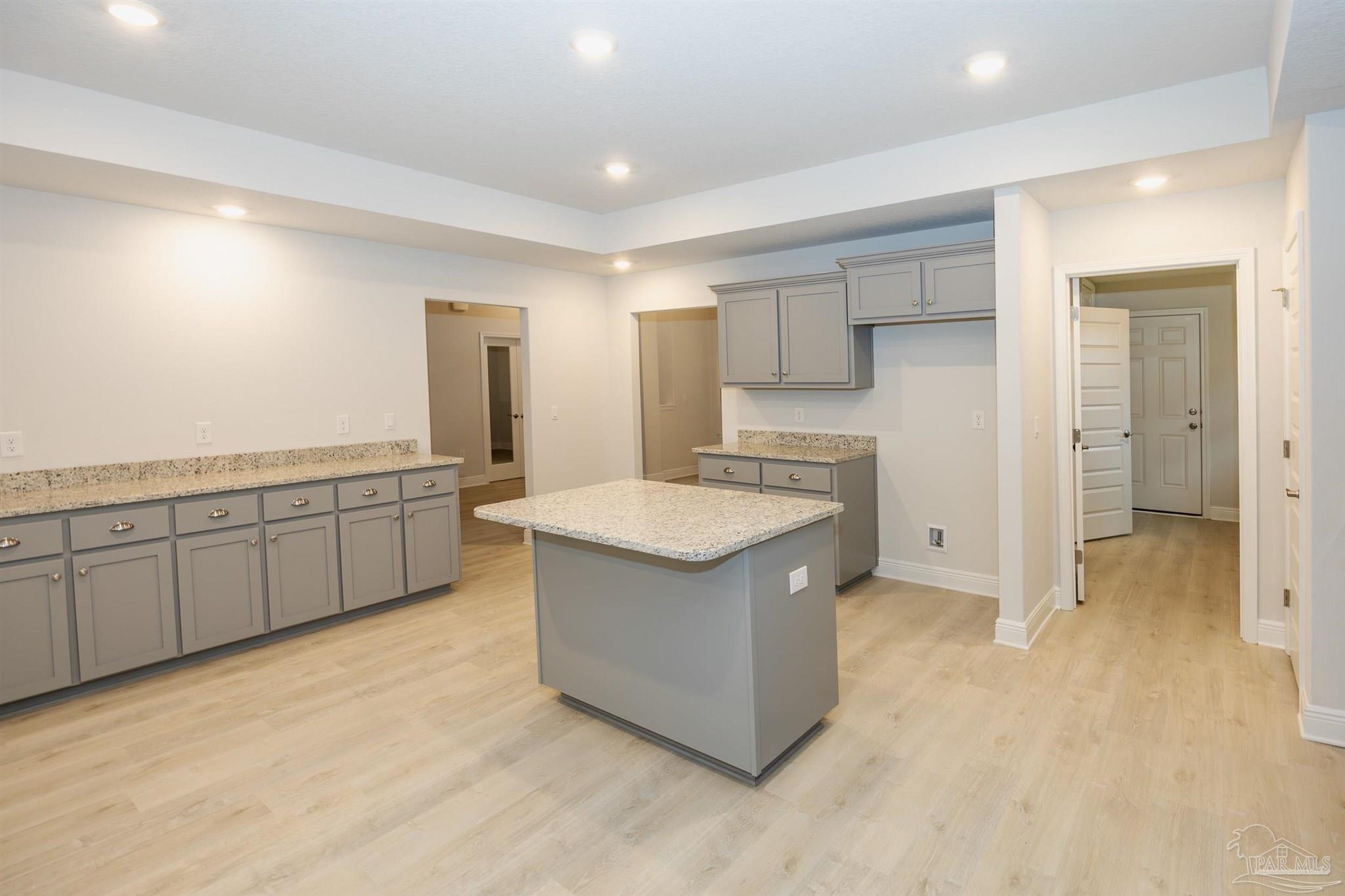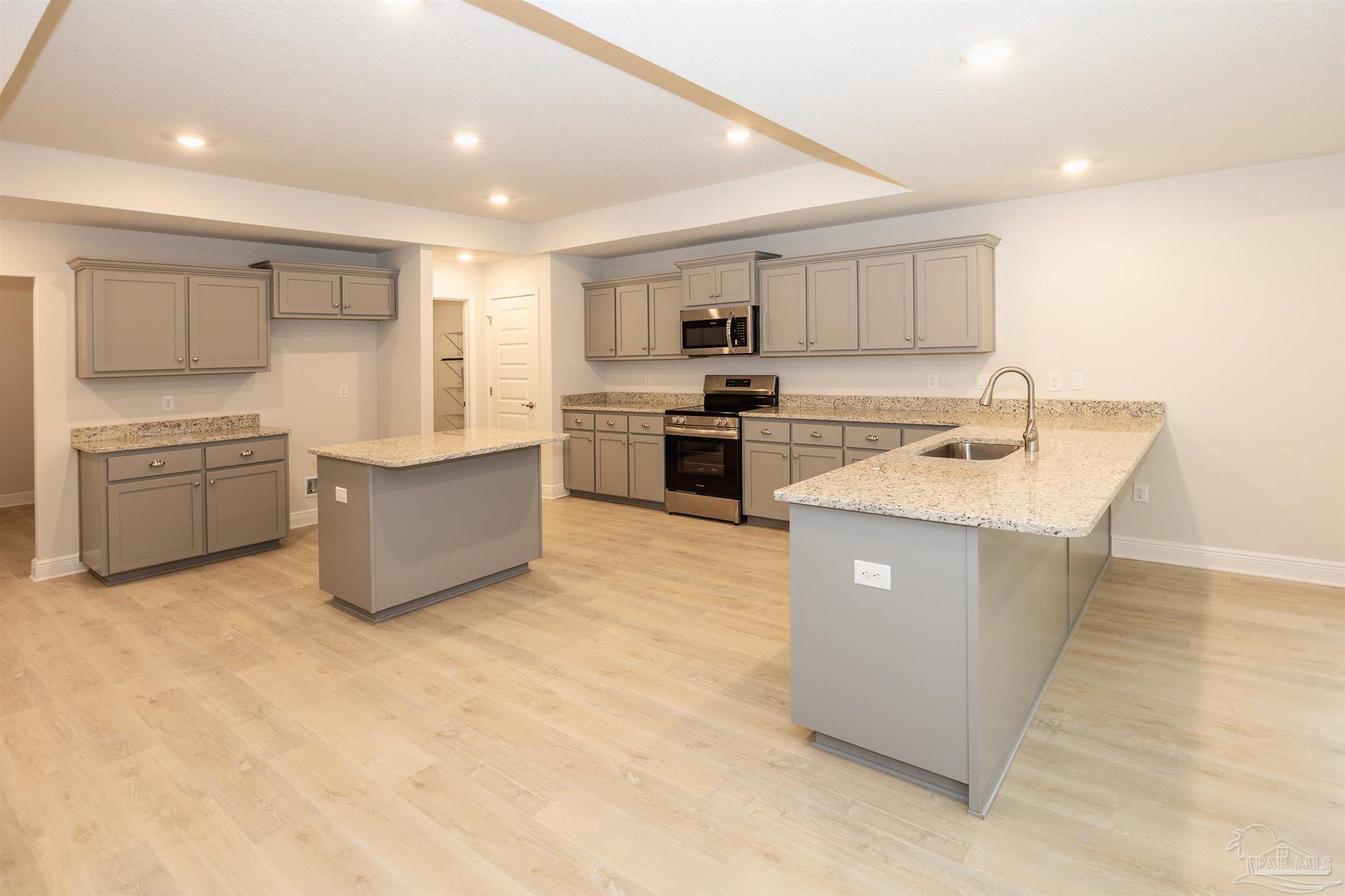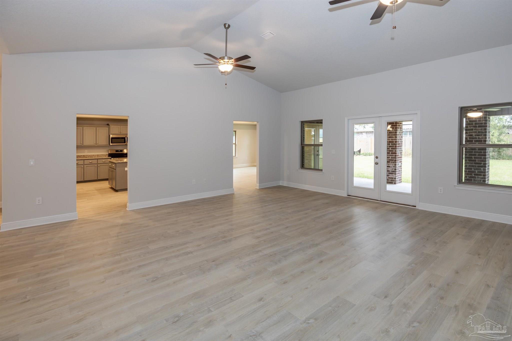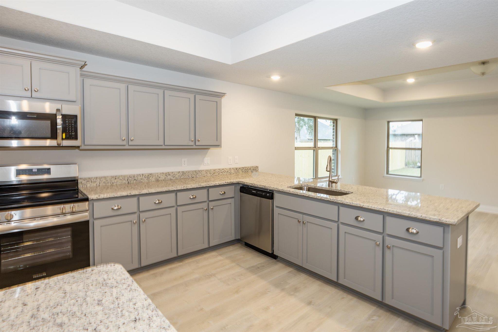 Ready Now! This breathtaking 3044 sq. ft. 'all brick' home features four spacious bedrooms and 2.5 bathrooms. The layout of this home is designed to provide ample space for comfortable living. Entering the home from a beautiful covered front porch, you are greeted with a welcoming foyer. A study with French doors and a formal dining room is off the foyer. The living room and family room have double doors that lead to a large, covered lanai for outdoor activities and gatherings. This dream kitchen features custom-made gray shaker cabinets, timeless quartz countertops, a central island, a breakfast bar peninsula, a stainless steel radiant top range, a mounted microwave, a dishwasher, and a pantry. The kitchen opens into a large family room, creating a perfect space for entertaining guests and spending quality time with family. The half bath is conveniently located off the laundry room with a beautiful quartz countertop. This home has gorgeous LVP flooring throughout the whole home! The spacious owner’s suite features a box ceiling with a ceiling fan, making it a true retreat. The owner’s bath has two large walk-in closets, a garden tub with a window, a separate shower, a double vanity with quartz countertops, and a linen closet. The additional bedrooms are generously sized and share a full bathroom with quartz countertops. This all-electric home comes with a fully sodded yard, professional landscaping package, spacious covered lanai with two exterior ceiling fans, a sprinkler system, a garage door opener, and many other features. Thank you!