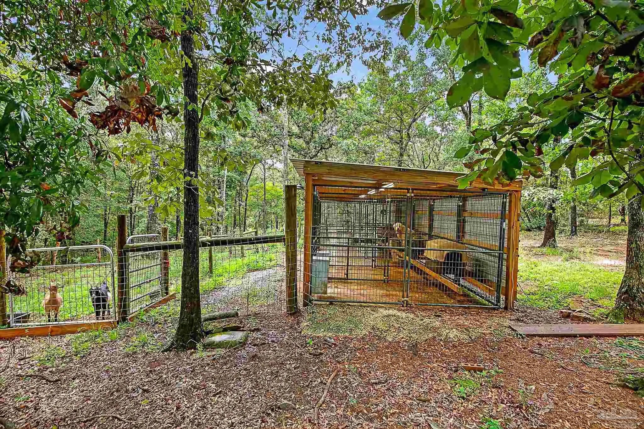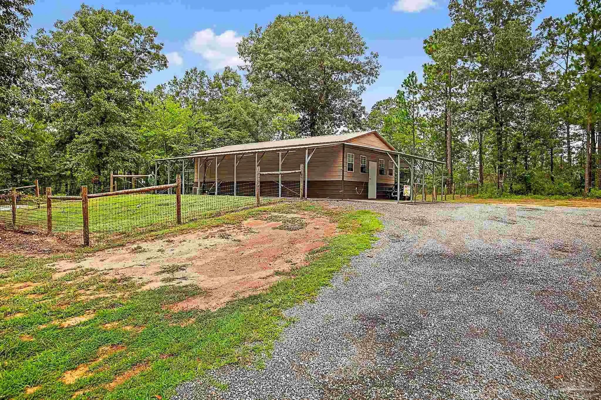 Welcome to this stunning and unique property located in the peaceful Lottie area of Baldwin County. Nestled on 17.5 beautiful wooded acres—approximately 8 of which are fully fenced—this well-maintained home, built in 2017, offers a perfect blend of comfort, space, and opportunity. A newly laid gravel rock driveway leads you all the way from the road to the home and both large metal shops, offering easy access and a clean, polished approach to the property. Inside, the home features tall ceilings and a spacious open-concept design that’s ideal for entertaining. The kitchen is complete with granite countertops and stainless steel appliances, all of which convey with the sale. The master suite offers ample natural light and a beautifully designed bathroom with two walk-in closets, double vanities, a tiled shower, and a separate garden tub—making it a true retreat. This property was previously used as a fully functioning dog breeding facility and is equipped with everything you need to bring it back to life or repurpose it to suit your needs. Two massive metal shops provide endless potential. The primary 60’x40’ shop features a closed-cell spray foam insulated man cave area, with 20’x30’ of it fully enclosed, air-conditioned, and outfitted with a full kitchen, game cleaning area, washer and dryer, and 200 amp electrical service. Attached to the home is a huge 36’x36’ carport that leads directly into a 25’x10’ screened-in porch—which is equipped with 200 amp service, making the porch ideal for a jacuzzi or outdoor living space. A separate water well services all of the shops, the fenced pasture, and several concrete slabs that once supported kennels, offering excellent utility access for livestock, business operations, or other uses. Whether you’re seeking peaceful country living, a turnkey business opportunity, or a bit of both, this versatile and beautifully maintained property is ready for its next chapter. Schedule your private showing today to experience all it!