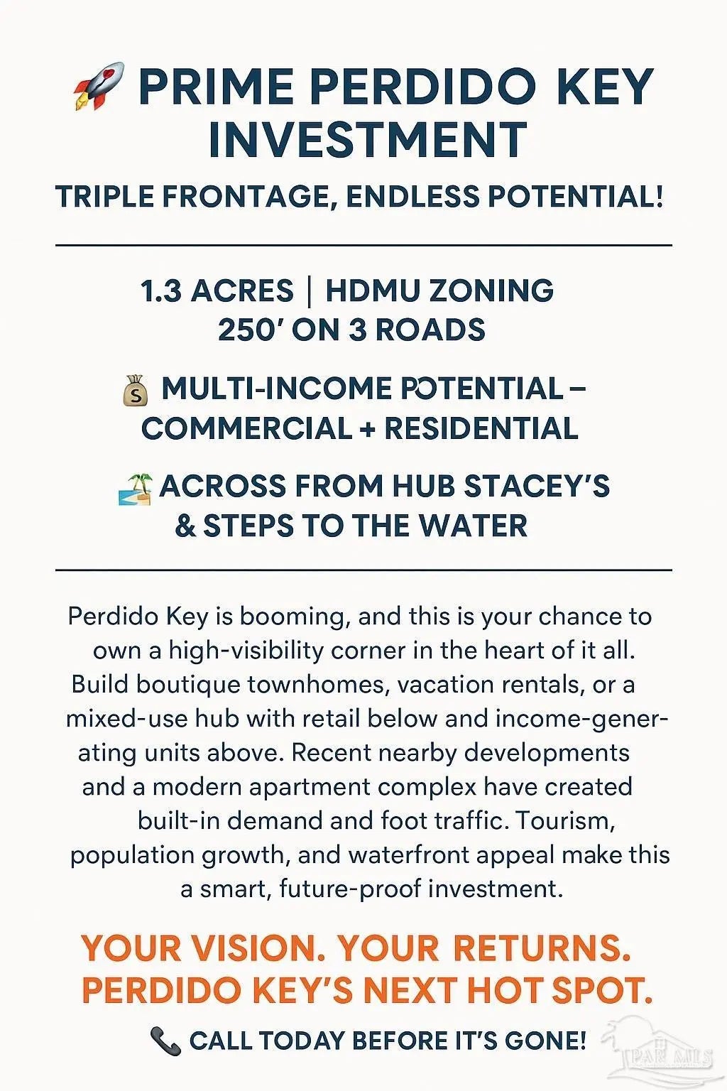 Unlock an exceptional investment opportunity in one of Perdido Key’s fastest-growing corridors. This 1.3-acre property offers an unparalleled mix of visibility, access, and flexibility, with 250 feet of frontage each on Innerarity Point Road, Galvez Road, and Cruzat Way. Zoned HDMU, it is primed for both residential and commercial development, creating multiple income streams from a single site. Originally platted into 10 residential lots, the property is ideal for boutique townhomes, upscale vacation rentals, or a mixed-use destination that combines ground-floor retail with high-demand upper-floor Airbnb units. Imagine the rental income from a thoughtfully designed complex featuring a coffee shop, boutique retail, or wellness studio below, paired with luxury short-term or long-term rentals above—perfectly positioned to capture year-round tourism and steady local demand. The location is unbeatable: across from the popular Hub Stacey’s, next to picturesque Innerarity Point Park, and steps from Galvez Landing for boating, fishing, and waterfront recreation. Residents and visitors alike will appreciate the ability to walk to restaurants, entertainment, and essential services. The neighborhood’s momentum is undeniable, with several new residential communities and a modern apartment complex recently completed, increasing foot traffic and creating a ready-made customer base. The combination of tourism growth, a booming residential population, and the area’s coastal charm makes this a rare chance to secure a high-performing asset in a market poised for continued appreciation. Whether your goal is steady cash flow, long-term equity growth, or both, this prime location offers the versatility and demand drivers that investors seek. Act now to claim your place in Perdido Key’s dynamic future. NO BEACH MOUSE PERMIT NEEDED!