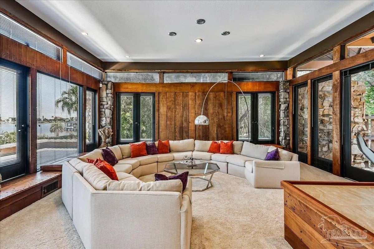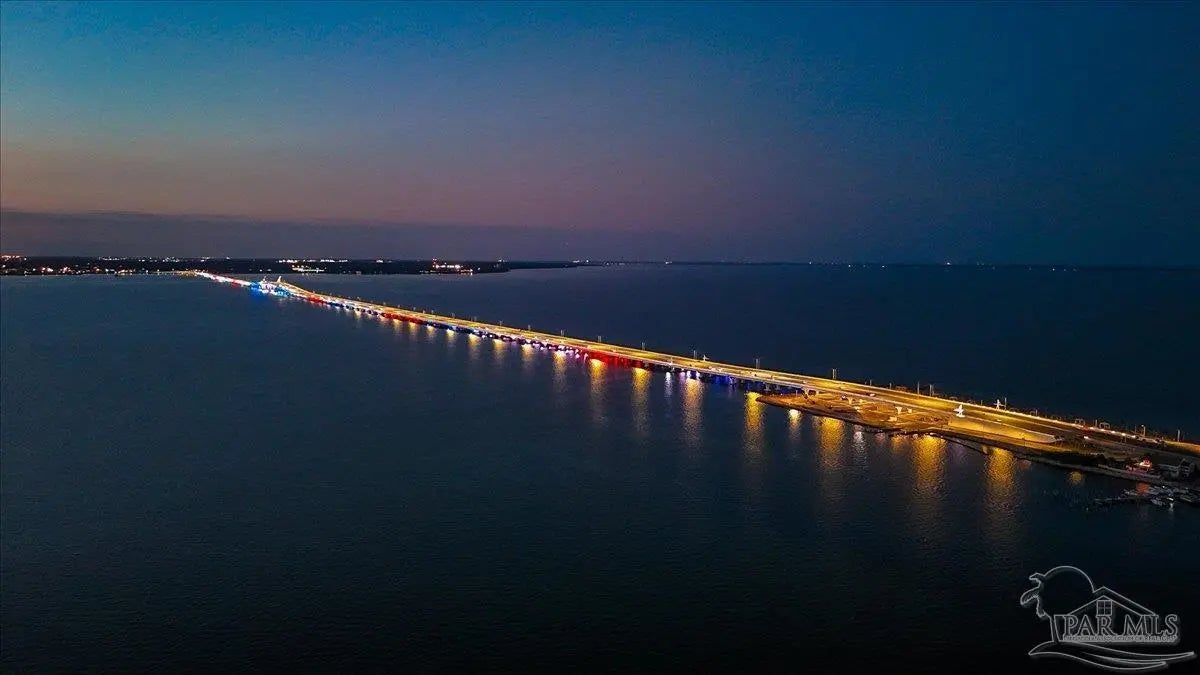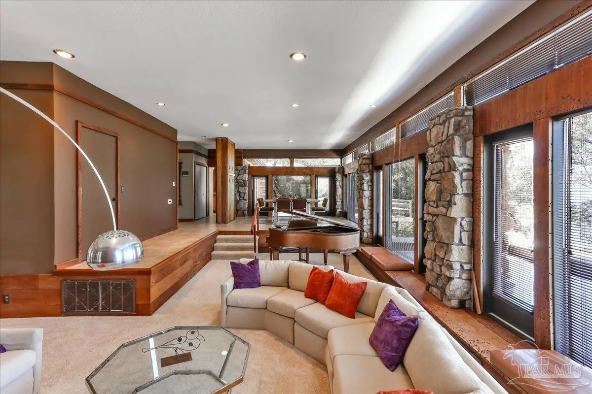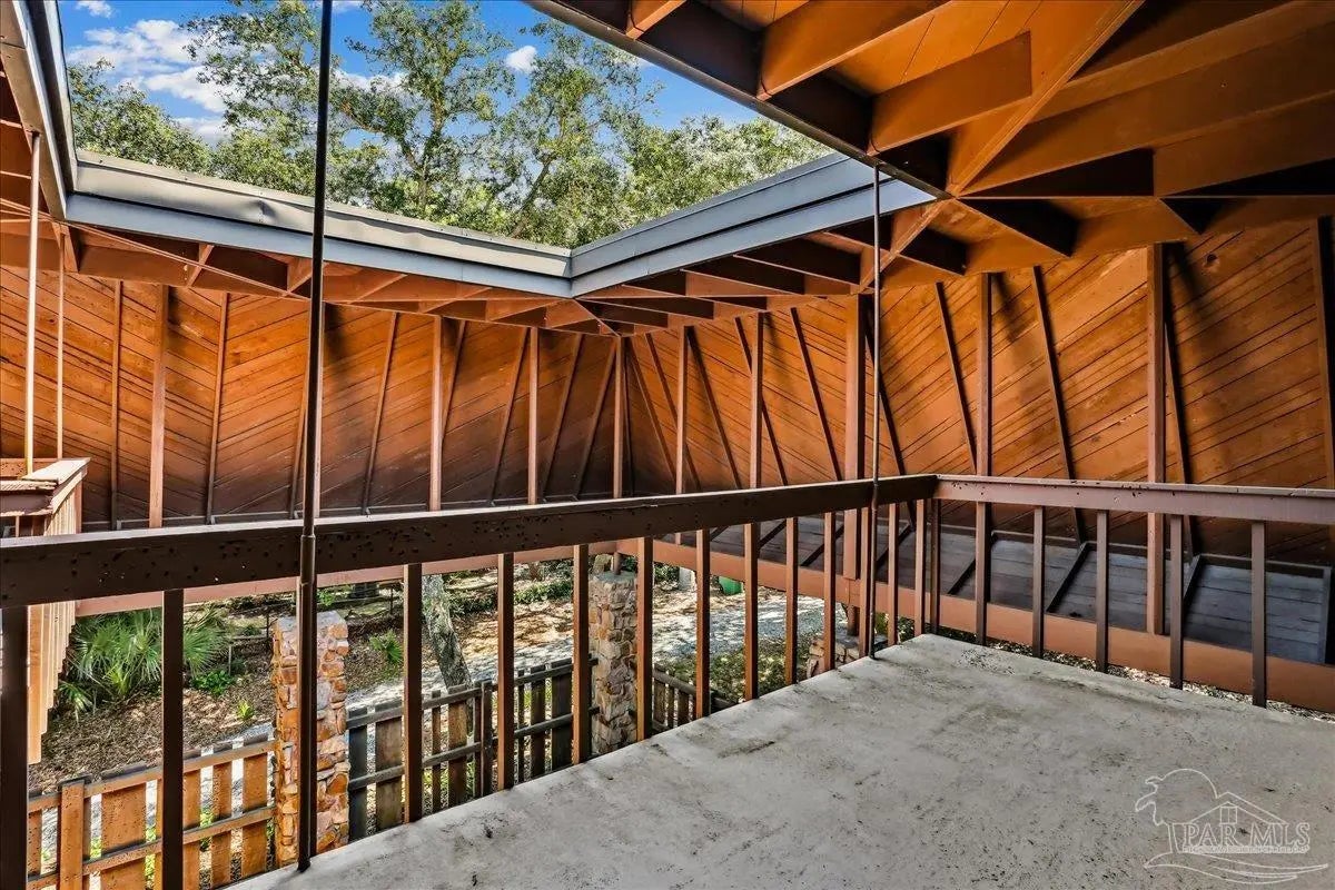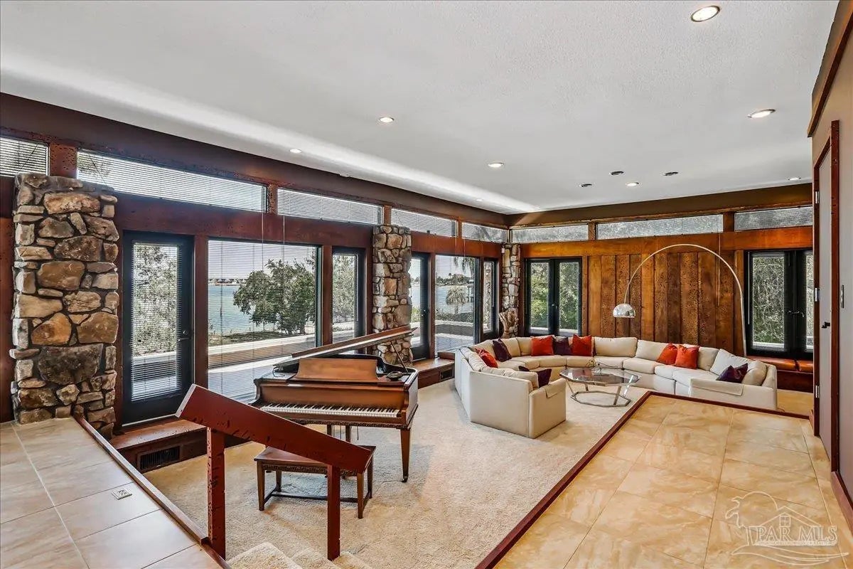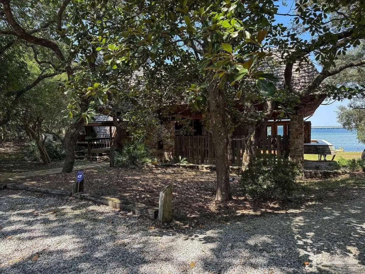 An extraordinary opportunity awaits in Gulf Breeze Proper with this mid-century modern residence, a landmark property designed by an internationally renowned architect. Built in 1972 and inspired by a celebrated American architect, this home offers commanding, panoramic views of Pensacola Bay and the iconic 3-Mile Bridge. Set discreetly on a sloping hill for optimal privacy, its sprawling 0.849-acre lot is one of the largest waterfront parcels in the neighborhood. Owned and maintained by a single family since its construction, the property seamlessly blends its rich architectural pedigree with tasteful, modern updates. The whole home exterior is done in cedar shake and copper trim throughout, which pairs beautifully with the home's unique interior. The 3,234 sq. ft. open-concept layout is distinguished by the lavish and very rare use of Amazonian wormwood throughout the home, both inside and out. This highly unique material, with its distinctive grain and texture, adds unparalleled character and historic depth to the Mid-Century Modern aesthetic, truly setting this residence apart. Expansive living and family rooms are bathed in natural light from oversized windows and open to over 3,000 sq. ft. of balconies. Designed with both art and function in mind, the home retains many original mid-century elements, including some custom furnishings from prominent designers of the era. At its core, a private atrium with a peaceful central garden experience for all balcony levels. The backyard is an entertainer's dream, with two massive balconies providing a stunning backdrop of the bay. Unique features include a spiral staircase, a private elevator, and a versatile potential theater room. This is more than a home; it is a piece of Gulf Breeze history, with notable visitors including a famous astronaut. The impressive 180 feet of waterfront is secured by a grandfathered easement, ensuring the property will never be assessed for dredging costs. With a discerning update, this ma