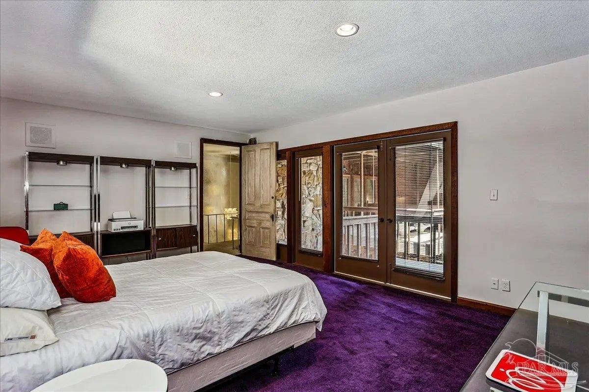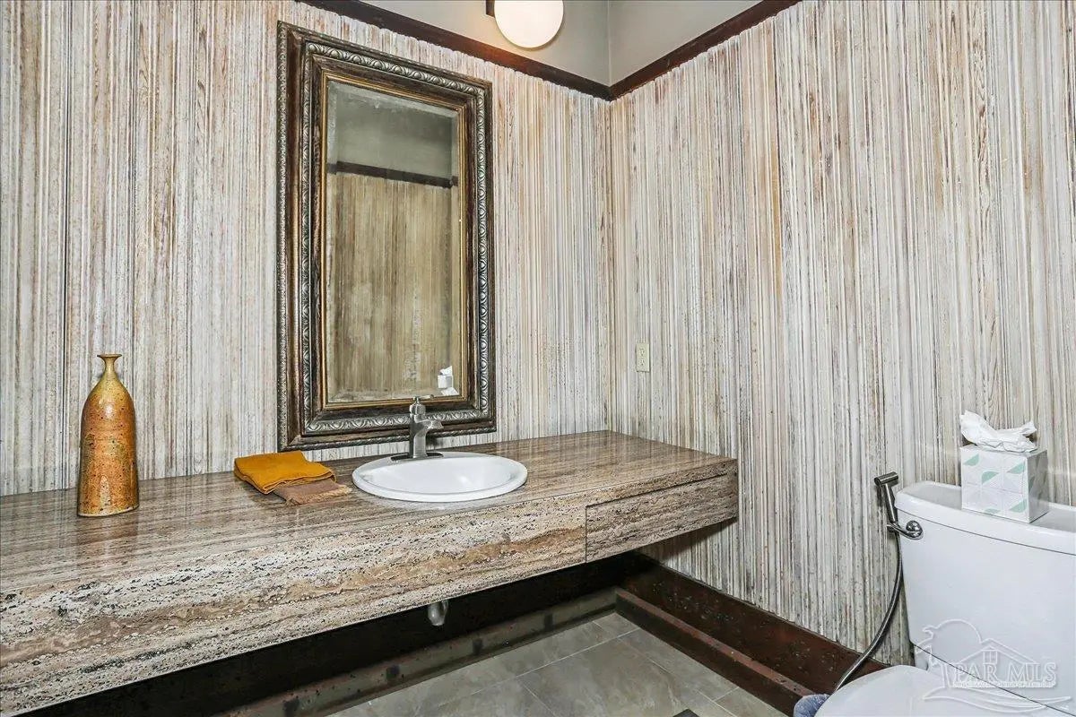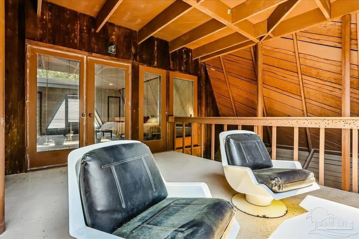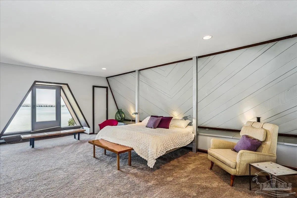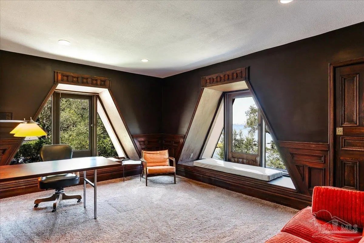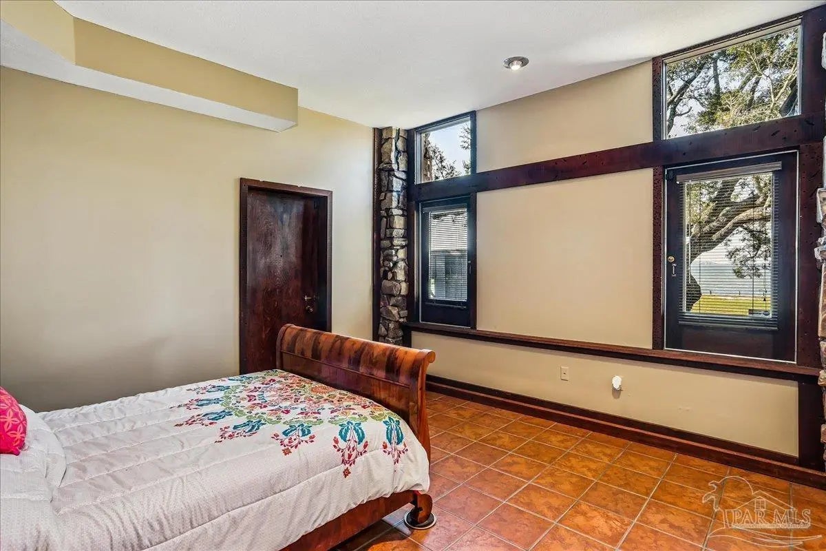 An extraordinary opportunity awaits in Gulf Breeze Proper with this mid-century modern residence, a landmark property designed by an internationally renowned architect. Built in 1972 and inspired by a celebrated American architect, this home offers commanding, panoramic views of Pensacola Bay and the iconic 3-Mile Bridge. Set discreetly on a sloping hill for optimal privacy, its sprawling 0.849-acre lot is one of the largest waterfront parcels in the neighborhood. Owned and maintained by a single family since its construction, the property seamlessly blends its rich architectural pedigree with tasteful, modern updates. The whole home exterior is done in cedar shake and copper trim throughout, which pairs beautifully with the home's unique interior. The 3,234 sq. ft. open-concept layout is distinguished by the lavish and very rare use of Amazonian wormwood throughout the home, both inside and out. This highly unique material, with its distinctive grain and texture, adds unparalleled character and historic depth to the Mid-Century Modern aesthetic, truly setting this residence apart. Expansive living and family rooms are bathed in natural light from oversized windows and open to over 3,000 sq. ft. of balconies. Designed with both art and function in mind, the home retains many original mid-century elements, including some custom furnishings from prominent designers of the era. At its core, a private atrium with a peaceful central garden experience for all balcony levels. The backyard is an entertainer's dream, with two massive balconies providing a stunning backdrop of the bay. Unique features include a spiral staircase, a private elevator, and a versatile potential theater room. This is more than a home; it is a piece of Gulf Breeze history, with notable visitors including a famous astronaut. The impressive 180 feet of waterfront is secured by a grandfathered easement, ensuring the property will never be assessed for dredging costs. With a discerning update, this ma