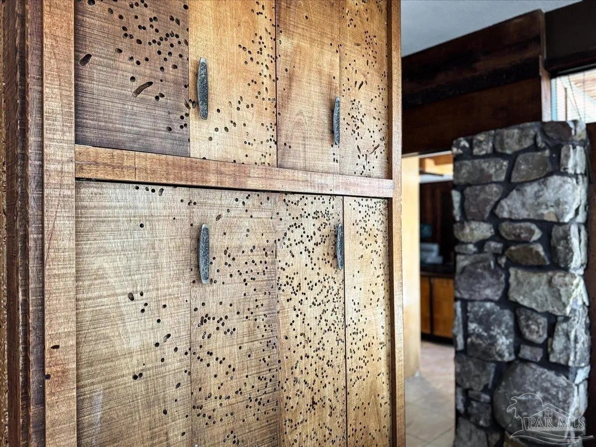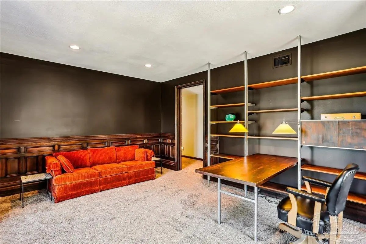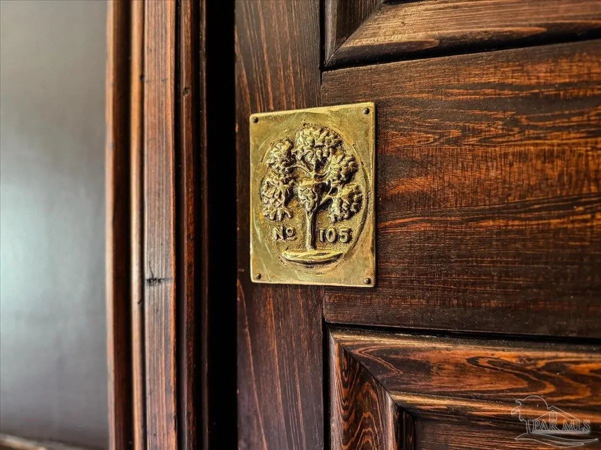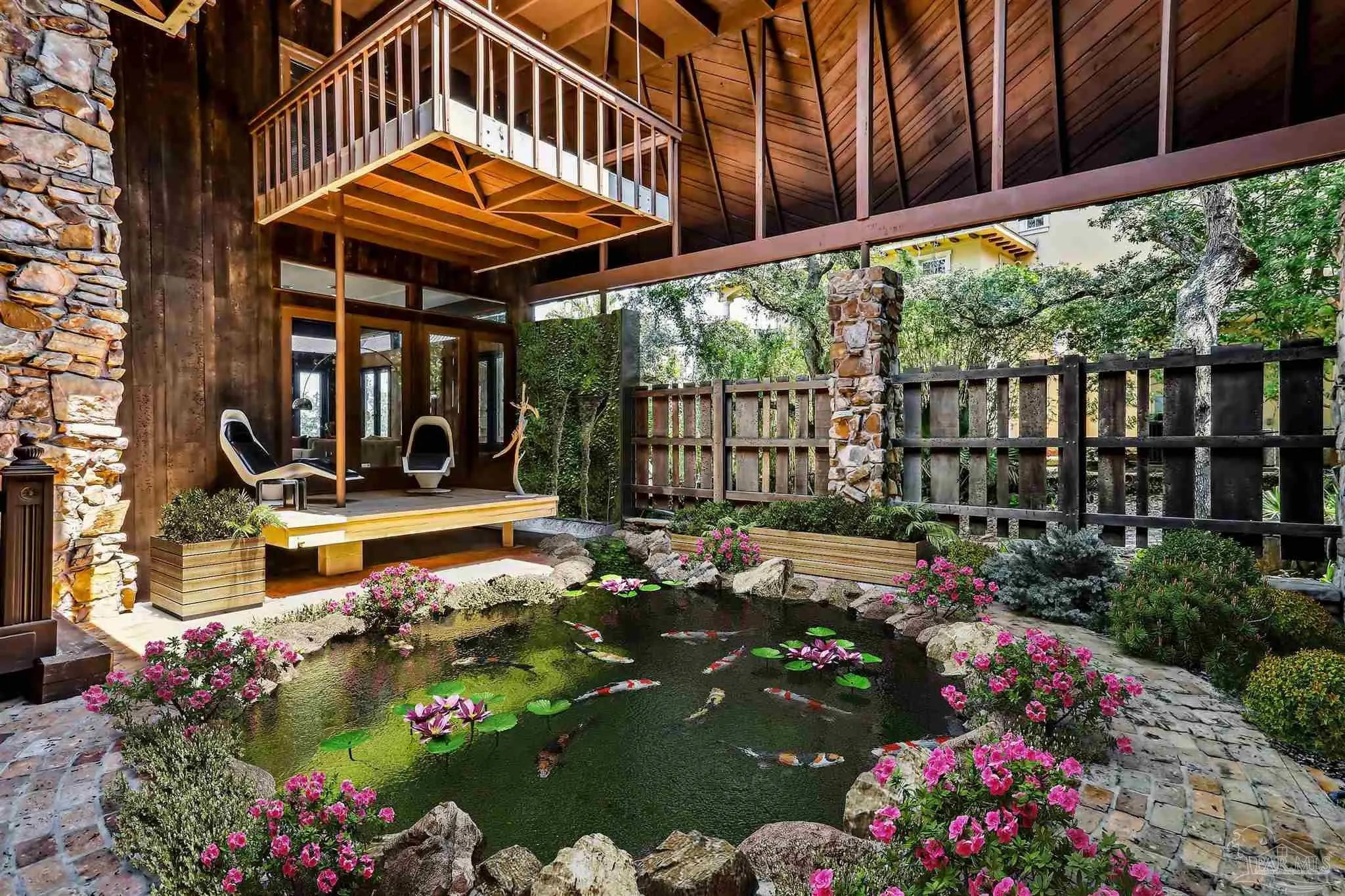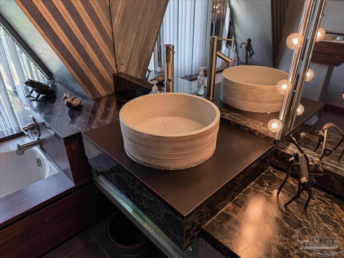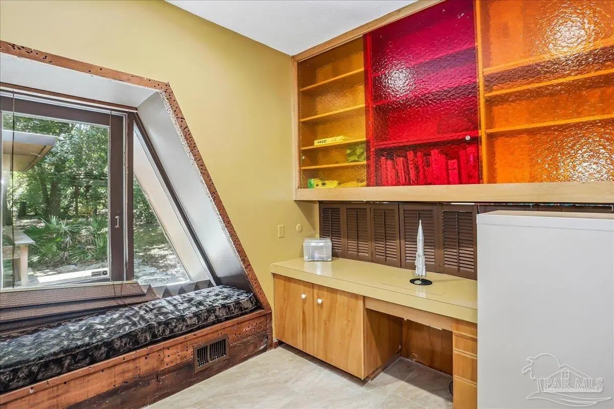 An extraordinary opportunity awaits in Gulf Breeze Proper with this mid-century modern residence, a landmark property designed by an internationally renowned architect. Built in 1972 and inspired by a celebrated American architect, this home offers commanding, panoramic views of Pensacola Bay and the iconic 3-Mile Bridge. Set discreetly on a sloping hill for optimal privacy, its sprawling 0.849-acre lot is one of the largest waterfront parcels in the neighborhood. Owned and maintained by a single family since its construction, the property seamlessly blends its rich architectural pedigree with tasteful, modern updates. The whole home exterior is done in cedar shake and copper trim throughout, which pairs beautifully with the home's unique interior. The 3,234 sq. ft. open-concept layout is distinguished by the lavish and very rare use of Amazonian wormwood throughout the home, both inside and out. This highly unique material, with its distinctive grain and texture, adds unparalleled character and historic depth to the Mid-Century Modern aesthetic, truly setting this residence apart. Expansive living and family rooms are bathed in natural light from oversized windows and open to over 3,000 sq. ft. of balconies. Designed with both art and function in mind, the home retains many original mid-century elements, including some custom furnishings from prominent designers of the era. At its core, a private atrium with a peaceful central garden experience for all balcony levels. The backyard is an entertainer's dream, with two massive balconies providing a stunning backdrop of the bay. Unique features include a spiral staircase, a private elevator, and a versatile potential theater room. This is more than a home; it is a piece of Gulf Breeze history, with notable visitors including a famous astronaut. The impressive 180 feet of waterfront is secured by a grandfathered easement, ensuring the property will never be assessed for dredging costs. With a discerning update, this ma
