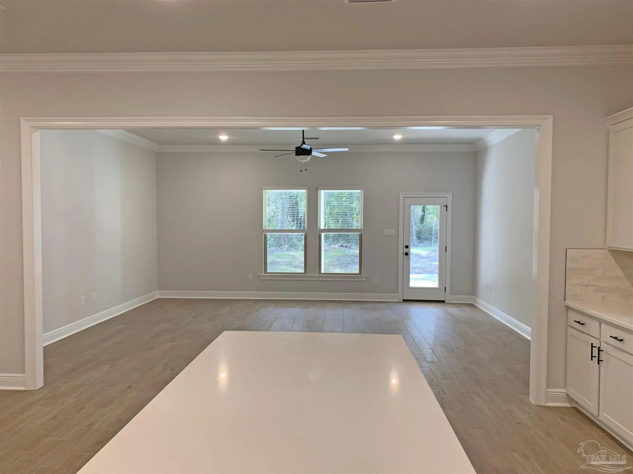- Baseboards, Ceiling Fan(s), Crown Molding, High Ceilings, Recessed Lighting