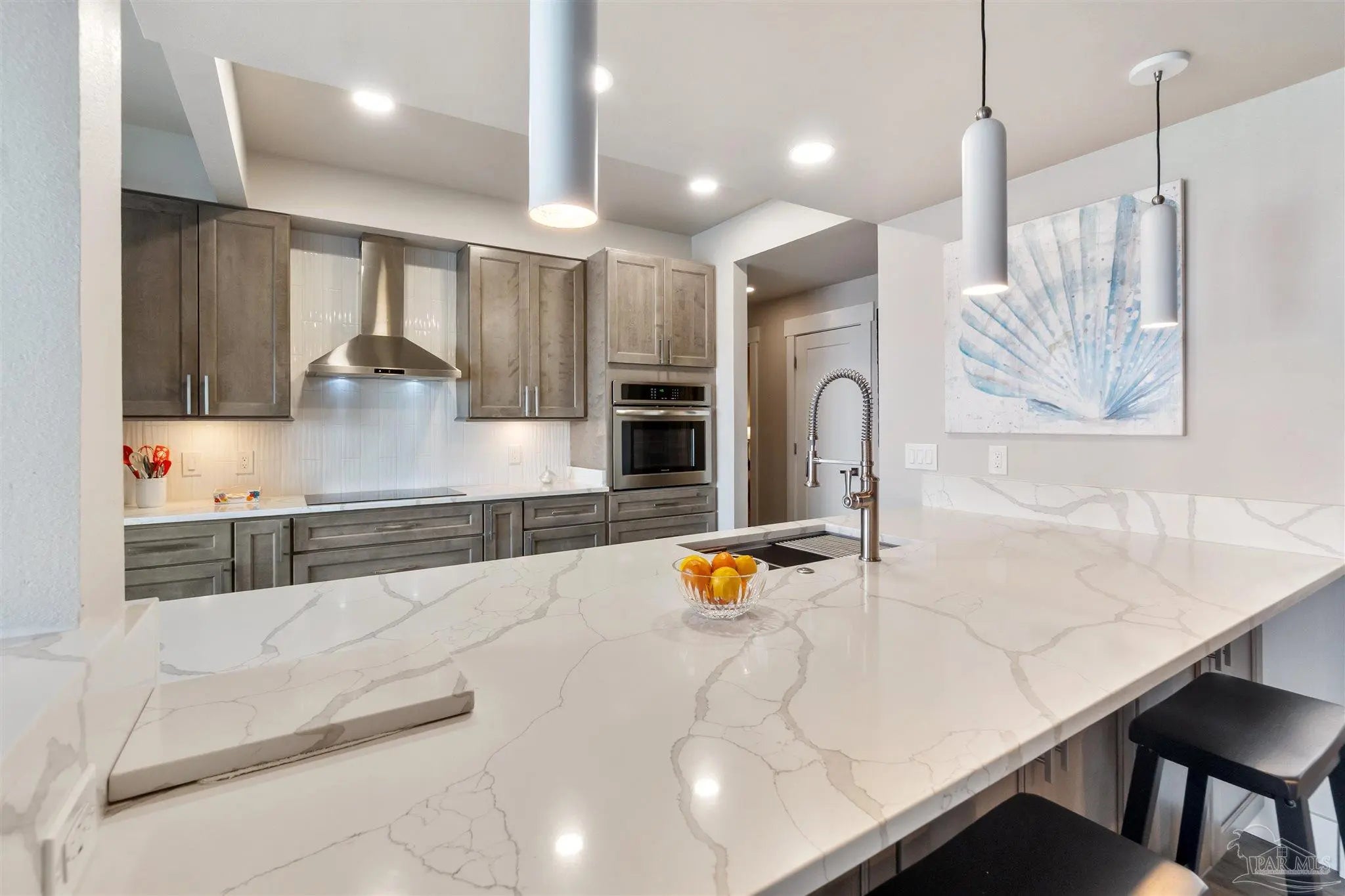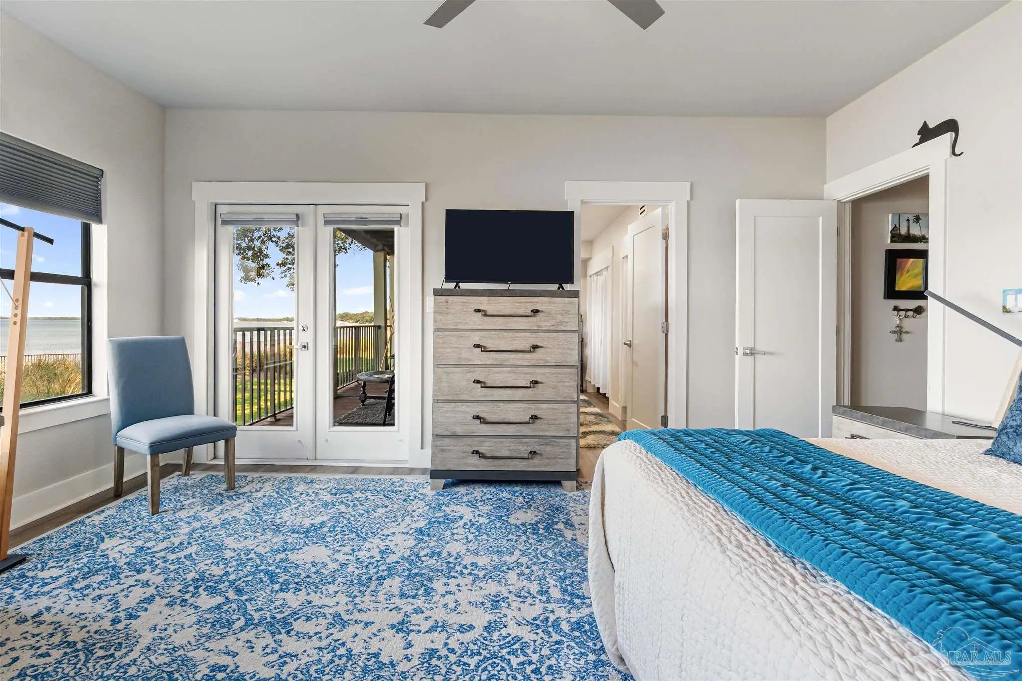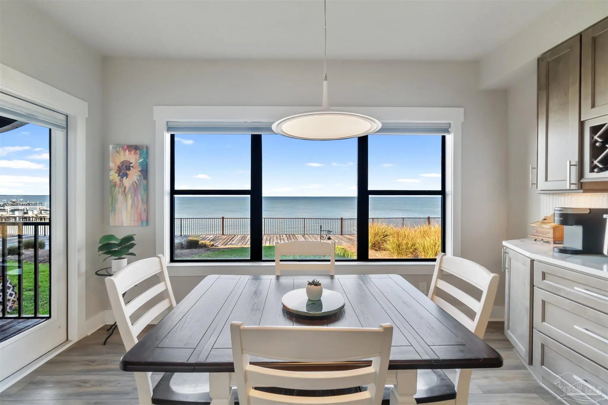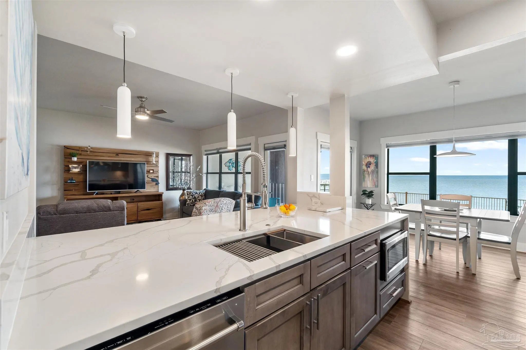 Embrace the ultimate in coastal living with this rare single-level, 3-bedroom, 2-bath condo located directly on the water in Gulf Breeze Proper. Set within the prestigious Baybridge Community, this beautifully updated unit combines serene waterfront views with thoughtful, high-end upgrades. Every detail has been thoughtfully updated—from the luxury vinyl flooring and cottage-style trim to the open-concept kitchen featuring a quartz countertop island with bar seating, sleek stainless appliances, and custom cabinetry that extends into the waterfront dining area. Enjoy the spa-like bathrooms with tiled showers, glass enclosures, and elegant vanities. Two French doors lead to 2 covered balconies that offer cool breezes and seamless panoramic views of Pensacola Bay. Extras include a whole-house water purification system, an oversized 2-car garage with built-in storage, and access to resort-style amenities—pool, tennis courts, private beach, boardwalk, and boat slips available for purchase. Close to downtown Pensacola and located directly on Pensacola Bay, this is waterfront living at its finest.