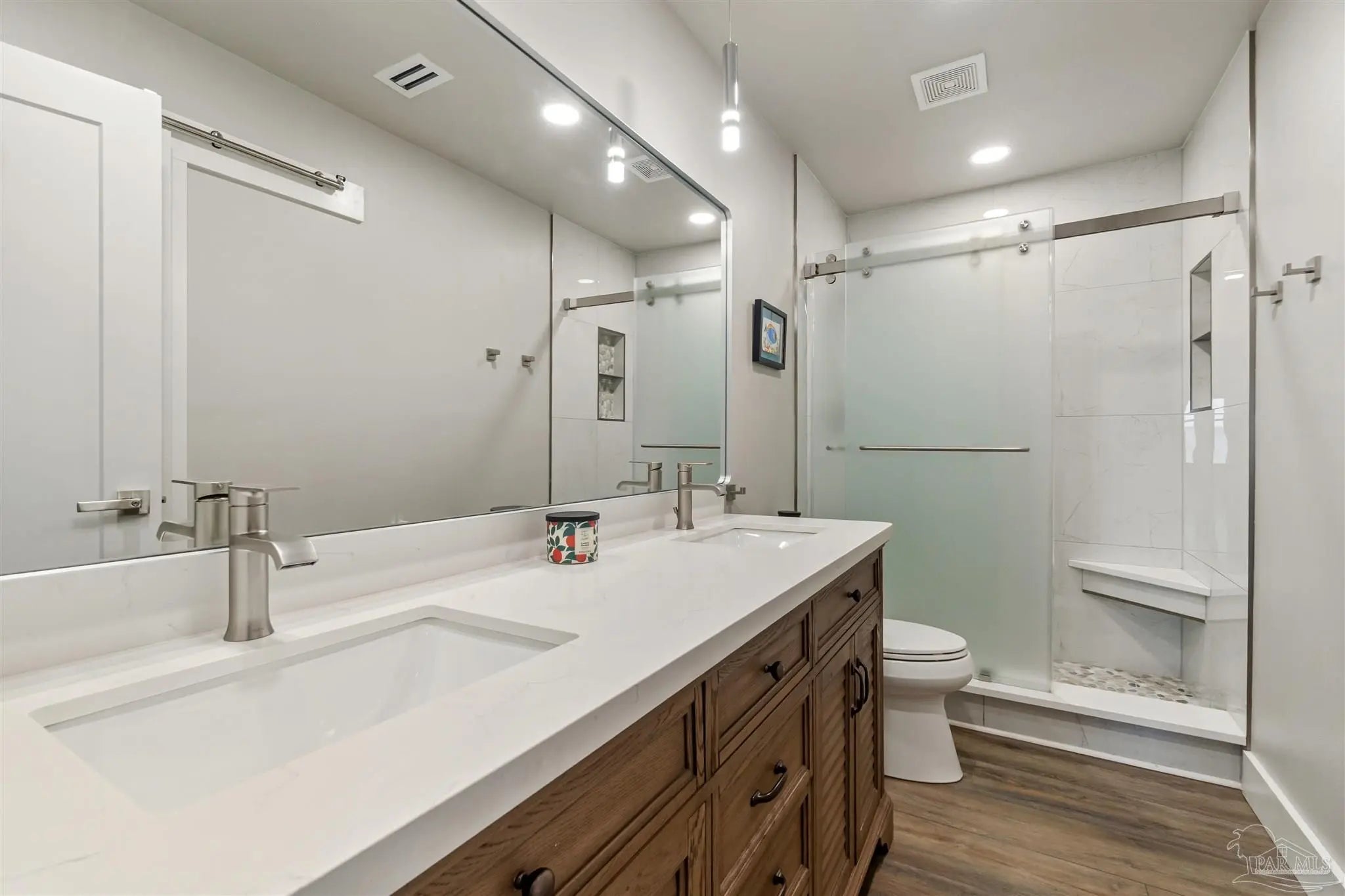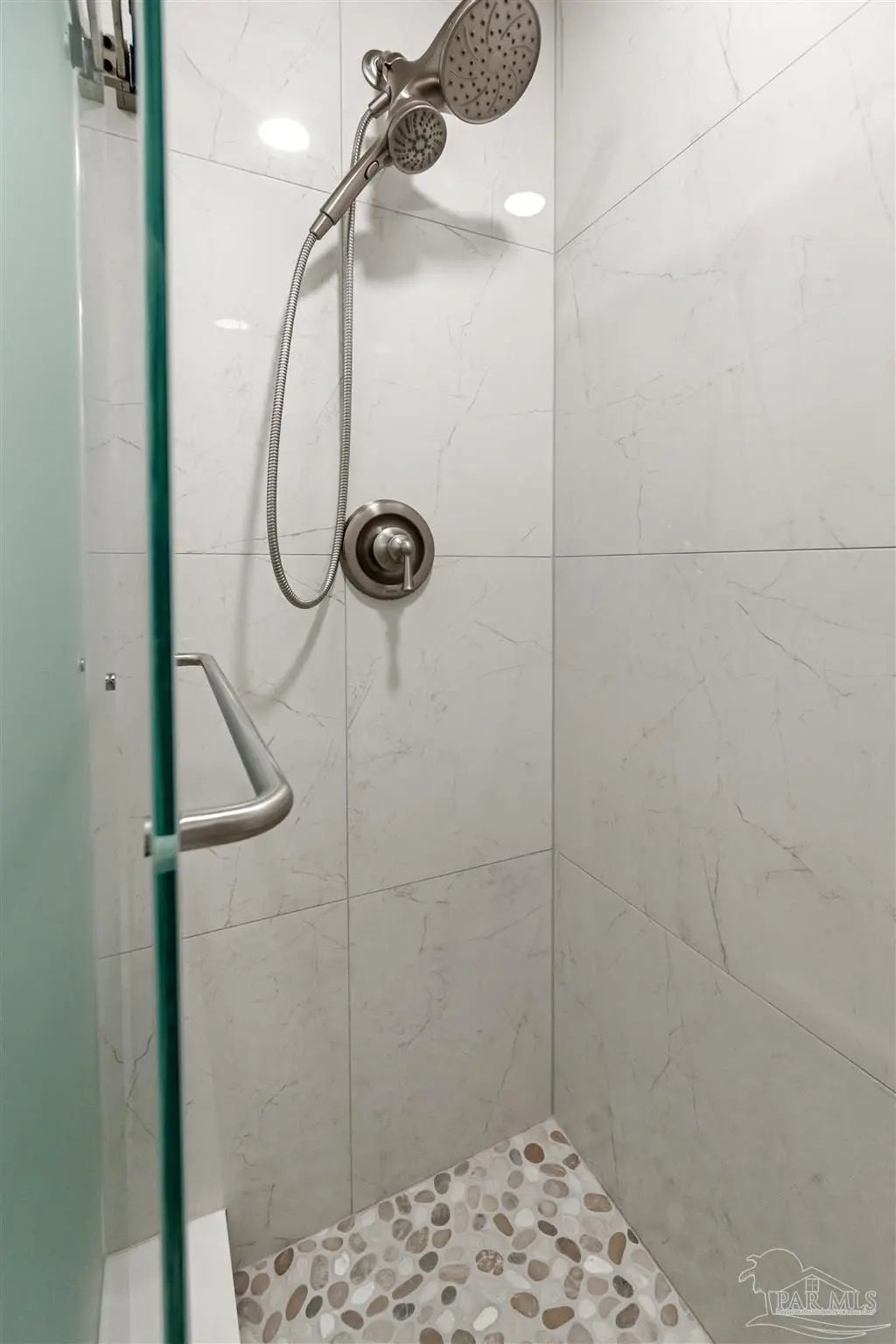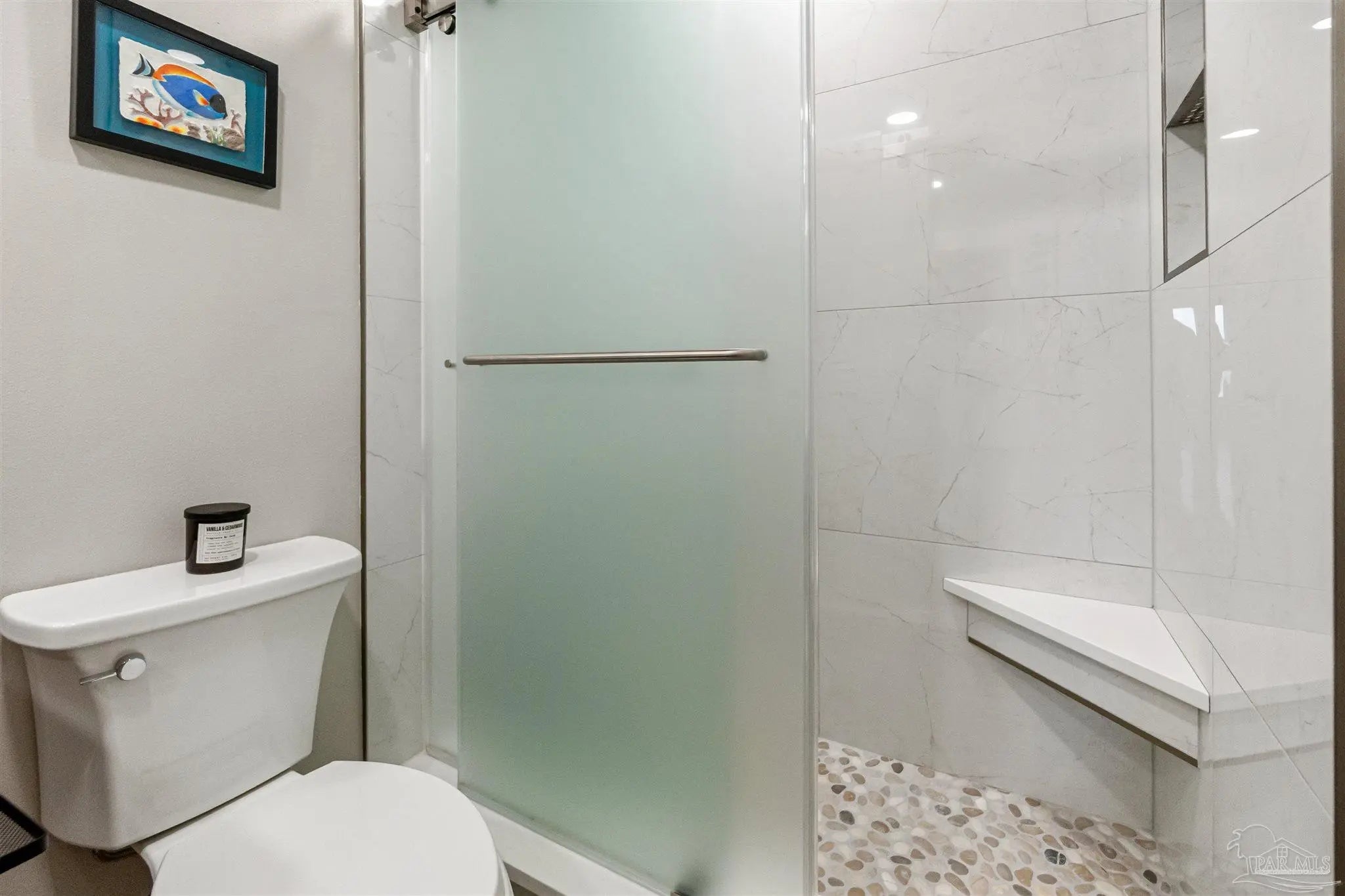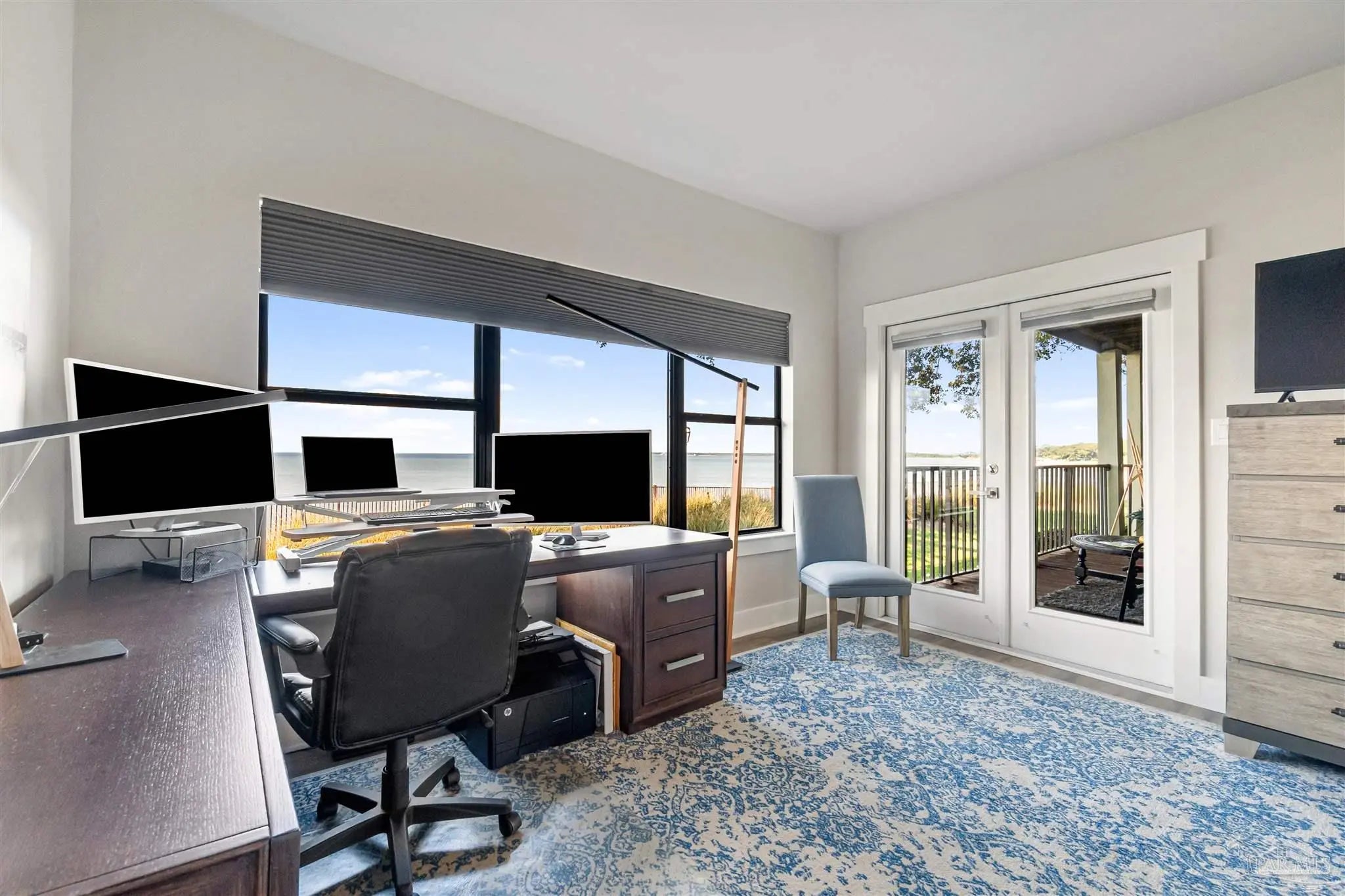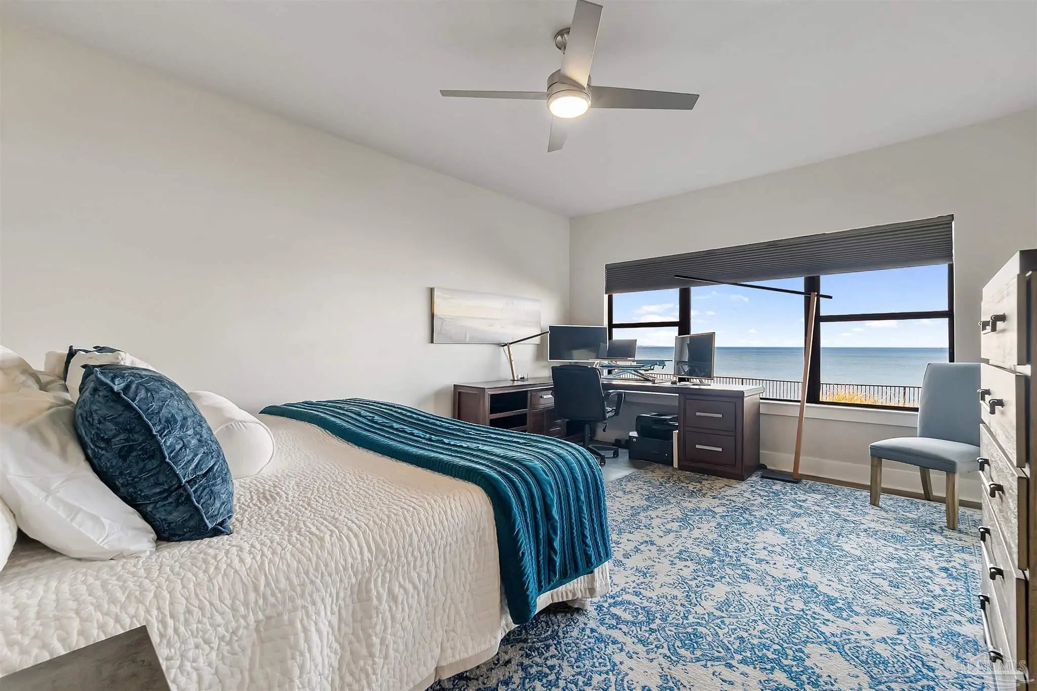 Embrace the ultimate in coastal living with this rare single-level, 3-bedroom, 2-bath condo located directly on the water in Gulf Breeze Proper. Set within the prestigious Baybridge Community, this beautifully updated unit combines serene waterfront views with thoughtful, high-end upgrades. Every detail has been thoughtfully updated—from the luxury vinyl flooring and cottage-style trim to the open-concept kitchen featuring a quartz countertop island with bar seating, sleek stainless appliances, and custom cabinetry that extends into the waterfront dining area. Enjoy the spa-like bathrooms with tiled showers, glass enclosures, and elegant vanities. Two French doors lead to 2 covered balconies that offer cool breezes and seamless panoramic views of Pensacola Bay. Extras include a whole-house water purification system, an oversized 2-car garage with built-in storage, and access to resort-style amenities—pool, tennis courts, private beach, boardwalk, and boat slips available for purchase. Close to downtown Pensacola and located directly on Pensacola Bay, this is waterfront living at its finest.