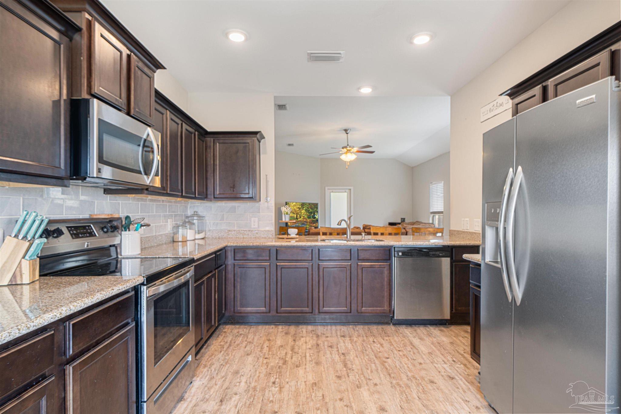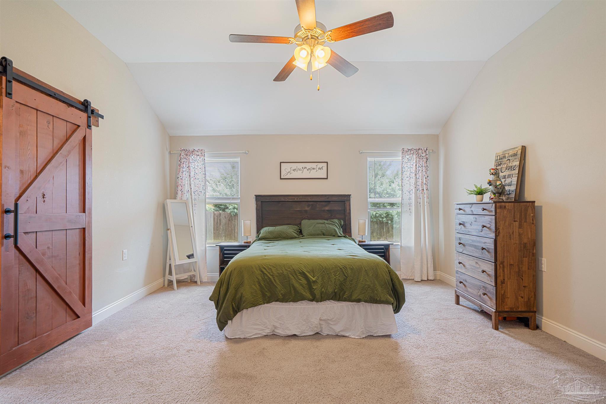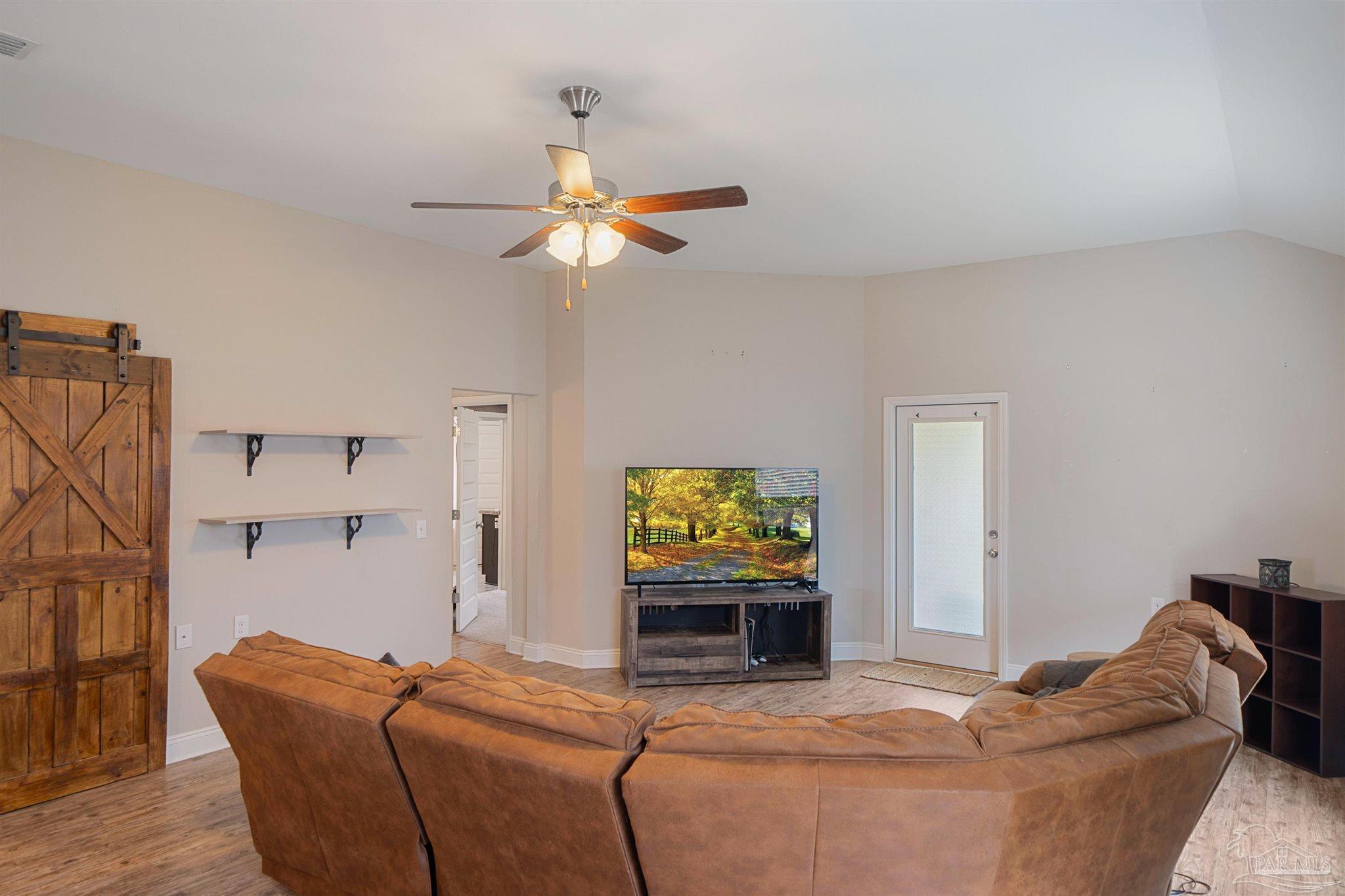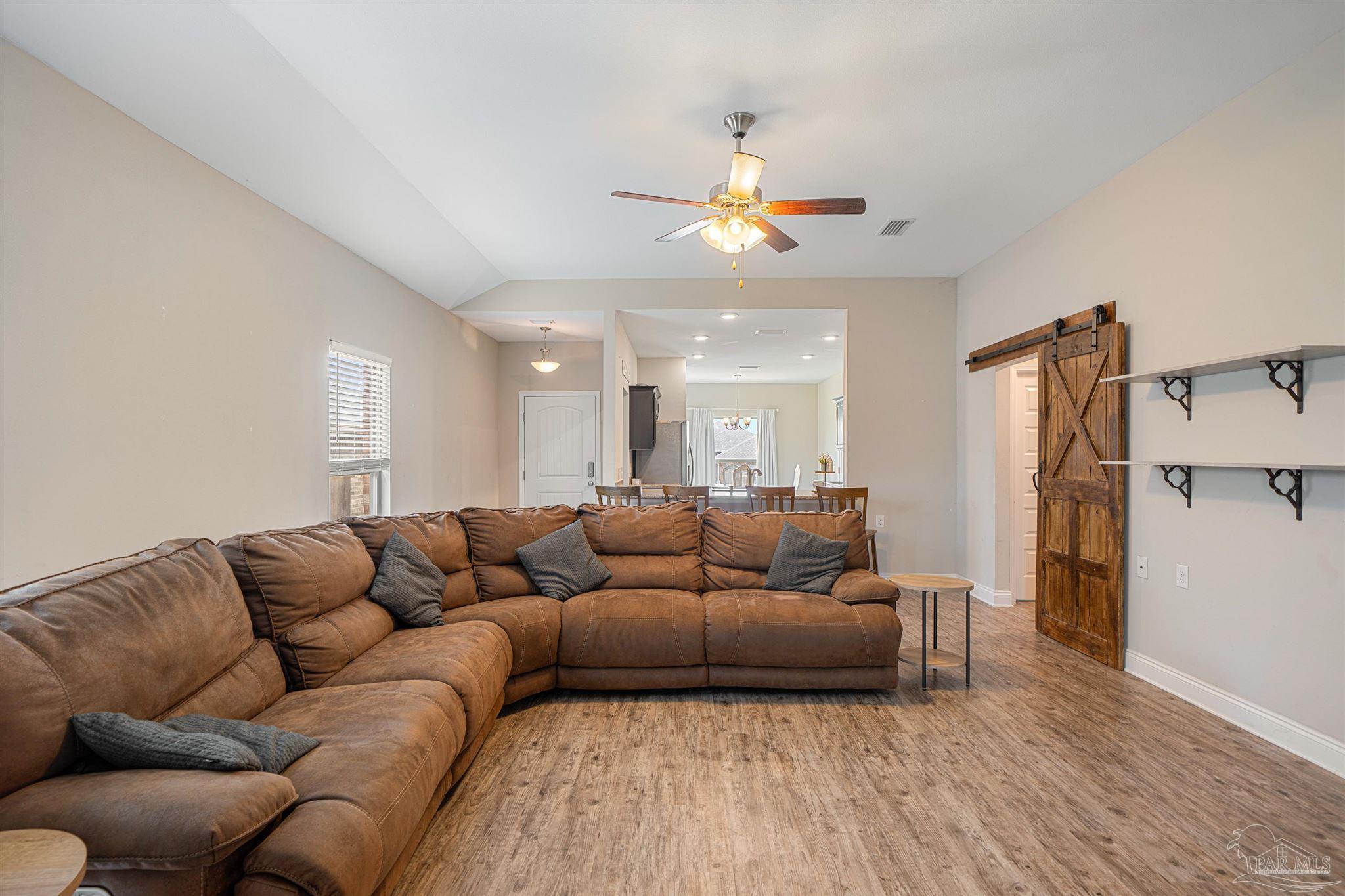 Discover Bon View! Tucked away on a quiet cul-de-sac, this nearly new 3 bedroom, 2 bath home is perfectly placed just minutes from Hwy 90 and I-10 in Milton. Step inside to an inviting open-concept layout where the living room flows into the kitchen. The kitchen is a true highlight with granite counters, shaker-style cabinetry, subway tile backsplash, stainless appliances, pantry storage, and recessed lighting. A large island with bar seating and a sunny dining nook make it both stylish and functional. Easy-care laminate floors extend through the main living areas. The primary suite is spacious and private, featuring a custom barn door entry to a spa-inspired bath with double sinks, soaking tub, glass-enclosed shower, and two walk-in closets. On the opposite side of the home, you’ll find two more comfortable bedrooms, an upgraded full bath, and a dedicated laundry room—also accessed by a sliding barn door for extra charm. Enjoy mornings or evenings on the covered back patio, while the two-car garage and included storm shutters add both convenience and peace of mind. With a modern design, thoughtful upgrades, and a prime location, this one is ready to welcome you home!