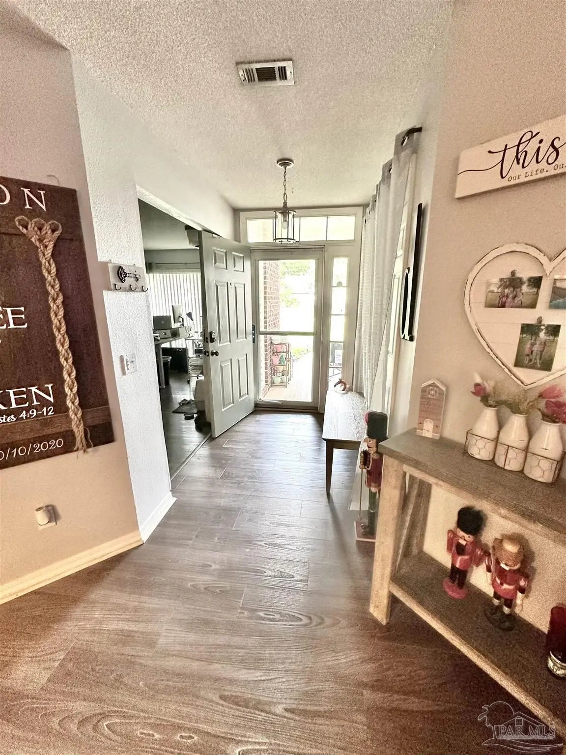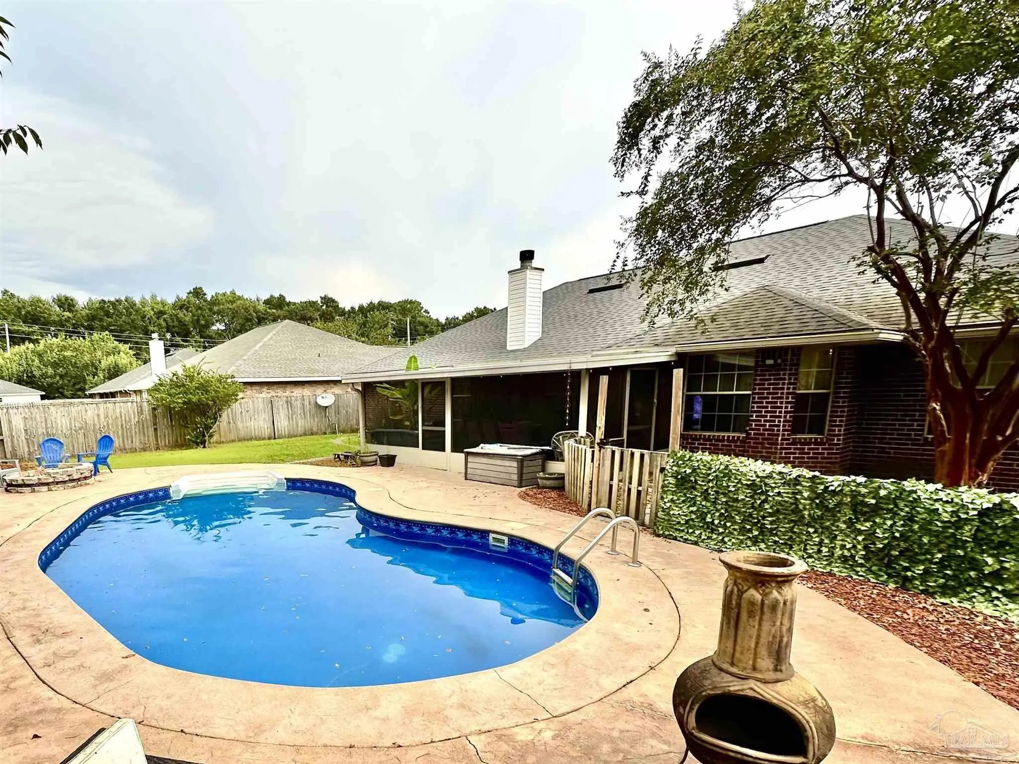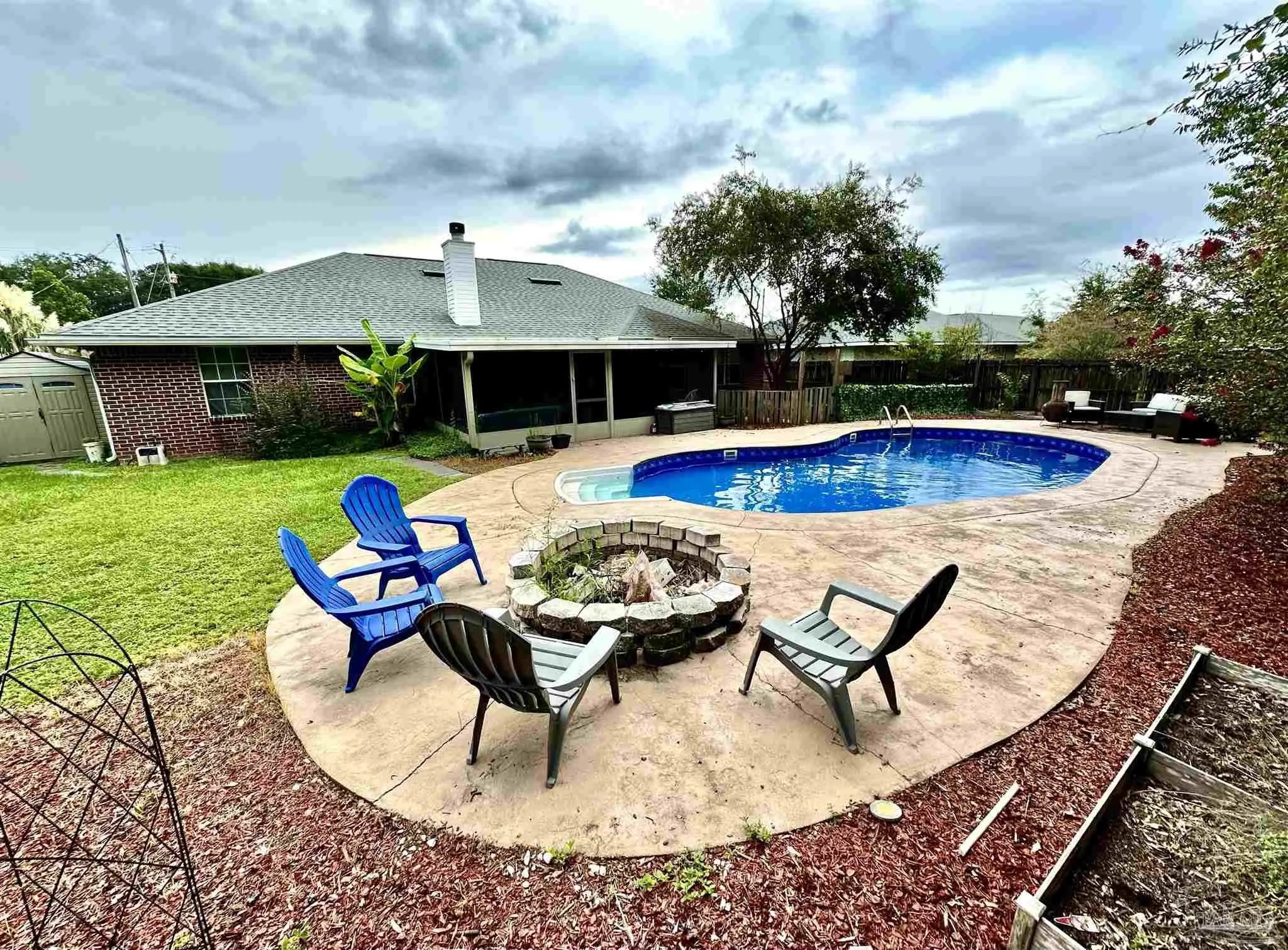 OPEN HOUSE W/SANTA!! FRIDAY DECEMBER 12TH 5:00 - 7:00 PM Beautiful Pool Home with custom cool-crete concrete patio!! Welcome to this well-maintained 4-bedroom, 2-bathroom home offering a perfect blend of comfort, style, and thoughtful updates. Inside, you’ll find durable vinyl and tile flooring throughout most of the home, a cozy wood-burning fireplace, and a spacious bonus room ideal for a home office, playroom, or flex space. The kitchen and breakfast area features charming shiplap accents, a breakfast bar, newer appliances, and gas availability, with an adjacent formal dining area for gatherings. Major upgrades include a new roof (March 2020), new AC unit (October 2020), and gutters installed around the entire home, providing peace of mind and added value. Step outside to your private backyard retreat, complete with a kidney-shaped saltwater pool (liner and pump replaced), a screened porch, an outdoor fire pit, and even a blueberry bush for seasonal enjoyment. There is even a Rain Bird sprinkler system that covers the front, side and back yard to help keep the yard looking great! The property also includes a 2-car garage and the benefit of no HOA restrictions. This home is move-in ready and offers a versatile layout for a variety of lifestyles. Don’t miss your opportunity to enjoy indoor comfort and outdoor living—all in one place.