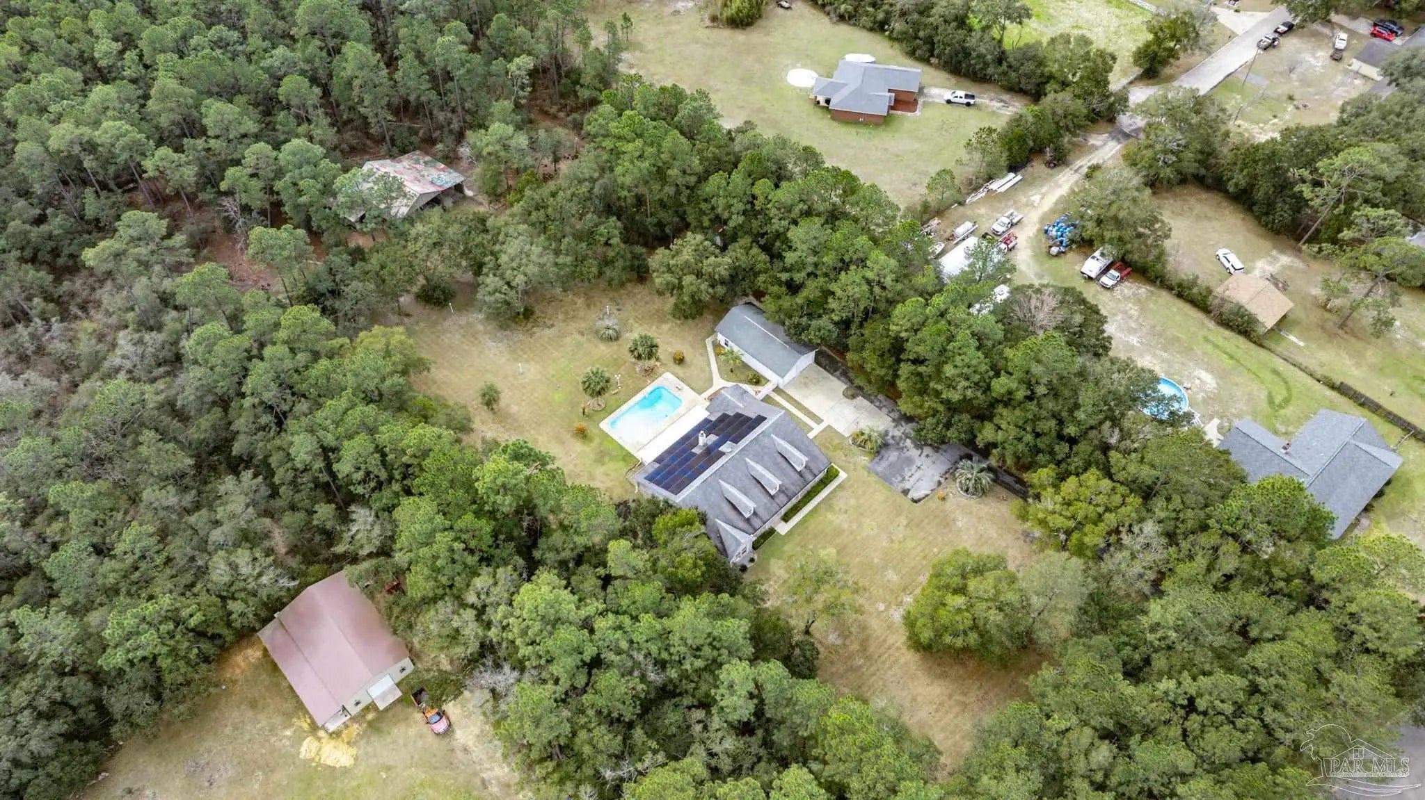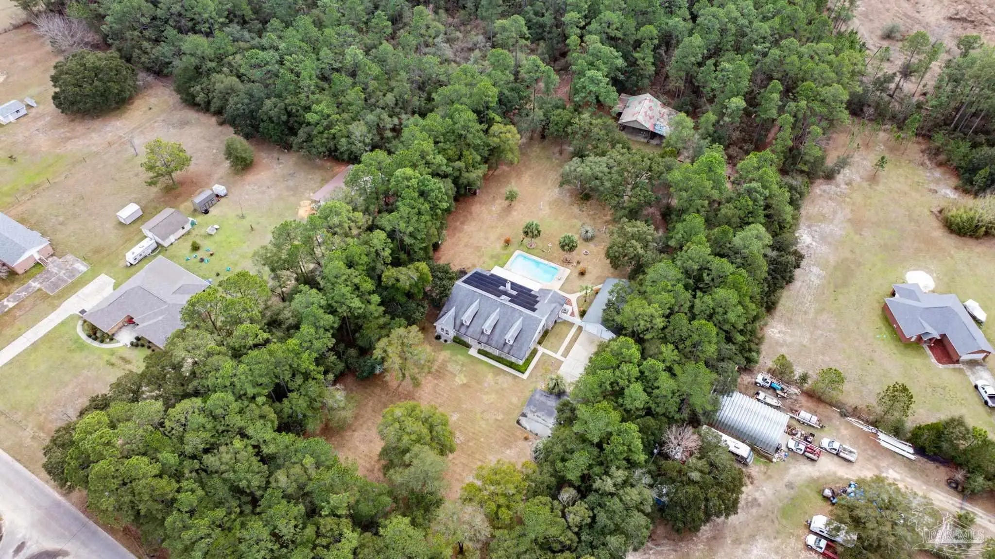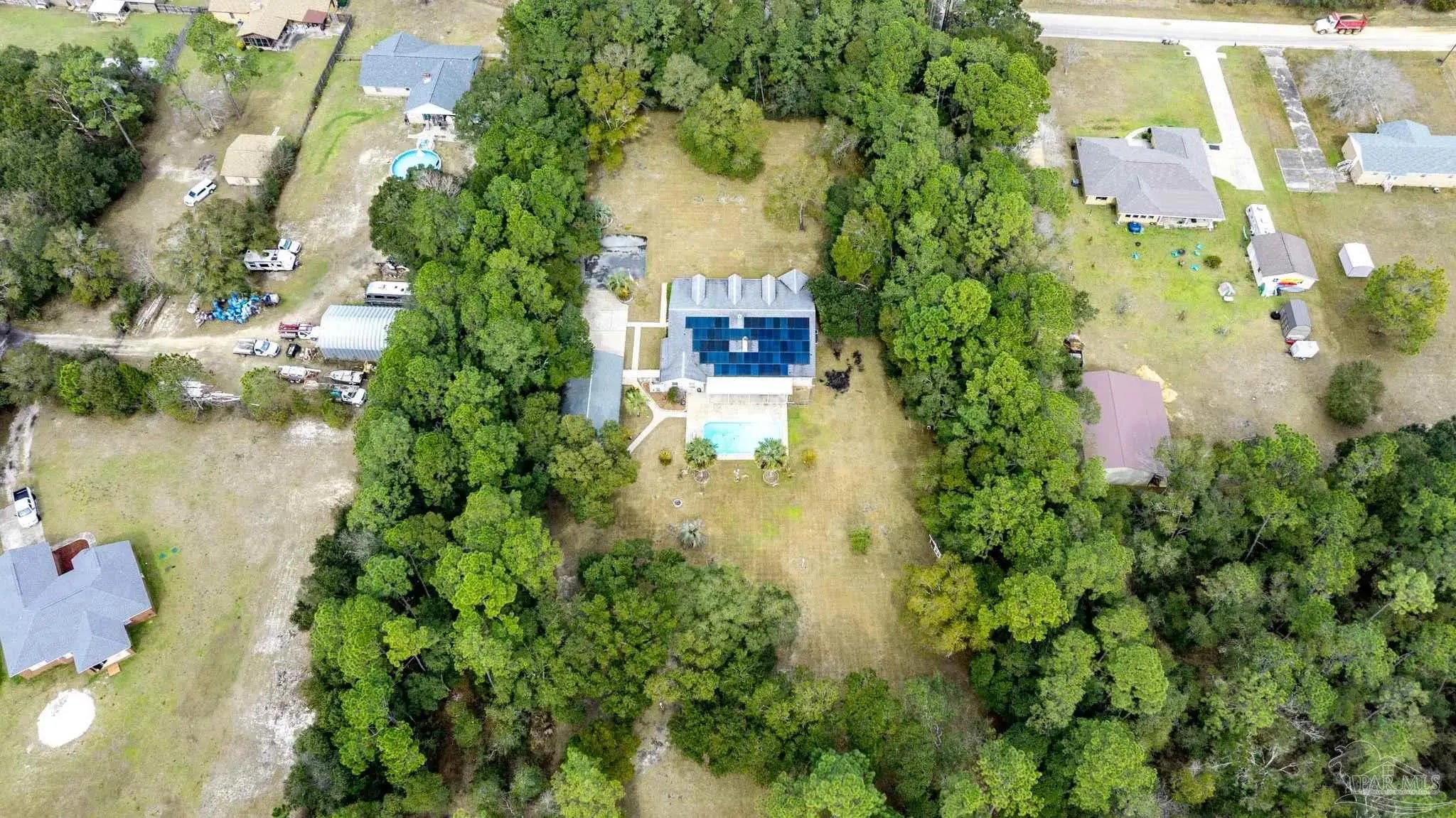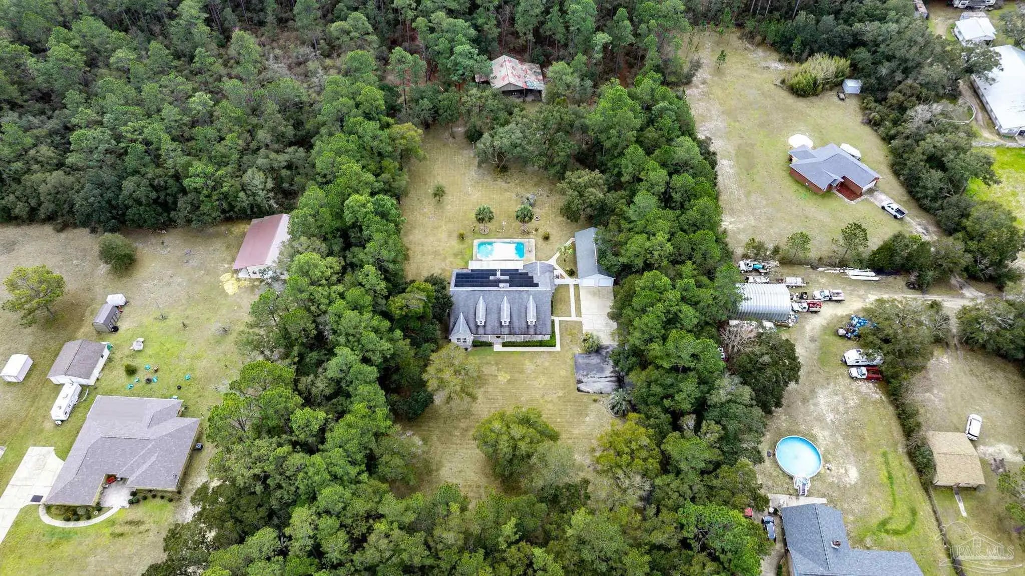 Sit on your wrap around porch and discover 4 acres of privacy in Florida, ideally located just 20 minutes from downtown, close to the interstate, and only 30 minutes to the beach. Surrounded by beautiful trees, this property offers seclusion without sacrificing convenience—with no HOA. Lots of freedom living here at this estate. Inside, the spacious layout is perfect for multi-generational living, featuring a generous primary suite plus two additional en-suites/Mother-in-law suites. The open kitchen has been updated with granite countertops, modern appliances, and refreshed bathrooms with new sinks, lighting, and fixtures. Stylish tile flooring runs throughout main entry area and wet areas, giving the home a fresh clean feel. Laminate in the living areas and carpet in bedrooms. Step outside to your own private oasis. A covered porch overlooks the sparkling pool and expansive backyard—ideal for relaxing or entertaining. A massive pole barn with oversized doors offers endless possibilities: storage, detached 2-car garage, workshop, or recreational space, complete with RV hookup. There’s also a separate climate-controlled finished office/gym/storage on the back of the garage, a luxury chicken coop with caged run, and plenty of room for boats, RVs, and toys. This property extends about 50 yards beyond the back fence, providing even more space to enjoy. Solar panels keep energy costs extremely low (with option to pay off and remove if preferred. quotes in hand), adding efficiency and long-term savings. All this, plus the convenience of being minutes from Navy Federal Credit Union and only a short drive to the Gulf Coast beaches, makes this estate the perfect blend of privacy, function, and lifestyle. New Arcitectural Shingle roof installed prior to closing with applicable offer.