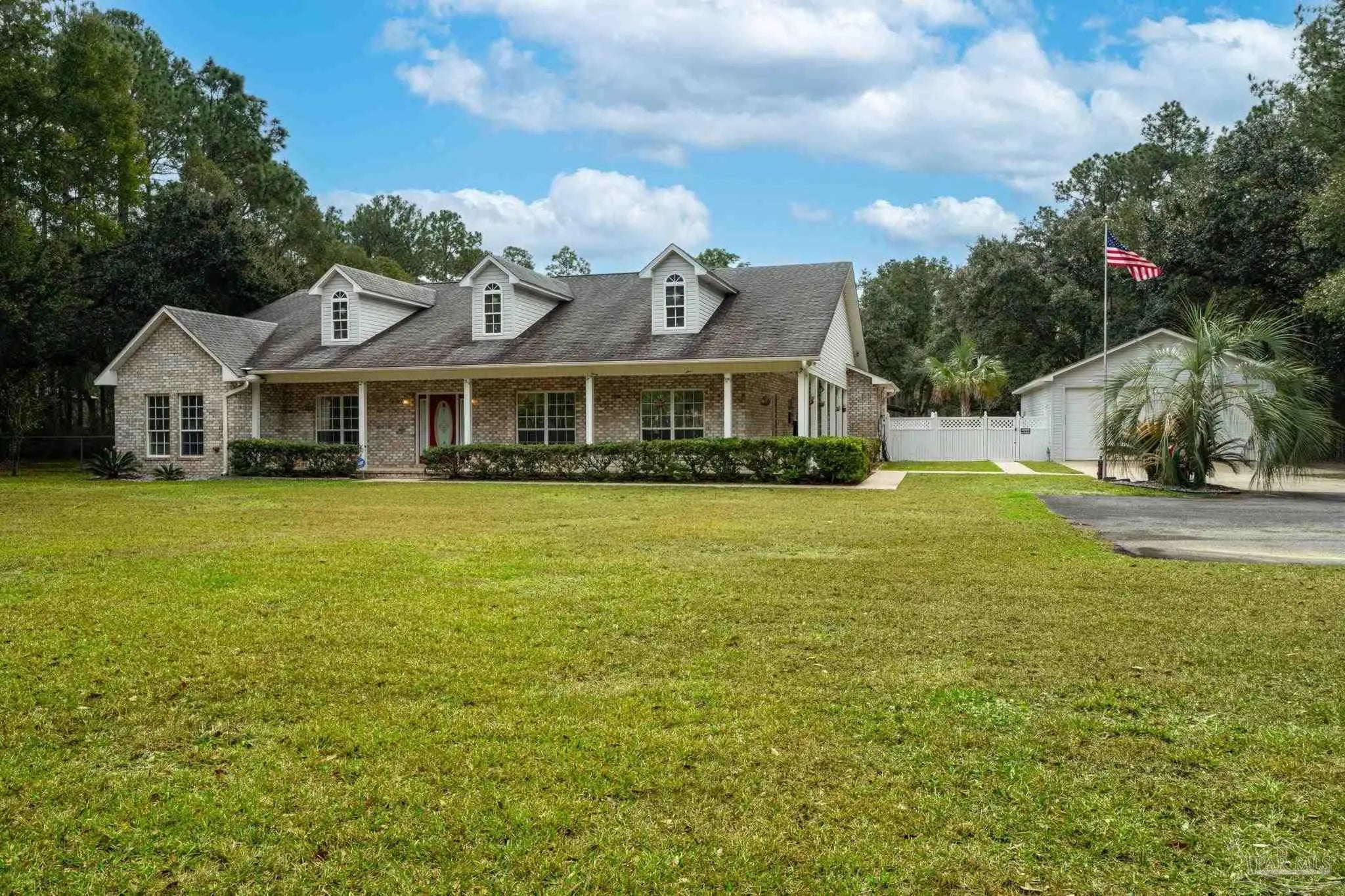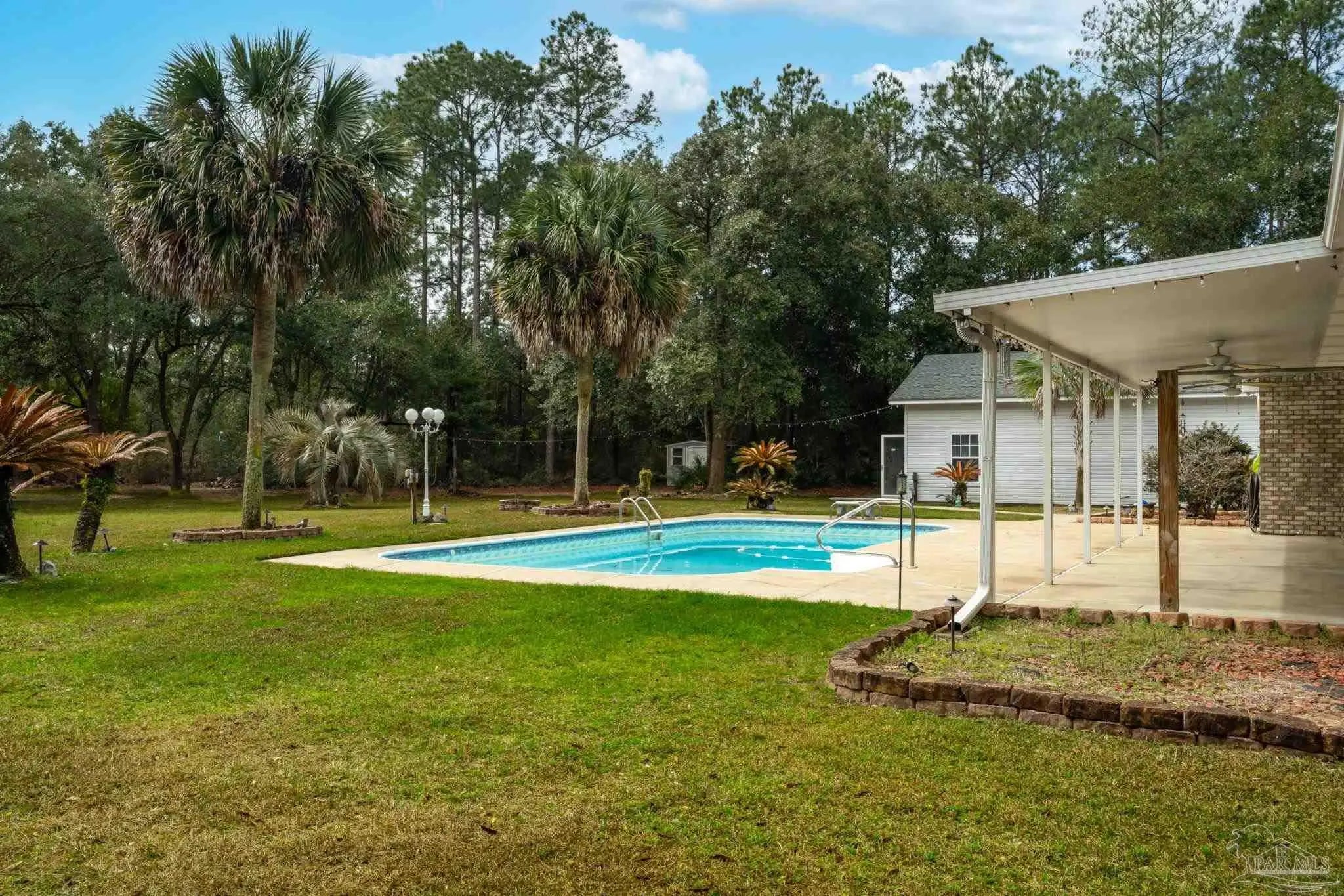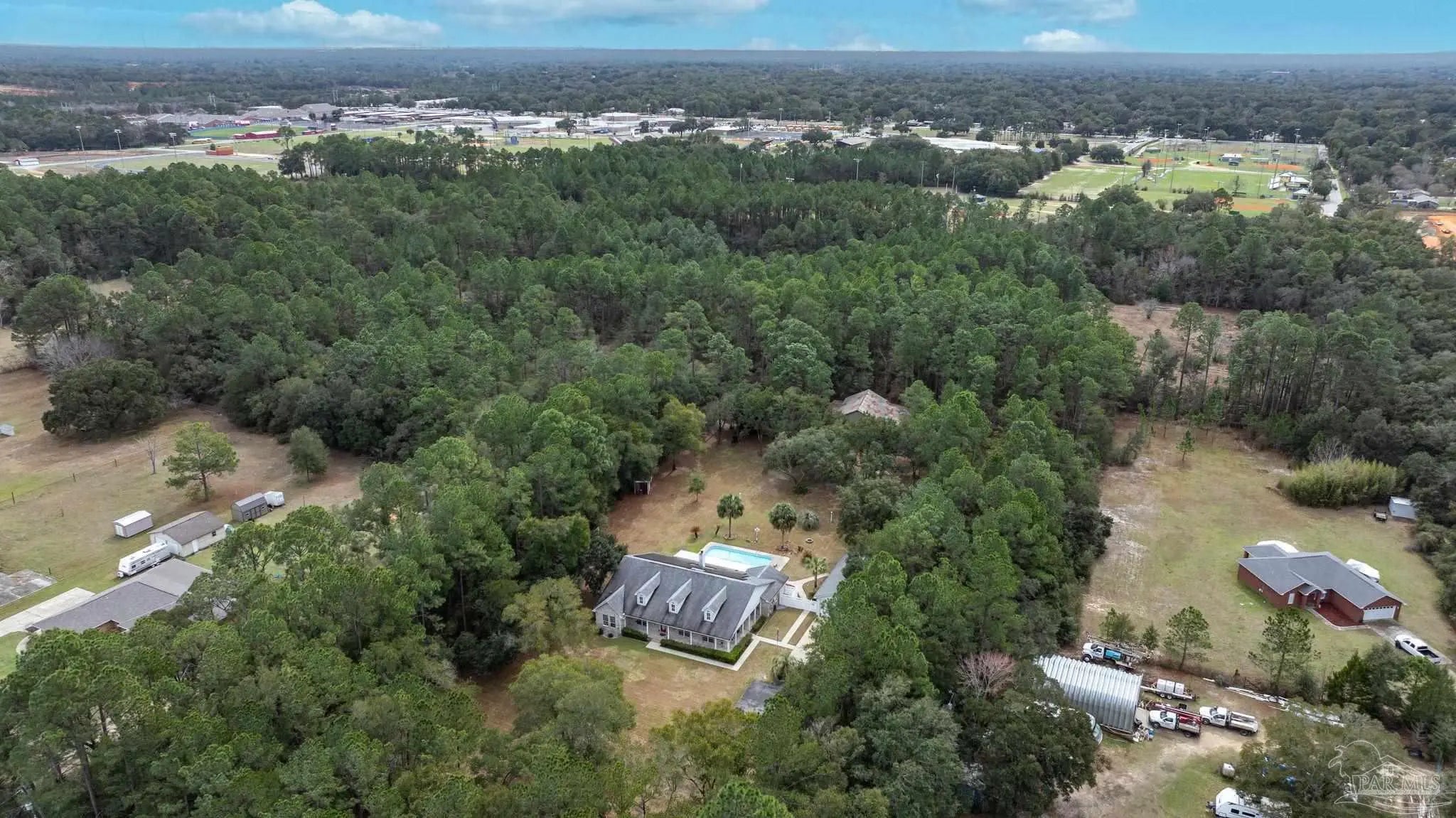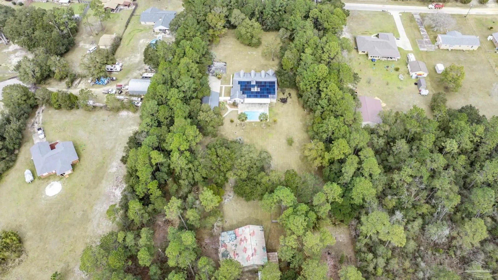 Sit on your wrap around porch and discover 4 acres of privacy in Florida, ideally located just 20 minutes from downtown, close to the interstate, and only 30 minutes to the beach. Surrounded by beautiful trees, this property offers seclusion without sacrificing convenience—with no HOA. Lots of freedom living here at this estate. Inside, the spacious layout is perfect for multi-generational living, featuring a generous primary suite plus two additional en-suites/Mother-in-law suites. The open kitchen has been updated with granite countertops, modern appliances, and refreshed bathrooms with new sinks, lighting, and fixtures. Stylish tile flooring runs throughout main entry area and wet areas, giving the home a fresh clean feel. Laminate in the living areas and carpet in bedrooms. Step outside to your own private oasis. A covered porch overlooks the sparkling pool and expansive backyard—ideal for relaxing or entertaining. A massive pole barn with oversized doors offers endless possibilities: storage, detached 2-car garage, workshop, or recreational space, complete with RV hookup. There’s also a separate climate-controlled finished office/gym/storage on the back of the garage, a luxury chicken coop with caged run, and plenty of room for boats, RVs, and toys. This property extends about 50 yards beyond the back fence, providing even more space to enjoy. Solar panels keep energy costs extremely low (with option to pay off and remove if preferred. quotes in hand), adding efficiency and long-term savings. All this, plus the convenience of being minutes from Navy Federal Credit Union and only a short drive to the Gulf Coast beaches, makes this estate the perfect blend of privacy, function, and lifestyle. New Arcitectural Shingle roof installed prior to closing with applicable offer.