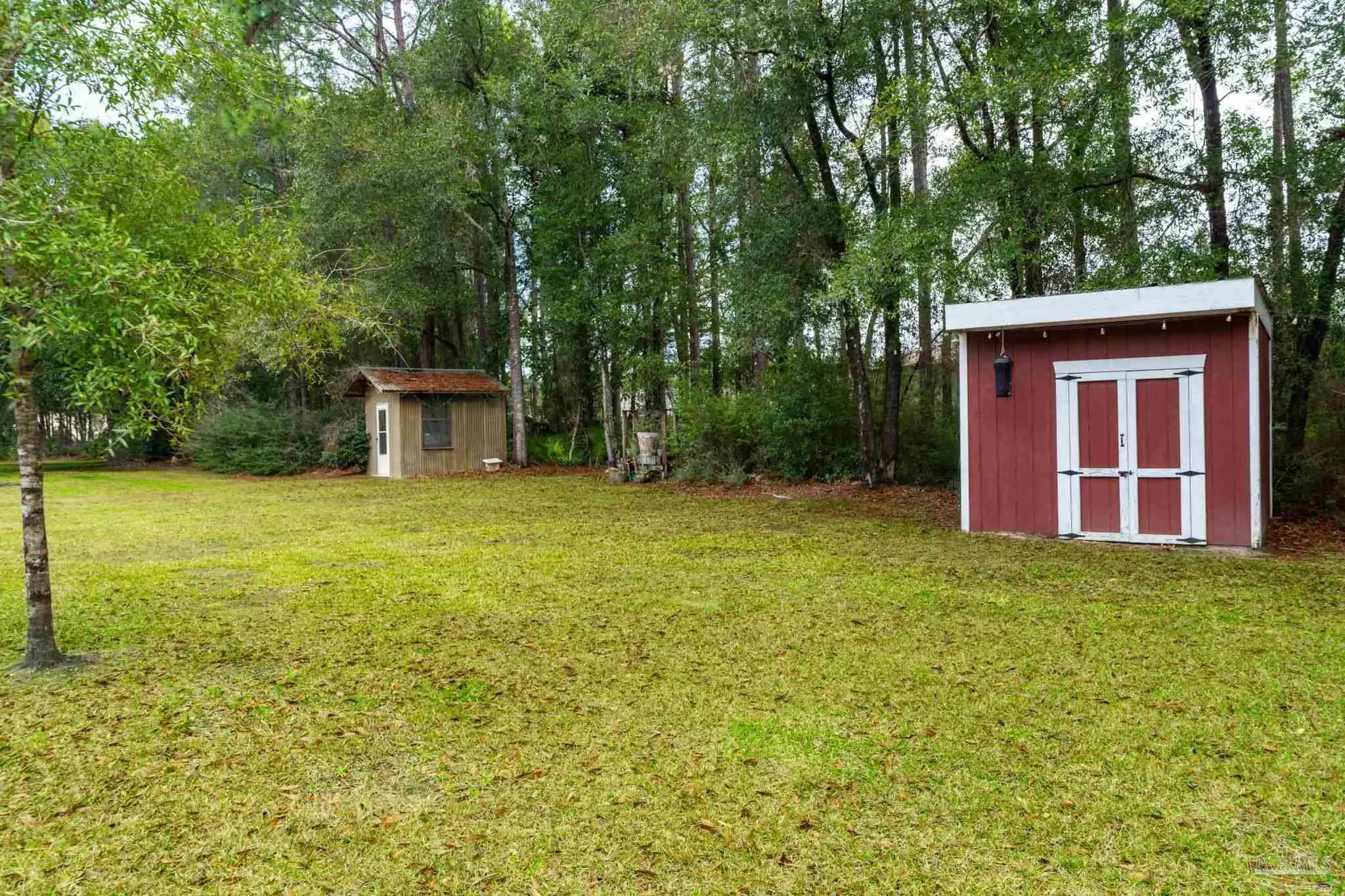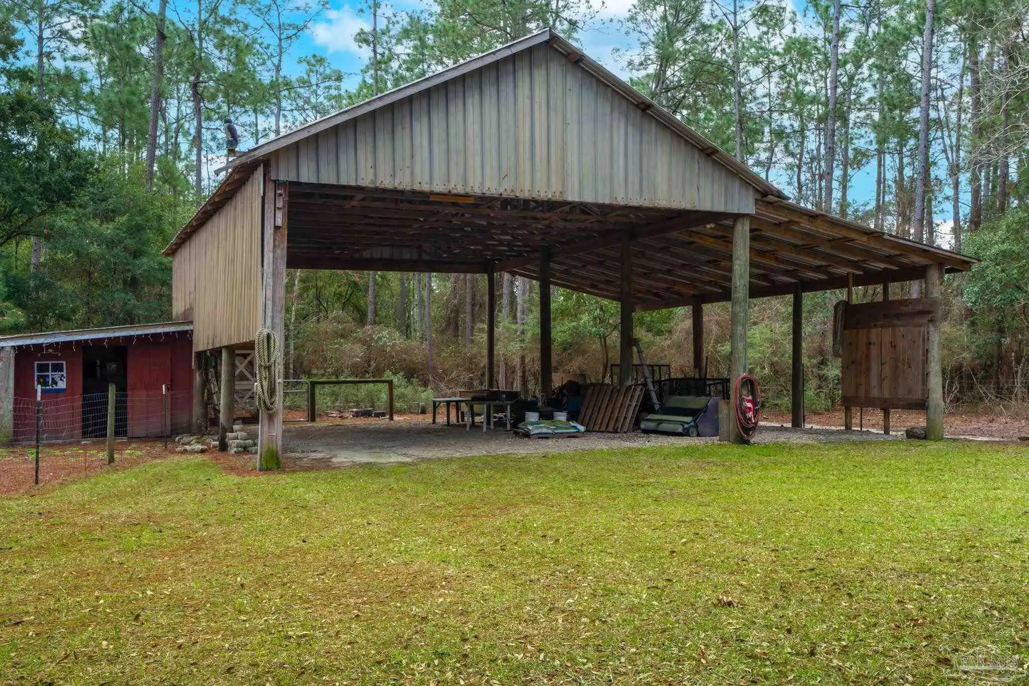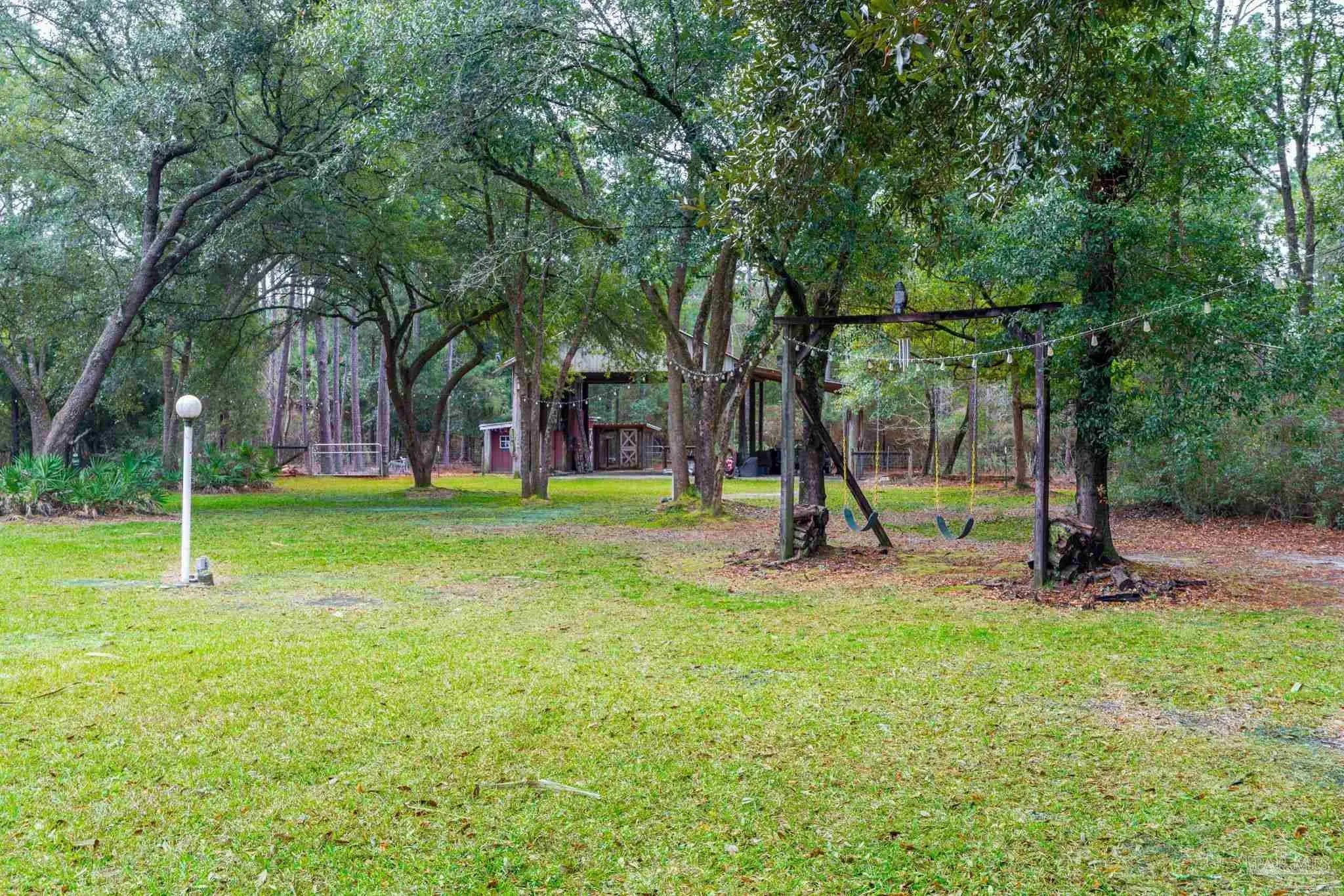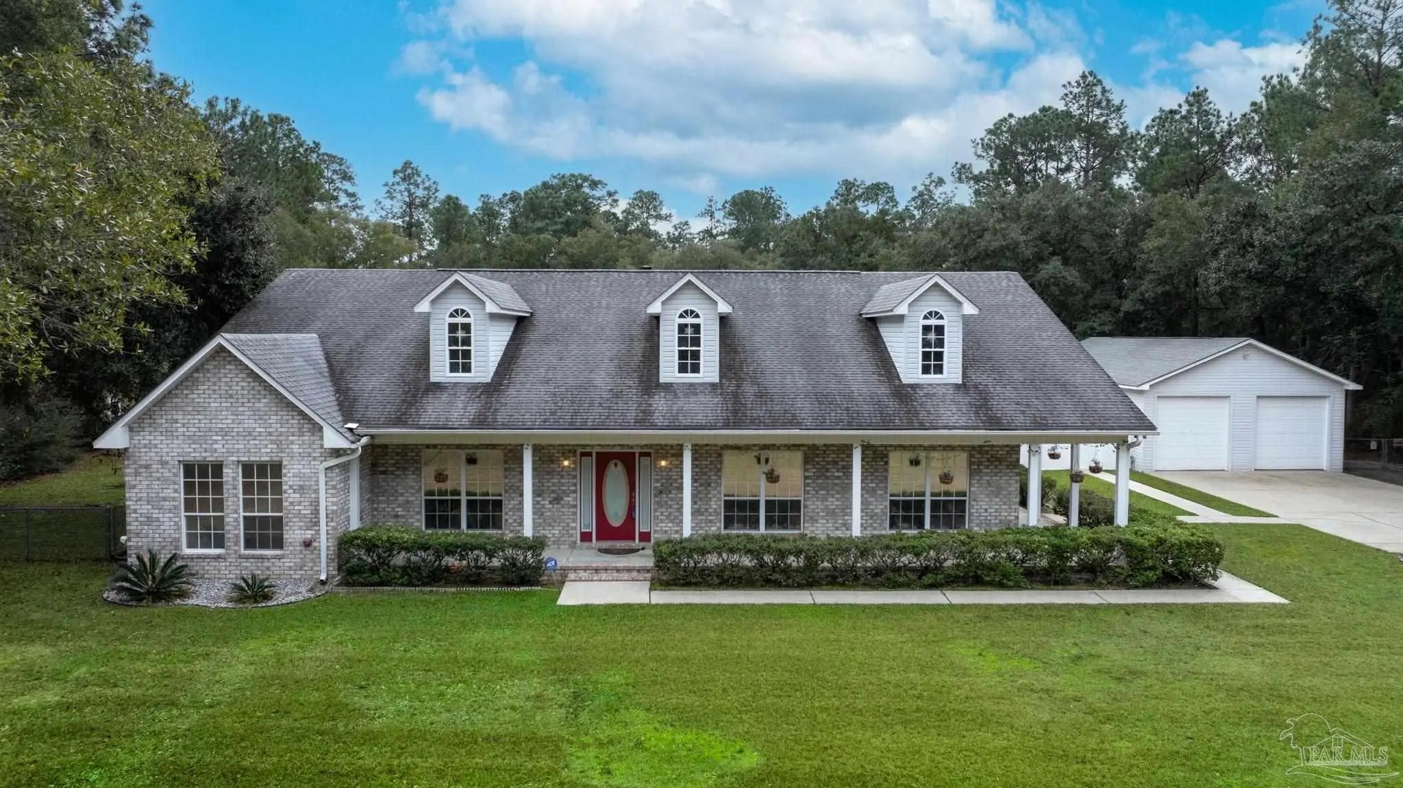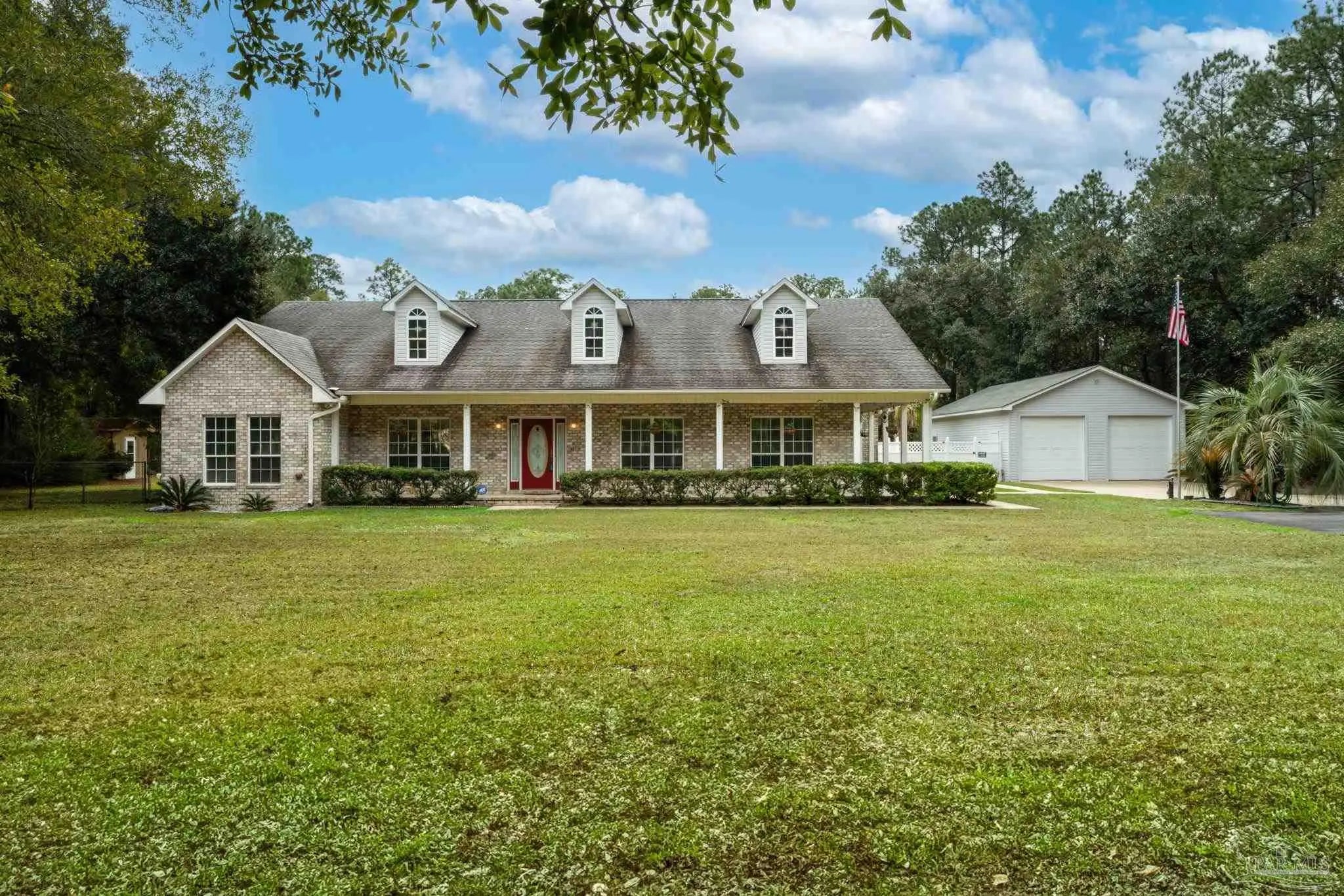 Sit on your wrap around porch and discover 4 acres of privacy in Florida, ideally located just 20 minutes from downtown, close to the interstate, and only 30 minutes to the beach. Surrounded by beautiful trees, this property offers seclusion without sacrificing convenience—with no HOA. Lots of freedom living here at this estate. Inside, the spacious layout is perfect for multi-generational living, featuring a generous primary suite plus two additional en-suites/Mother-in-law suites. The open kitchen has been updated with granite countertops, modern appliances, and refreshed bathrooms with new sinks, lighting, and fixtures. Stylish tile flooring runs throughout main entry area and wet areas, giving the home a fresh clean feel. Laminate in the living areas and carpet in bedrooms. Step outside to your own private oasis. A covered porch overlooks the sparkling pool and expansive backyard—ideal for relaxing or entertaining. A massive pole barn with oversized doors offers endless possibilities: storage, detached 2-car garage, workshop, or recreational space, complete with RV hookup. There’s also a separate climate-controlled finished office/gym/storage on the back of the garage, a luxury chicken coop with caged run, and plenty of room for boats, RVs, and toys. This property extends about 50 yards beyond the back fence, providing even more space to enjoy. Solar panels keep energy costs extremely low (with option to pay off and remove if preferred. quotes in hand), adding efficiency and long-term savings. All this, plus the convenience of being minutes from Navy Federal Credit Union and only a short drive to the Gulf Coast beaches, makes this estate the perfect blend of privacy, function, and lifestyle. New Arcitectural Shingle roof installed prior to closing with applicable offer.