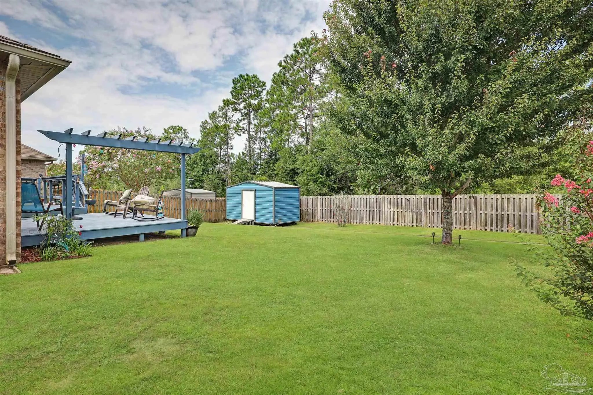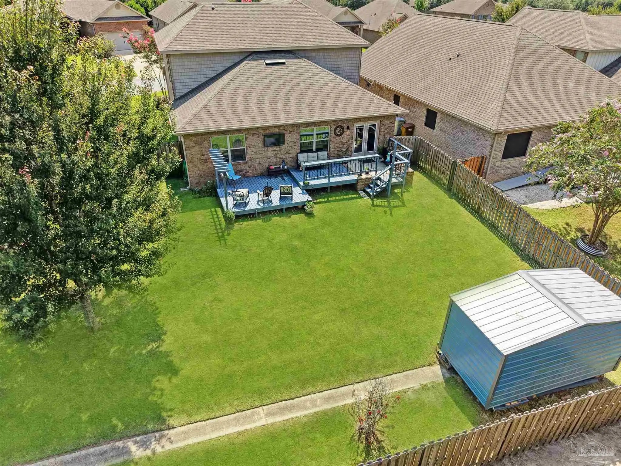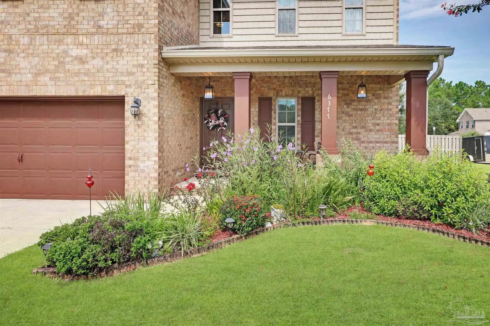 Welcome to this beautifully maintained 2 story home in the heart of Pace! Nestled at the end of a peaceful cul-de-sac, 6377 Ladera Trail is a stunning two-story brick residence that blends timeless craftsmanship with modern elegance. From the moment you arrive, the beautifully landscaped lawn framed by mature crepe myrtles and a welcoming front porch sets the stage for the comfort and sophistication that awaits inside. The interior is designed with both style and function in mind, offering an open concept that seamlessly connects the kitchen, dining, and living areas. Rich wood-style floors flow throughout the main level, complementing crown molding and designer lighting. The kitchen is a true centerpiece, featuring dark wood cabinetry, sleek granite countertops, a decorative tile backsplash, and a large center island with seating. Stainless steel and black appliances complete the space, making it as practical as it is beautiful. The master suite provides a private retreat with abundant natural light and a spa-like ensuite boasting dual granite vanities, a deep soaking tub, and a spacious walk-in closet. Upstairs, versatile living continues with additional bedrooms and a stylish flex space enhanced by custom finishes, including a shiplap accent wall, perfect for a media room, home office, or playroom. Step outside to discover an expansive backyard designed for both relaxation and entertaining. A large custom deck extends the living space, while a pergola-covered lounge area creates the perfect setting for evenings under the stars. With no rear neighbors and serene woods as your backdrop, this outdoor space offers privacy rarely found in a neighborhood setting. This exceptional property combines luxury and comfort with an ideal location close to top-rated schools, shopping, dining, and NAS Whiting Field. Elegant yet inviting, it presents a rare opportunity to own a home where every detail is crafted for a refined and easy lifestyle.