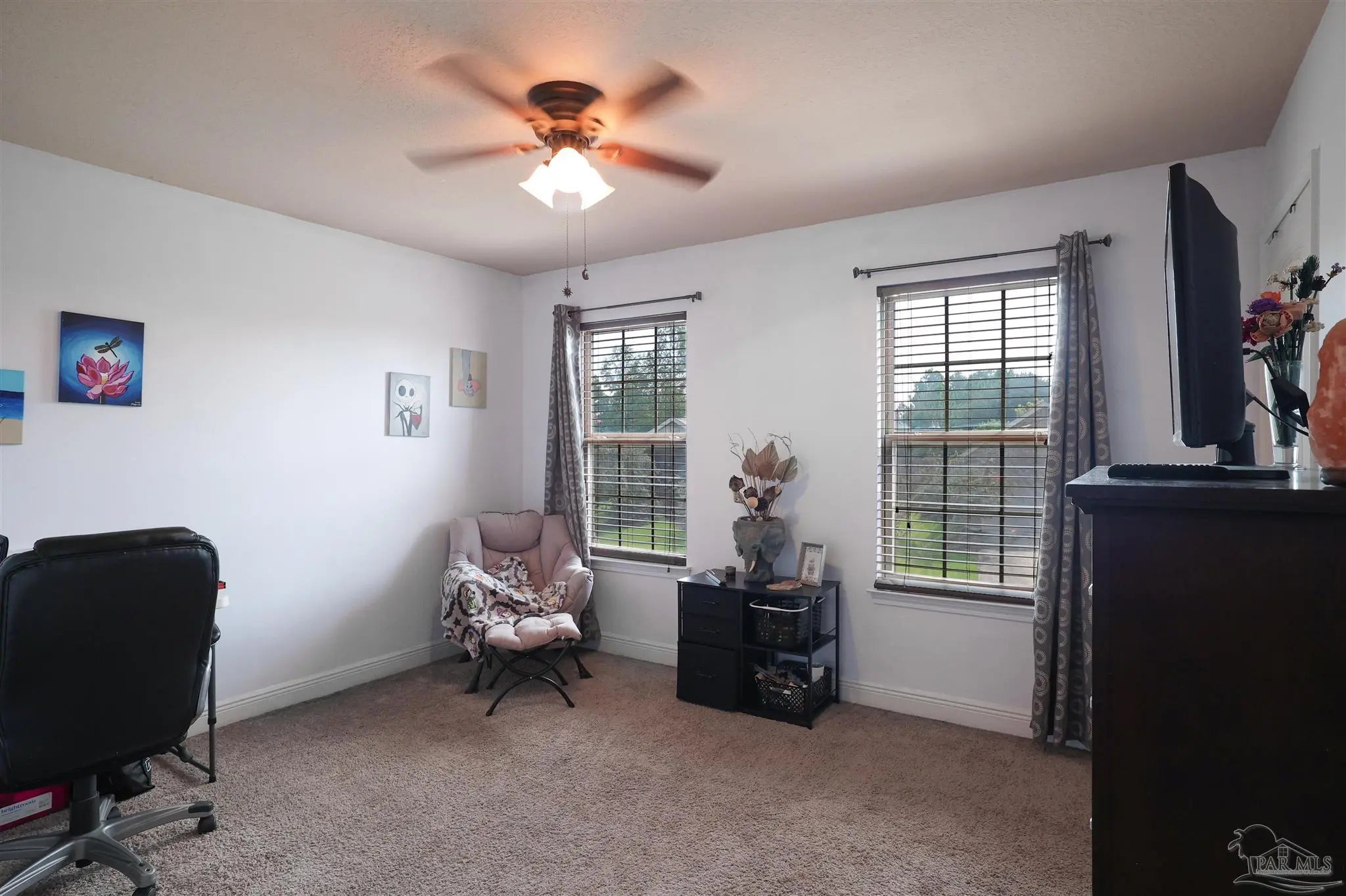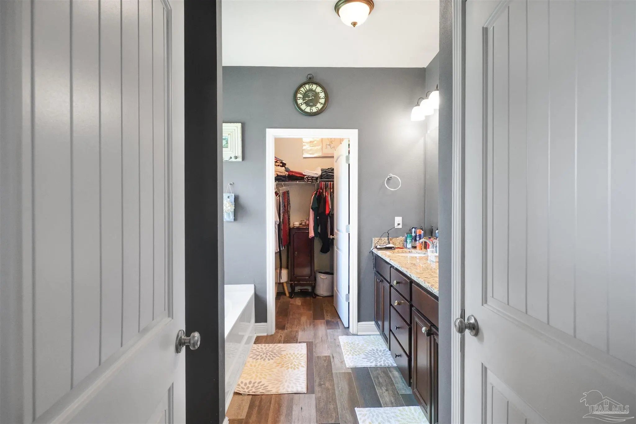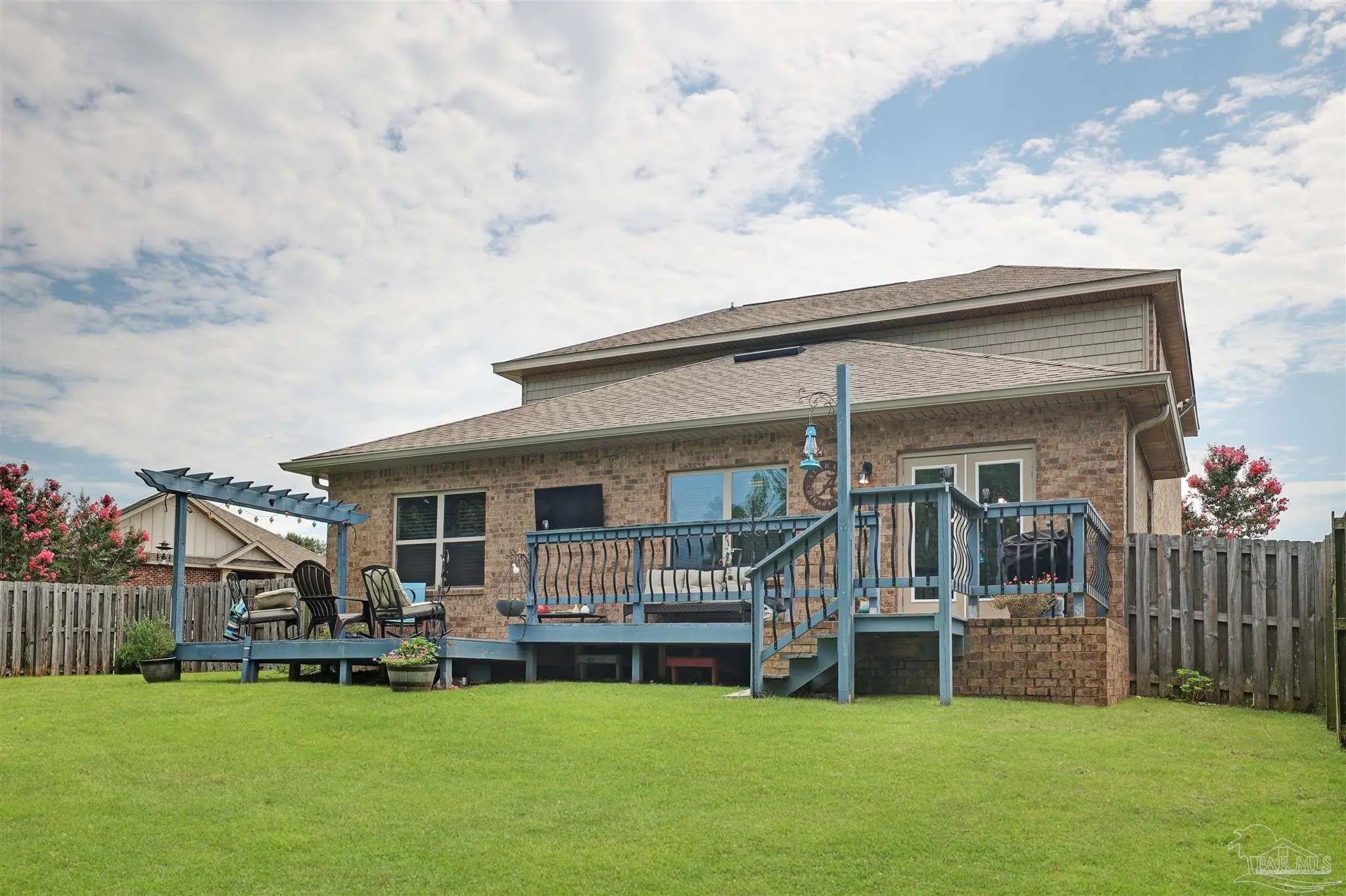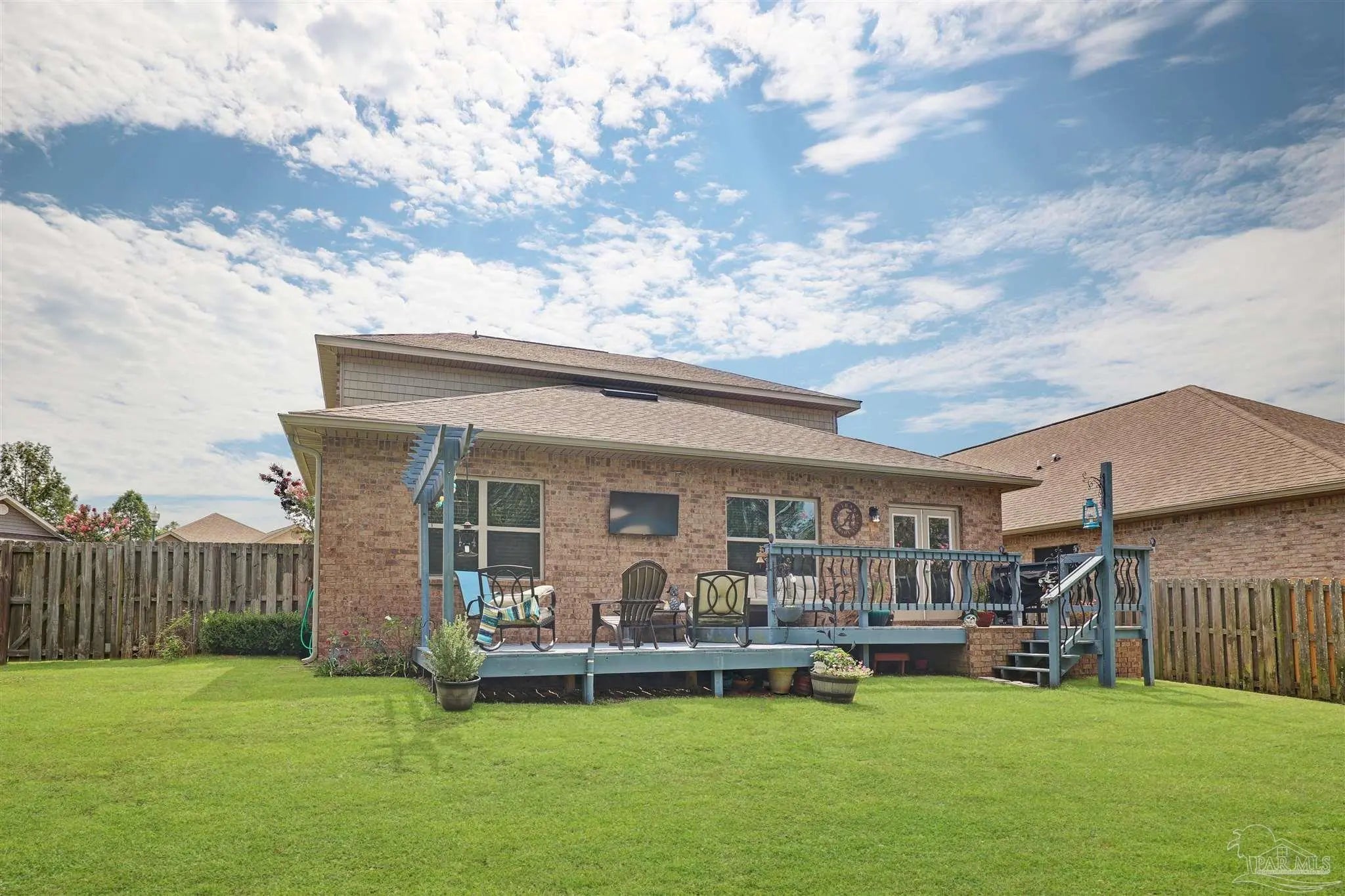 Welcome to this beautifully maintained 2 story home in the heart of Pace! Nestled at the end of a peaceful cul-de-sac, 6377 Ladera Trail is a stunning two-story brick residence that blends timeless craftsmanship with modern elegance. From the moment you arrive, the beautifully landscaped lawn framed by mature crepe myrtles and a welcoming front porch sets the stage for the comfort and sophistication that awaits inside. The interior is designed with both style and function in mind, offering an open concept that seamlessly connects the kitchen, dining, and living areas. Rich wood-style floors flow throughout the main level, complementing crown molding and designer lighting. The kitchen is a true centerpiece, featuring dark wood cabinetry, sleek granite countertops, a decorative tile backsplash, and a large center island with seating. Stainless steel and black appliances complete the space, making it as practical as it is beautiful. The master suite provides a private retreat with abundant natural light and a spa-like ensuite boasting dual granite vanities, a deep soaking tub, and a spacious walk-in closet. Upstairs, versatile living continues with additional bedrooms and a stylish flex space enhanced by custom finishes, including a shiplap accent wall, perfect for a media room, home office, or playroom. Step outside to discover an expansive backyard designed for both relaxation and entertaining. A large custom deck extends the living space, while a pergola-covered lounge area creates the perfect setting for evenings under the stars. With no rear neighbors and serene woods as your backdrop, this outdoor space offers privacy rarely found in a neighborhood setting. This exceptional property combines luxury and comfort with an ideal location close to top-rated schools, shopping, dining, and NAS Whiting Field. Elegant yet inviting, it presents a rare opportunity to own a home where every detail is crafted for a refined and easy lifestyle.