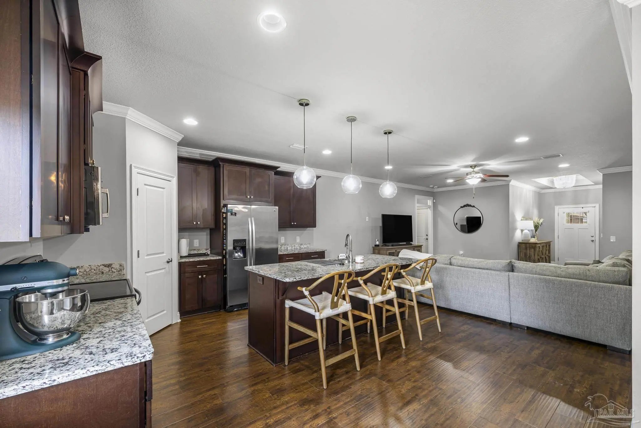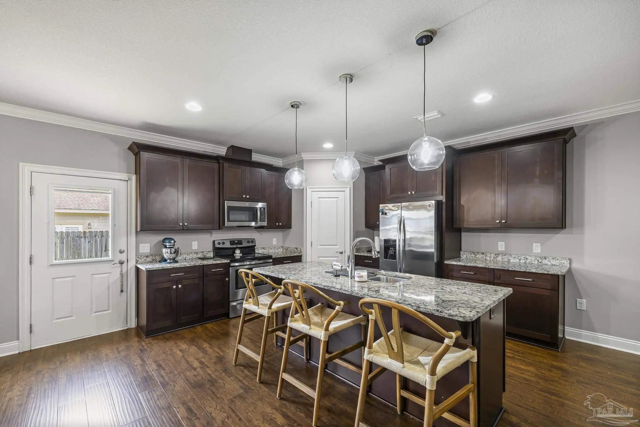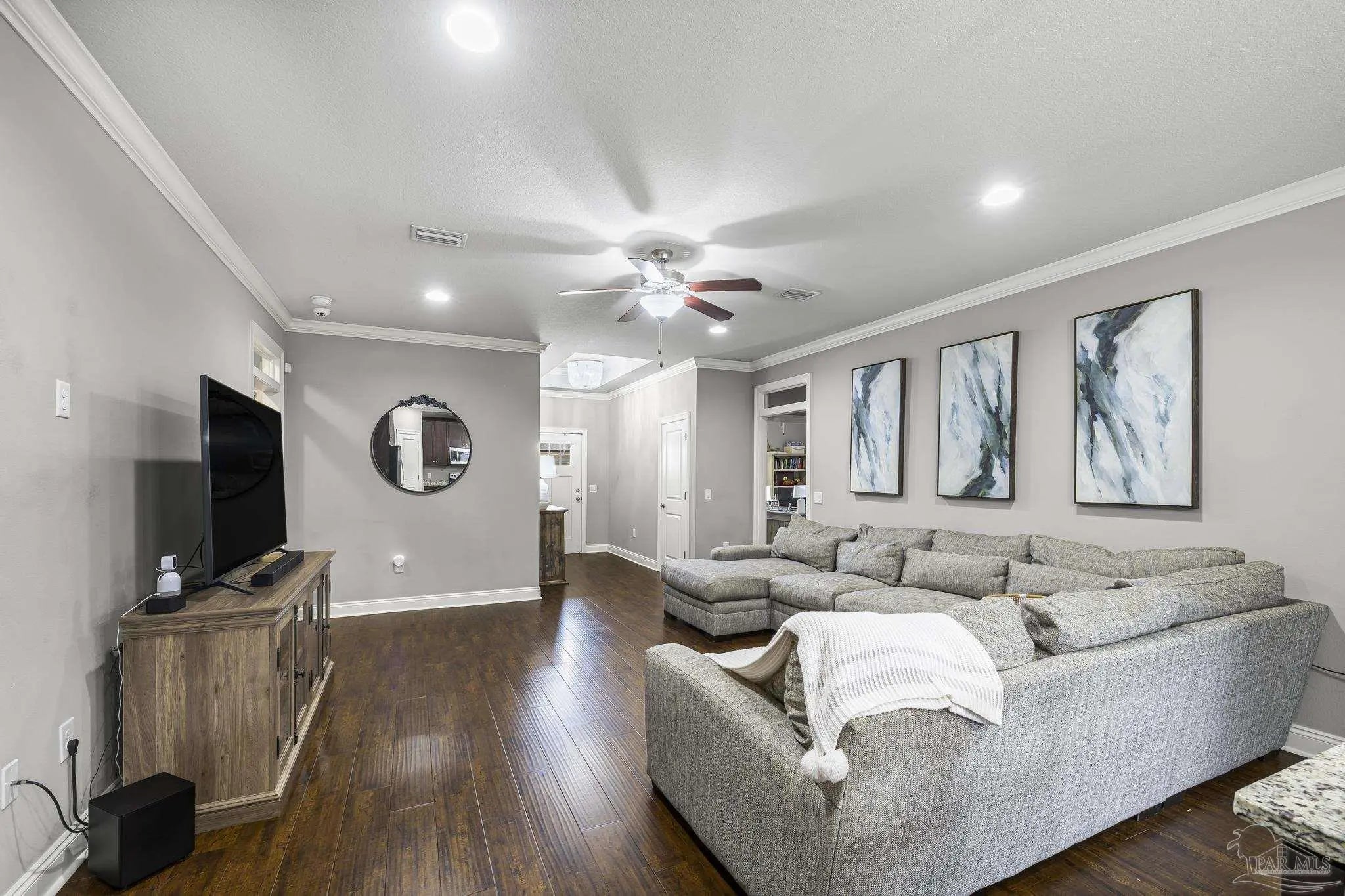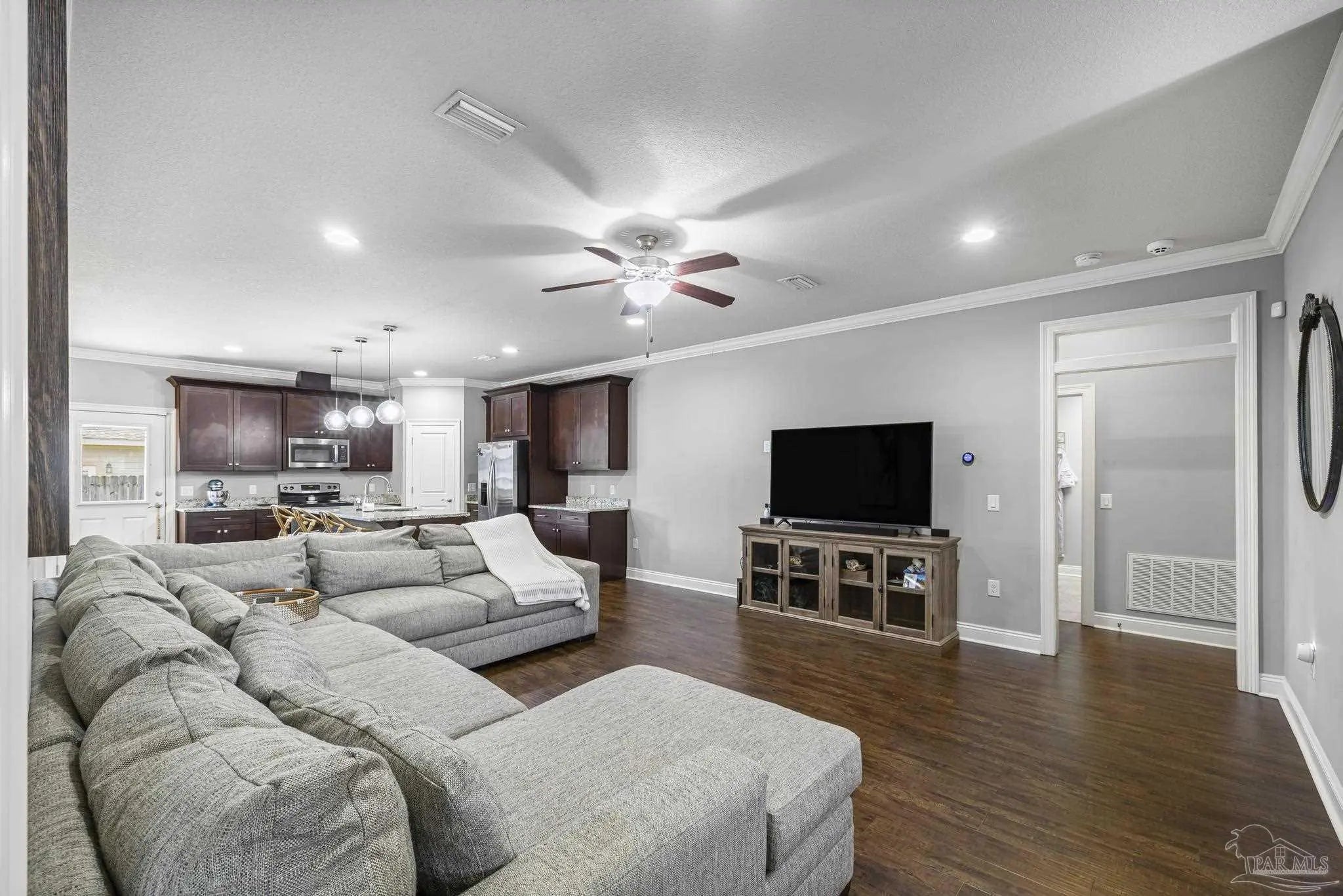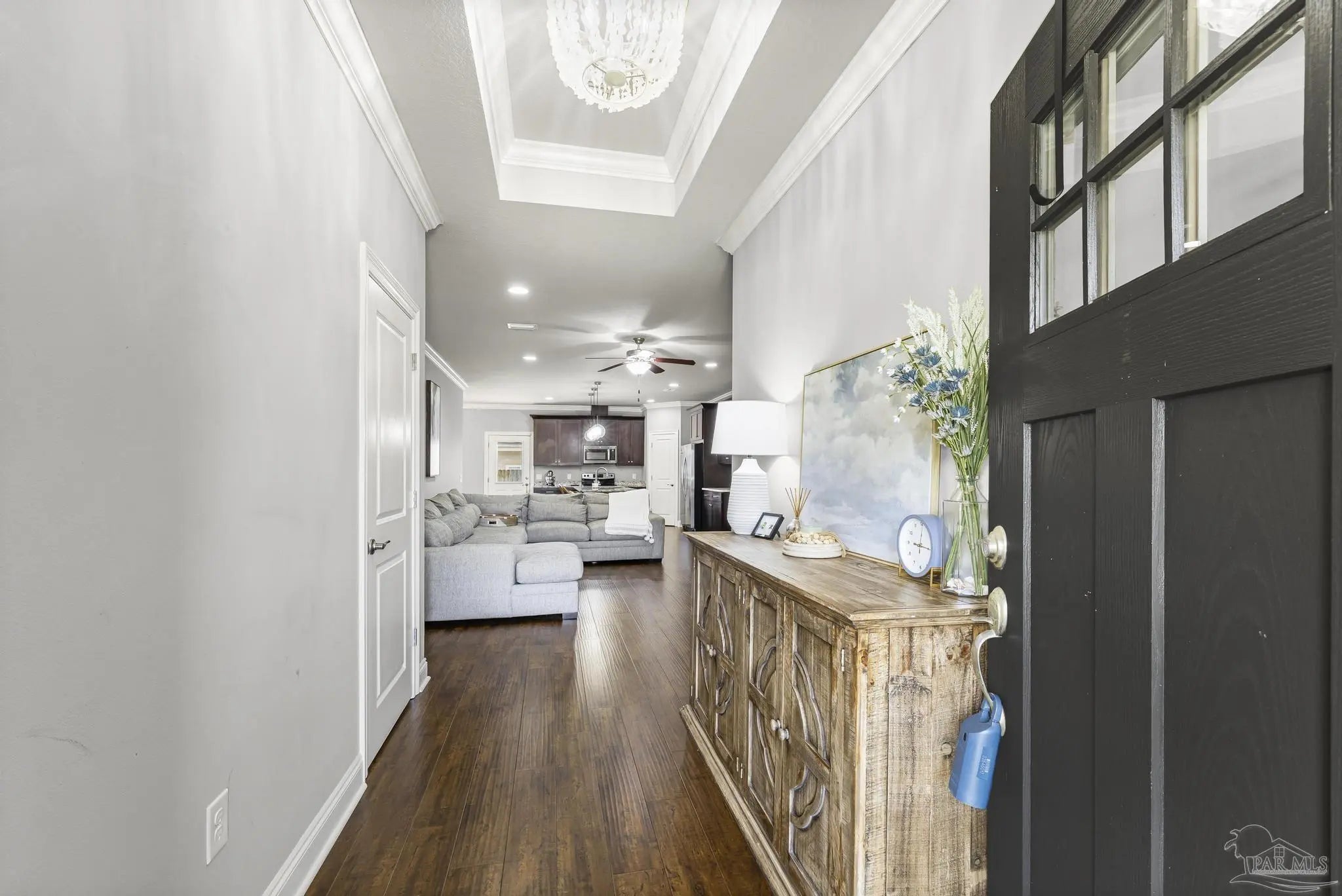 VA ASSUMABLE LOAN at an incredible interest rate! Rare opportunity for qualified VA buyers to assume seller's existing loan and benefit from today's hard-to-find low rate. VA eligibility required. Buyer to verify all terms with lender. Move-in ready 3 bedroom, 2 bathroom single-family home with 1623 sq ft of living space. Built in 2015, this property offers No HOA and sits on a quiet street in Navarre. Inside you'll find an open floor plan with wood laminate flooring in the main living areas, neutral tile in the wet zones, and carpet in the bedrooms. The primary suite features a tray ceiling, custom walk-in closet with built-ins, and a private bath. Crown molding, wide baseboards, transom windows, and upgraded doors and hardware add detail throughout. The kitchen features granite countertops, stainless steel appliances, breakfast bar seating along with a separate dining room, plenty of cabinet space and a pantry. The exterior is clad in durable Hardie board with an architectural shingle roof. Outdoor features include a covered front porch, fenced backyard, sprinkler system, and two-car garage. Located in East Navarre close to Hurlburt Field, Eglin AFB, shopping, schools, dining, and the white sand beaches of Navarre.
