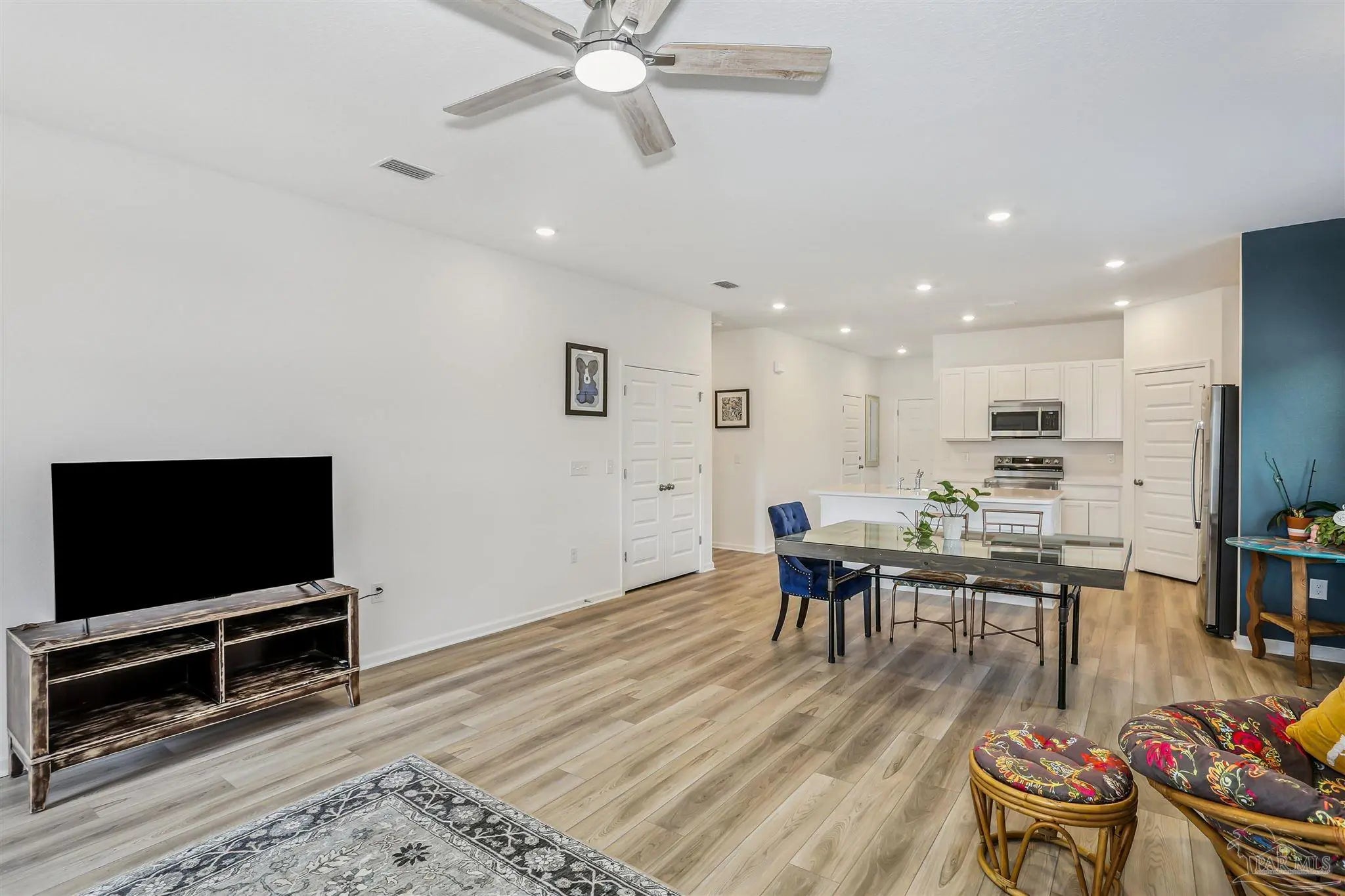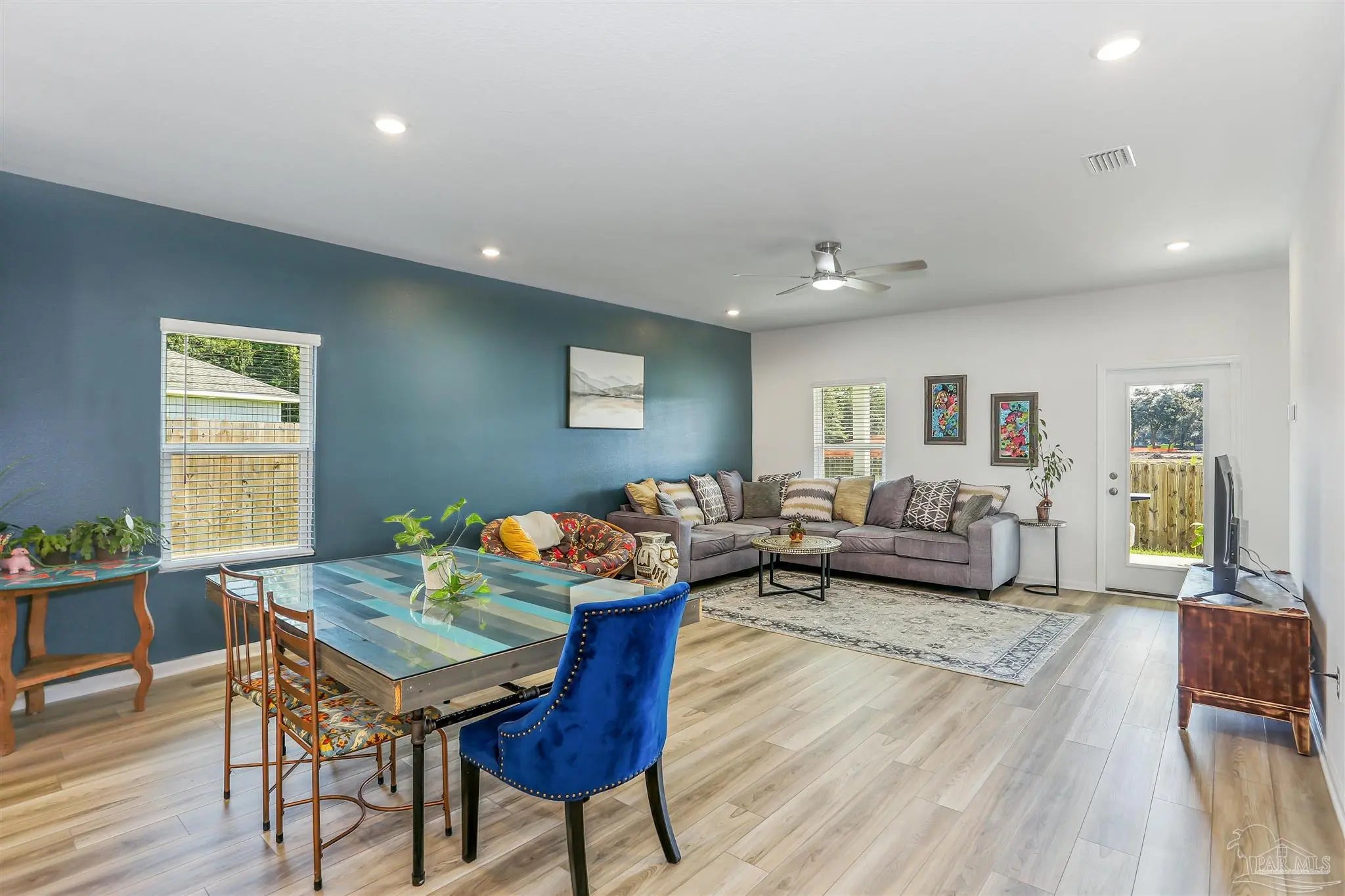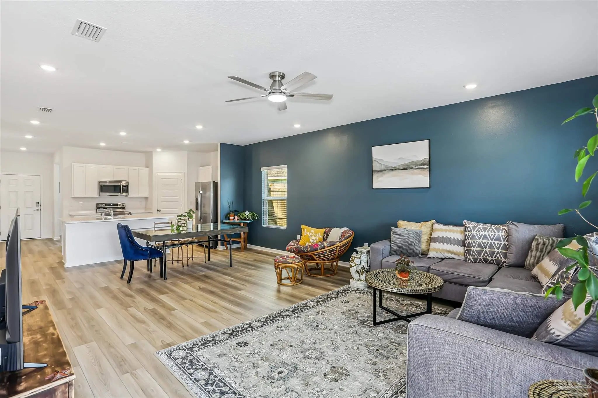Welcome to this beautifully maintained traditional home in the sought-after Sagewood community. With its inviting curb appeal, crisp white exterior, and thoughtfully landscaped front yard, this home offers timeless style paired with modern comforts. Inside, you’ll find a bright and open floor plan featuring a spacious living area with stylish accent walls, abundant natural light, and durable wood-look flooring throughout. The contemporary kitchen is designed for both function and entertaining, boasting sleek white cabinetry, stainless steel appliances, and a large island that seamlessly connects to the dining and living spaces. Perfect for relaxing or hosting gatherings, the open-concept layout creates a warm, welcoming atmosphere. Step outside to enjoy the private, fenced backyard and covered patio that is ideal for pets, play, or quiet evenings outdoors. Don’t miss your chance to call this Sagewood beauty your own!