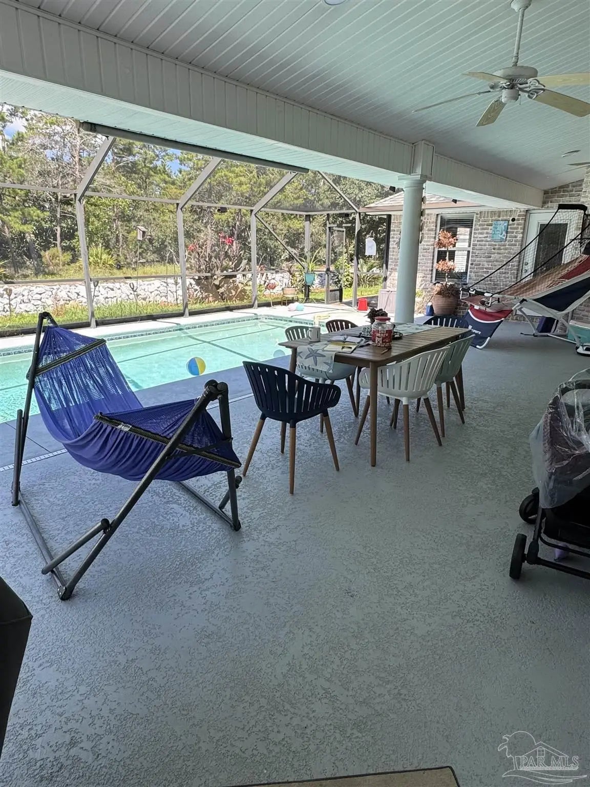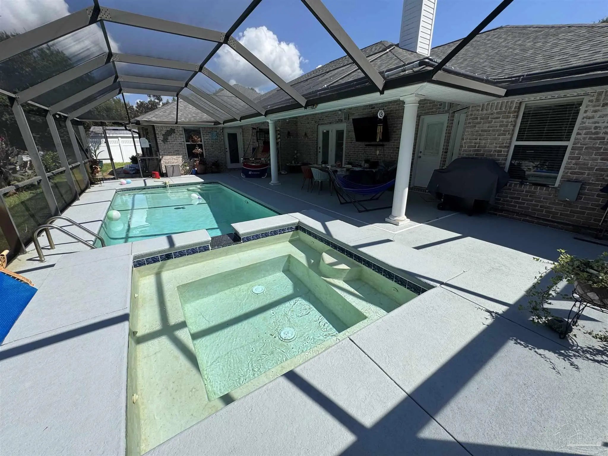 Thinking about that perfect summer house—pool, friends, and your own peaceful place to relax?. This property is more than a house—it’s where memories are made, and where the coastal Florida lifestyle begins. Step inside to find soaring vaulted ceilings, a cozy wood-burning fireplace, and a split floor plan designed with both privacy and togetherness in mind. The home offers 3 bedrooms and a BIG bonus room currently used as a bedroom. This versatile space provides endless possibilities — it can easily become a serene home office, a bright playroom, a cozy media lounge, an exercise room, or whatever best suits your lifestyle. Filled with natural light and fully integrated with the home’s main AC system. The heart of the home is the spacious kitchen, filled with cabinetry and a pantry ready to inspire every chef. Just beyond, the living room flows effortlessly to your screened lanai, where a sparkling saltwater pool and relaxing hot tub invite you to unwind after a day at the beach. The primary suite is a retreat of its own, complete with dual walk-in closets, a spa-inspired bath featuring a jacuzzi tub, separate shower, and dual vanities. Every detail has been thoughtfully updated with a new roof, A/C, and water heater—peace of mind for years to come. Imagine morning coffee poolside, evenings spent entertaining under the stars, and weekends with family and friends in a home that truly has it all. Located minutes from Navarre’s white-sand beaches, shopping, and dining.