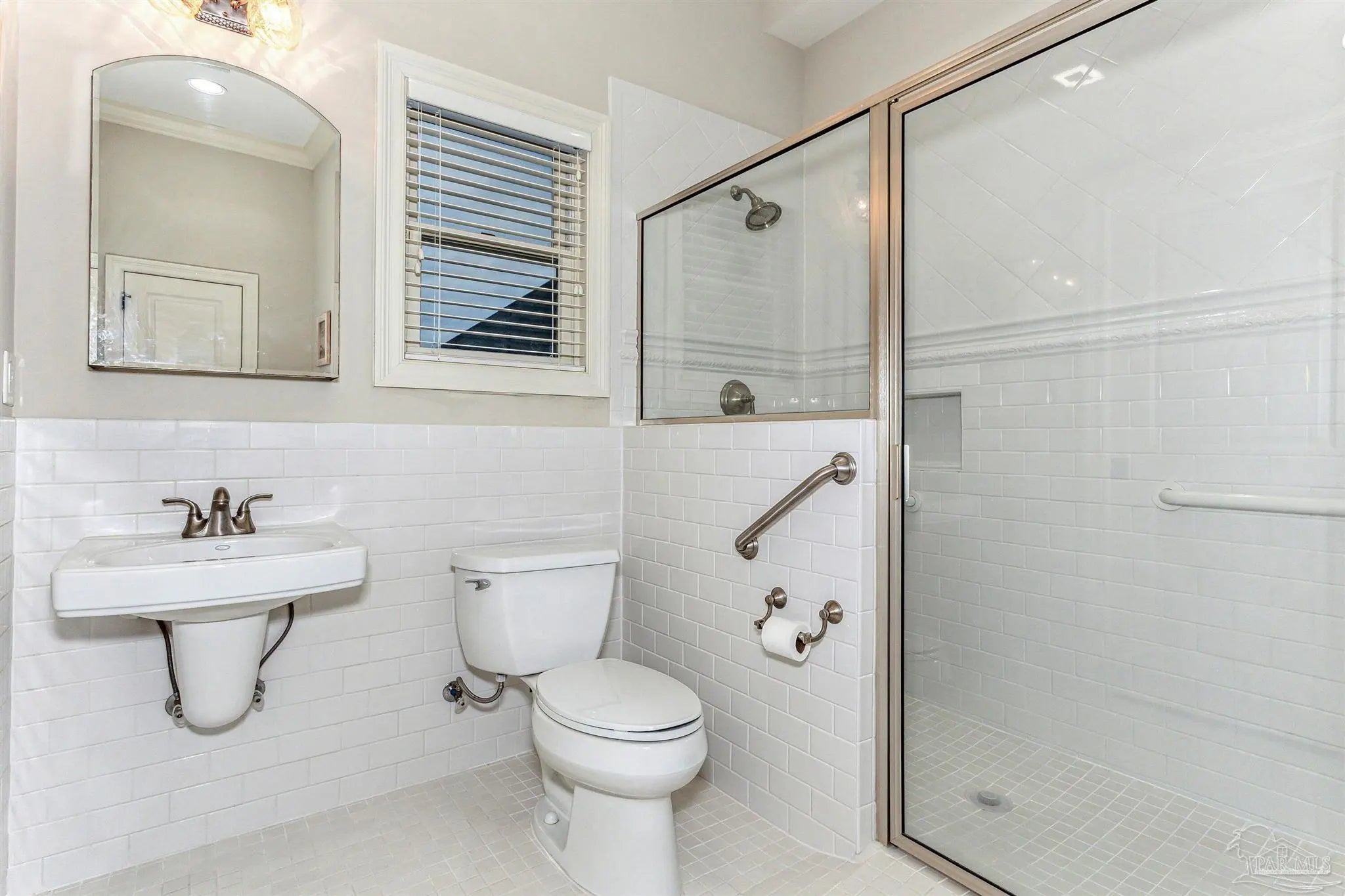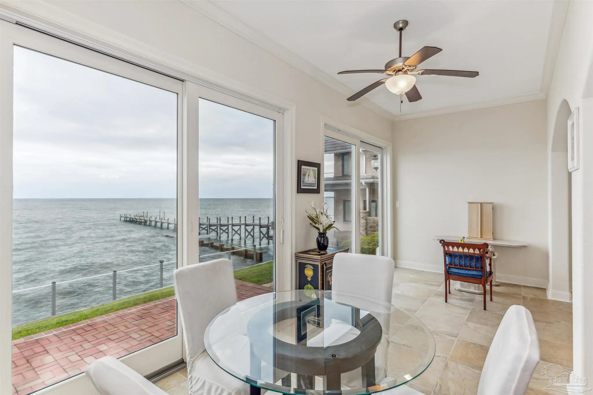 Step into unparalleled luxury with this exquisite waterfront residence in the prestigious gated community of Country Club Place. Perfectly situated on one of just four exclusive waterfront lots, this home combines stunning views with exceptional durability, thanks to its robust 50-piling foundation. Nestled along the picturesque Pensacola Bay, enjoy breathtaking, unobstructed views from multiple vantage points within the home. The property benefits from a shared common access area, where the burden of maintaining the seawall is managed collectively by all 20 properties in the Country Club Place HOA. Boasting over 4,000 square feet of meticulously designed living space, this residence features 3 bedrooms plus an office that can be converted into an additional bedroom, and 3.5 bathrooms. Ample room is provided for family and guests, ensuring comfort and privacy. The home includes two luxurious primary suites, each with its own stunning views of the Bay. Both primary suite offers large windows, allowing you to wake up to serene waterfront scenes. The second floor is accessible by both stairs and an elevator, ensuring convenience for all. The upstairs primary includes a lavish bathroom with dual vanities, a jetted soaking tub, a separate shower with dual showerheads, and a walk-in closet with built-in drawers. Guests will enjoy their own dedicated floor, complete with a full kitchen and SECOND living room. The additional bedroom on the main floor features a handicap-accessible sink and roll-in shower, ensuring comfort and accessibility for all guests. All doors and windows facing the Bay are high impact. Roof was replaced in 2021! Additional laundry facility with 200V and central vacuum in garage. Residents have exclusive access to upscale community amenities, including a shared dock, boardwalk, and a launch area for kayaks or paddleboards.