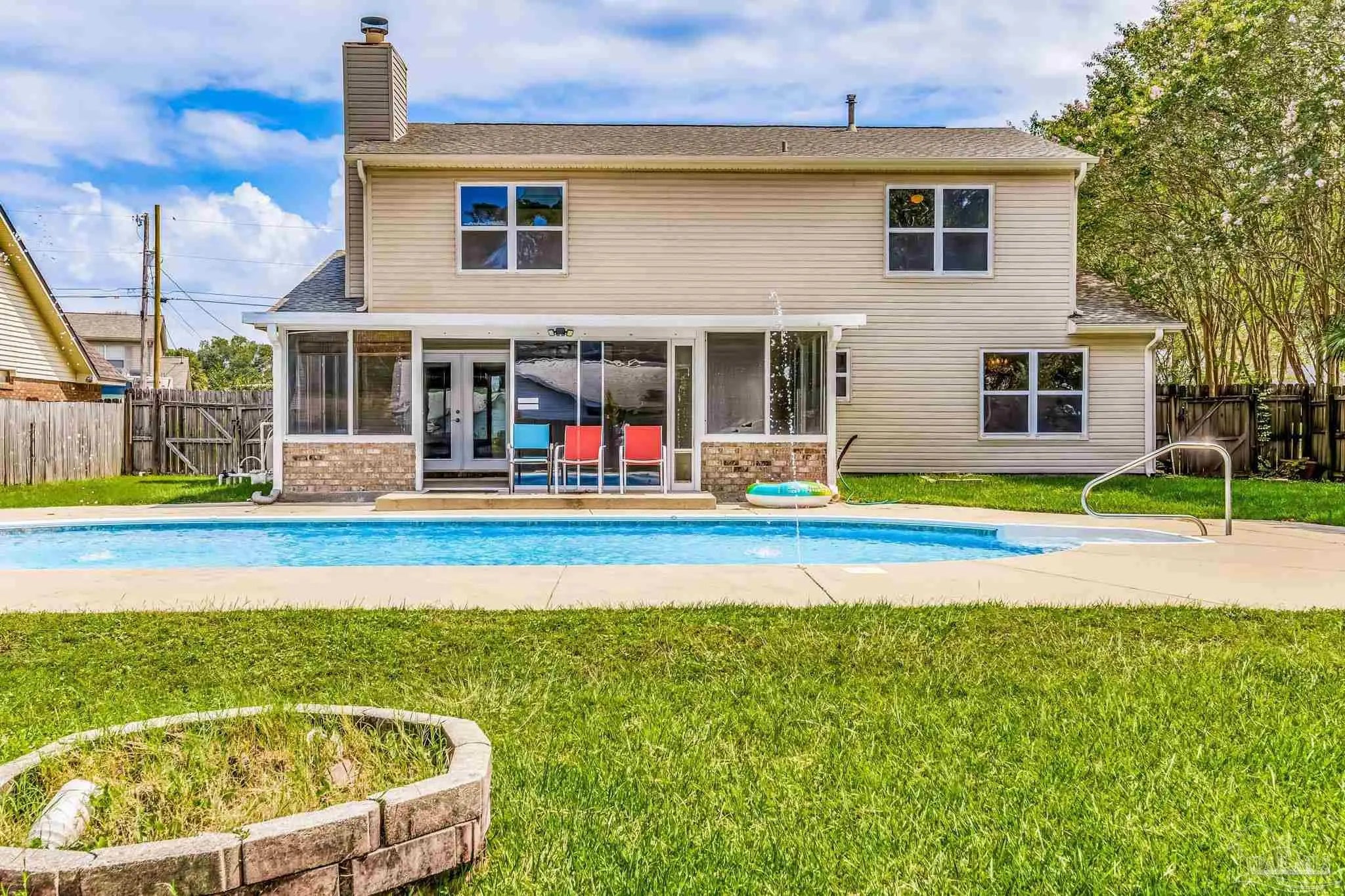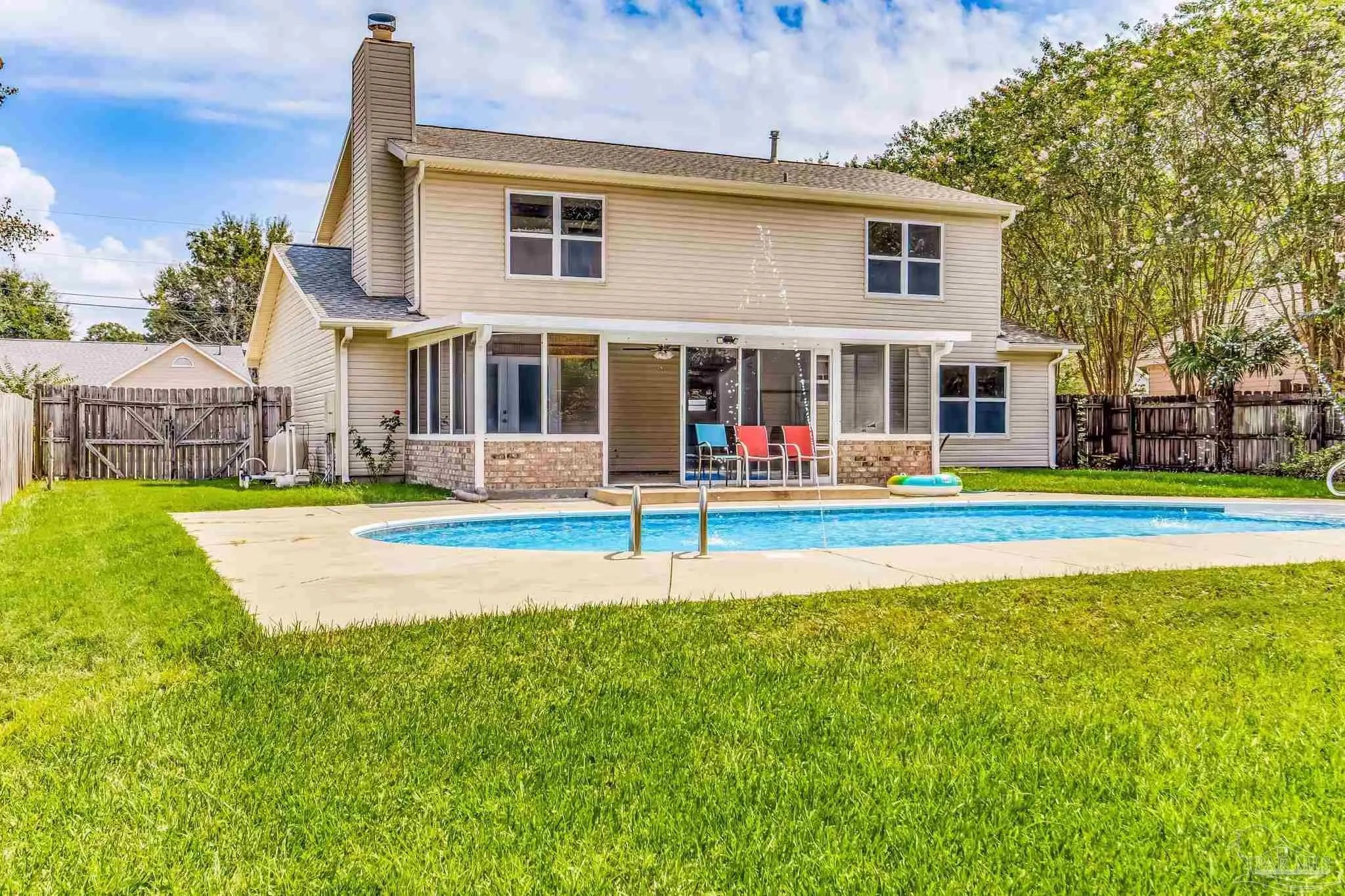 Welcome to this beautifully updated home in the desirable Quail Run subdivision, just off East Nine Mile Road. Offering 4 spacious bedrooms, 3 bathrooms, and a private backyard retreat with pool, this property combines comfort, thoughtful upgrades, and an ideal location in one of Pensacola’s fastest-growing areas. Interior Features Primary Suite: walk-in closet, freshly updated bathroom with new single vanity, ADA-compliant entrance, and large walk-in fiberglass shower with seat Flooring: tile plank throughout for style and easy maintenance; hardwood floors upstairs bedrooms, tiled floors primary bedroom and all bathrooms. Kitchen: custom renovation (2019) with solid cabinetry, stainless steel appliances (approx. 3 years old), and a gas stove top with electric oven Living Area: cozy wood-burning fireplace, French doors opening to a glassed-in 175 sq. ft. sunroom with its own AC, overlooking the pool Additional Baths: updated half bath downstairs, upstairs bath with single vanity/tub-shower combo Freshly painted bedrooms with generous closets Exterior & Property Highlights Backyard Retreat: sparkling pool with fountain feature and fully fenced yard for privacy Parking & Storage: 38-ft RV pad with electrical hookup, boat parking option, large shed, and two-car garage Major Updates: new windows (2018), siding (2012), gas water heater (2021), and Eco System E-Series HVAC Location Benefits Quail Run sits at the center of Pensacola’s booming Nine Mile and Pine Forest corridor, driven by Navy Federal Credit Union’s expansion. You’ll enjoy quick access to exciting new dining and retail options such as Prime & Beyond Steakhouse (coming soon), Costco (coming soon), 7 Brew Coffee, Cook Out, Del Taco, and Five Guys. For families, the McArthur Elementary bus stop is conveniently located on Quail Nest Lane.