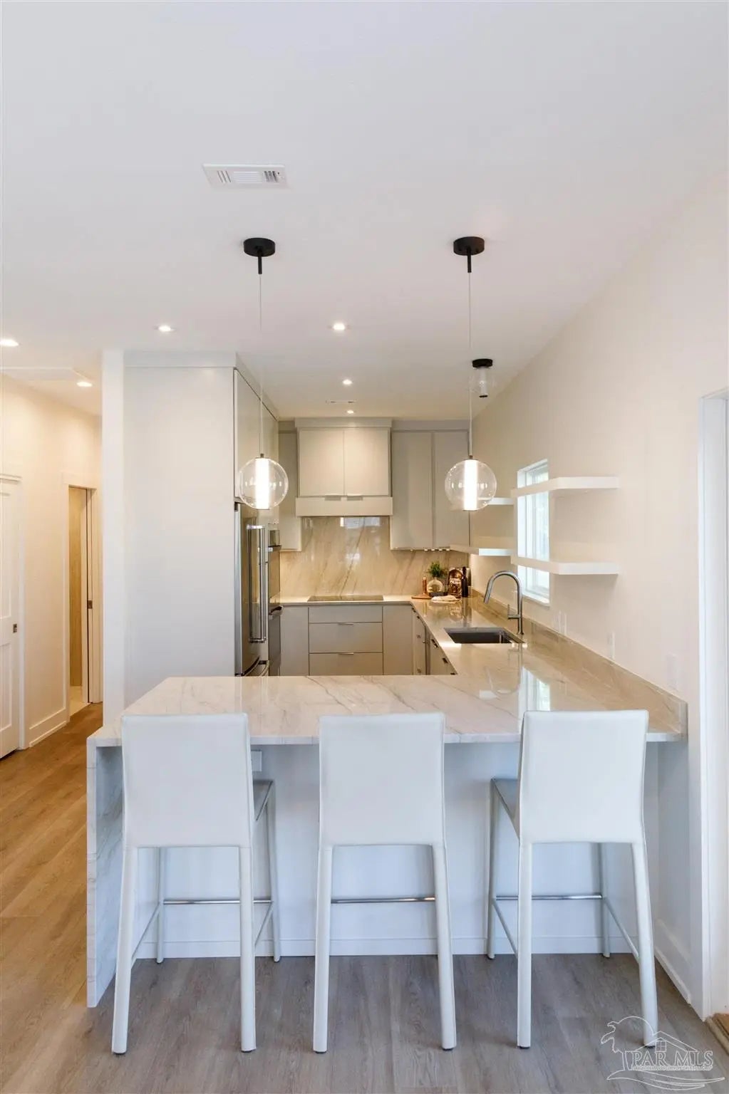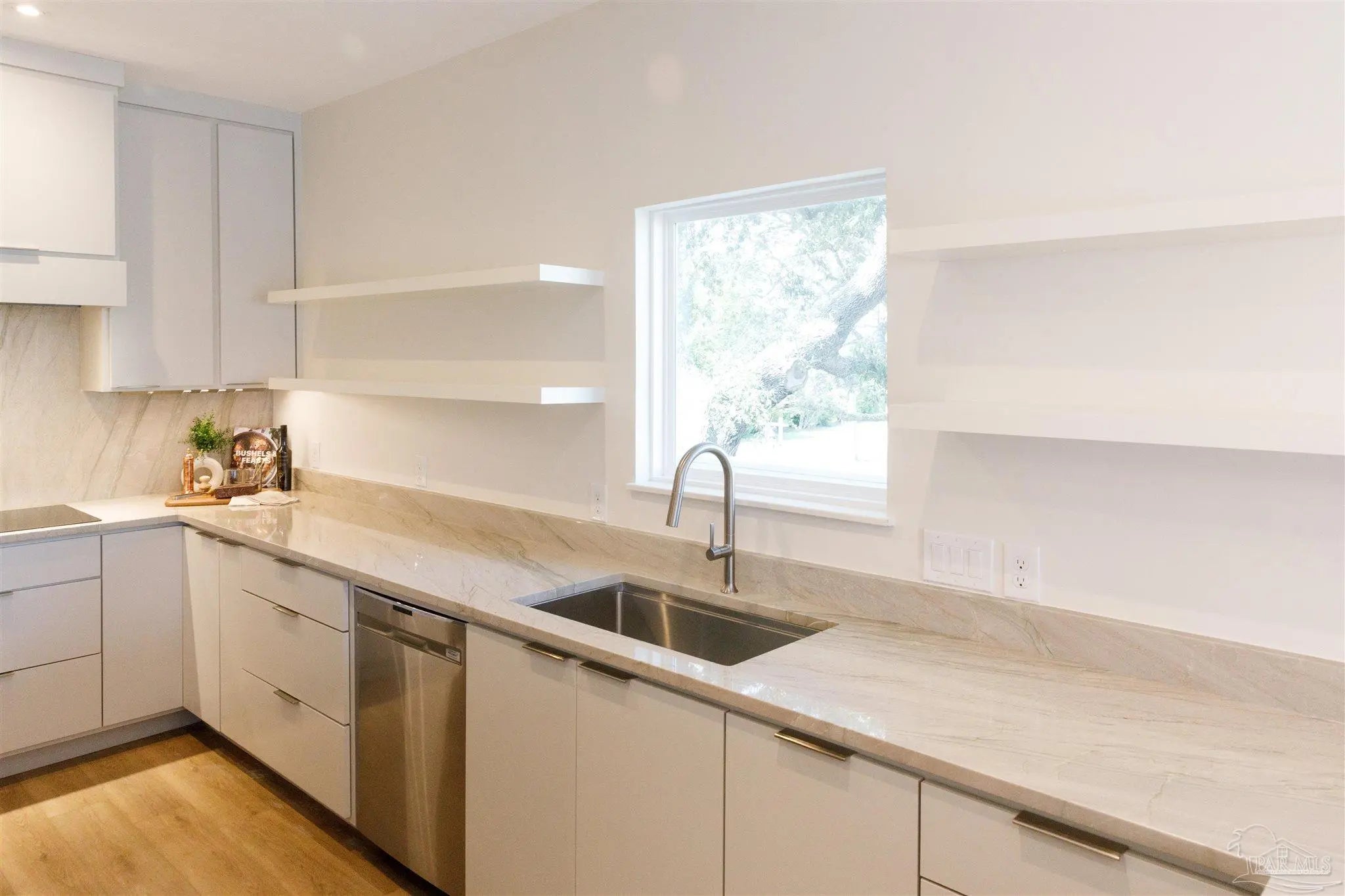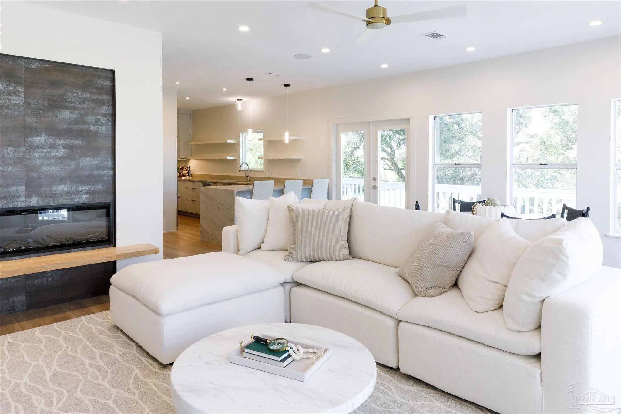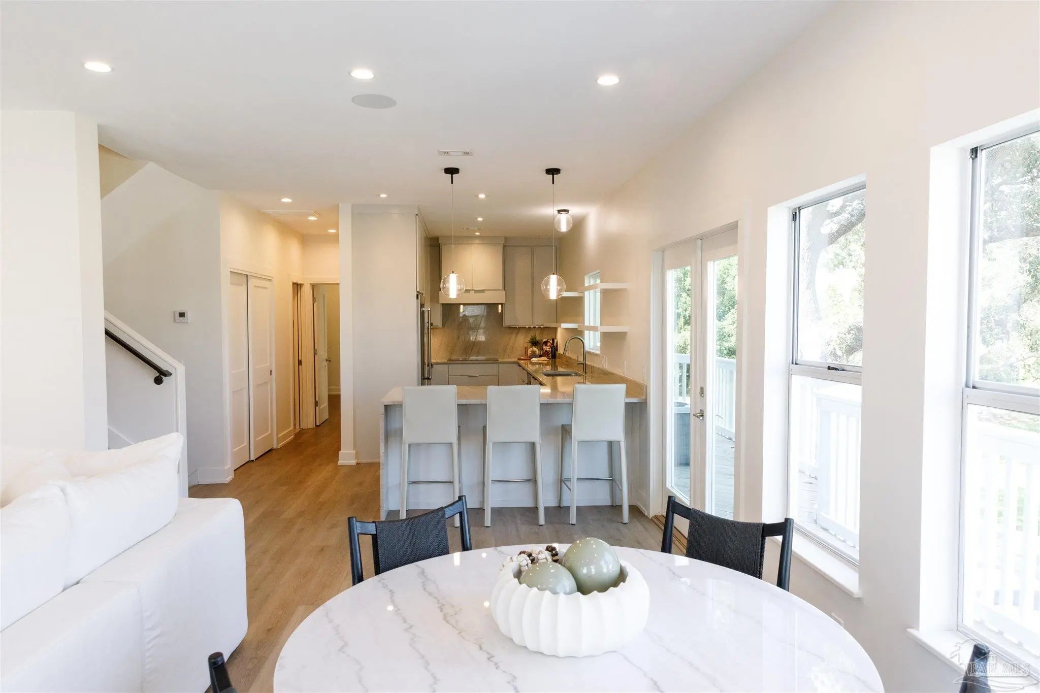 Tucked away down a winding, tree-lined road, this classic beauty rests on the shores of Pensacola Bay. The first level offers covered parking and a spacious storage area, with direct access to the water’s edge. Ascend to the main living space where contemporary architecture and thoughtful design set the stage for elegant coastal living. Every detail of this elegant renovation was meticulously planned, focusing on easy-living at every turn. Flooded with natural light, the open living and dining areas seamlessly connect to a stylish kitchen featuring quartzite countertops, stainless-steel appliances, and a double wine and beverage cooler. Each of the three generous bedrooms includes its own private bath, highlighted by the primary suite with sweeping water views, a private balcony, and a picture-perfect window in the spa-like ensuite bathroom featuring radiant heated flooring. Additional conveniences include a full laundry area, abundant storage, and expansive porches and balconies that wrap the home on two levels and are ideal for enjoying sunsets over the Bay. This home offers peace of mind with a brand-new 2024 roof and recently updated systems throughout, including HVAC, water heaters, electrical, and plumbing ensuring both modern efficiency and long-term reliability. Ideally located close to downtown, pristine beaches, and all that Pensacola has to offer, this residence blends timeless design with effortless coastal living. A rare blend of elegance and waterfront living, this Pensacola Bay residence is truly a place to call home. Schedule your private tour today.