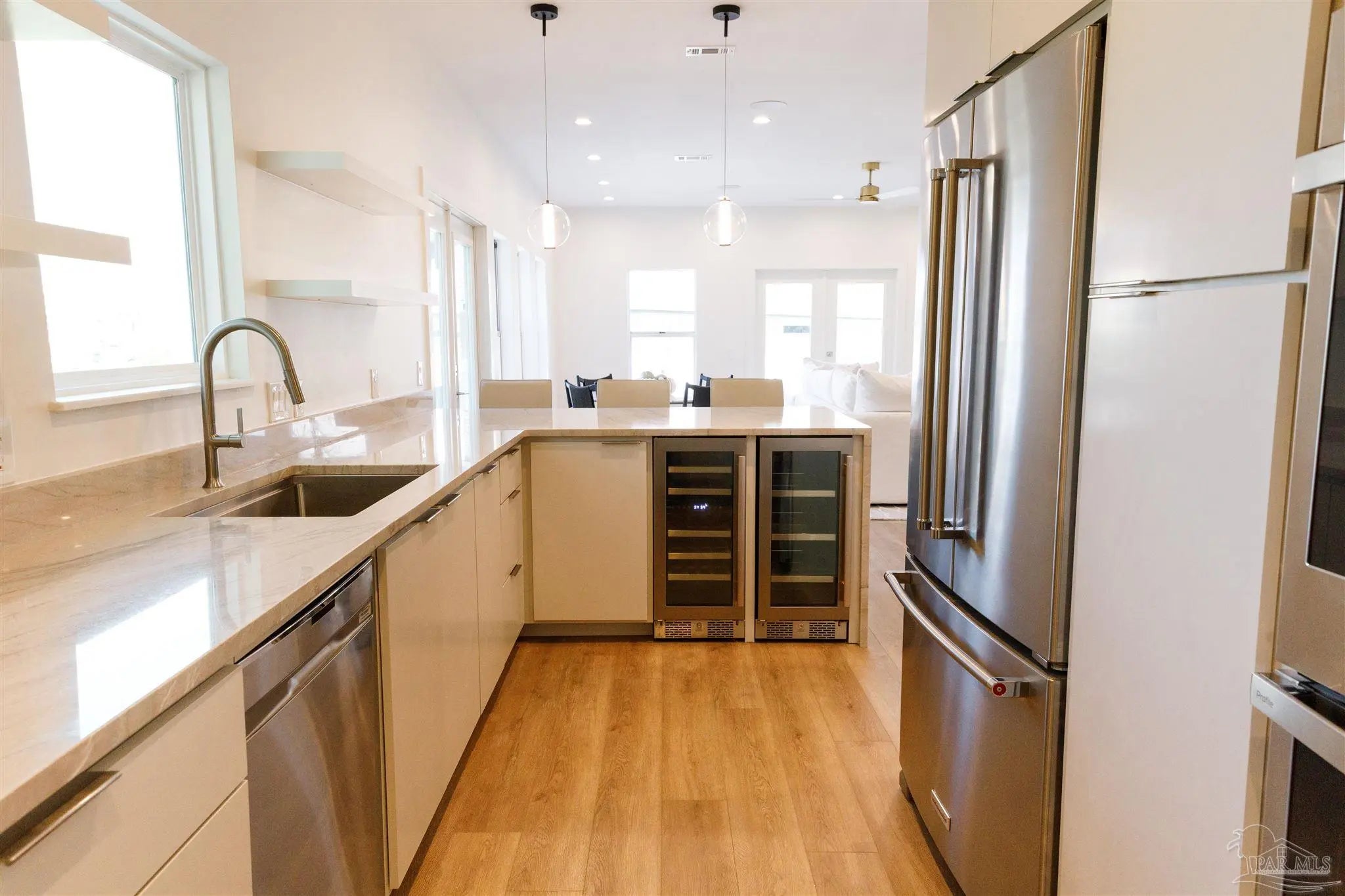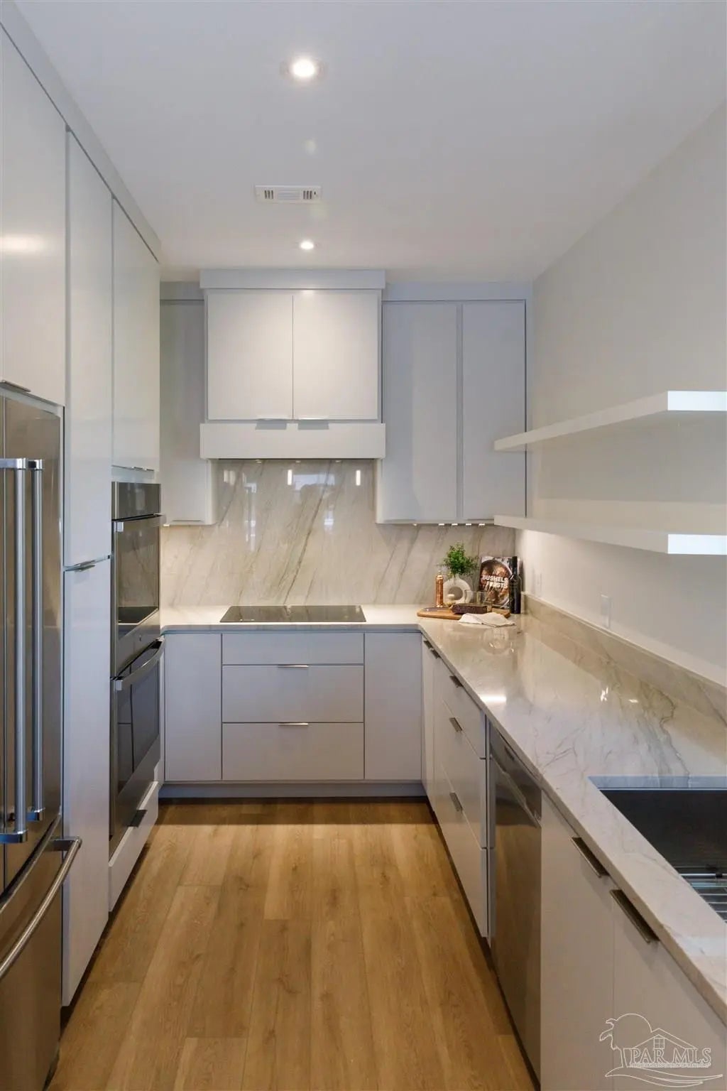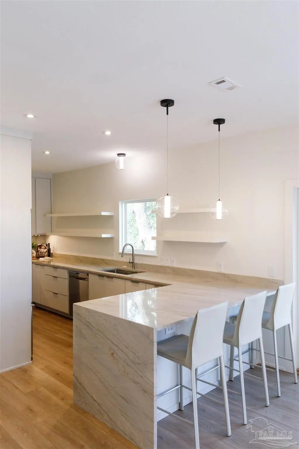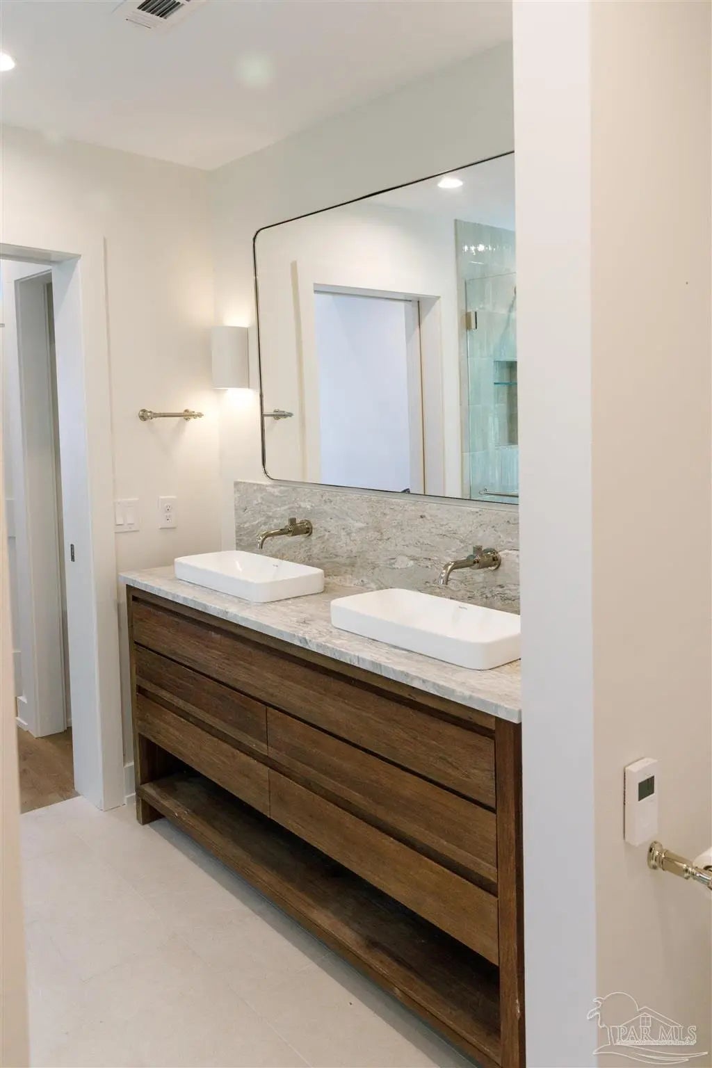 Tucked away down a winding, tree-lined road, this classic beauty rests on the shores of Pensacola Bay. The first level offers covered parking and a spacious storage area, with direct access to the water’s edge. Ascend to the main living space where contemporary architecture and thoughtful design set the stage for elegant coastal living. Every detail of this elegant renovation was meticulously planned, focusing on easy-living at every turn. Flooded with natural light, the open living and dining areas seamlessly connect to a stylish kitchen featuring quartzite countertops, stainless-steel appliances, and a double wine and beverage cooler. Each of the three generous bedrooms includes its own private bath, highlighted by the primary suite with sweeping water views, a private balcony, and a picture-perfect window in the spa-like ensuite bathroom featuring radiant heated flooring. Additional conveniences include a full laundry area, abundant storage, and expansive porches and balconies that wrap the home on two levels and are ideal for enjoying sunsets over the Bay. This home offers peace of mind with a brand-new 2024 roof and recently updated systems throughout, including HVAC, water heaters, electrical, and plumbing ensuring both modern efficiency and long-term reliability. Ideally located close to downtown, pristine beaches, and all that Pensacola has to offer, this residence blends timeless design with effortless coastal living. A rare blend of elegance and waterfront living, this Pensacola Bay residence is truly a place to call home. Schedule your private tour today.