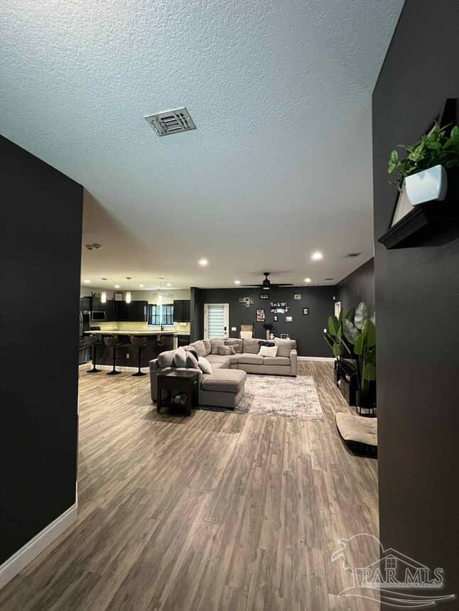 This beautiful, move-in-ready contemporary home brings together modern comfort, functional design, and outdoor serenity. The inviting front porch welcomes you in, while the generously proportioned great room, thoughtful layout, and scenic backyard enhance daily living. Step through the inviting foyer into an expansive great room, where soaring ceilings and open sightlines create an airy, welcoming ambiance. The chef-inspired kitchen shines with granite countertops, a center island with breakfast bar seating, and abundant prep space. The master suite is generously sized for comfort. The en-suite bathroom includes a double-vanity with granite counters, a luxurious garden tub, a separate walk-in shower, and a spacious walk-in closet. Three additional bedrooms are thoughtfully placed on the opposite side of the house, with a full-sized bathroom. Beyond the back door lies a screened porch, creating an inviting indoor-outdoor living space. The expansive, fully fenced backyard offers endless possibilities. Ideal for growing families, entertaining, or those craving peaceful moments outdoors—this is a gem in the heart of Navarre.