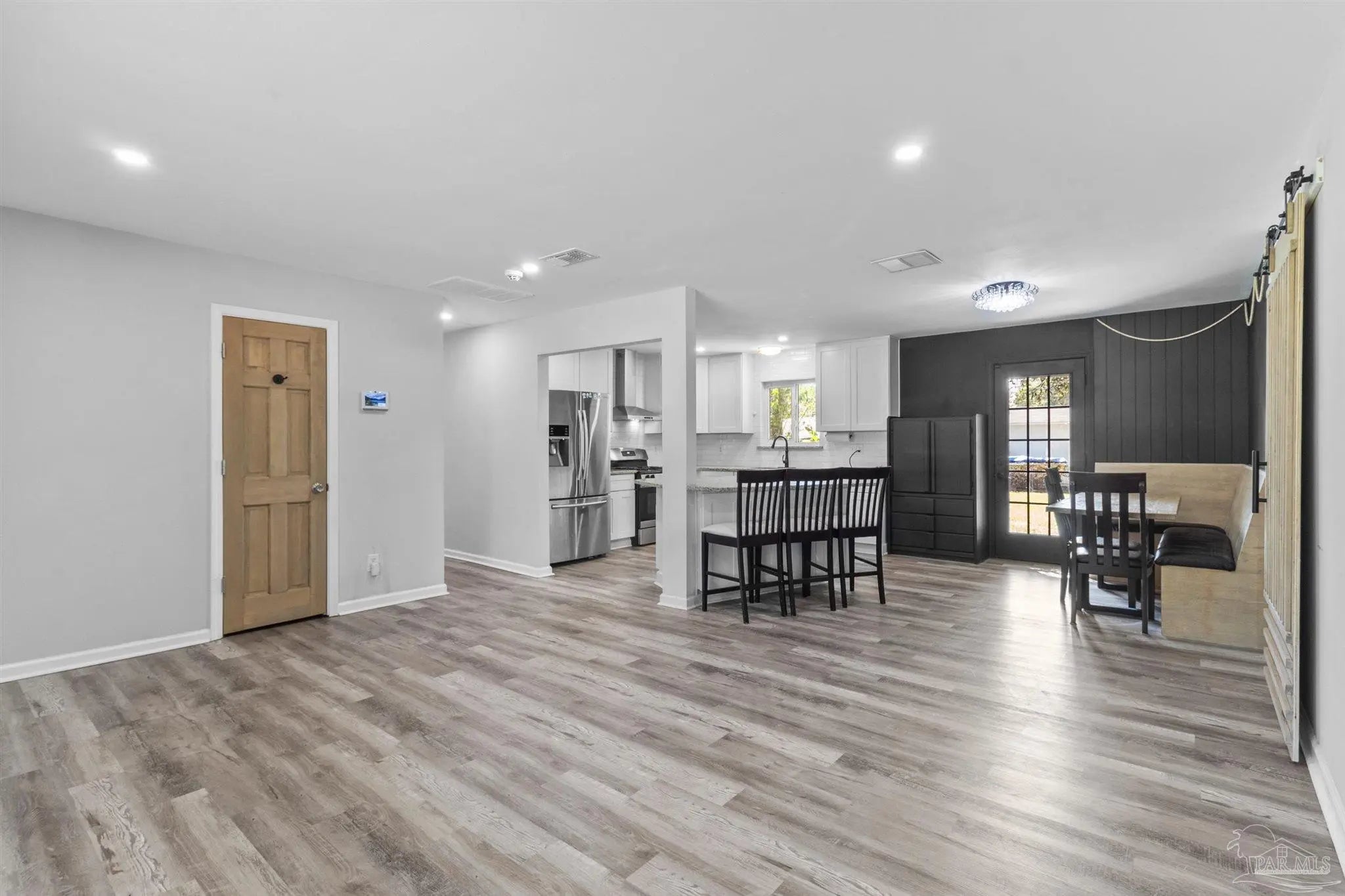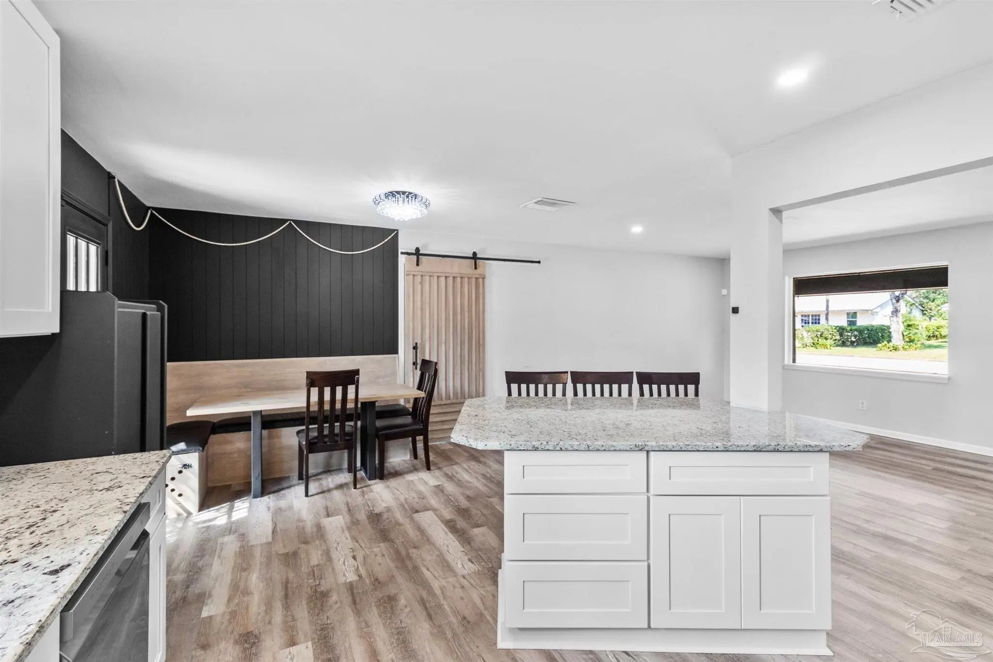 Completely renovated 4 bedroom, 2 bathroom home in Pensacola with thoughtful upgrades inside and out. This open concept design features a modern kitchen with granite countertops, stainless steel appliances, a large island, and a custom built dining nook with storage, creating the perfect space for entertaining or everyday living. The primary suite offers a spa-like retreat with a double floating vanity and a custom shower with sliding glass doors and a rain head feature. Practical updates include a fully encapsulated crawl space with its own dehumidifier, sump pump, and drain system, a roof replaced in 2021, and energy-efficient solar panels to help lower utility costs. Outside, enjoy the backyard with a patio shaded by mature trees, offering a comfortable place to relax and unwind. Conveniently located with easy access to shopping, dining, schools, and the beach, this home combines modern comfort, style, and functionality in one move-in ready package.