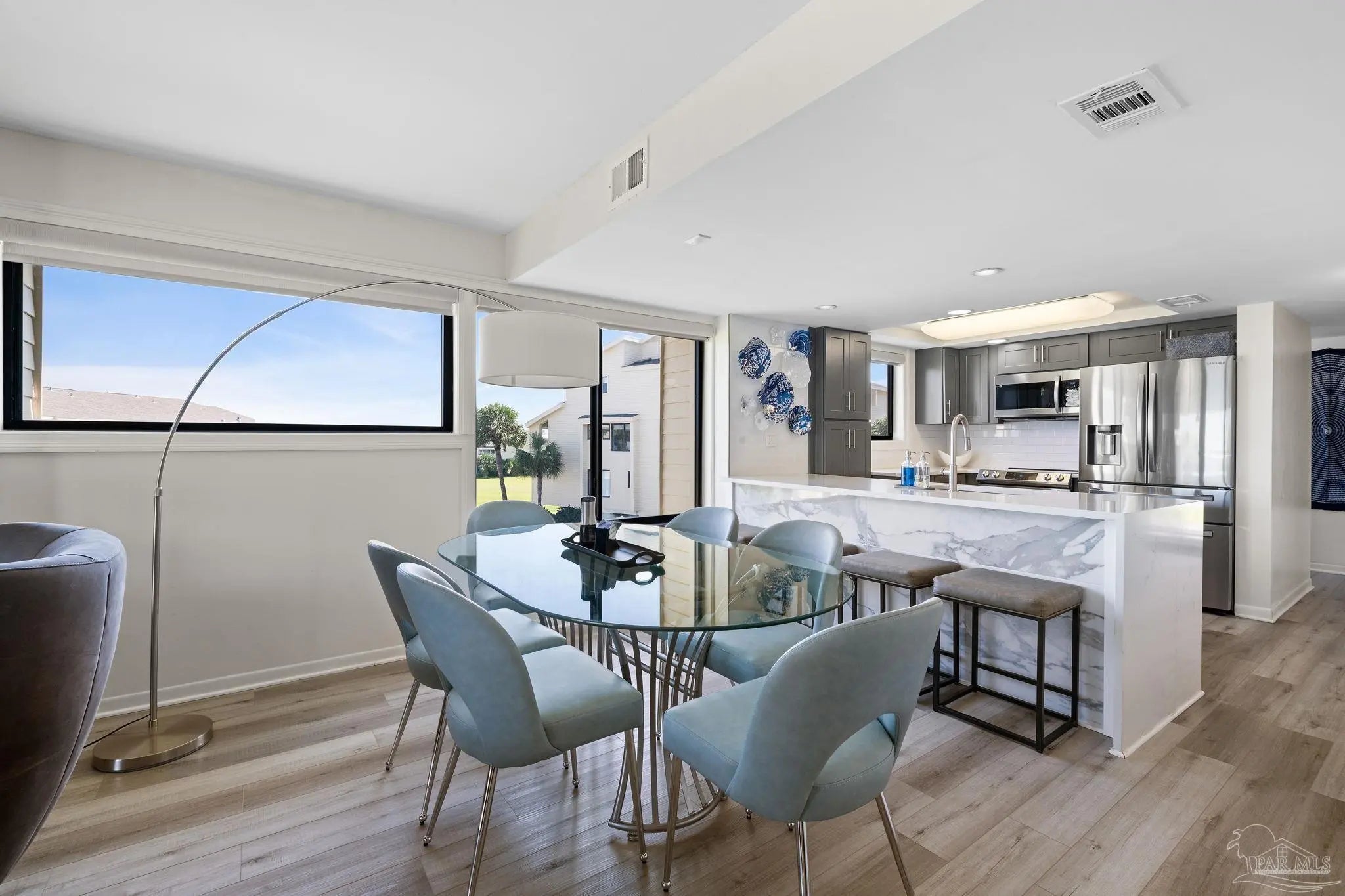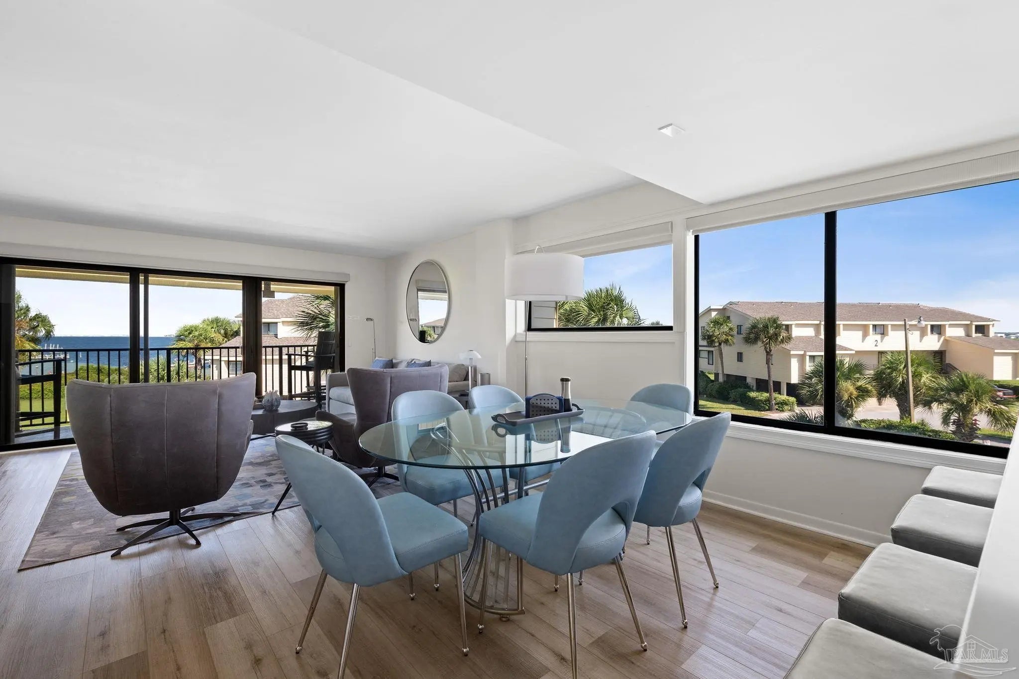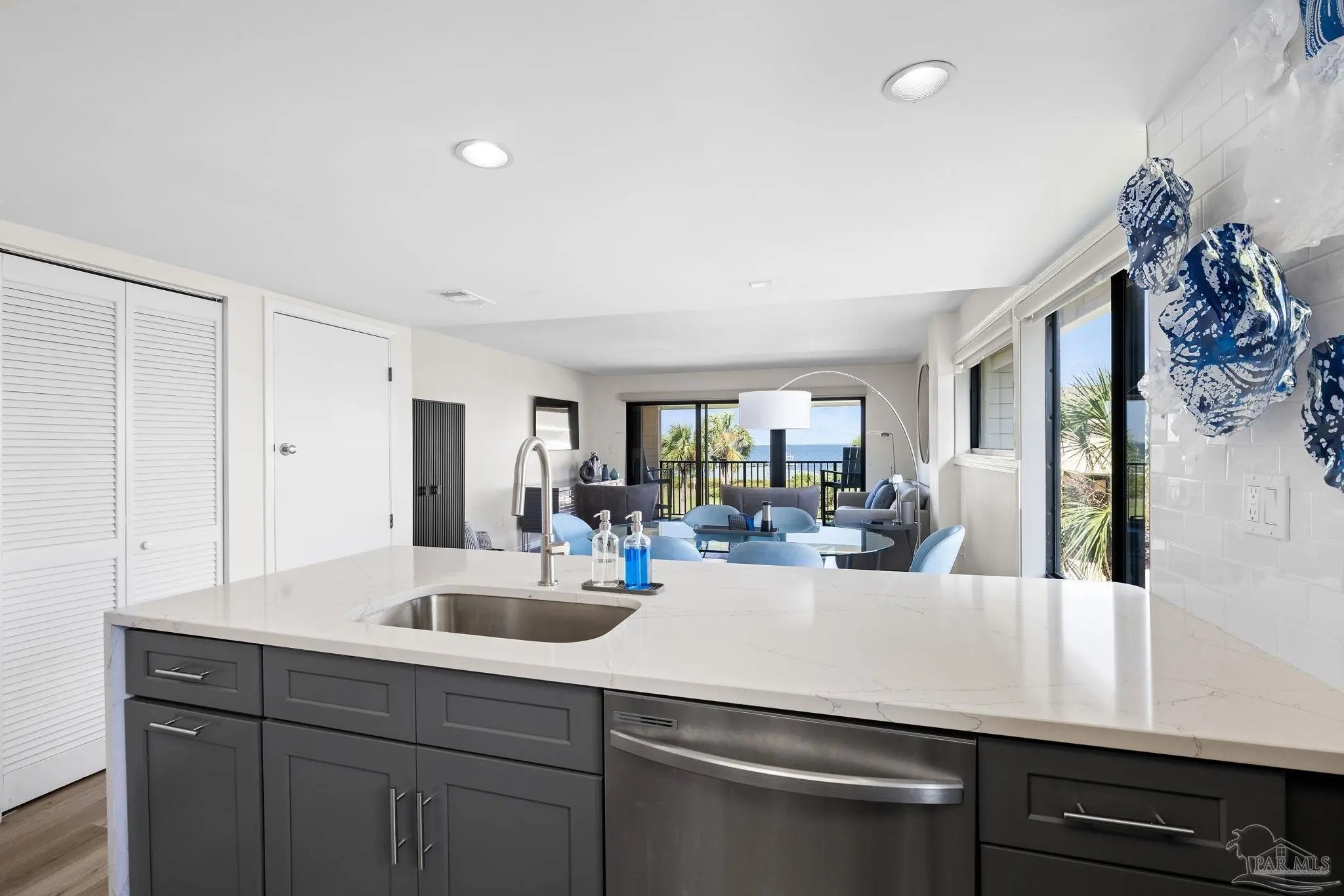 Welcome to your beachside escape at Santa Rosa Dunes on Pensacola Beach, where this fully remodeled 2-bedroom, 2-bathroom waterfront condo offers an unparalleled blend of luxury, comfort, and coastal charm. Perfectly positioned along the serene Santa Rosa Sound, this property captures breathtaking water views and vibrant sunsets, creating an idyllic setting for a primary residence, vacation getaway, or lucrative investment opportunity. Step inside to discover an updated interior featuring durable luxury vinyl plank (LVP) flooring, am expanded kitchen equipped with sleek stainless steel appliances, quartz countertops, and custom cabinetry, complemented by modern lighting fixtures that enhance the contemporary ambiance. The open-concept living area seamlessly connects to a private balcony, perfect for savoring morning coffee or evening cocktails while soaking in the Sound views. Residents of this exclusive community enjoy access to an array of resort-style amenities, including the largest pool on Pensacola Beach, ideal for refreshing swims or lounging under the sun, a fitness center, and well-maintained tennis courts for active lifestyles. For water enthusiasts, the property offers a community dock with mooring balls, making it a haven for boating enthusiasts eager to explore the Gulf Coast waters. With direct beach access just steps from your door, this move-in-ready condo promises a lifestyle of relaxation and recreation, blending coastal elegance with unmatched community features. Whether you're seeking a permanent seaside retreat or a high-demand rental property, this Santa Rosa Dunes condo delivers the ultimate Gulf Coast experience.