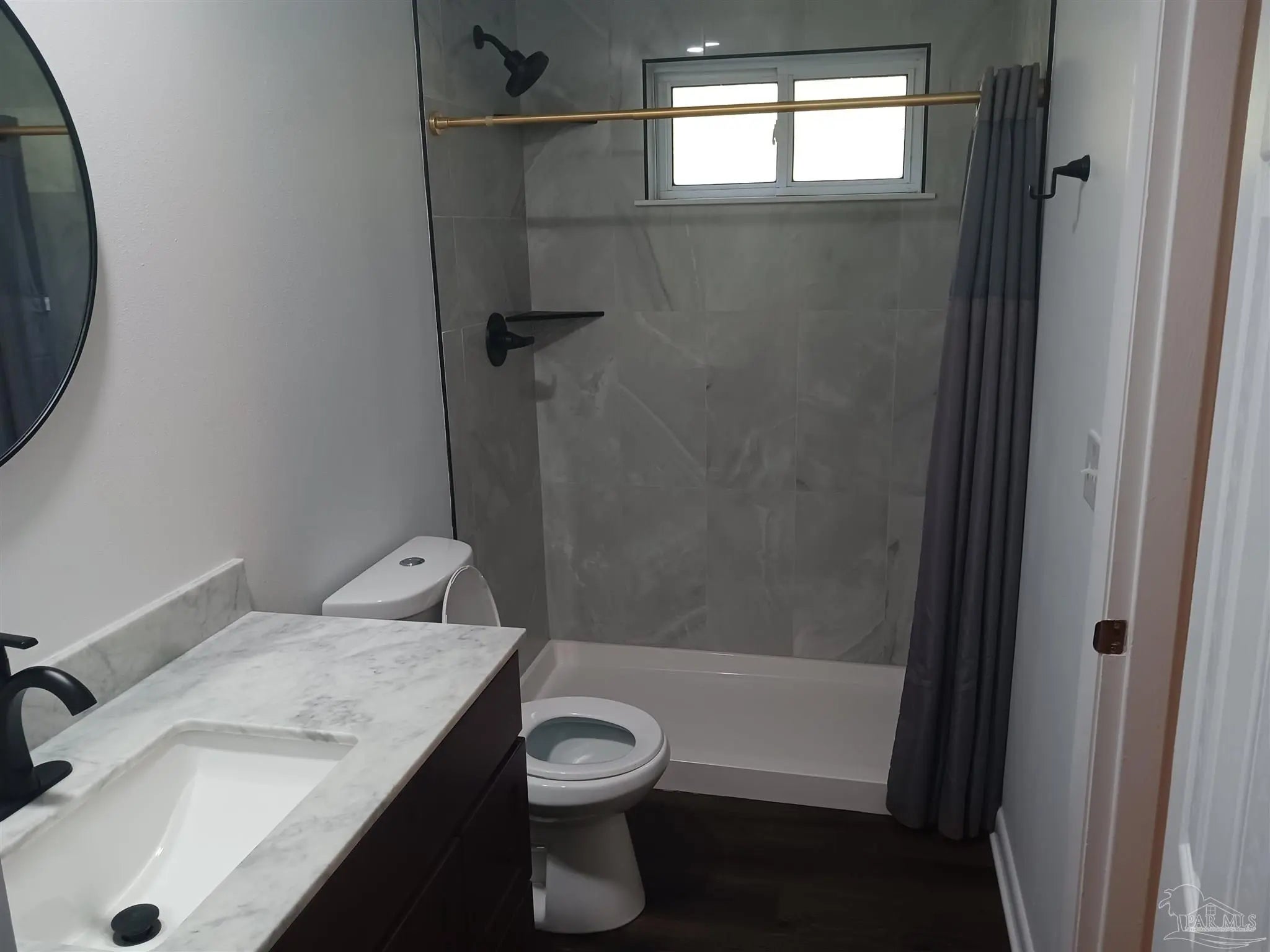 Reduced for quick sale!!!! Move-in ready 3 bedroom, 2 bathroom home in NE Pensacola. Situated on nearly half an acre, this charming all brick home is located on a desirable corner lot fully fenced in backyard shaded by beautiful mature oak trees. Upon entering the home you'll be greeted by a spacious open floor plan with original hardwood floors in the main area and bedrooms. This welcoming place called home features a split floor plan. The master suite features a newly custom tile walk in shower, while the hall bathroom offers a deep soaker tub along with custom tile work. The interior has been freshly painted, providing a crisp and clean canvas for you to add your own personal touches. The kitchen is equipped with plenty of storage and generous counter space. When you step outside to the expansive rear covered patio you will have plenty of room for that outdoor furniture you always wanted . It’s an ideal spot for relaxing or entertaining family and friends while enjoying the privacy of a large backyard. This wonderful NE Pensacola home comes with recent upgrades for your peace of mind, including a newer roof 2 yrs, all new plumbing 1 yr, a water heater, and an AC unit replaced within the last four years. Additionally, both bathrooms have been beautifully upgraded within the past two years. Don’t miss out on this incredible opportunity to own a beautiful home that is centralized minutes from Pensacola International Airport and 15 minutes from our beautiful downtown Pensacola!